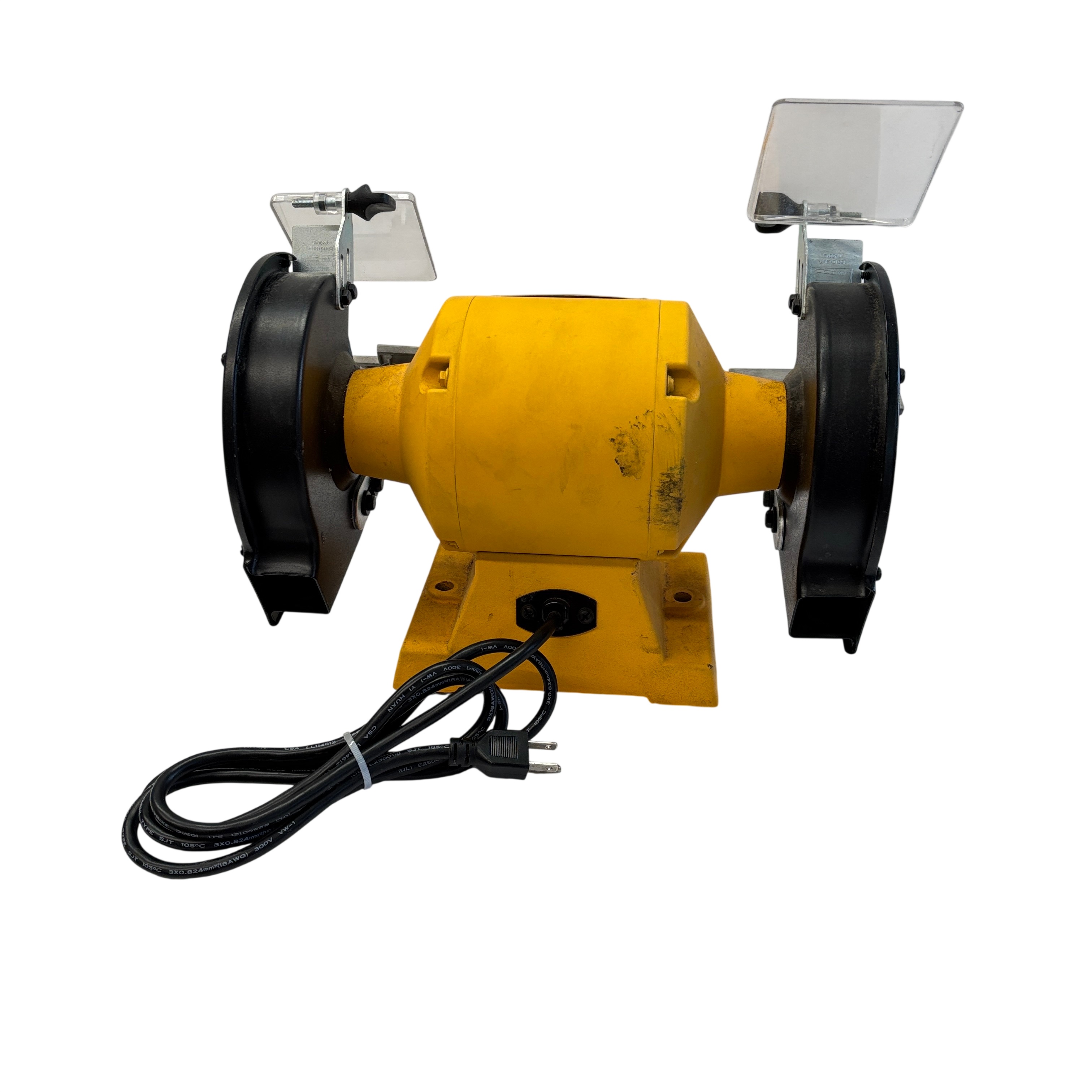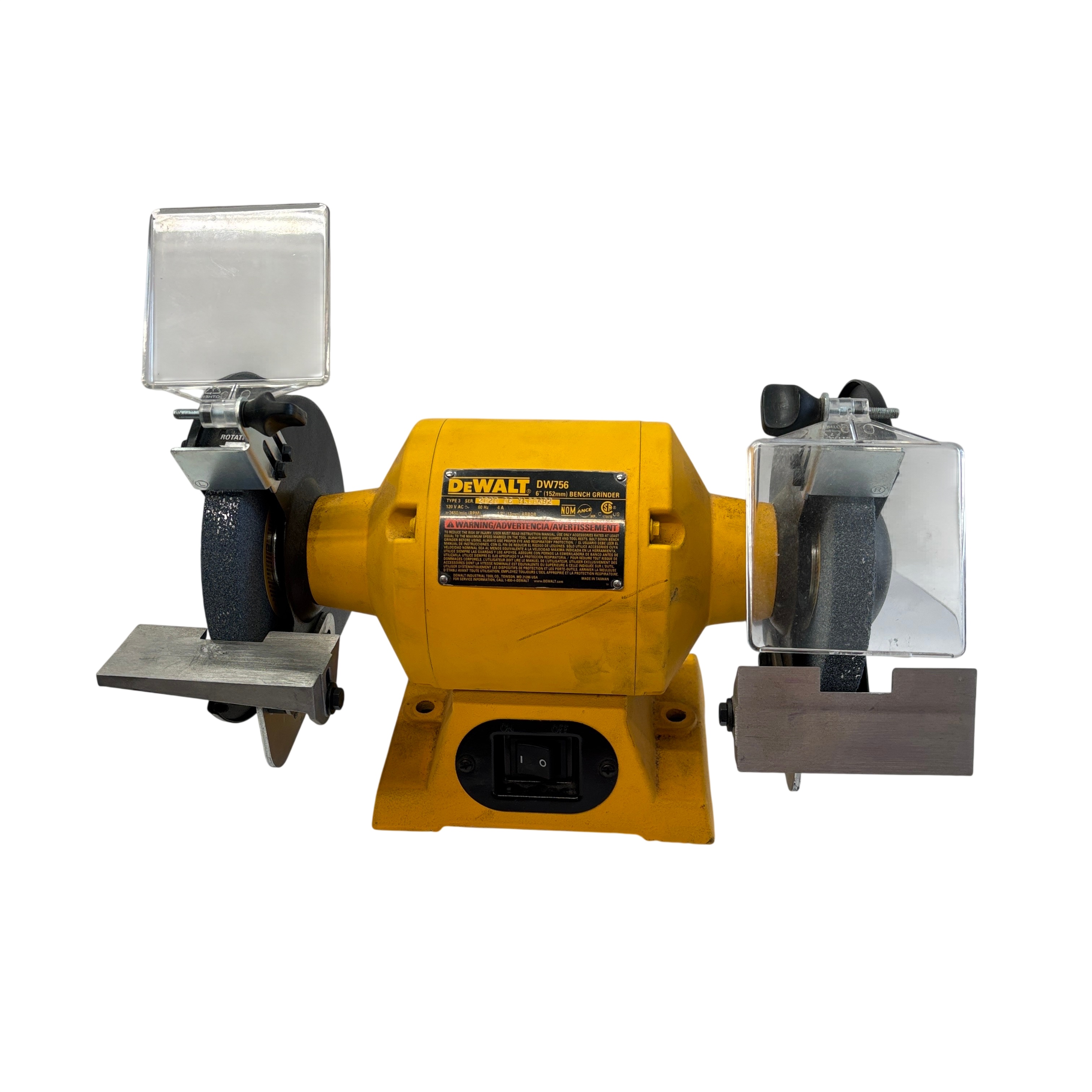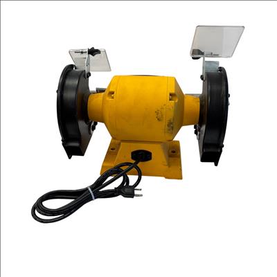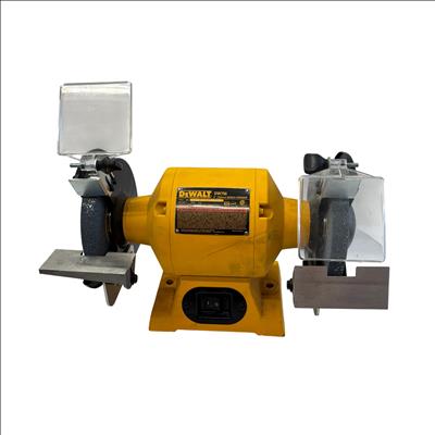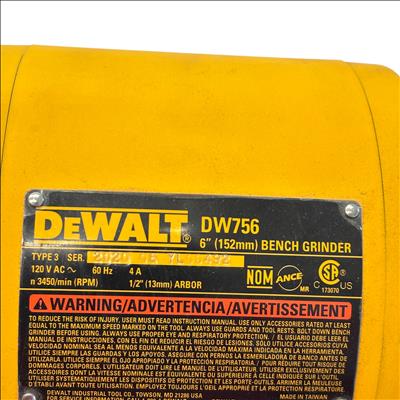 DeWalt DW756 6 inch Bench Grinder is a powerful corded electric tool designed for precise grinding and sharpening tasks. Operating at 120 volts and 3450 RPM, this bench grinder features durable 6 inch grinding wheels mounted on a sturdy yellow and black housing. It includes adjustable tool rests and transparent eye shields for enhanced safety and accuracy. Ideal for workshop and industrial use, the DW756 provides reliable performance with a bolt-down base for stable operation.