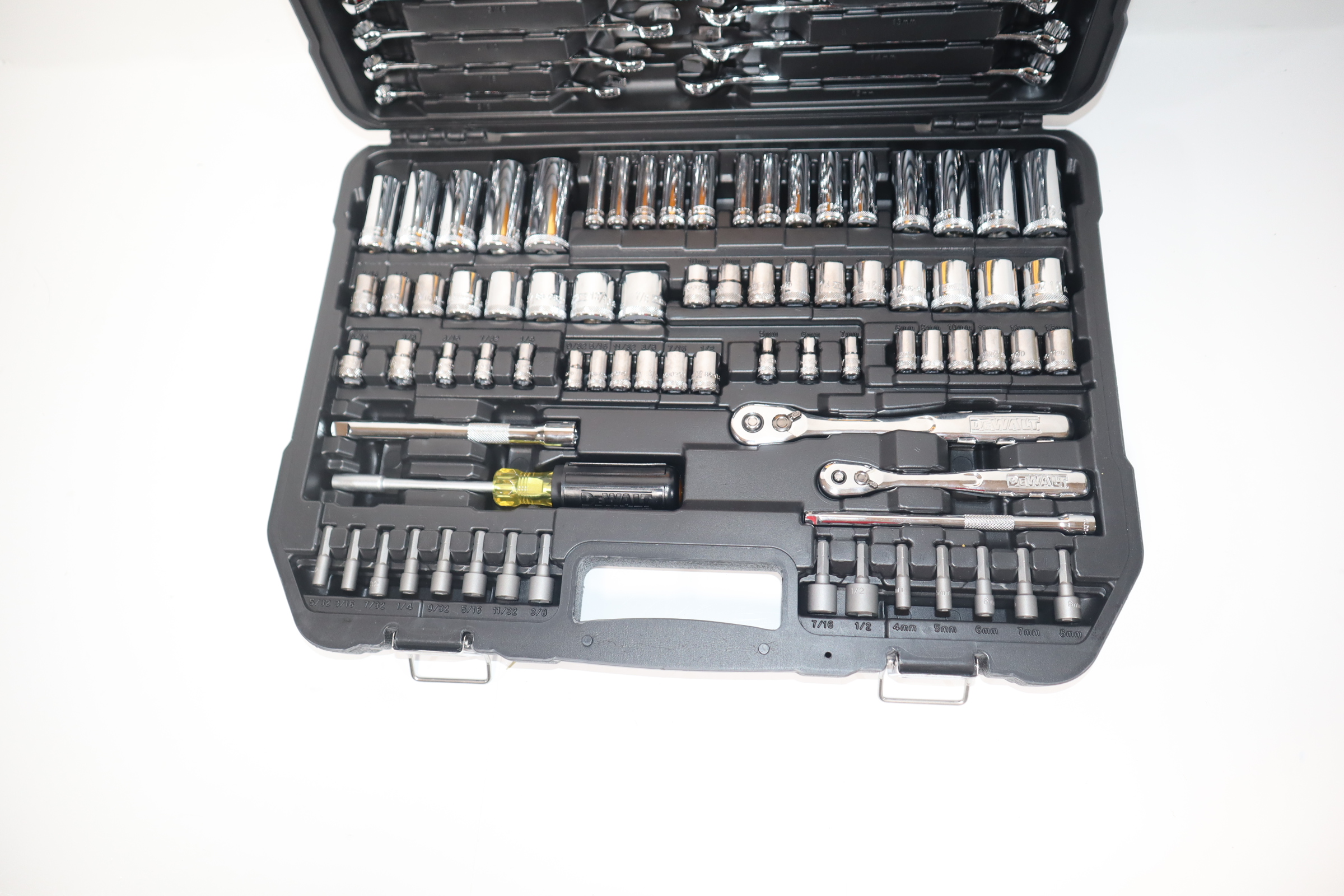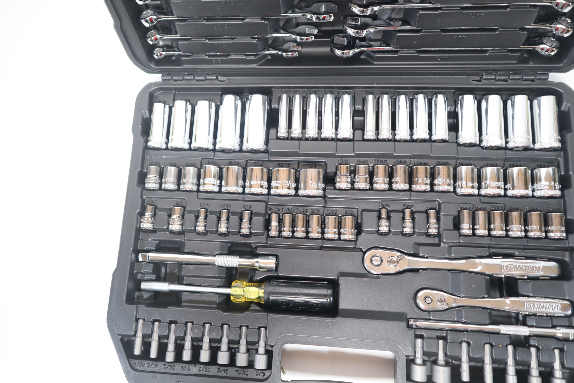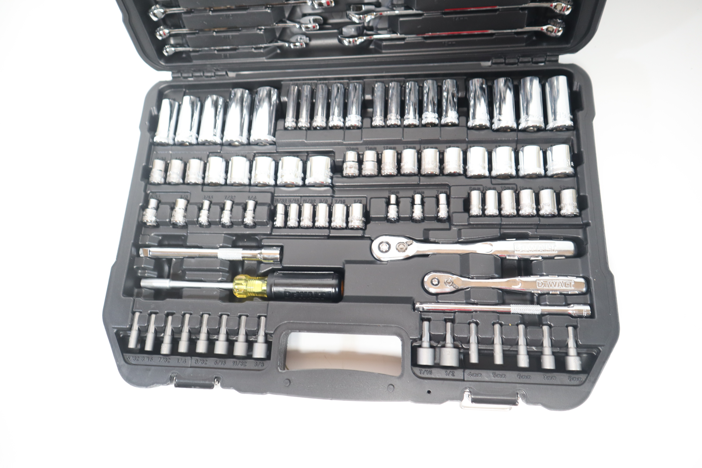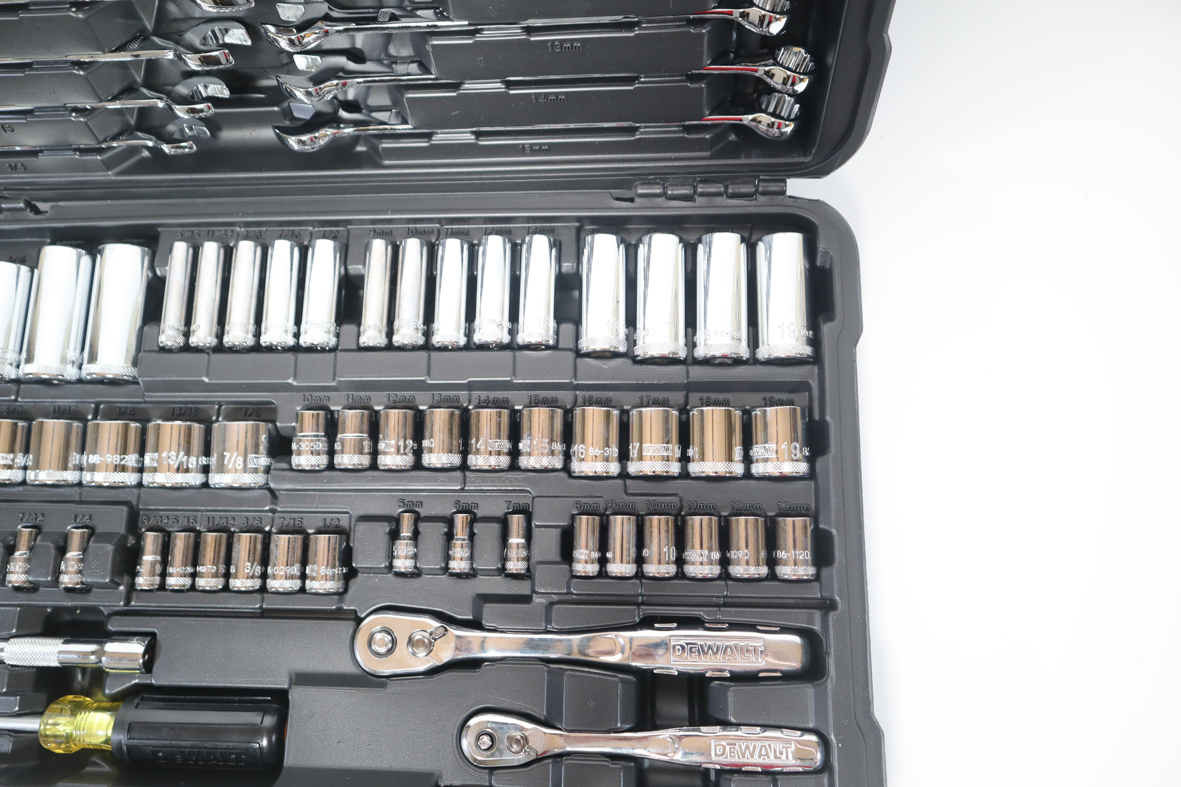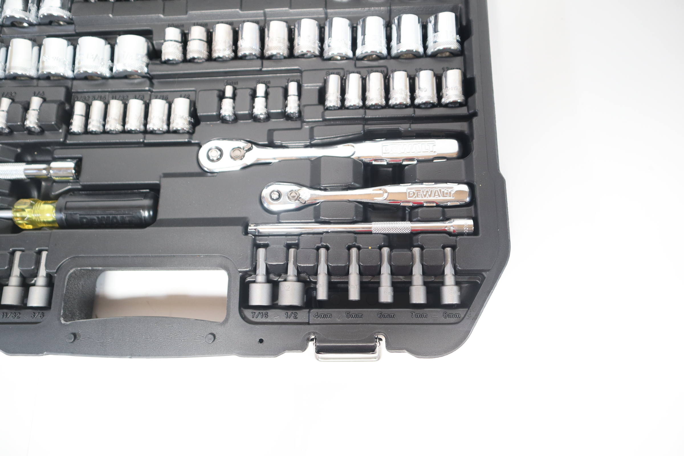 This 142-piece DEWALT Mechanic Tool Set is a versatile choice with two pear head ratchets, a variety of sockets, extensions, universal joints and adapters. The tool sets for mechanics come in a durable case featuring metal latches for added security of the tool sets for mechanics. The 72 tooth count ratchets come equipped with a quick release button to easily attach or remove a socket. The sockets included Direct Torque technology to help prevent rounding of fasteners and provide better grip.