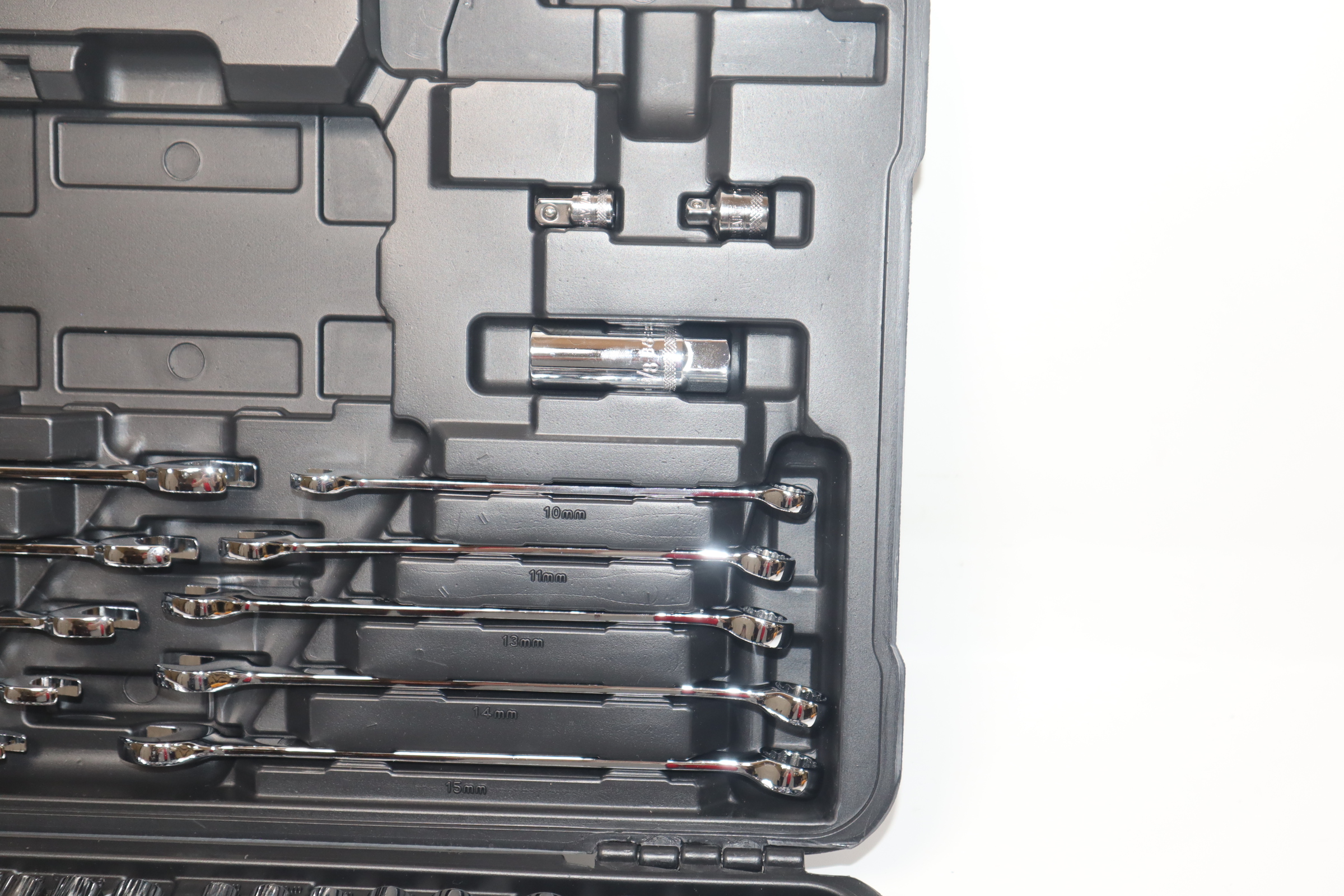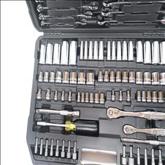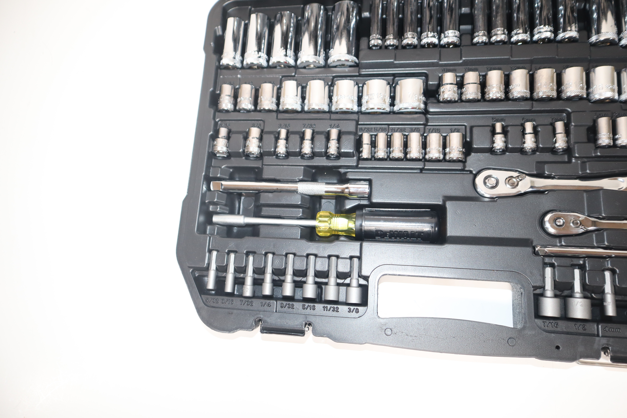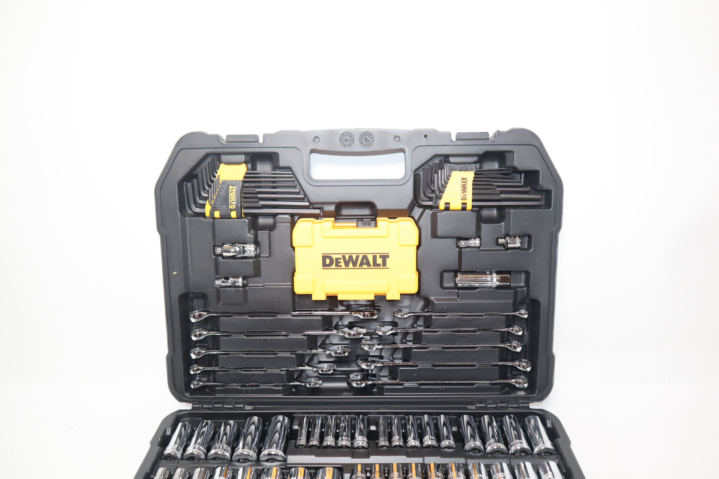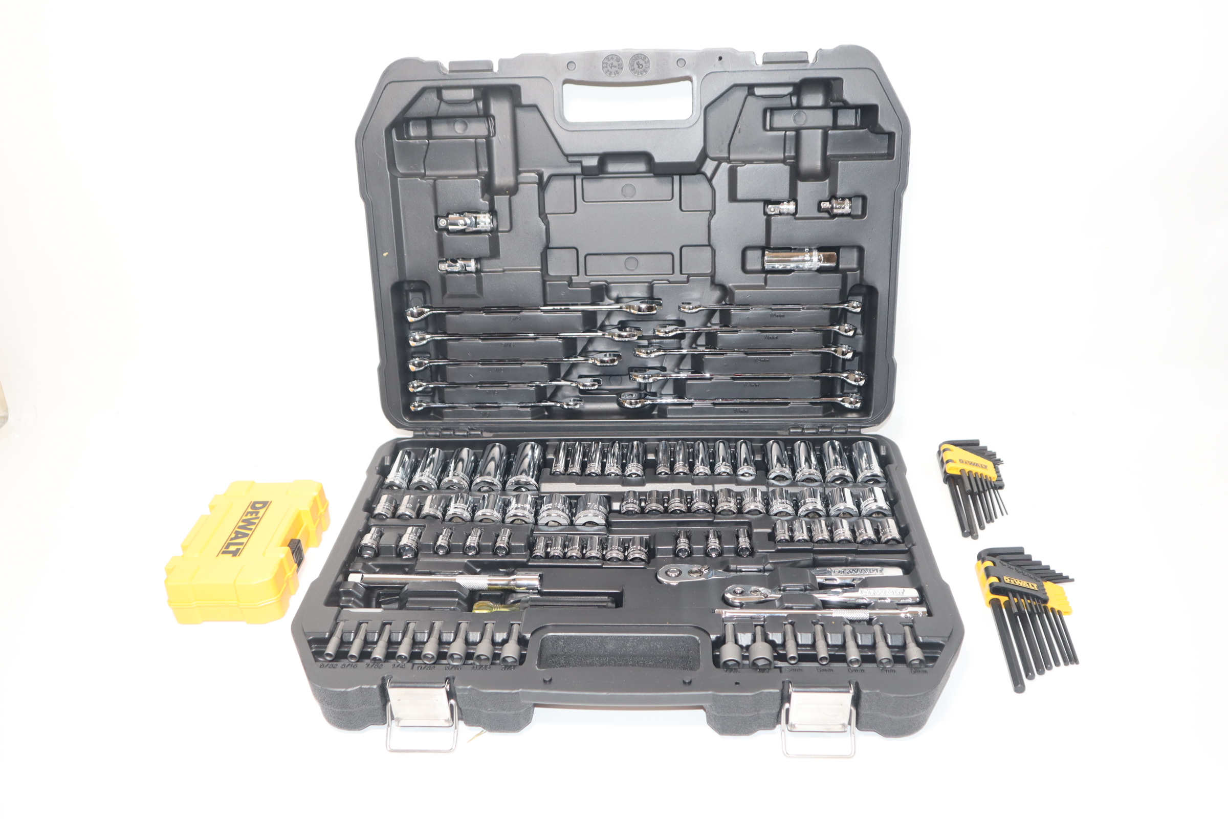 This 142-piece DEWALT Mechanic Tool Set is a versatile choice with two pear head ratchets, a variety of sockets, extensions, universal joints and adapters. The tool sets for mechanics come in a durable case featuring metal latches for added security of the tool sets for mechanics. The 72 tooth count ratchets come equipped with a quick release button to easily attach or remove a socket. The sockets included Direct Torque technology to help prevent rounding of fasteners and provide better grip.
