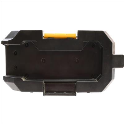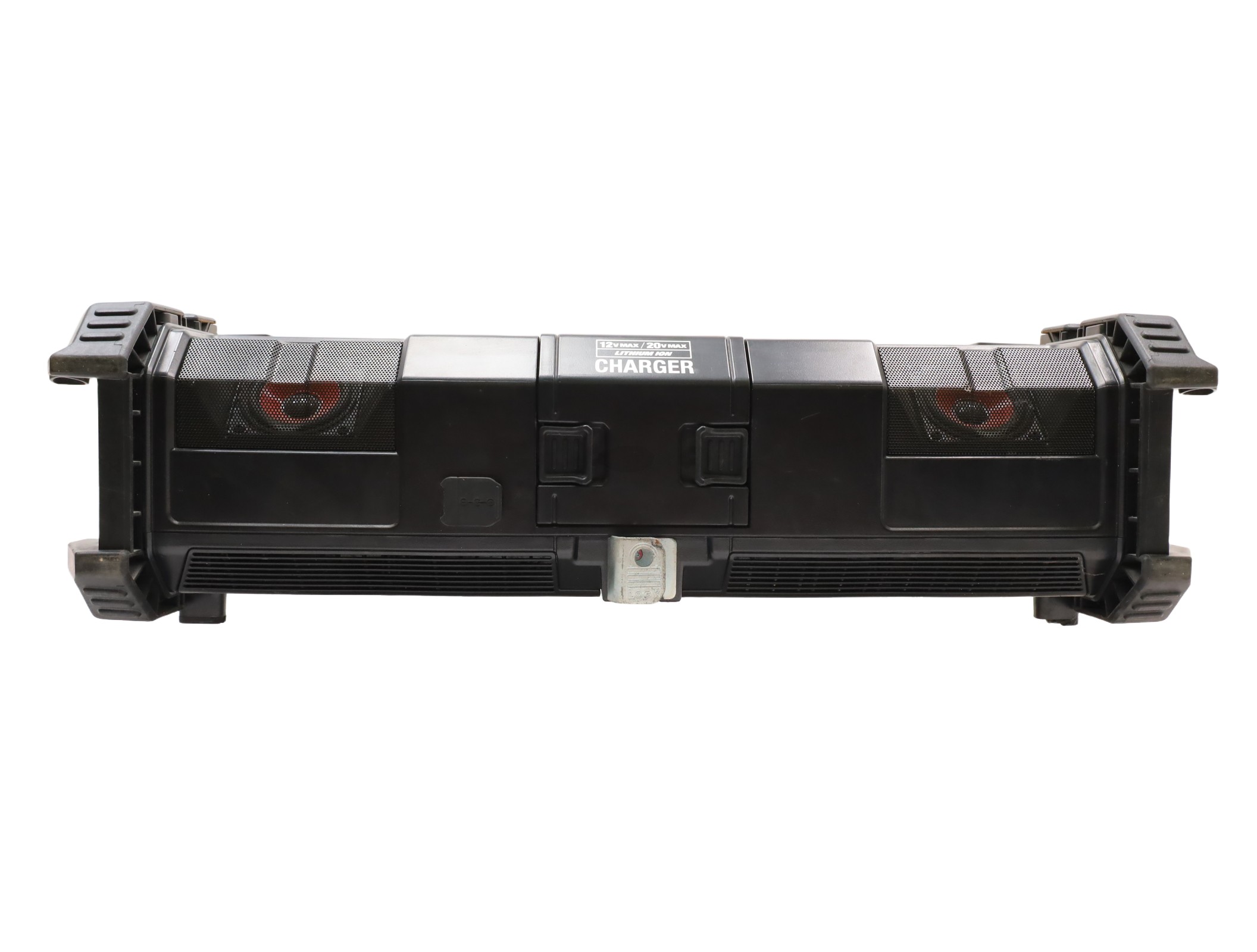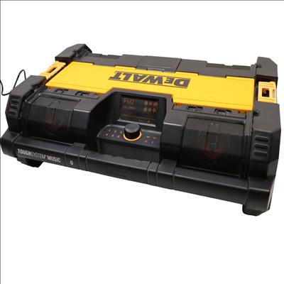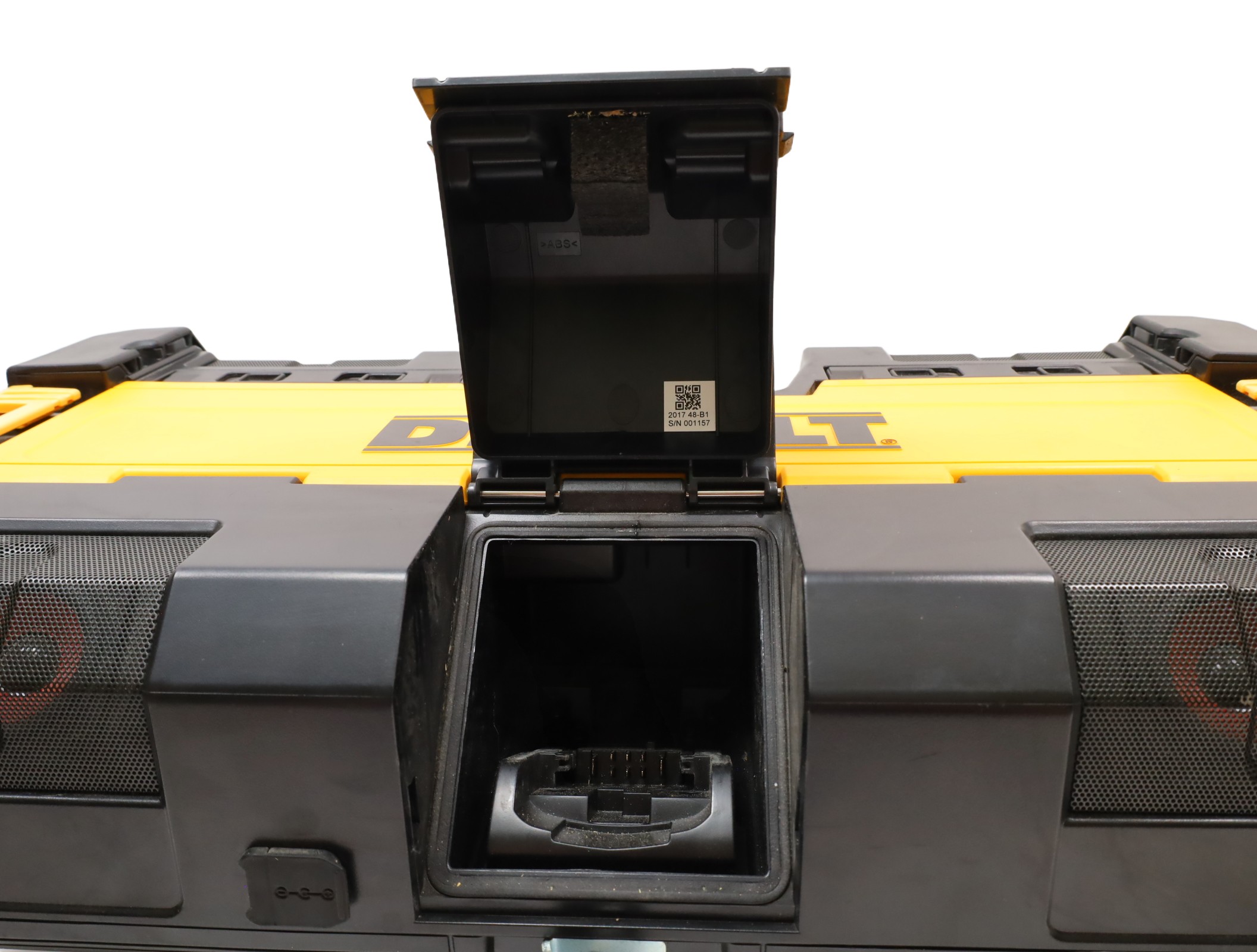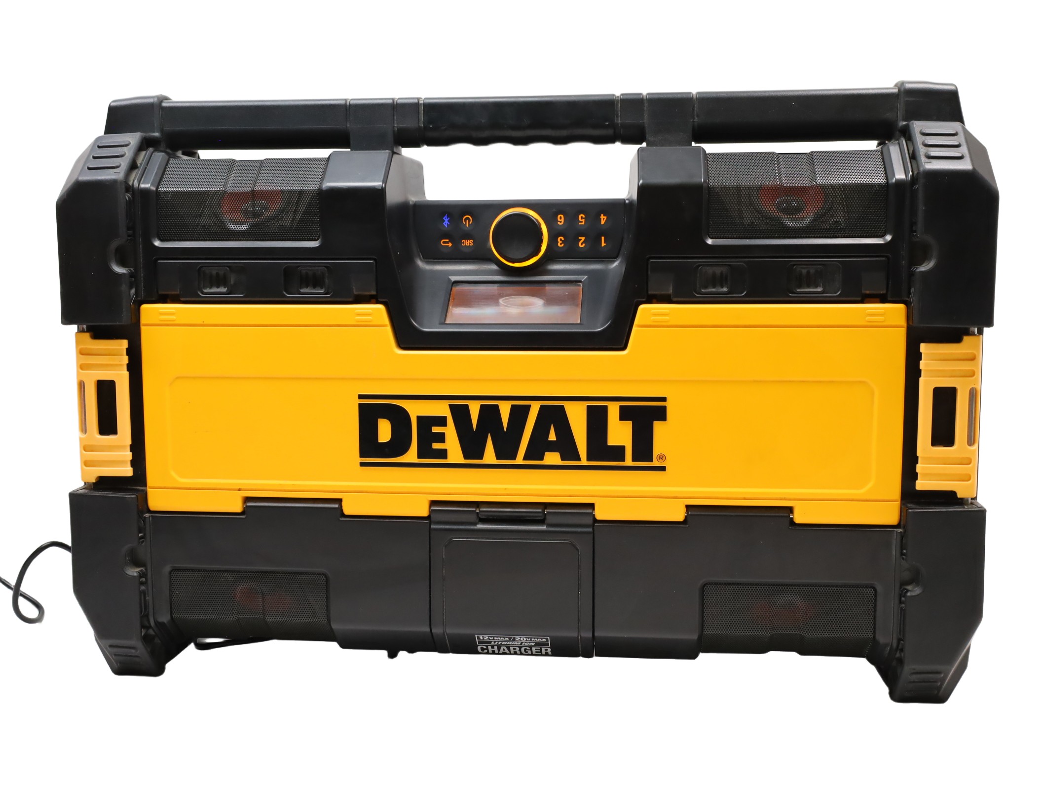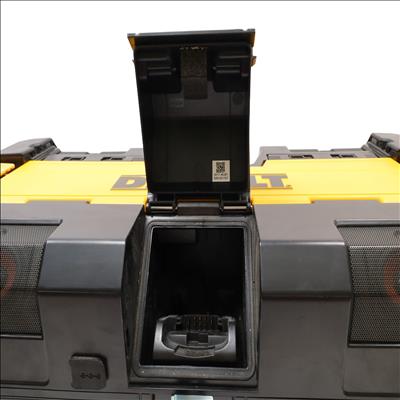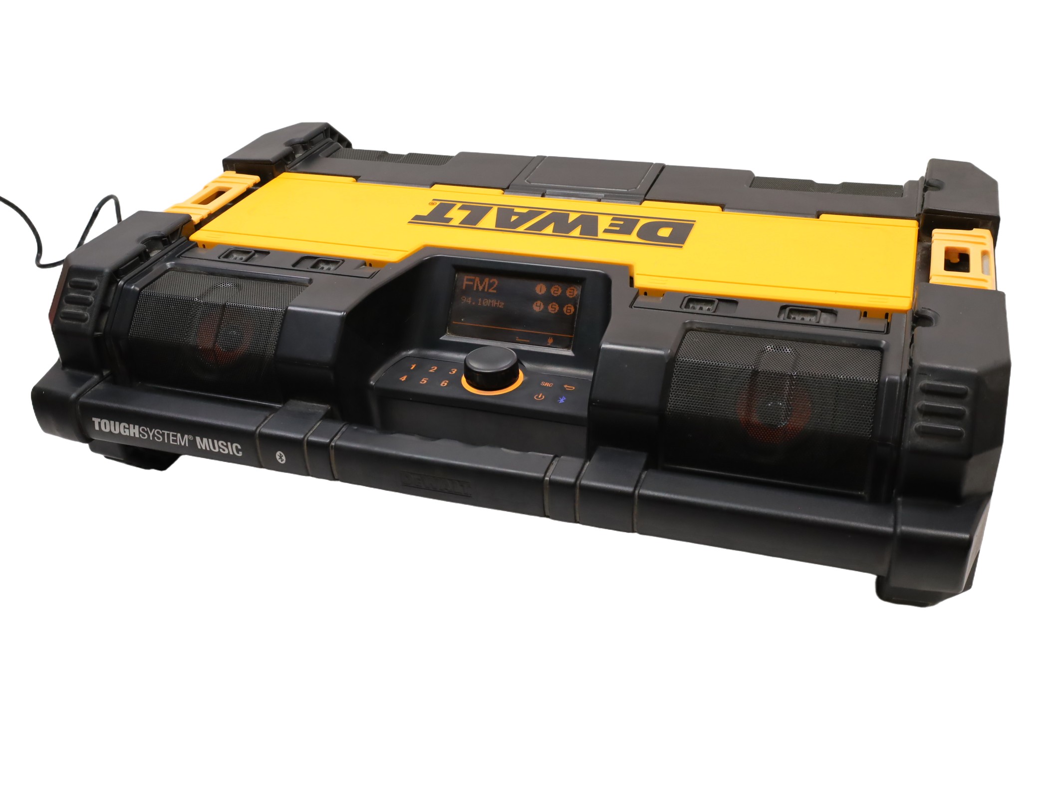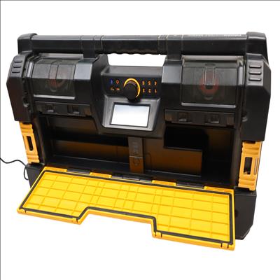 A rugged audio solution designed for job sites. It features a digital sound processor for optimized sound quality and can operate on either a 12-volt or 20-volt DeWalt battery, or via AC power for added flexibility. This unit includes an AM/FM radio with six preset channels and Bluetooth connectivity, allowing remote control from a phone or other device. Built to integrate with the DeWalt ToughSystem, it is both stackable and durable, with protected compartments to safeguard the battery, music device, and adapter in challenging environments.