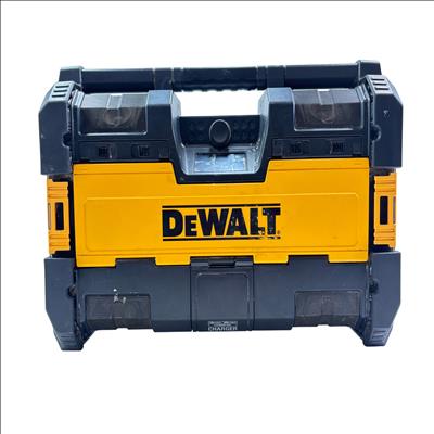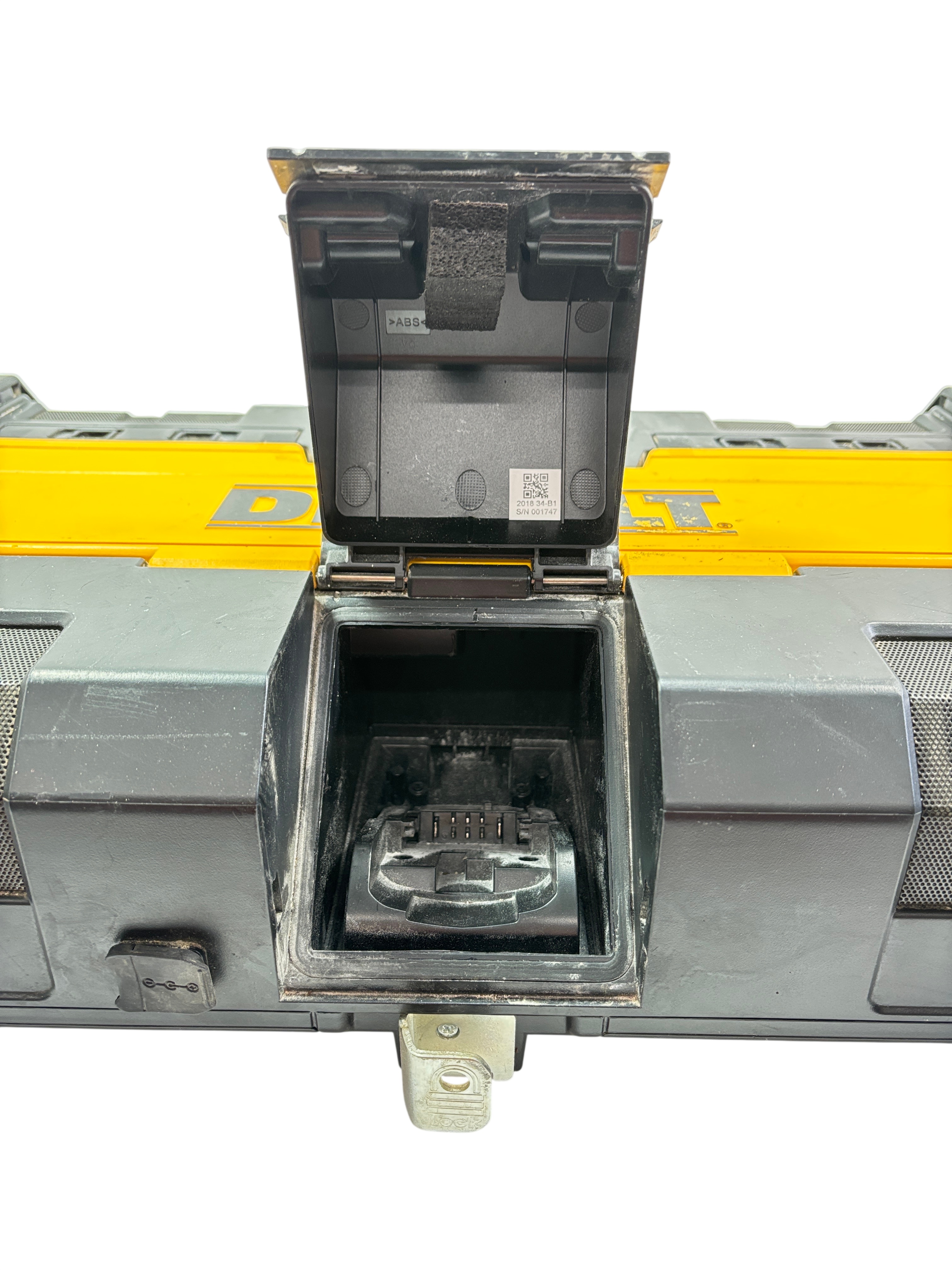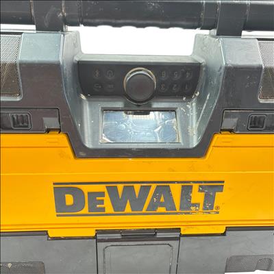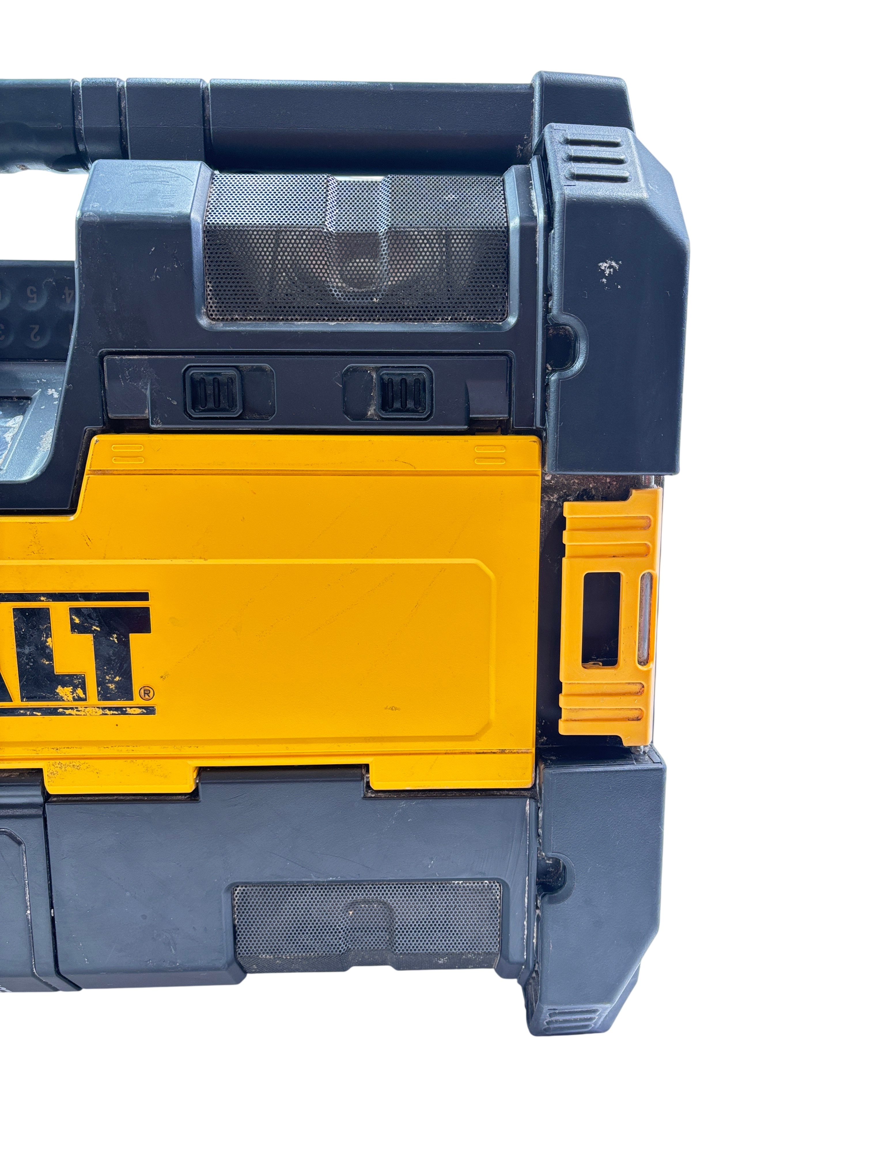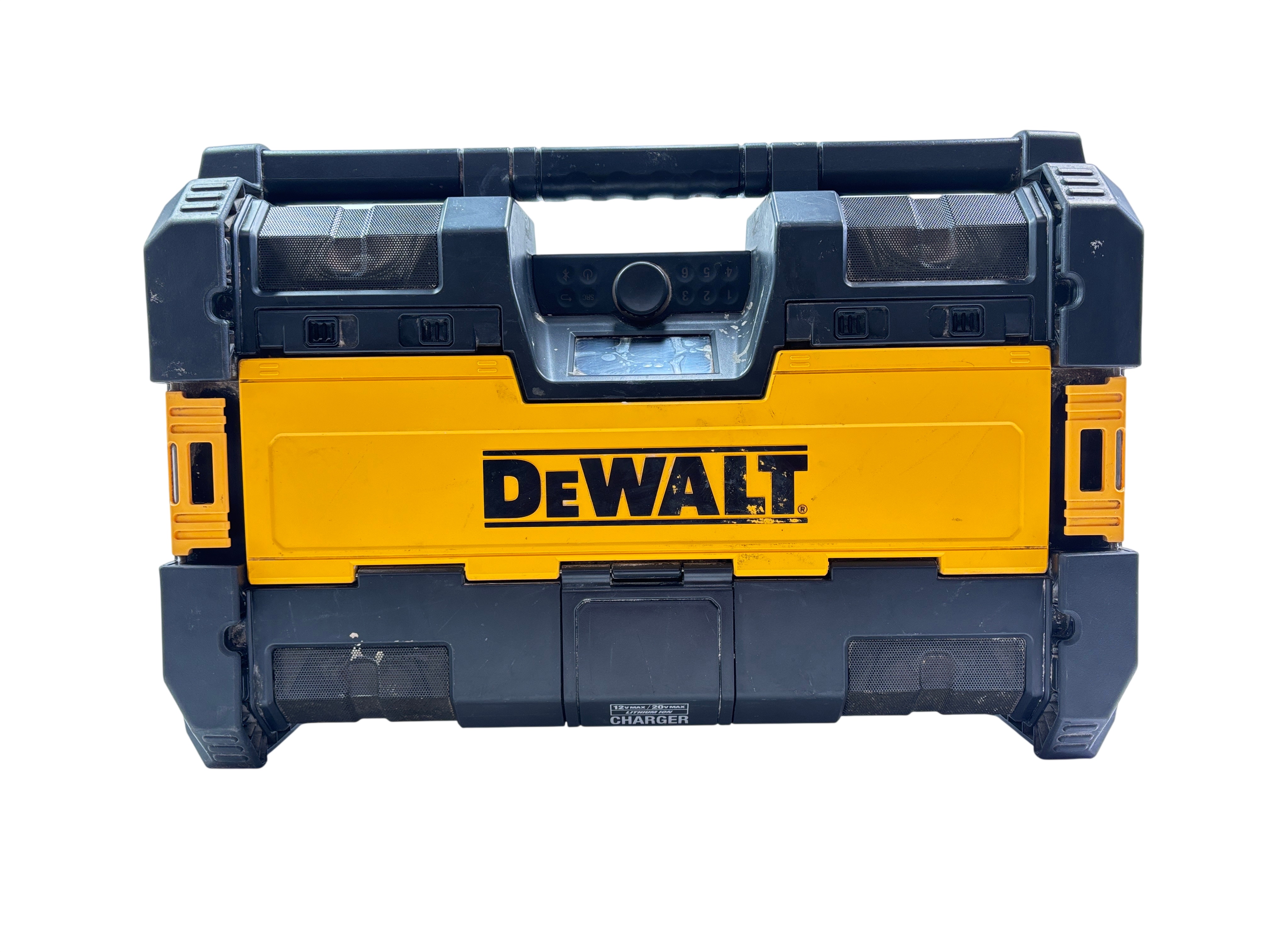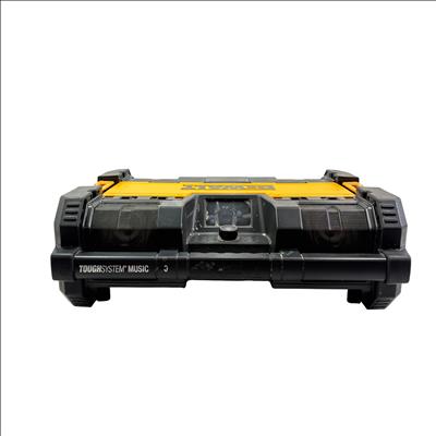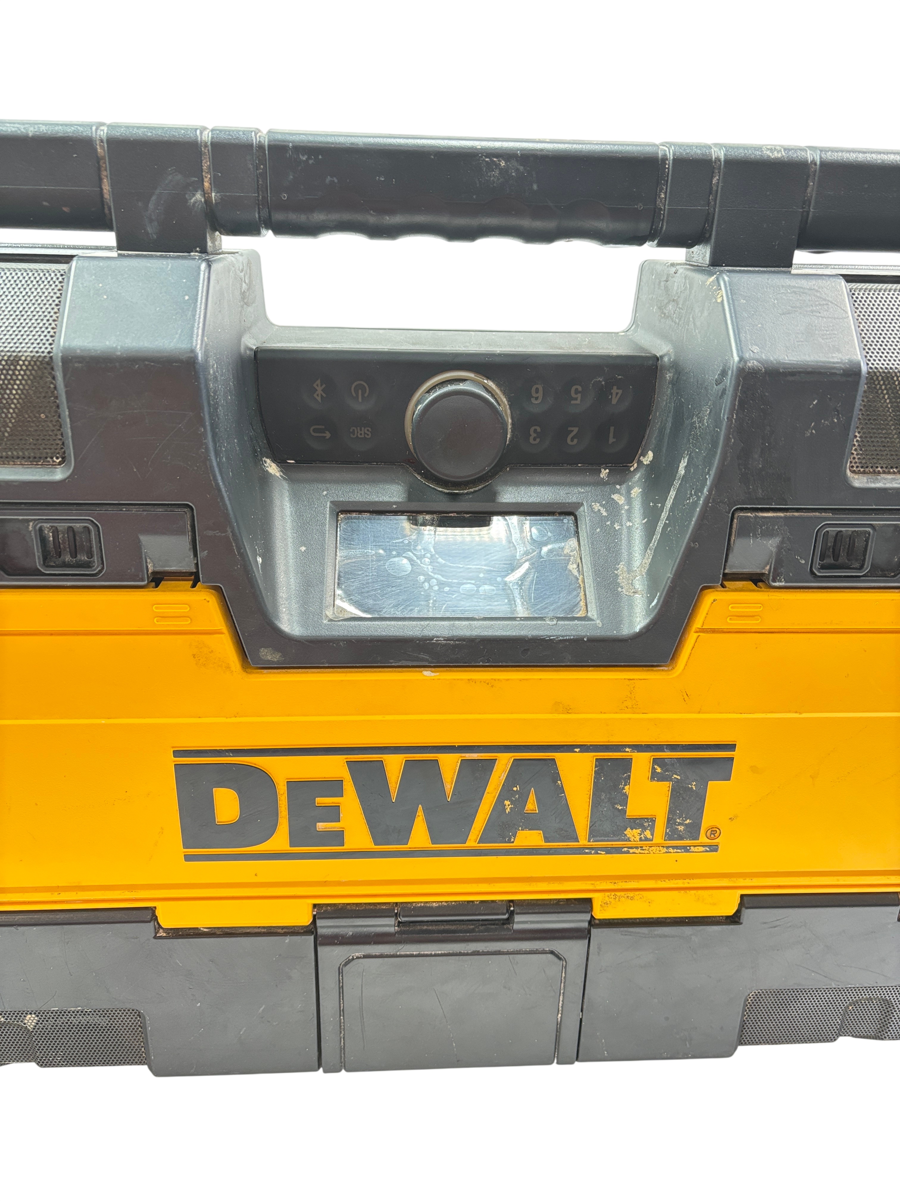 The DeWalt DWST08810 Job Site Radio is a rugged and portable audio solution designed for tough job site environments. Compatible with DEWALT DCB series 12V and 20V lithium-ion rechargeable battery packs, this radio features Bluetooth connectivity for wireless streaming, an AM/FM tuner, and a USB port for charging mobile devices. Its durable yellow and black housing includes a convenient carry handle and a digital display with preset station buttons for easy operation. Ideal for professionals seeking reliable audio and device charging on the go, this radio delivers powerful sound and versatile functionality in a compact form factor.