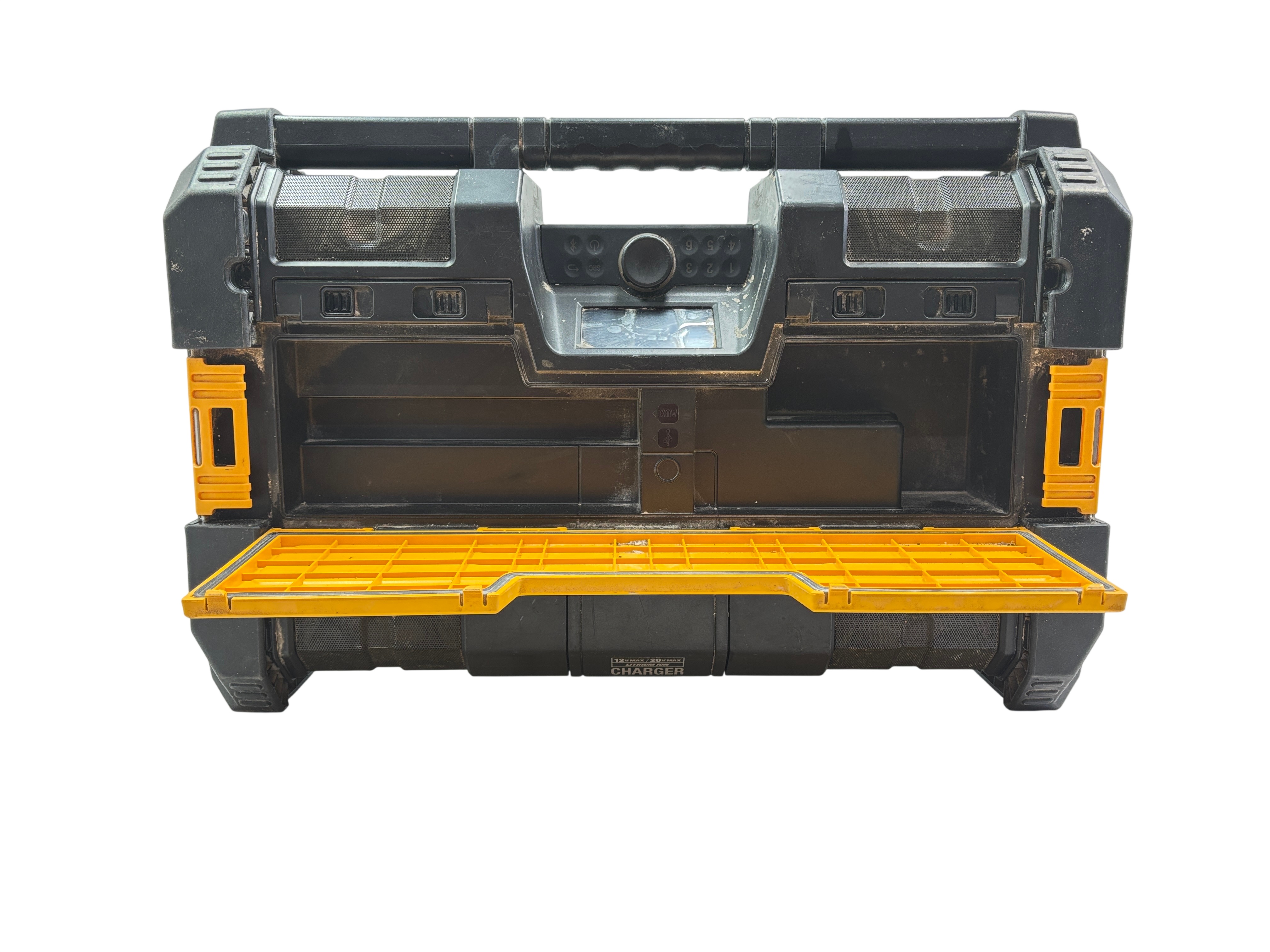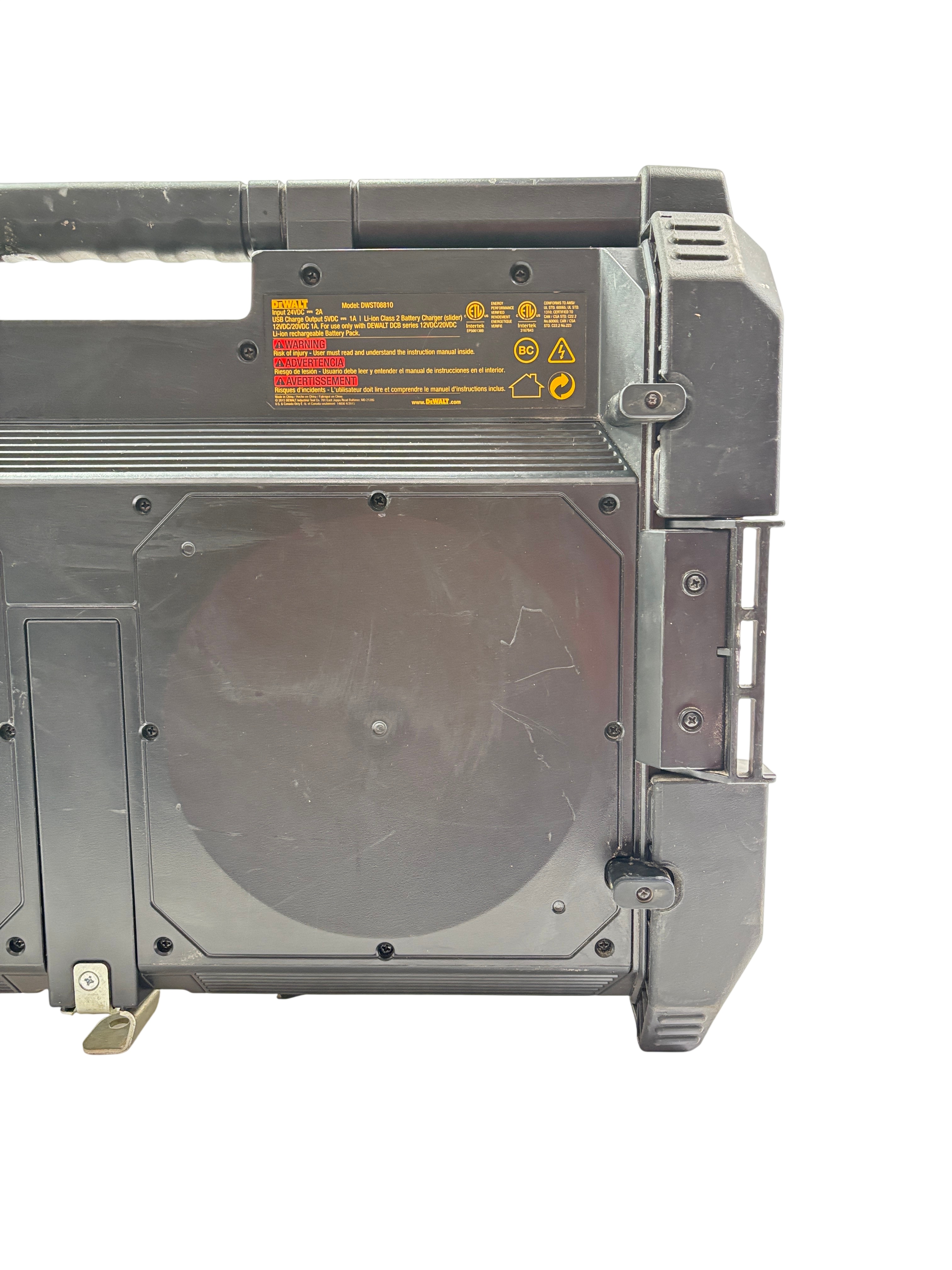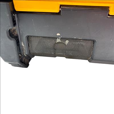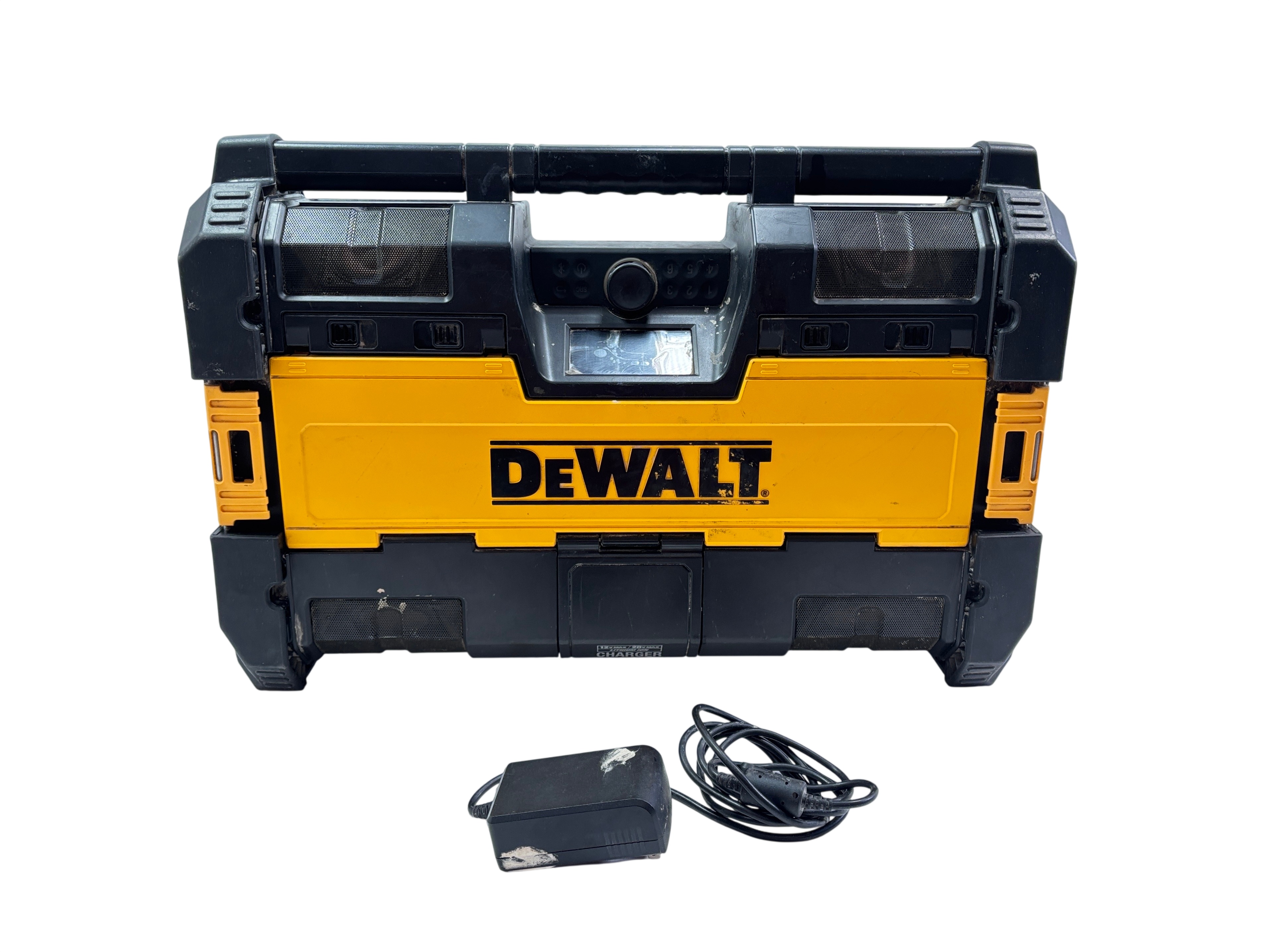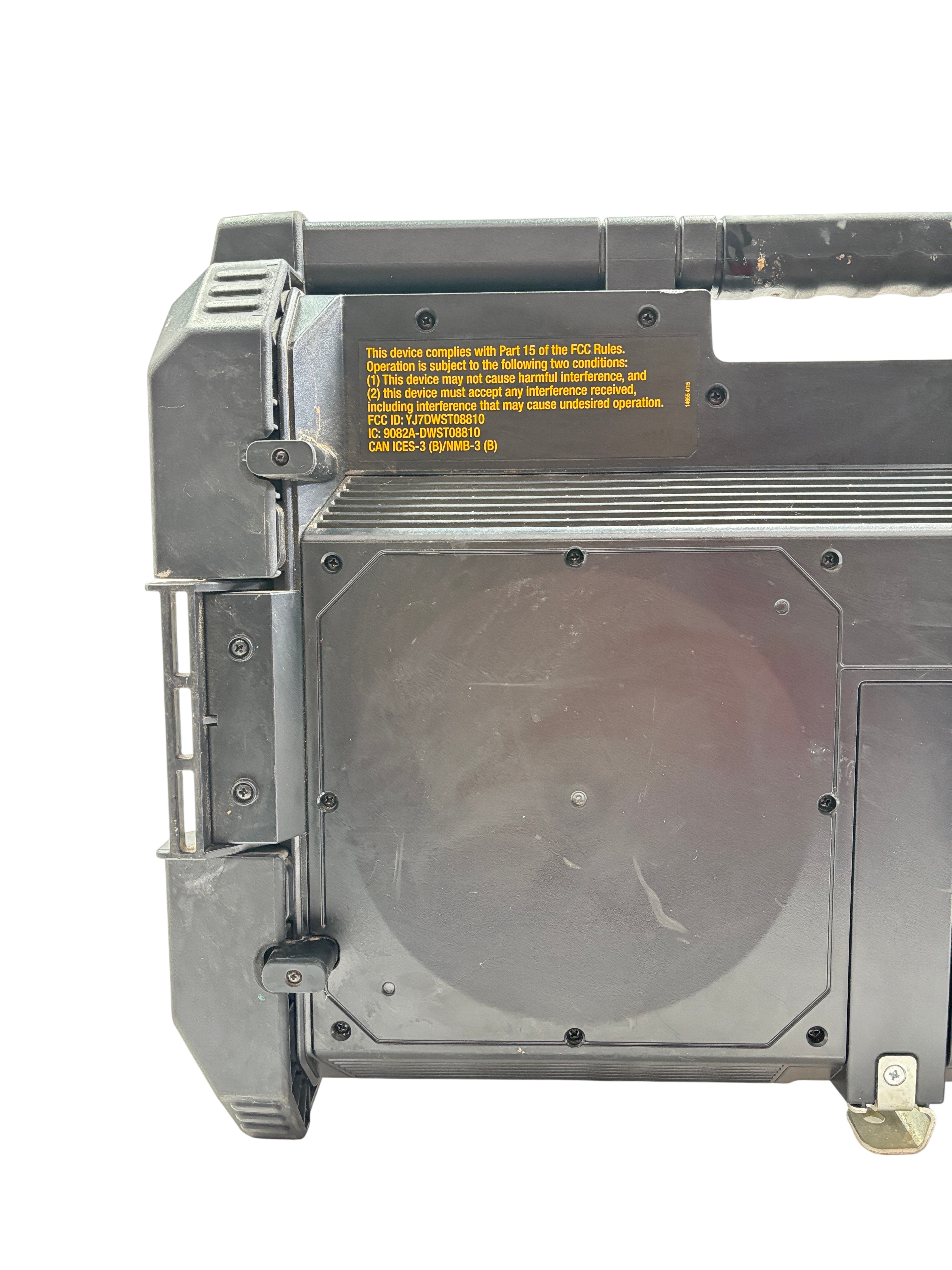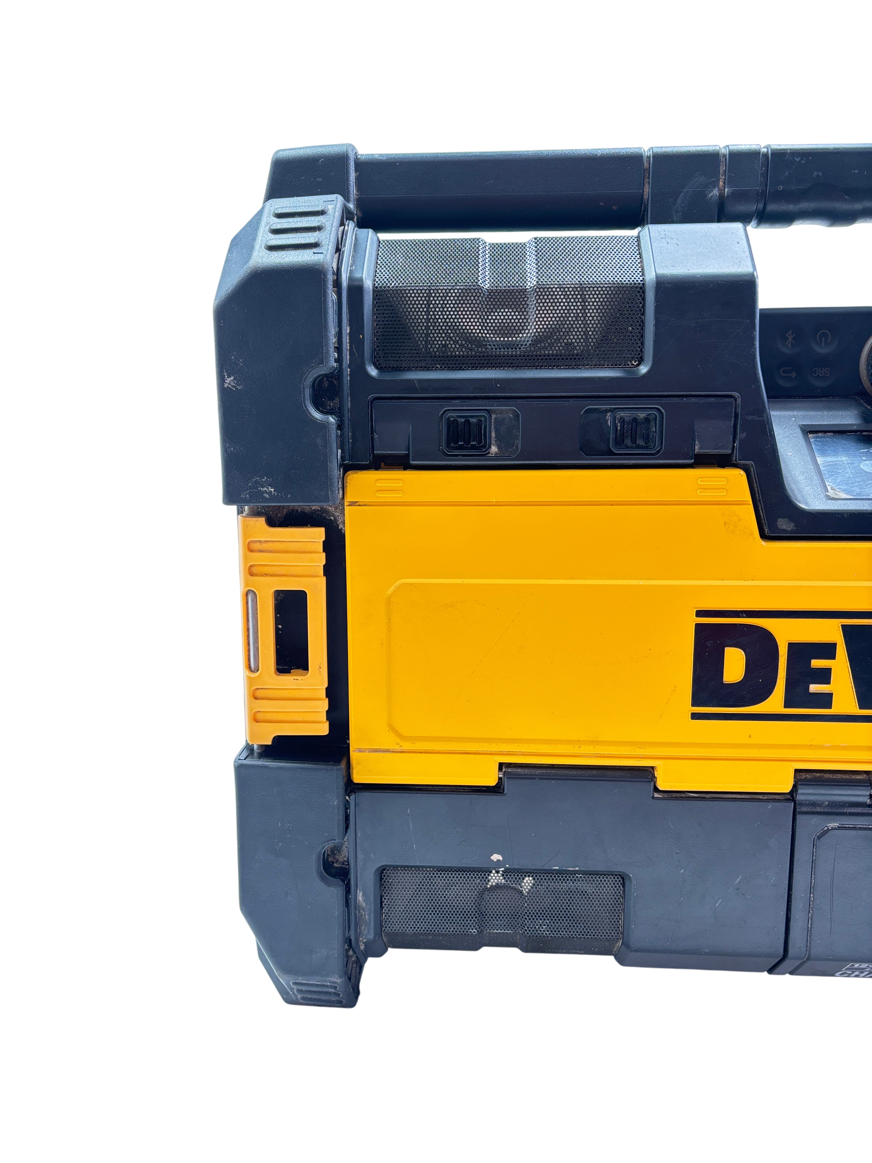 The DeWalt DWST08810 Job Site Radio is a rugged and portable audio solution designed for tough job site environments. Compatible with DEWALT DCB series 12V and 20V lithium-ion rechargeable battery packs, this radio features Bluetooth connectivity for wireless streaming, an AM/FM tuner, and a USB port for charging mobile devices. Its durable yellow and black housing includes a convenient carry handle and a digital display with preset station buttons for easy operation. Ideal for professionals seeking reliable audio and device charging on the go, this radio delivers powerful sound and versatile functionality in a compact form factor.