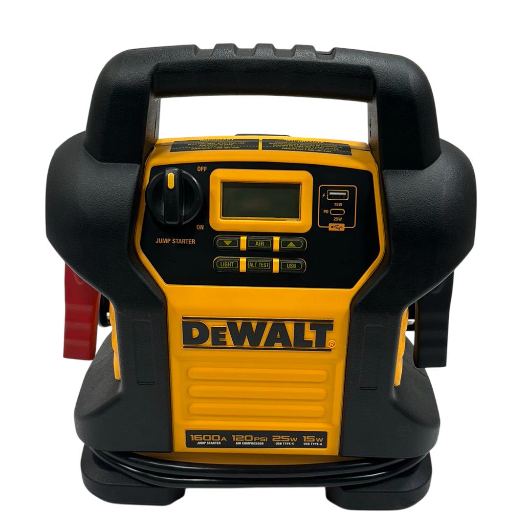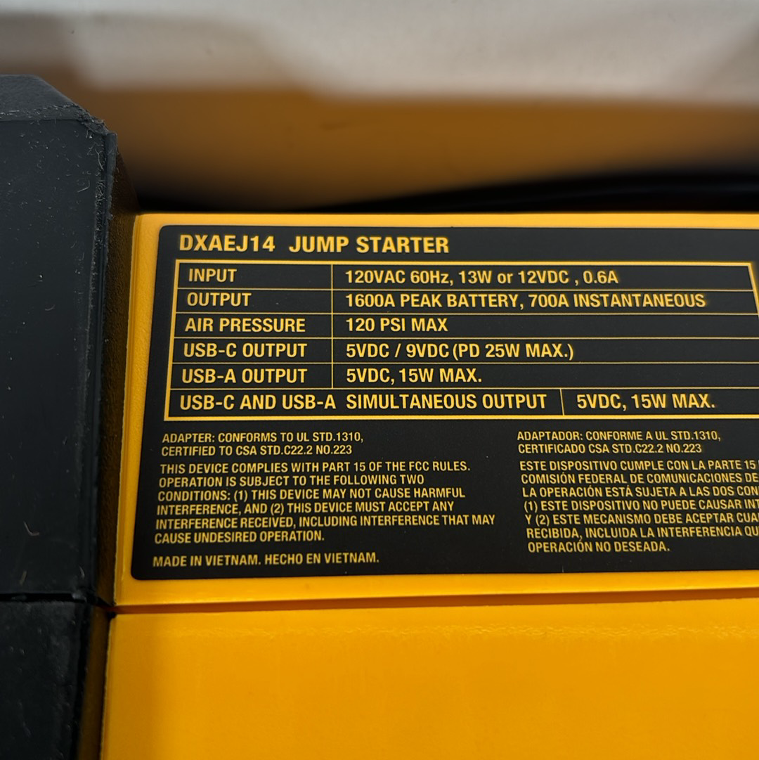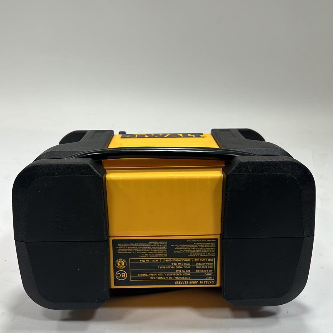 Introducing the DeWalt DXAEJ14 1600A Jump Starter, the ultimate tool for power on-the-go. This heavy-duty device not only jump-starts your vehicle with its impressive 1600A battery, but it also features a 120PSI air compressor and versatile USB outputs for charging your devices. Perfect for emergencies and everyday use, this durable jump starter combines power, reliability, and convenience in one compact package.