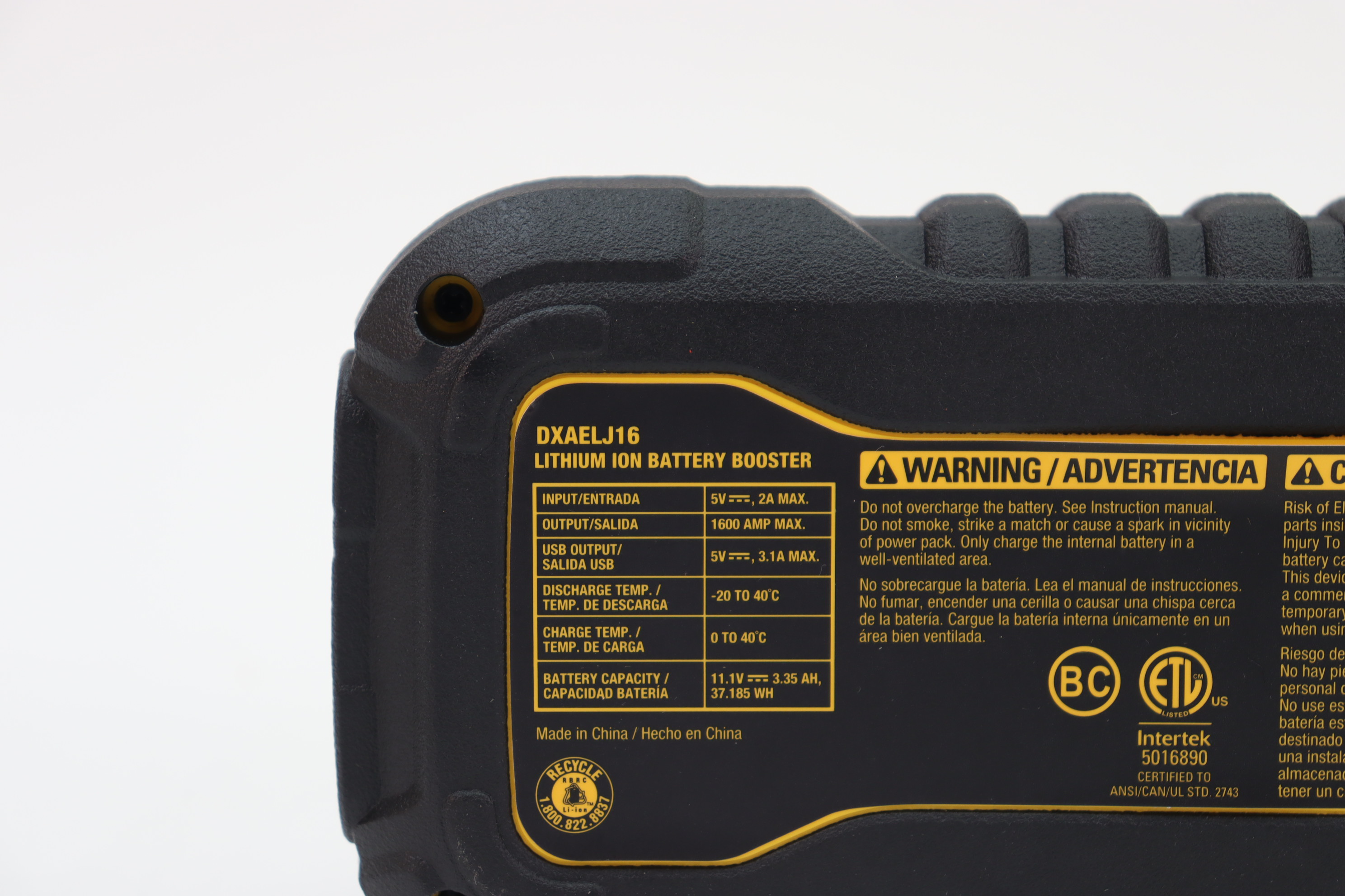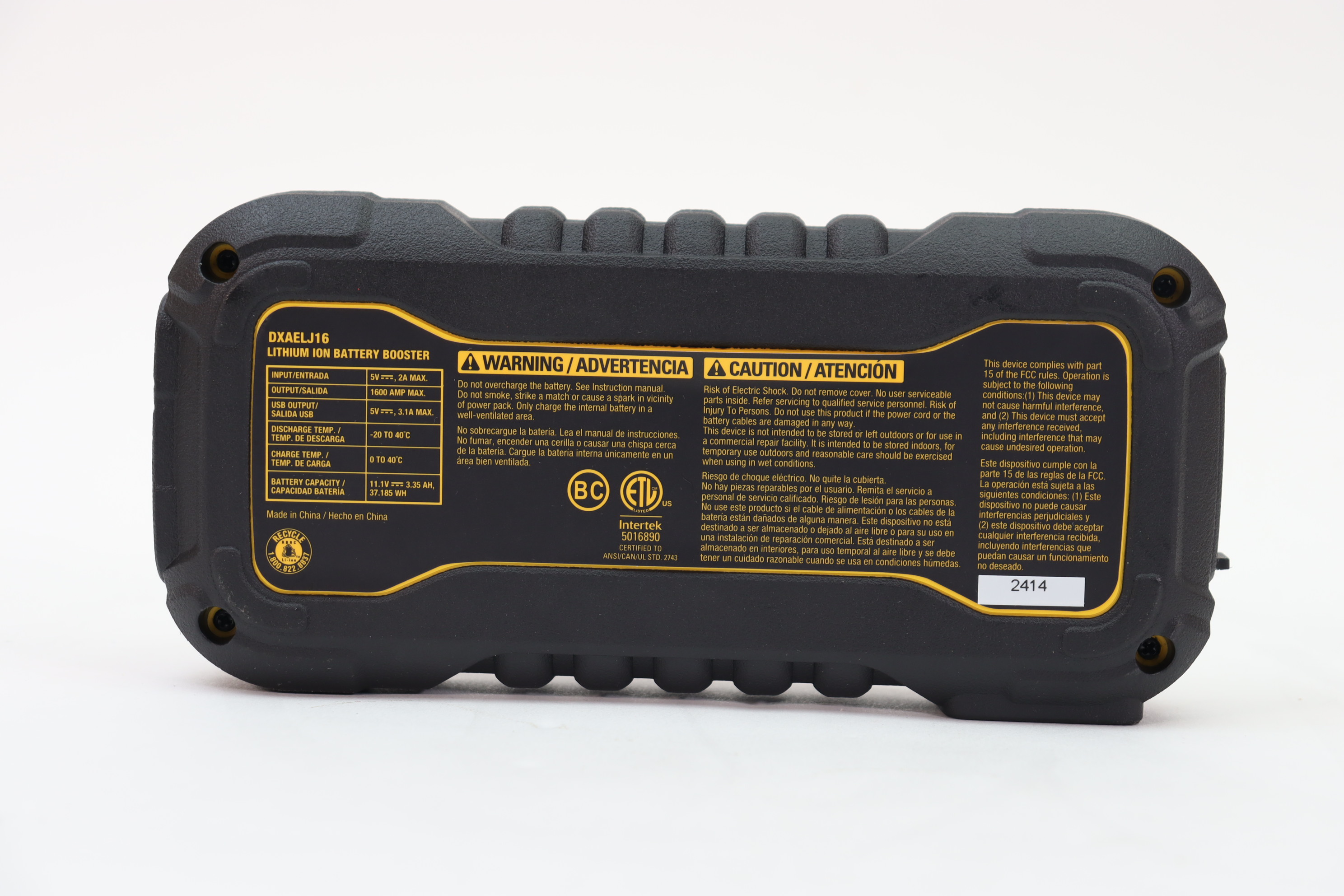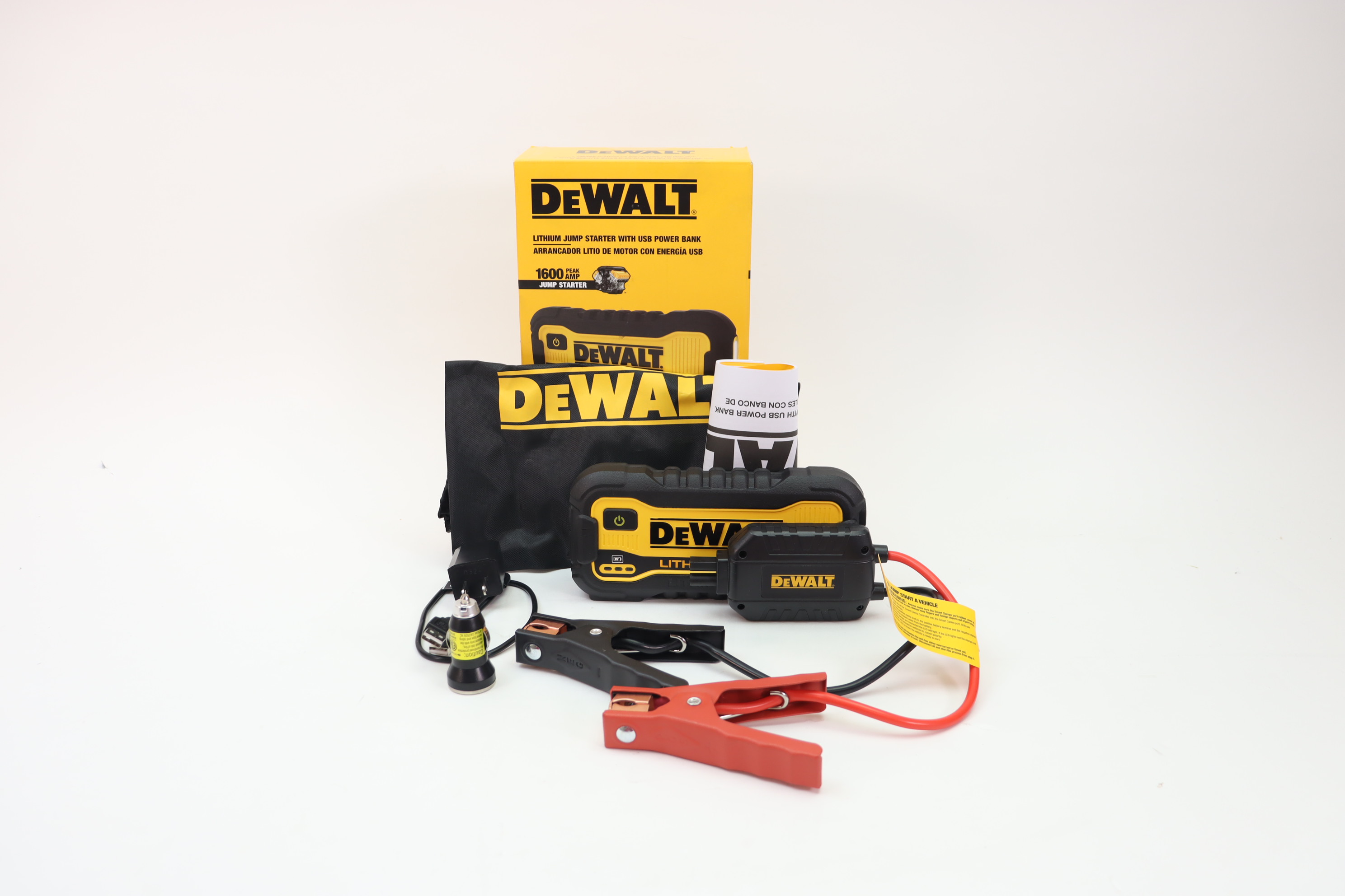 The DeWalt DXAELJ16 is a portable jump starter and USB power bank in a small take along size. 1600 peak amps of starting power instantly jump starts cars and trucks up to 8-cylinders. Power coated metal clamps are included. Anti-polarity protection to assure that jumper cables are placed correctly. USB ports make it easy to power laptops, cell phones, tablets gaming devices and most USB powered devices.