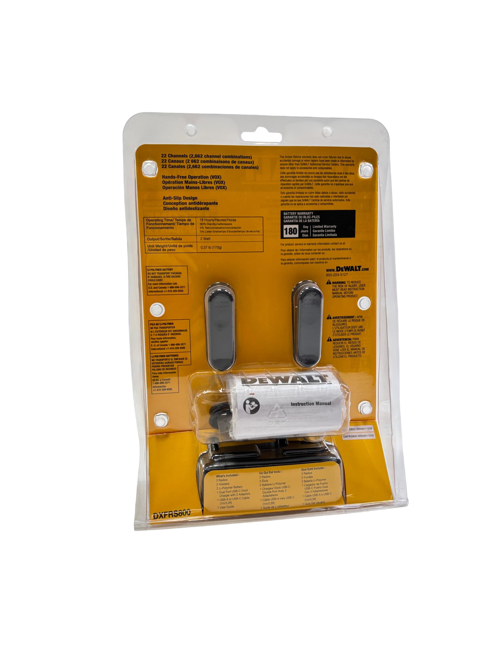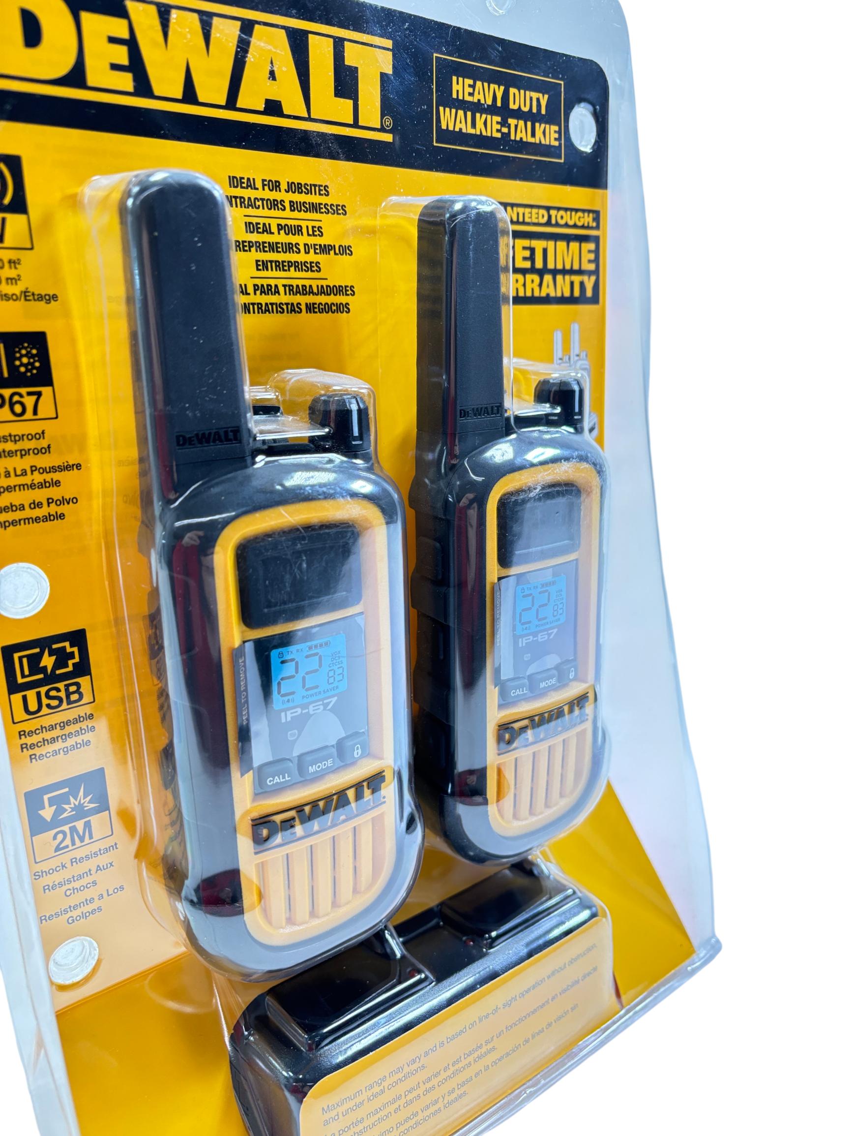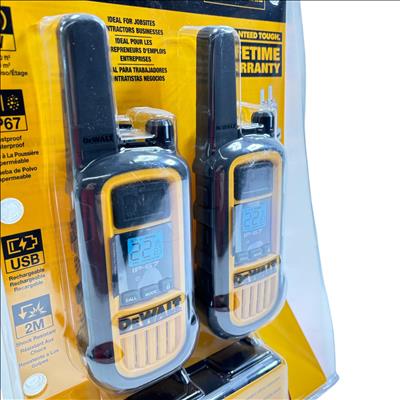 DeWalt DXFRS800 2W 22-Channel Heavy Duty Walkie Talkie offers rugged, reliable two-way communication designed specifically for demanding jobsite environments. Featuring a 2-watt power output and IP67-rated dustproof and waterproof durability, these radios provide long-range connectivity and shock resistance to handle tough conditions. Ideal for contractors and businesses needing clear and dependable team communication on the worksite.