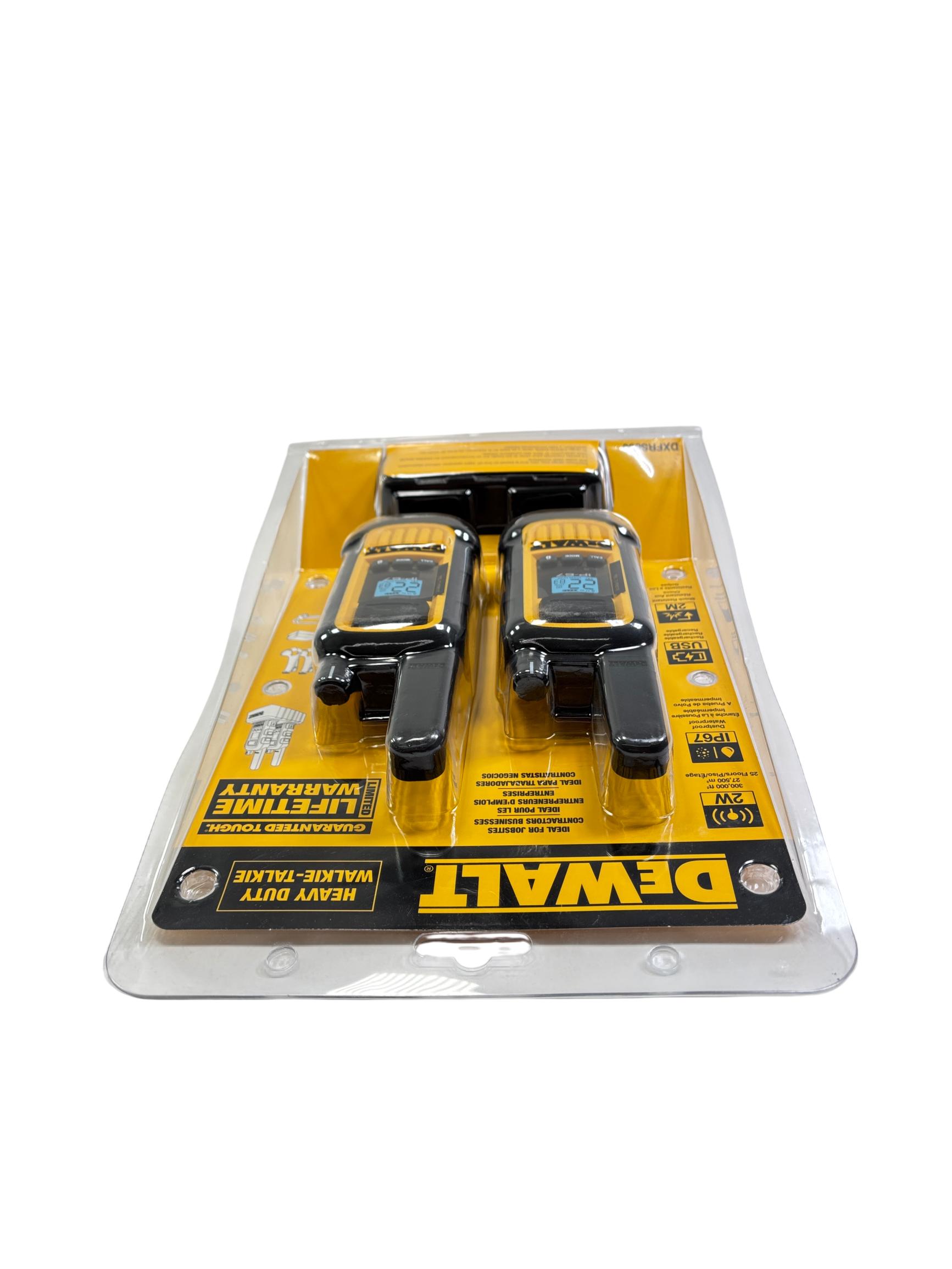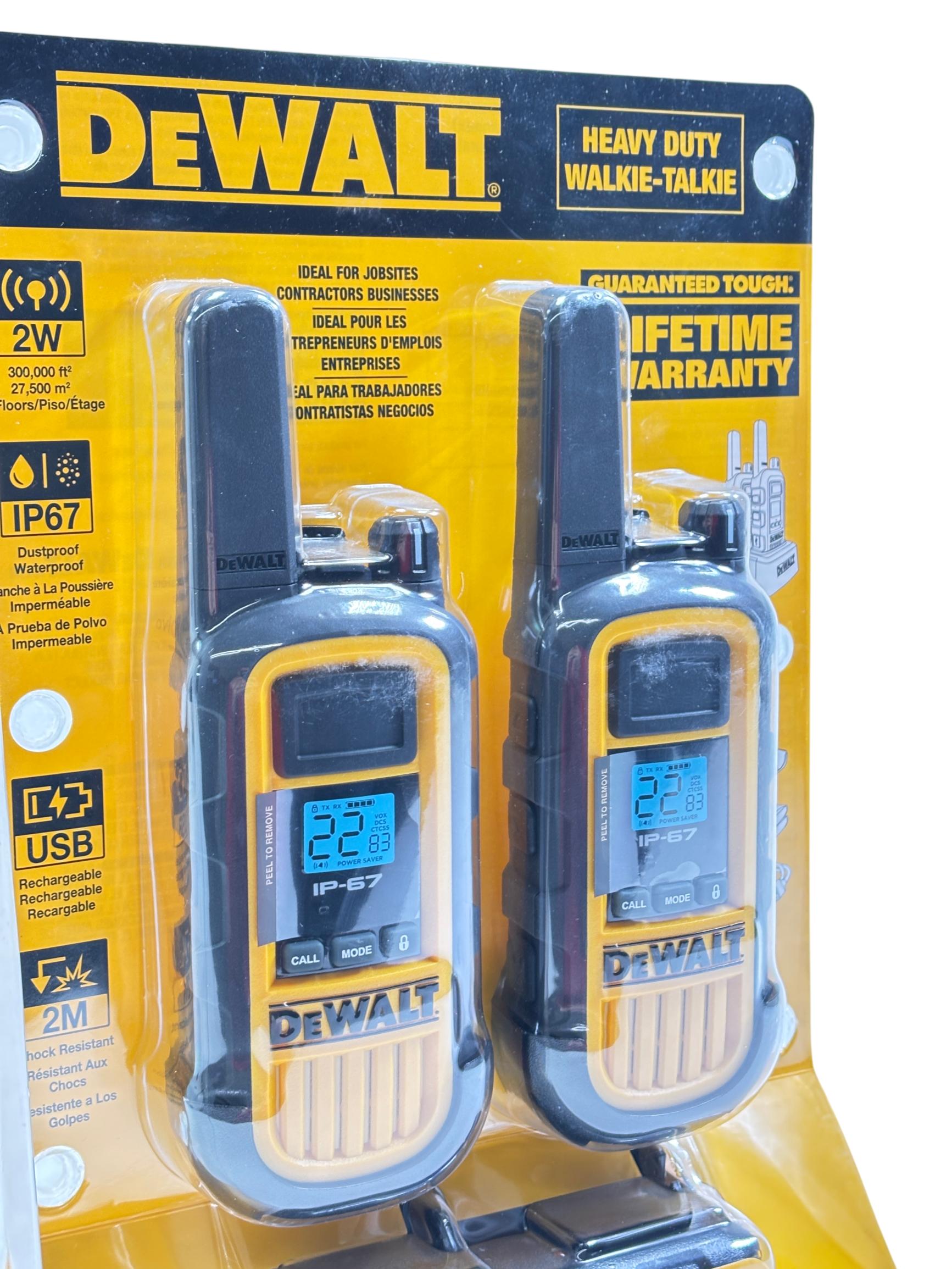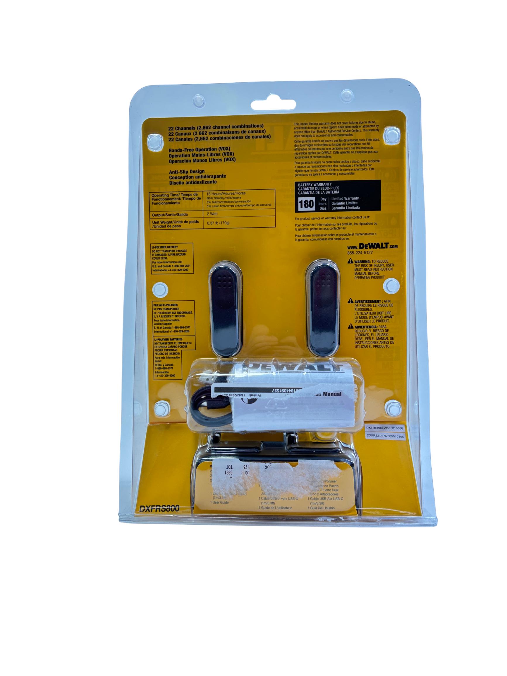 DeWalt DXFRS800 2W 22-Channel Heavy Duty Walkie-Talkie deliver reliable communication with 2 watts of power across 22 channels, perfect for job sites and contractors. Featuring a rugged, anti-slip design and built to withstand tough environments, these walkie-talkies provide clear, hands-free operation through VOX technology and are dust resistant with an IP67 rating. Their durable construction and easy channel combination make them ideal for professional use in demanding conditions.