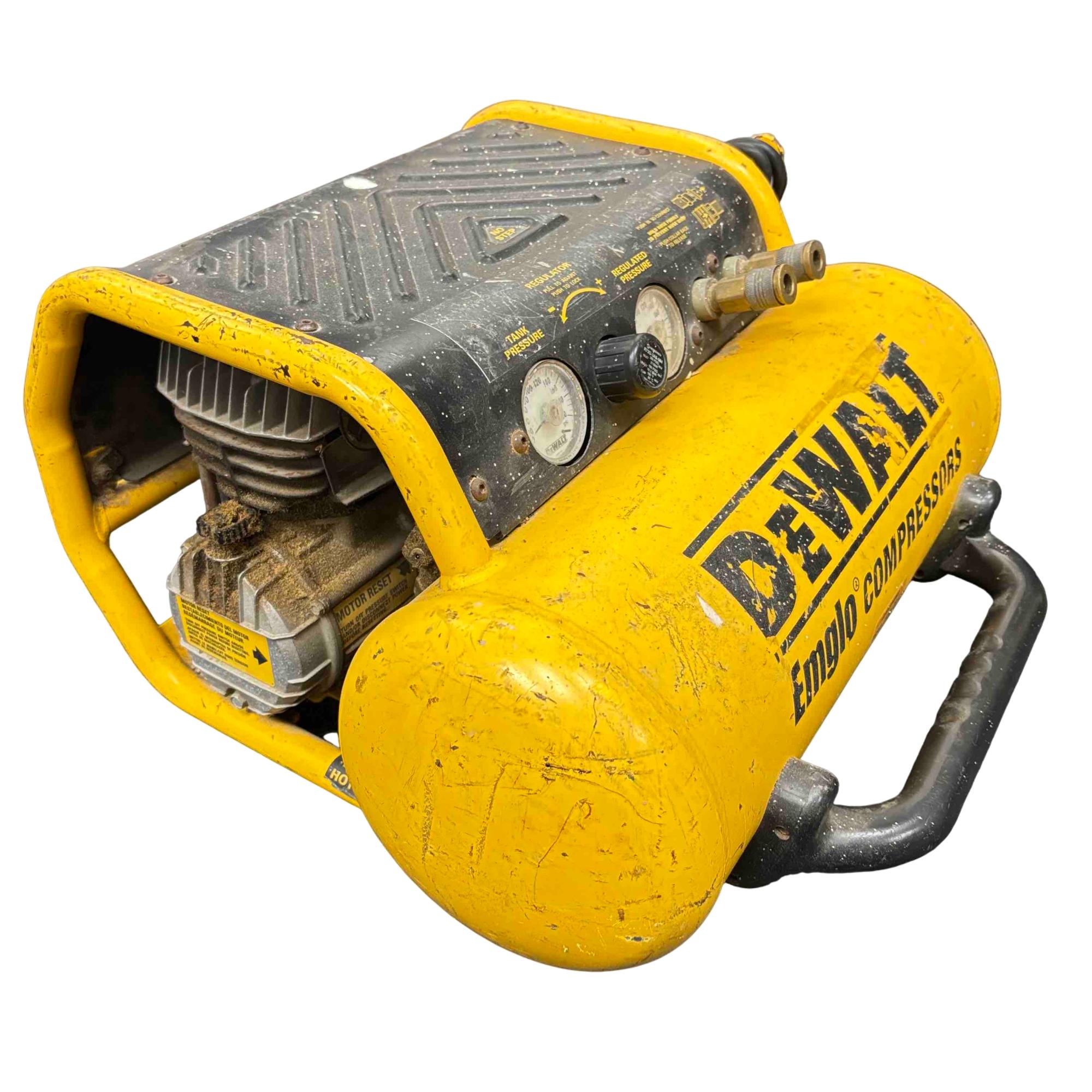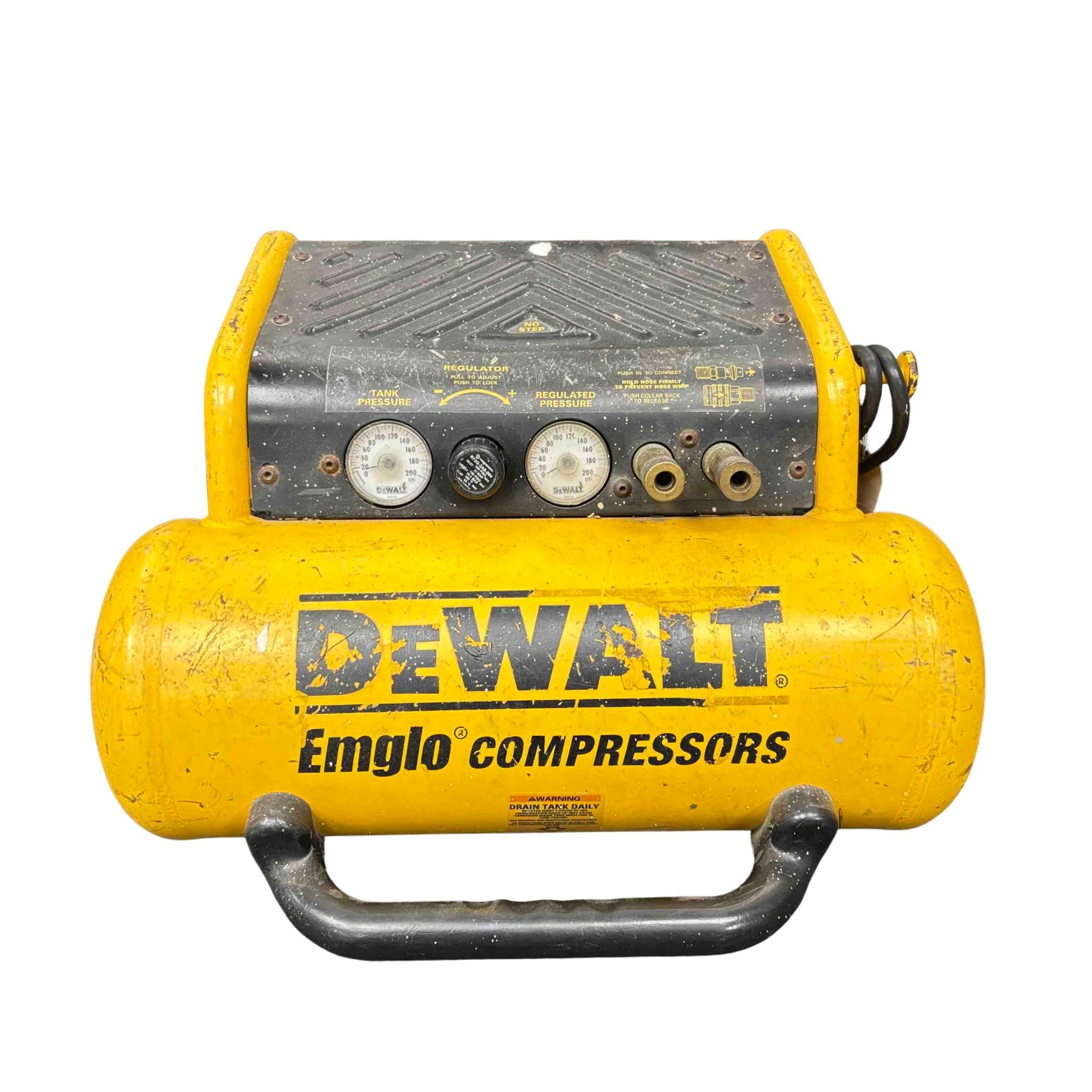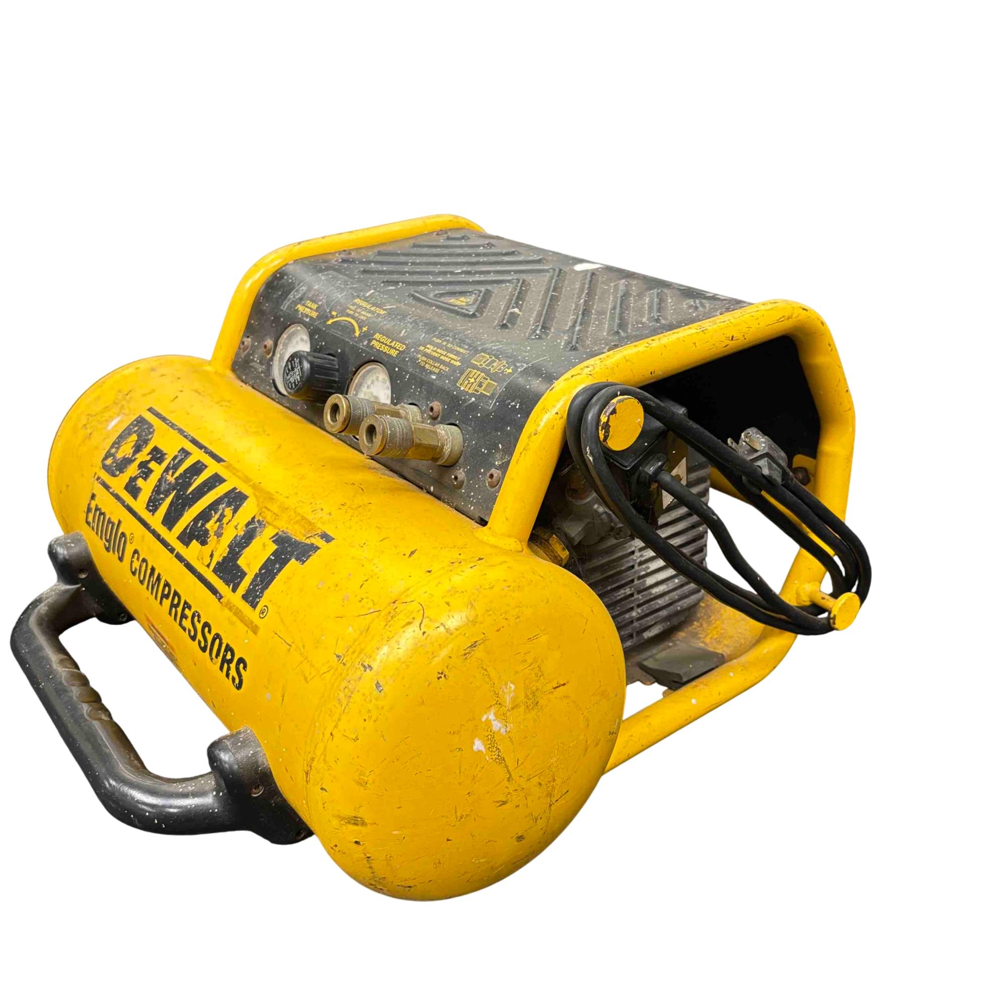 The DeWalt Emglo D55155 is a portable electric air compressor designed for rugged job site performance. Featuring a 1.2 HP motor and dual gauges for tank and regulated pressure, this yellow and black powerhouse is trusted by professionals for its reliable air delivery and compact design. Perfect for powering pneumatic tools, inflating tires, and providing consistent compressed air wherever you need it.