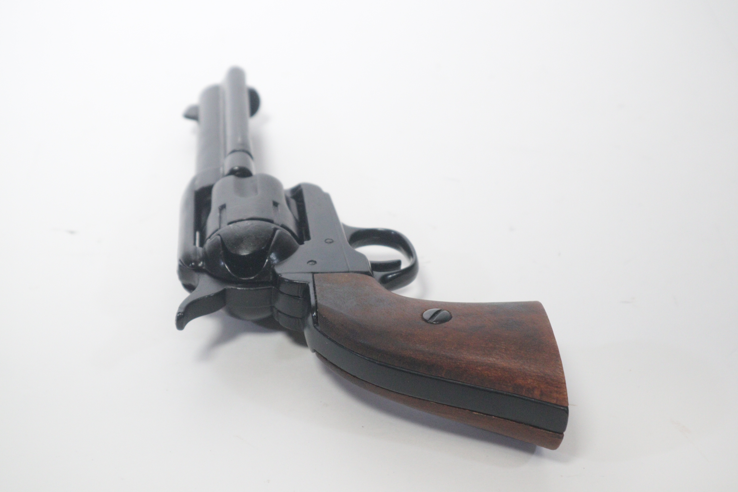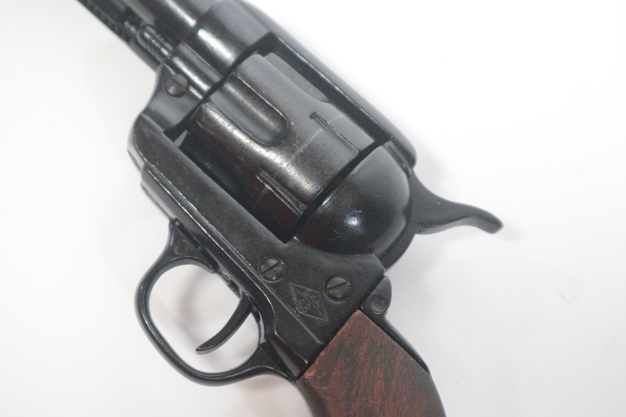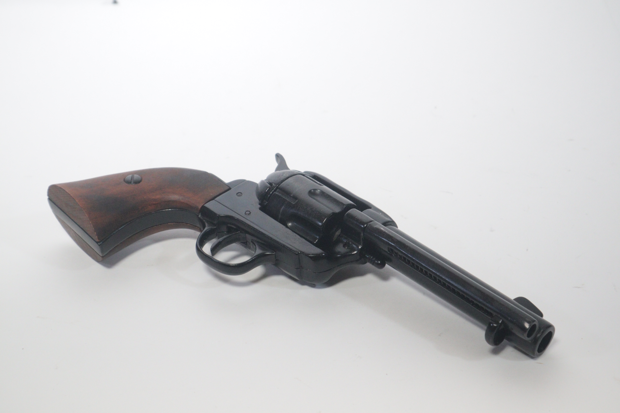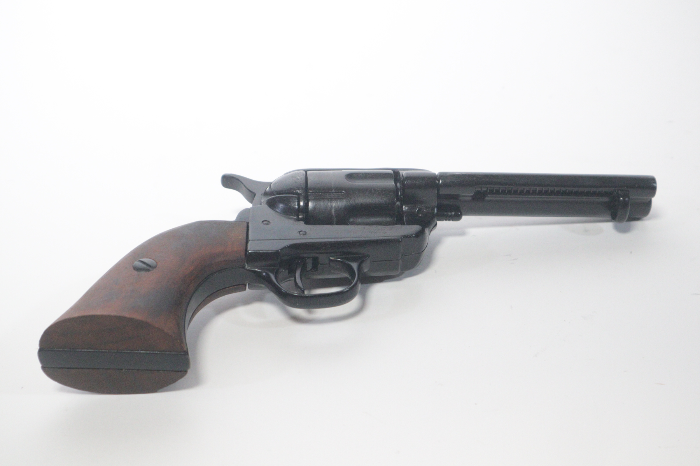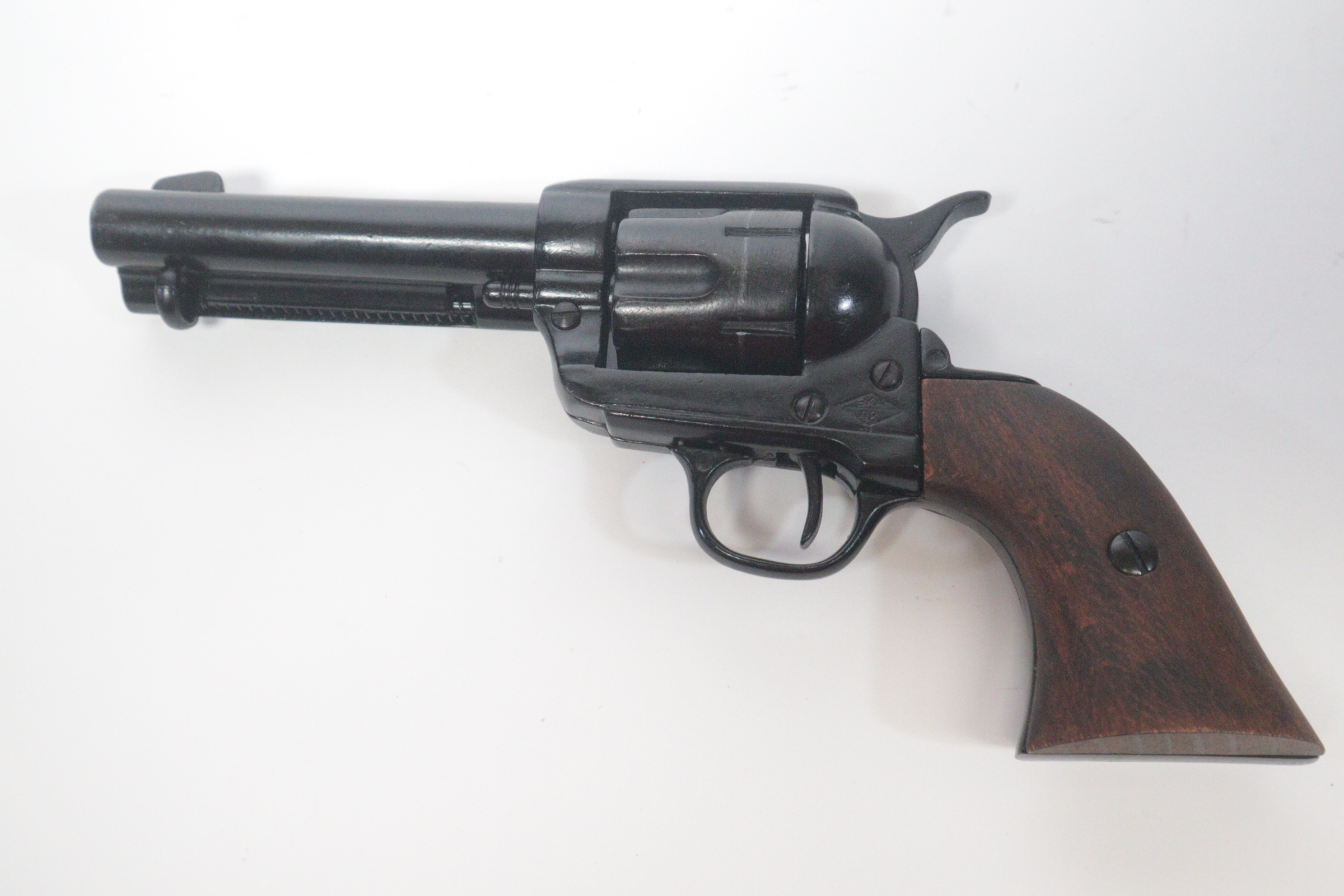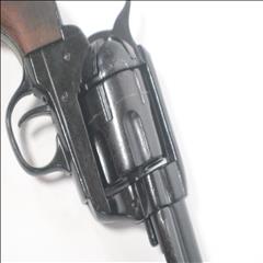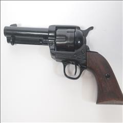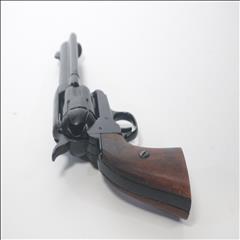 The single-action army revolver was produced in several forms and many calibers from 1872 to 1940, with production totaling about 350,000 pieces. This non-firing version has a functional lock mechanism with a revolving cylinder and working ejector system. This item is not for sale in some specific zip codes.