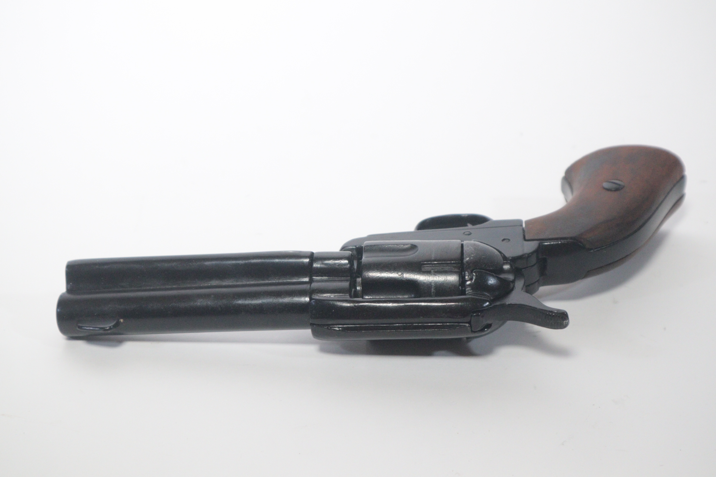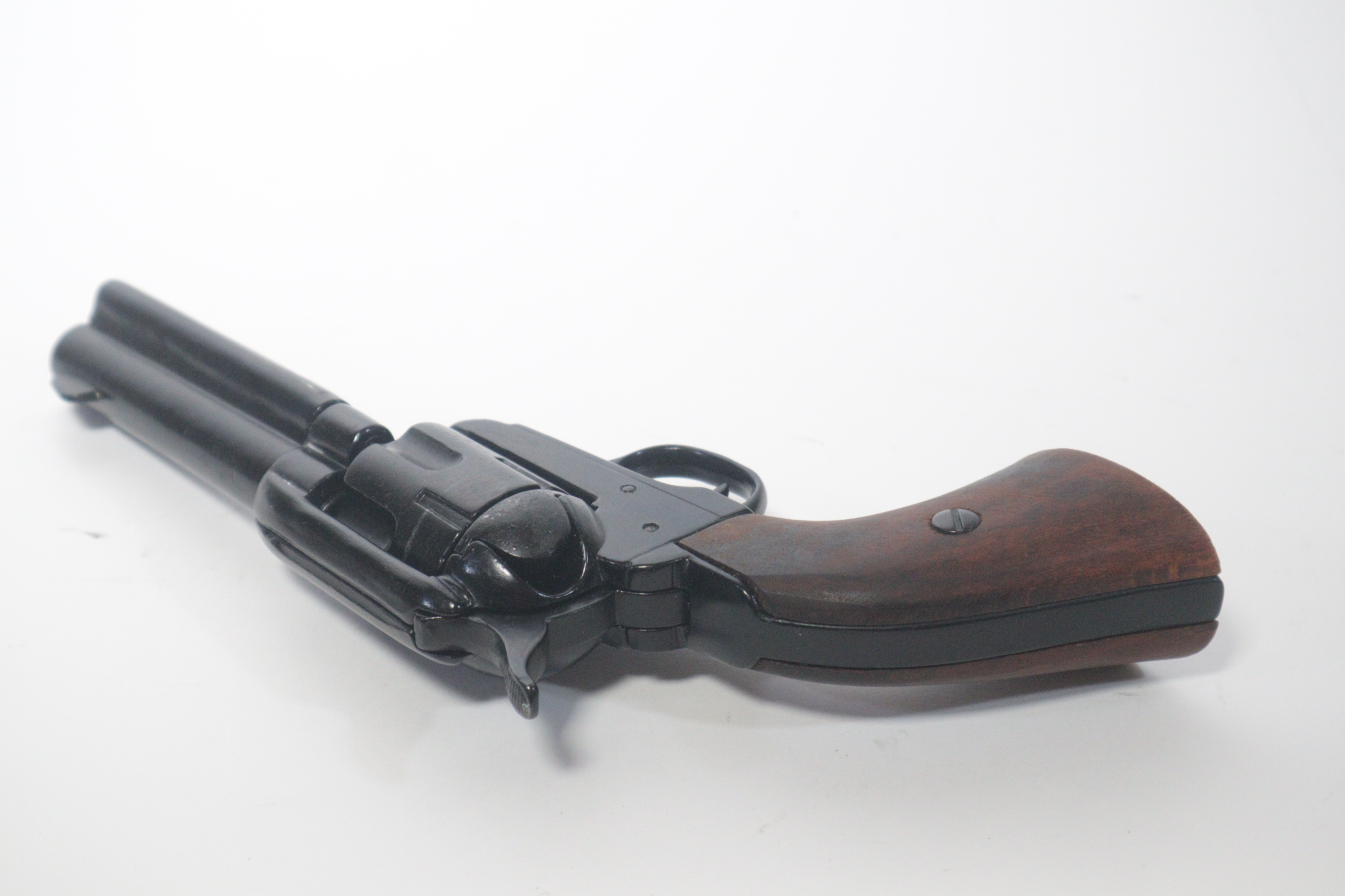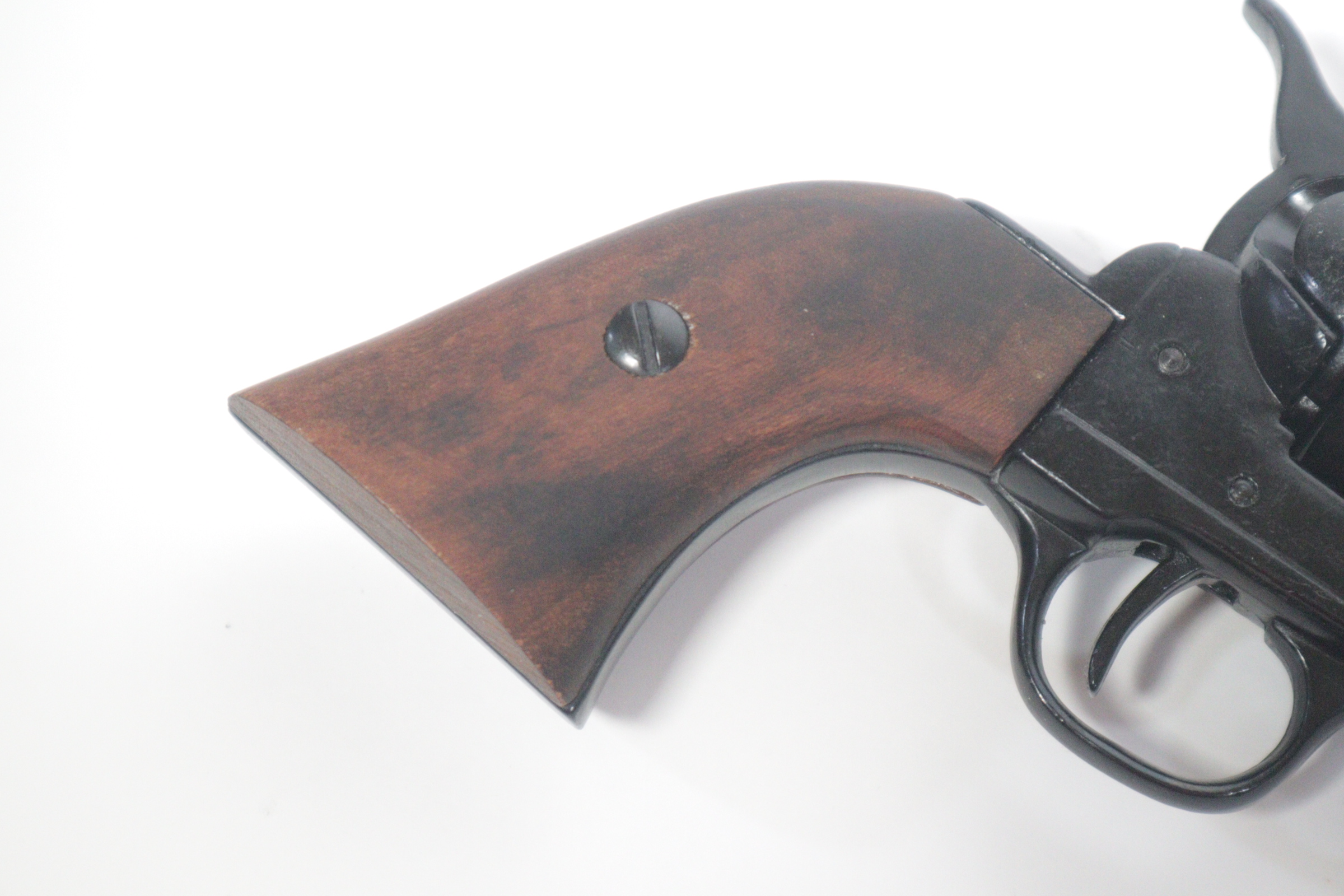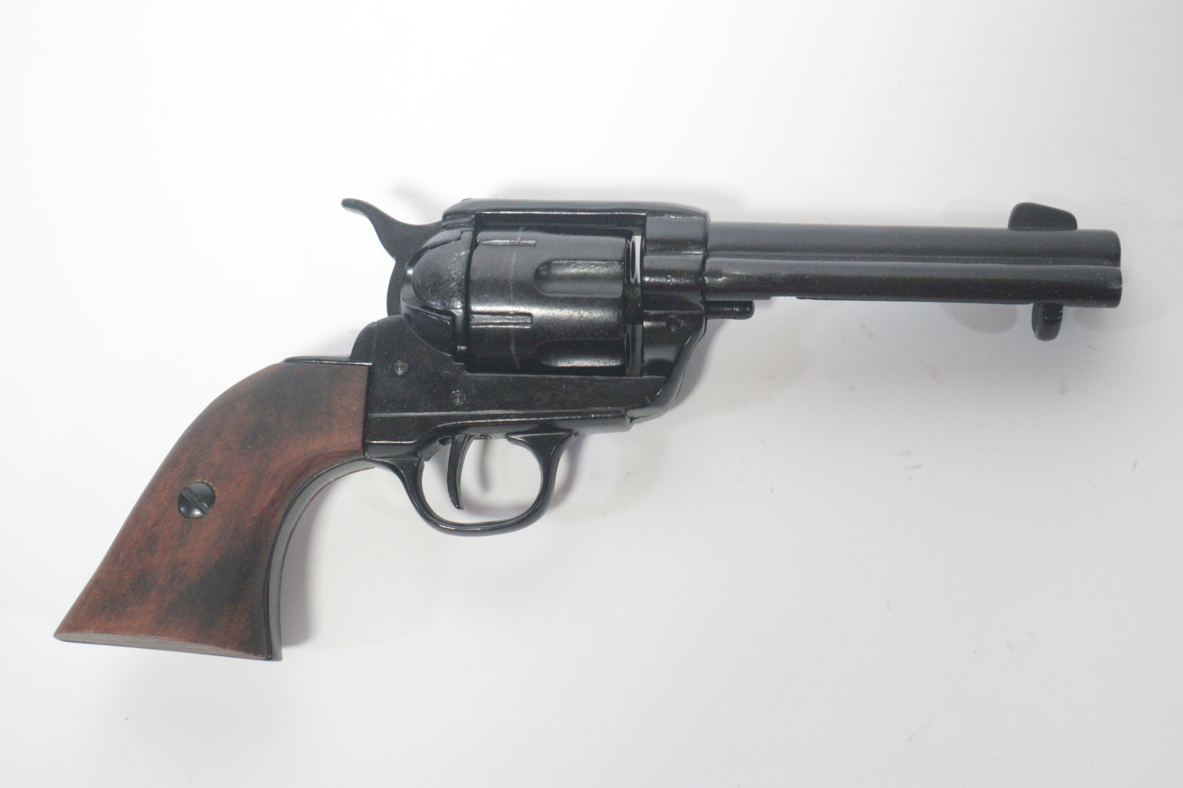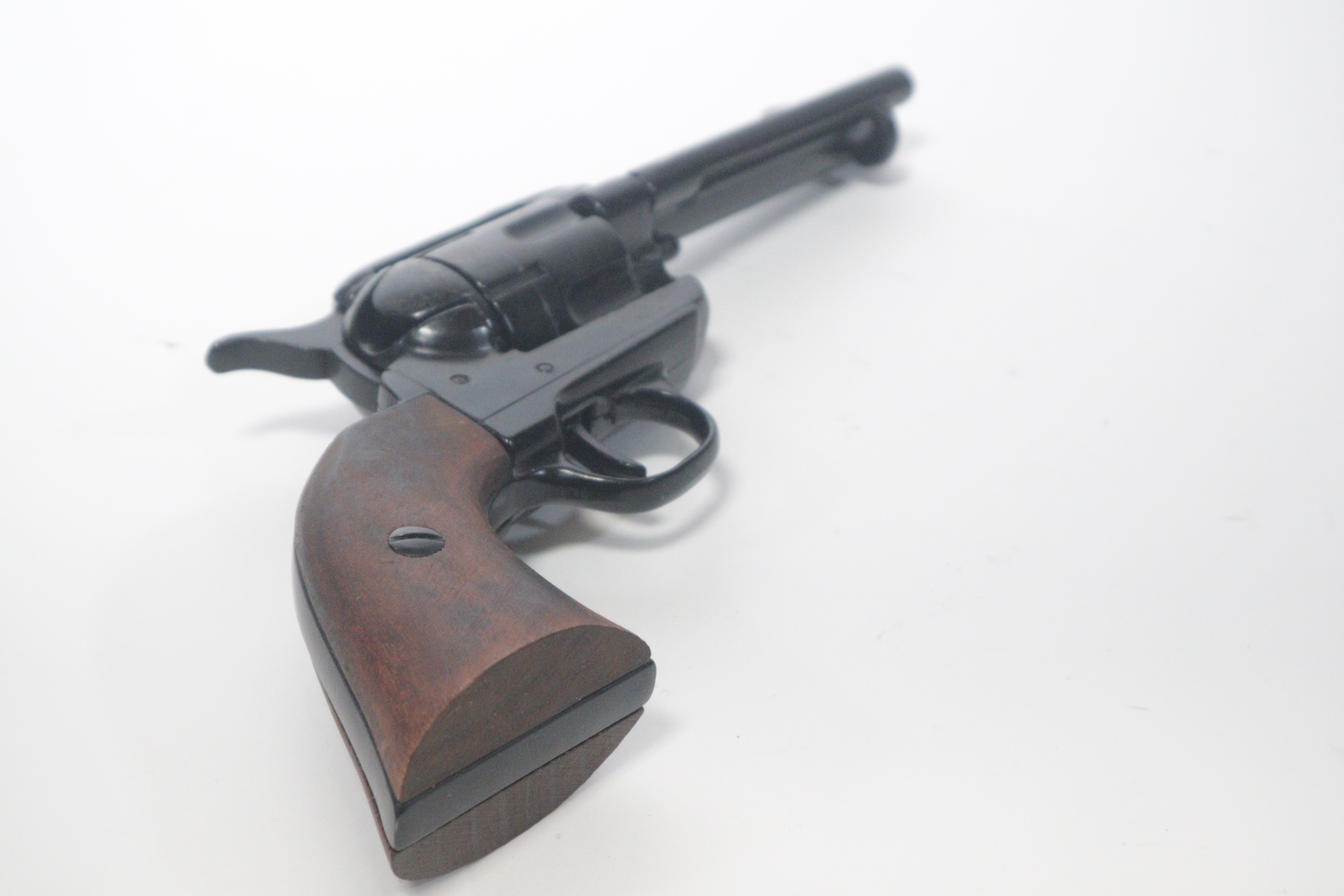 The single-action army revolver was produced in several forms and many calibers from 1872 to 1940, with production totaling about 350,000 pieces. This non-firing version has a functional lock mechanism with a revolving cylinder and working ejector system. This item is not for sale in some specific zip codes.