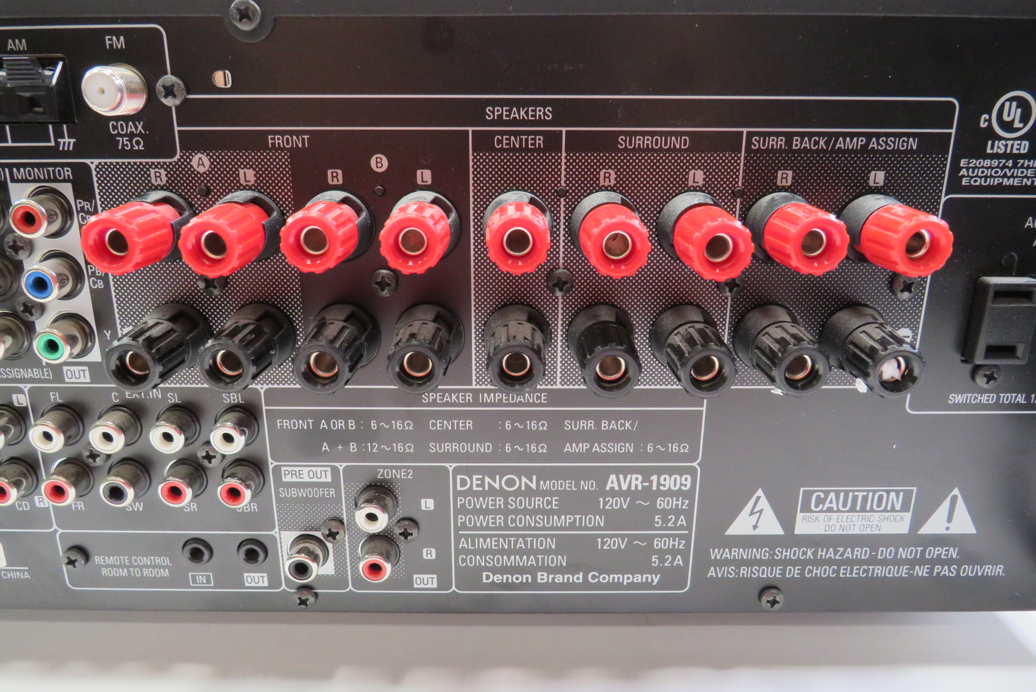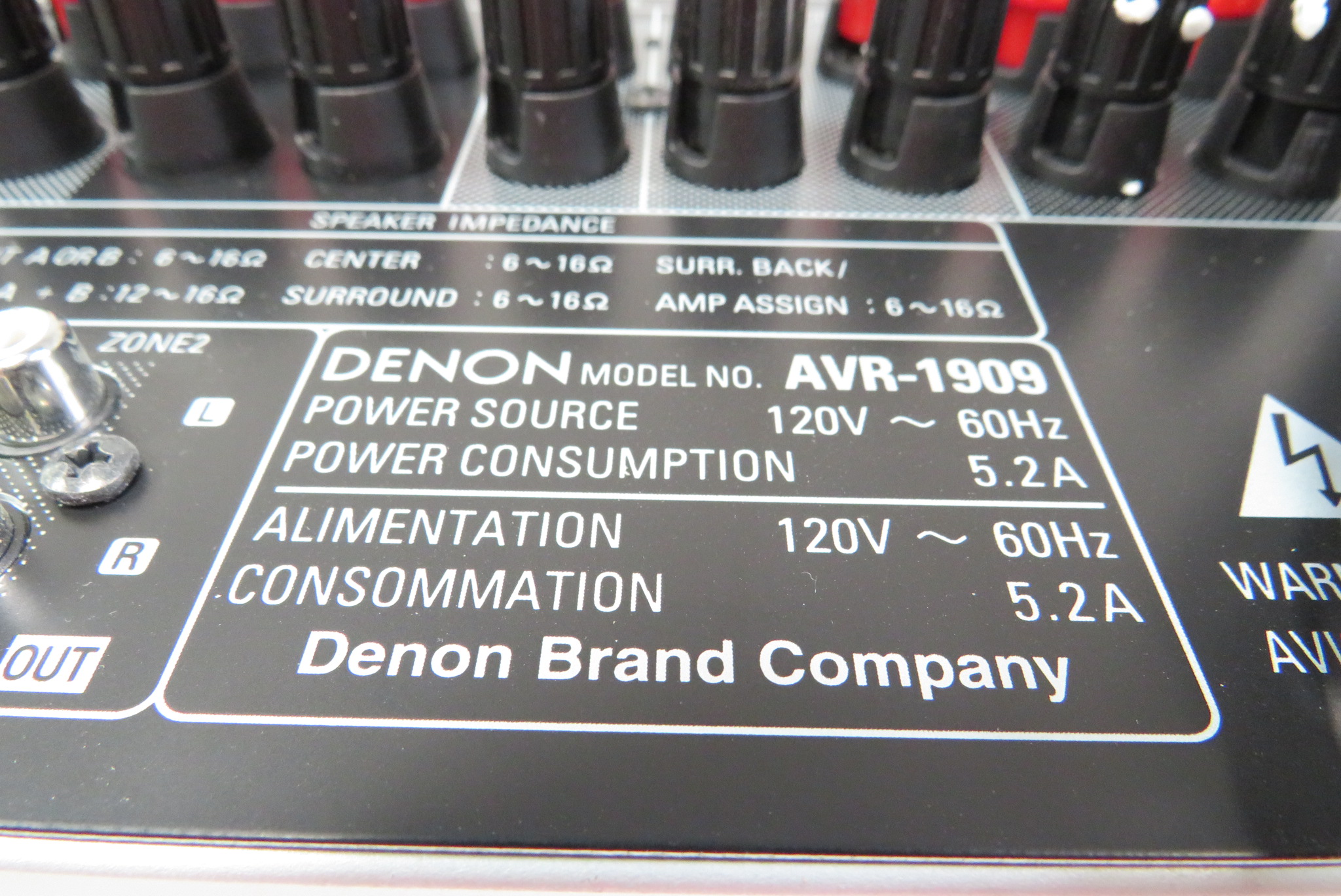 The Denon AVR-1909 is an AV receiver with 7.1 channels, featuring robust amplification, advanced audio processing, and extensive connectivity options.