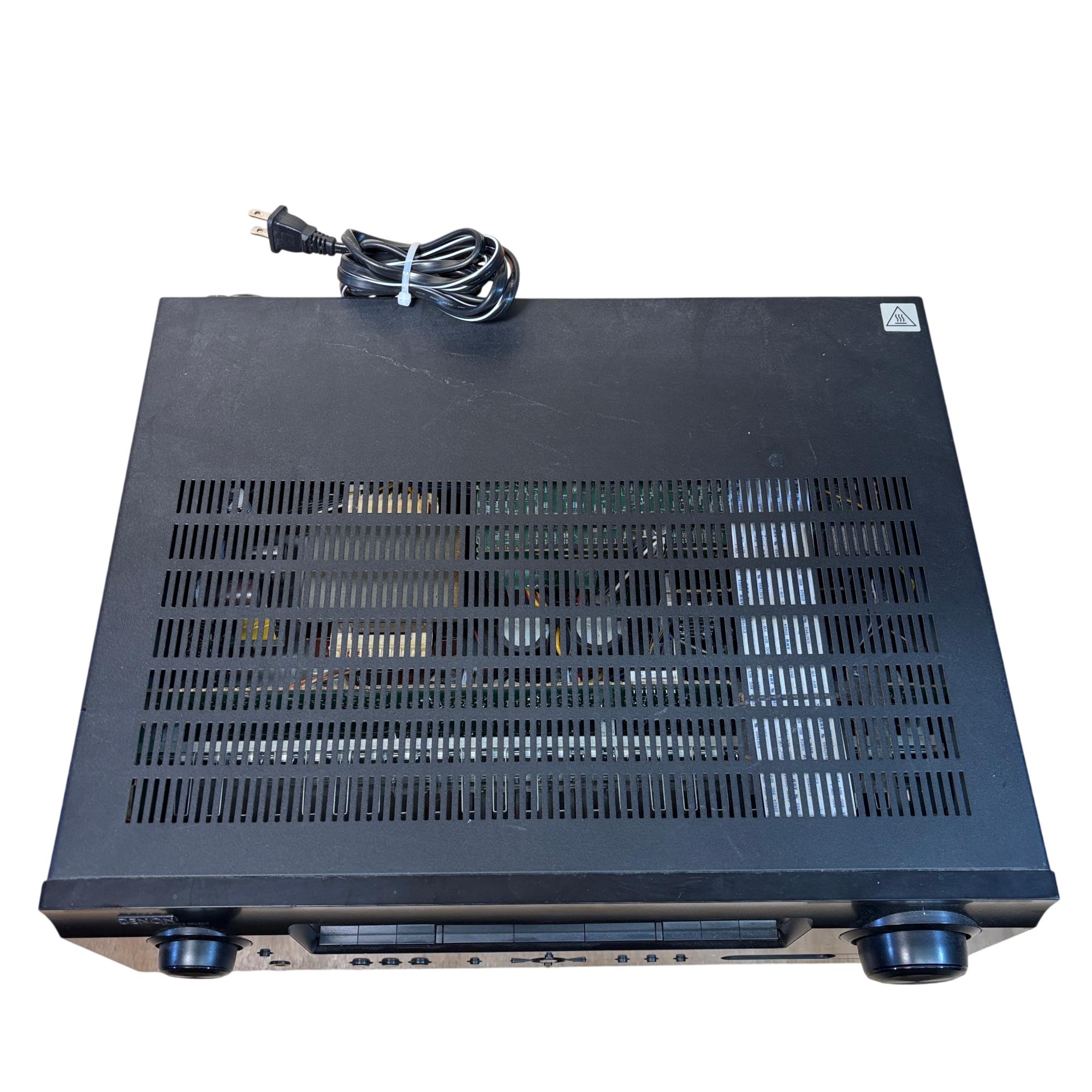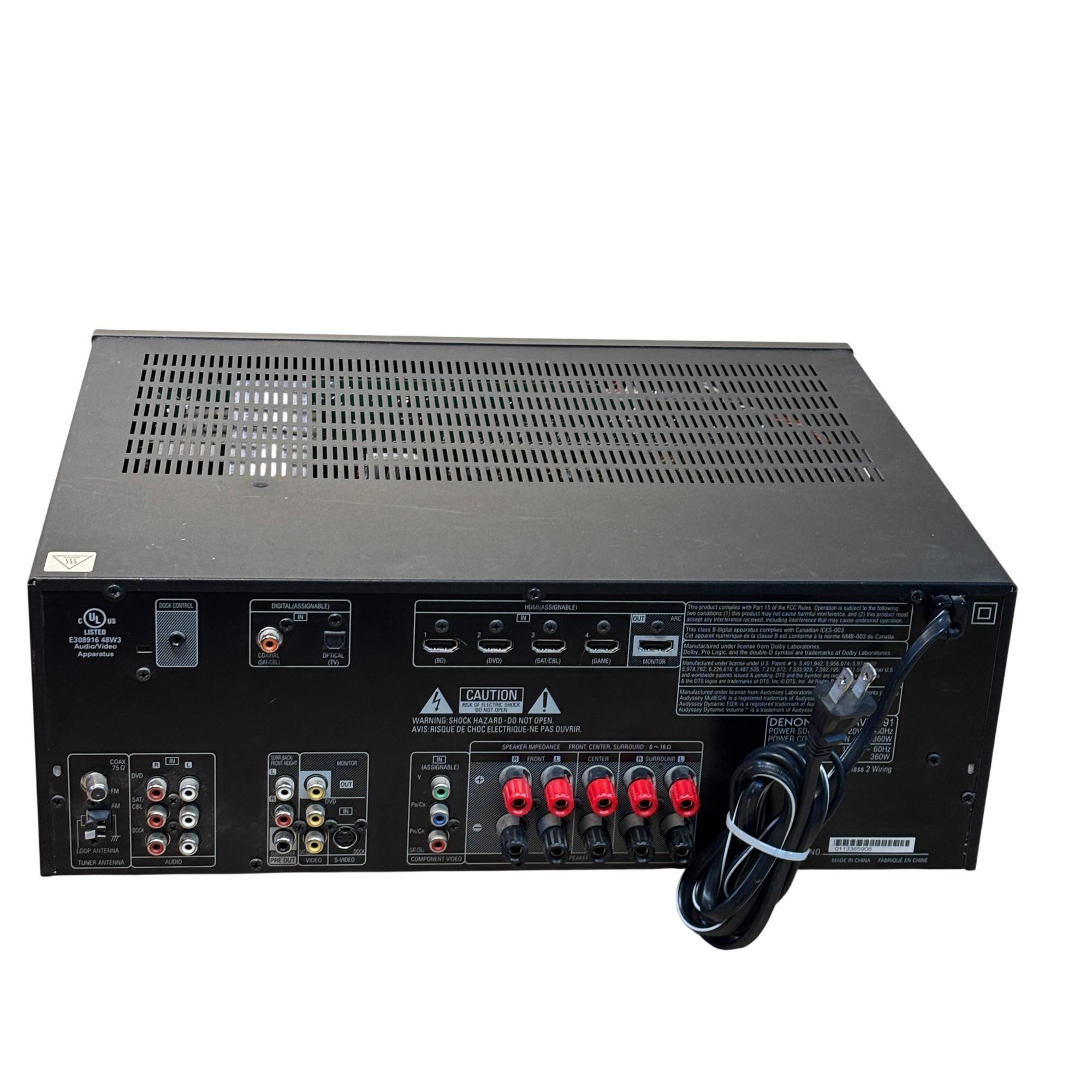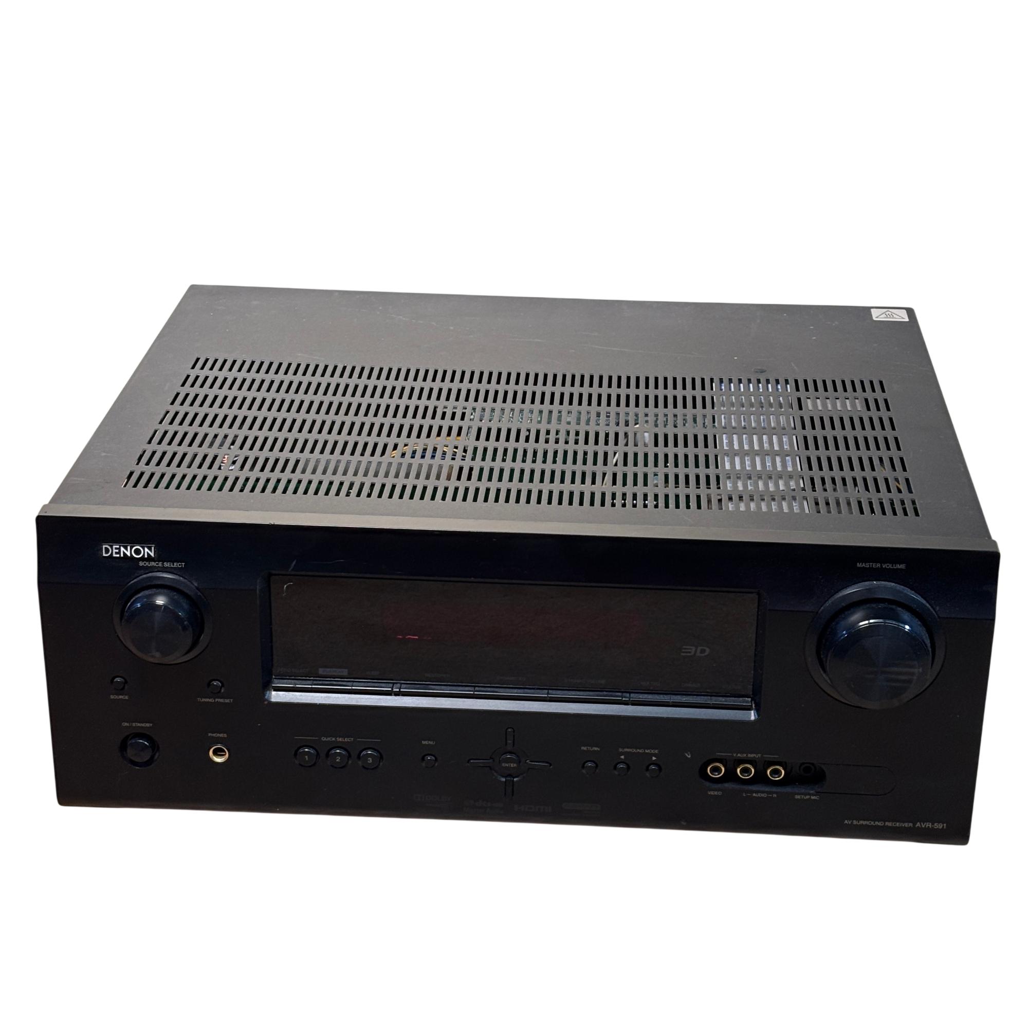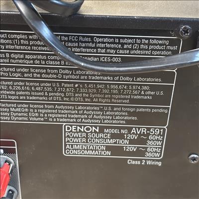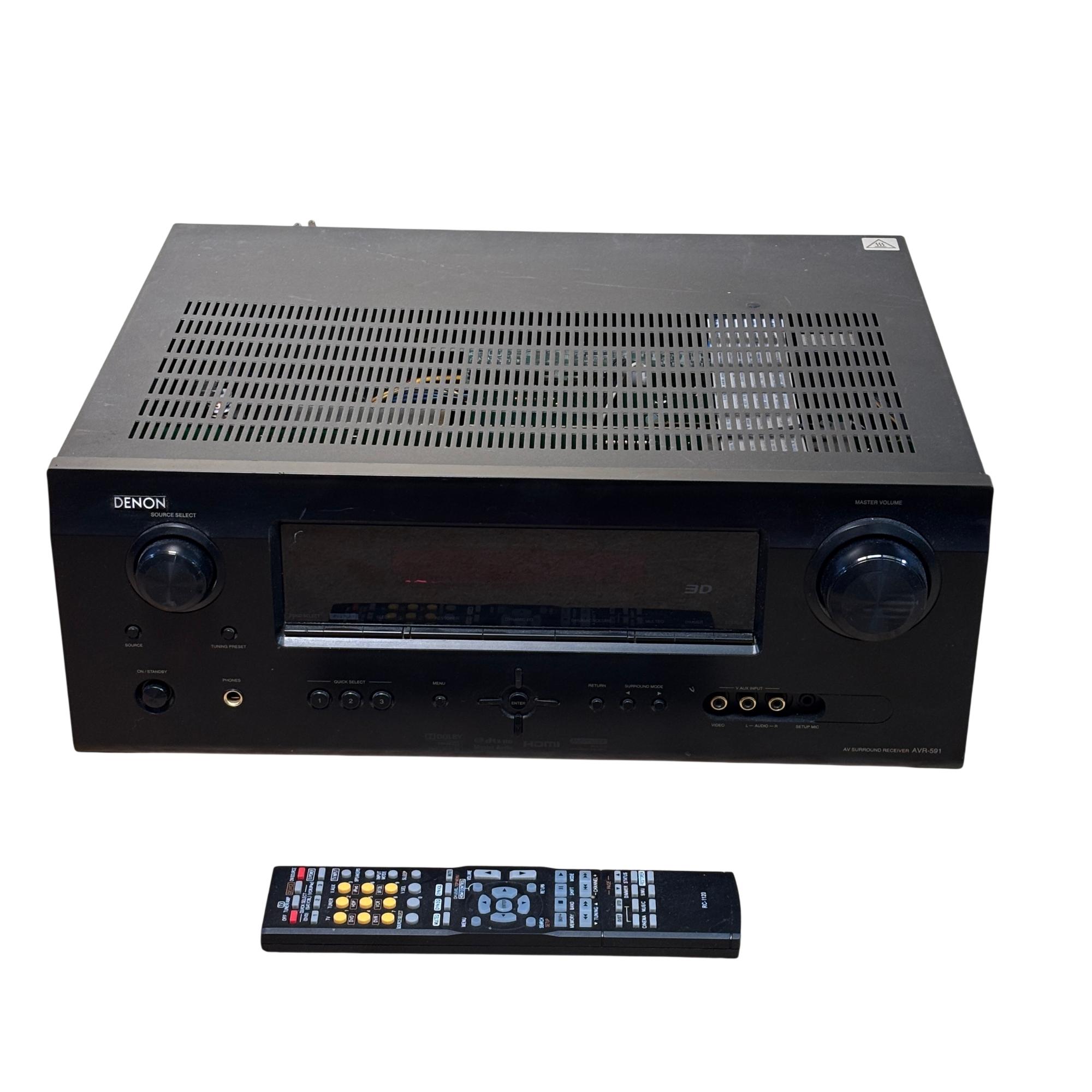 Denon AVR-591 5.1 Channel AV Surround Receiver with RC-1120 Remote delivers powerful 120W per channel for immersive home theater audio. This receiver features multiple input options, including HDMI and audio sources, with advanced surround sound processing to enhance cinema and music experiences. Its front panel offers intuitive control knobs and a clear display for easy operation and setup.