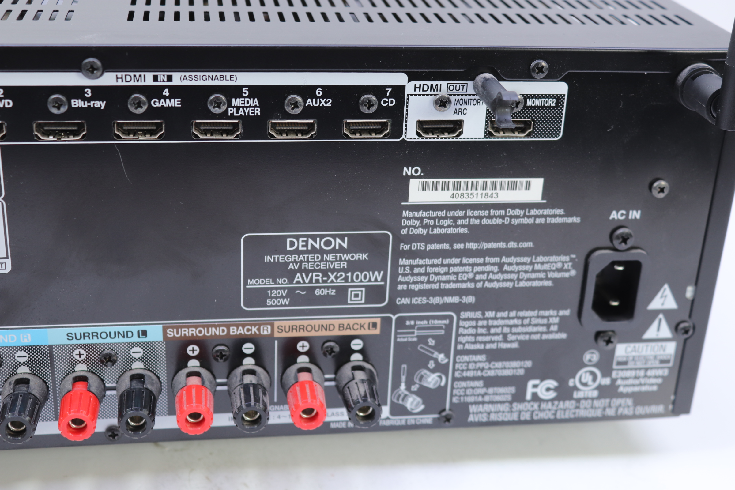 The black Denon IN-Command Series AVR-X2100W 7.2-Channel Network AV Receiver delivers powerful multi-channel performance and network connectivity. This receiver houses a powerful discreet 7-channel amplifier that can deliver 95W per channel at 8 ohms. Audyssey MultEQ XT is built-in to help you tailor the sound of the receiver and connected speakers to your listening environment; a setup microphone is included. Not only can you connect traditional audio sources like CD players, but the Denon AVR-X2100W can connect to wireless audio sources via integrated Bluetooth, AirPlay and Wi-Fi connectivity. You can even utilize the receiver's Ethernet port to access Internet streaming services such as Pandora.