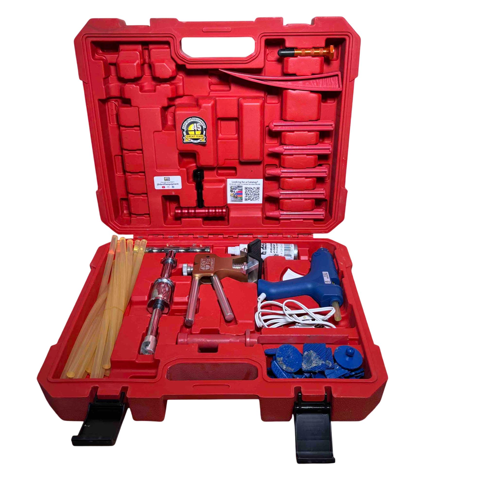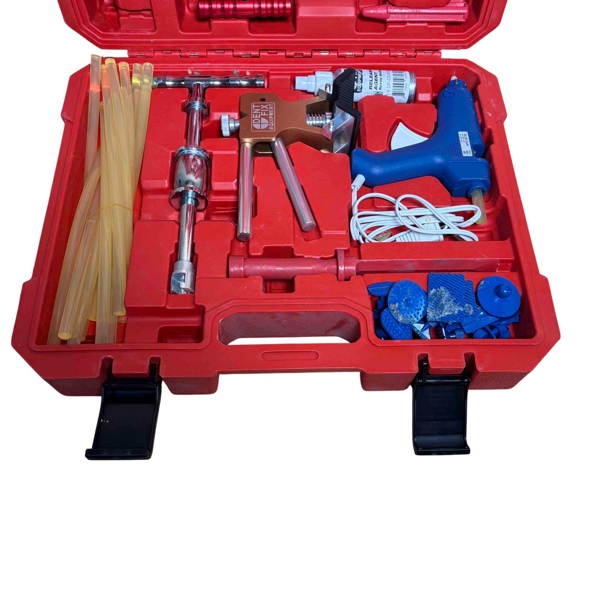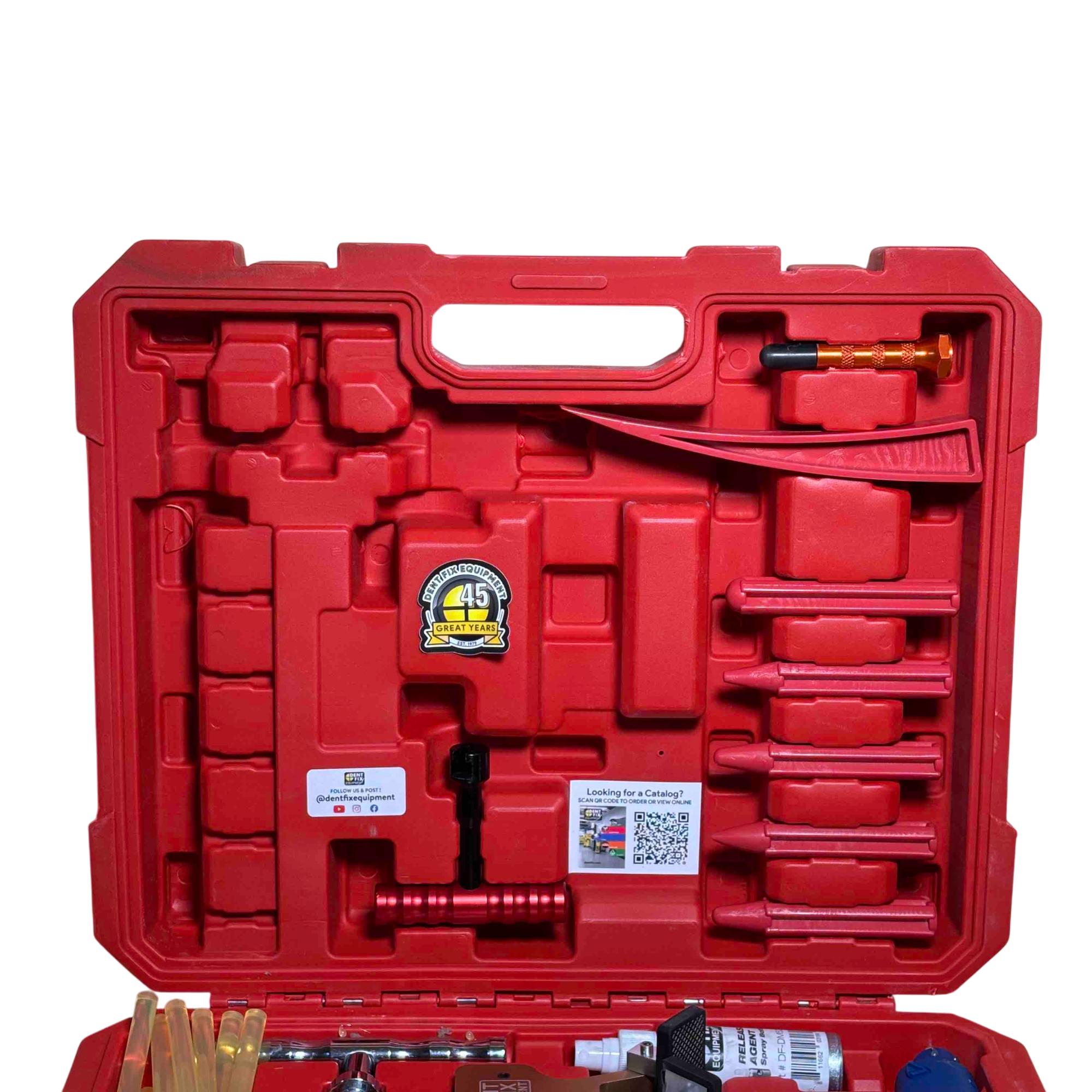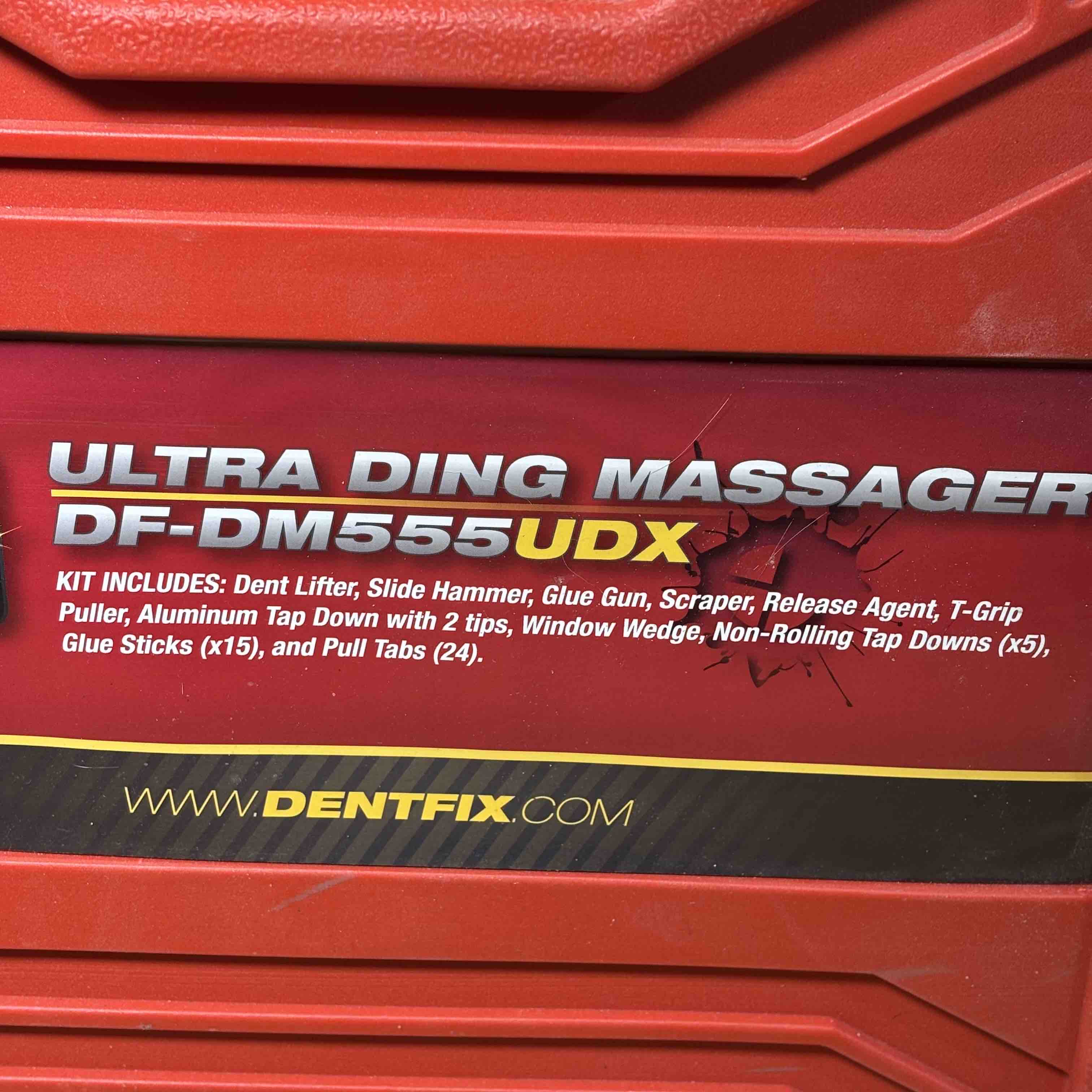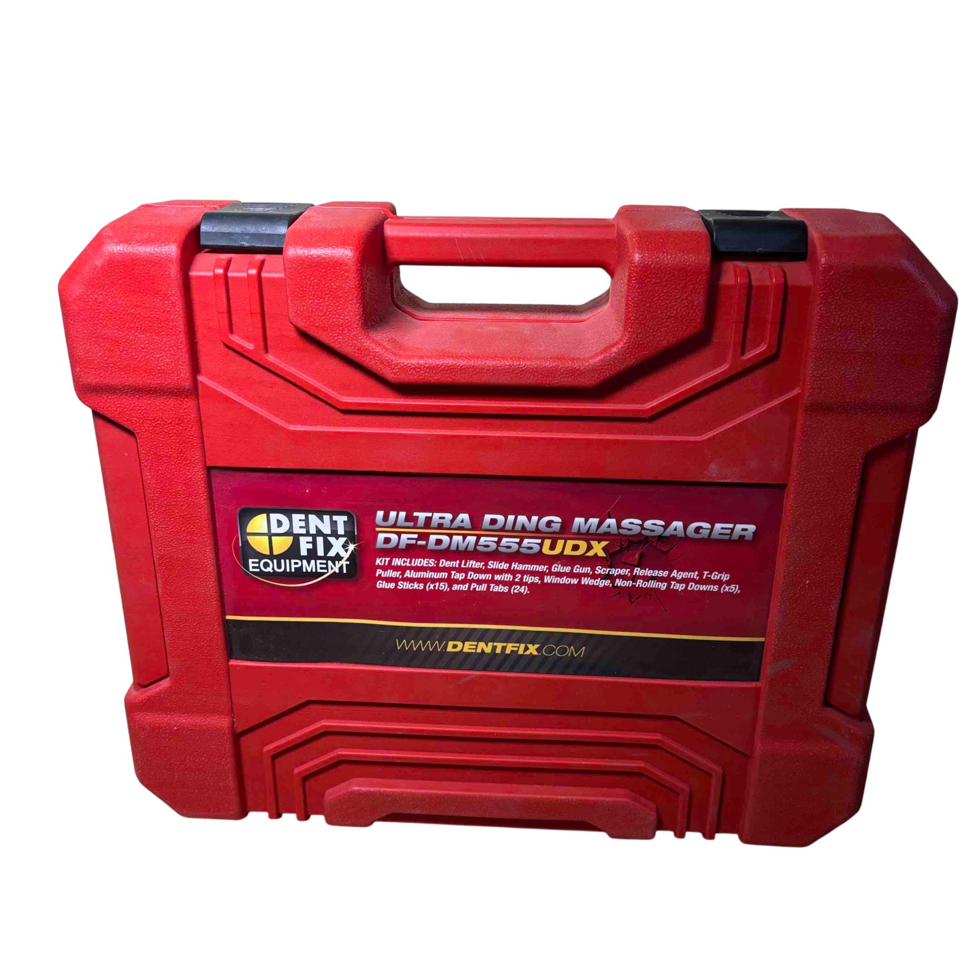 Restore your vehicle with precision using the Dent Fix Ultra Ding Massager DF-DM555UDX Kit. This comprehensive set includes all the essential tools for efficient dent removal—Dent Lifter, Slide Hammer, Glue Gun, Scraper, Release Agent, T-Grip Puller, Aluminum Tap Down with tips, non-rolling tap downs, glue sticks, window wedge, and pull tabs—all neatly organized in a rugged red carry case. Ideal for both automotive professionals and DIY enthusiasts, this kit ensures you have everything you need to achieve flawless results.