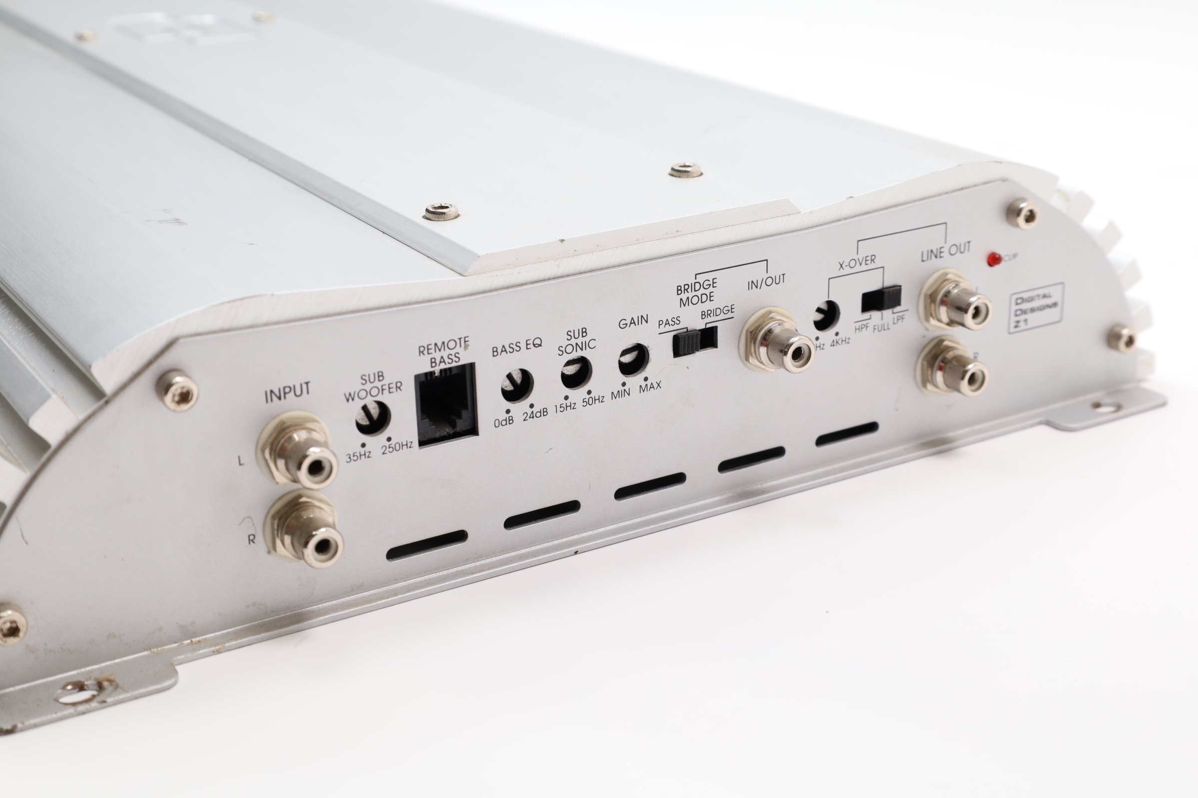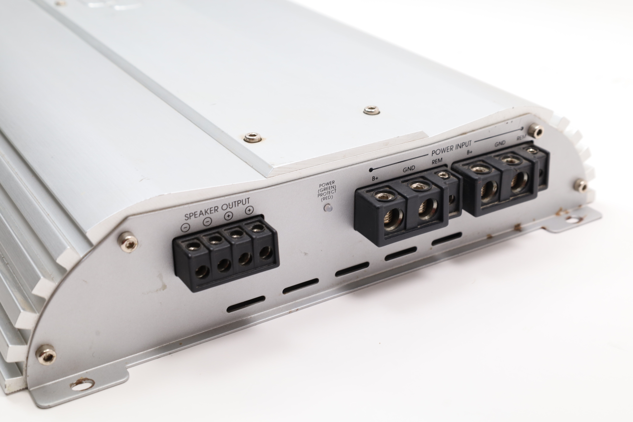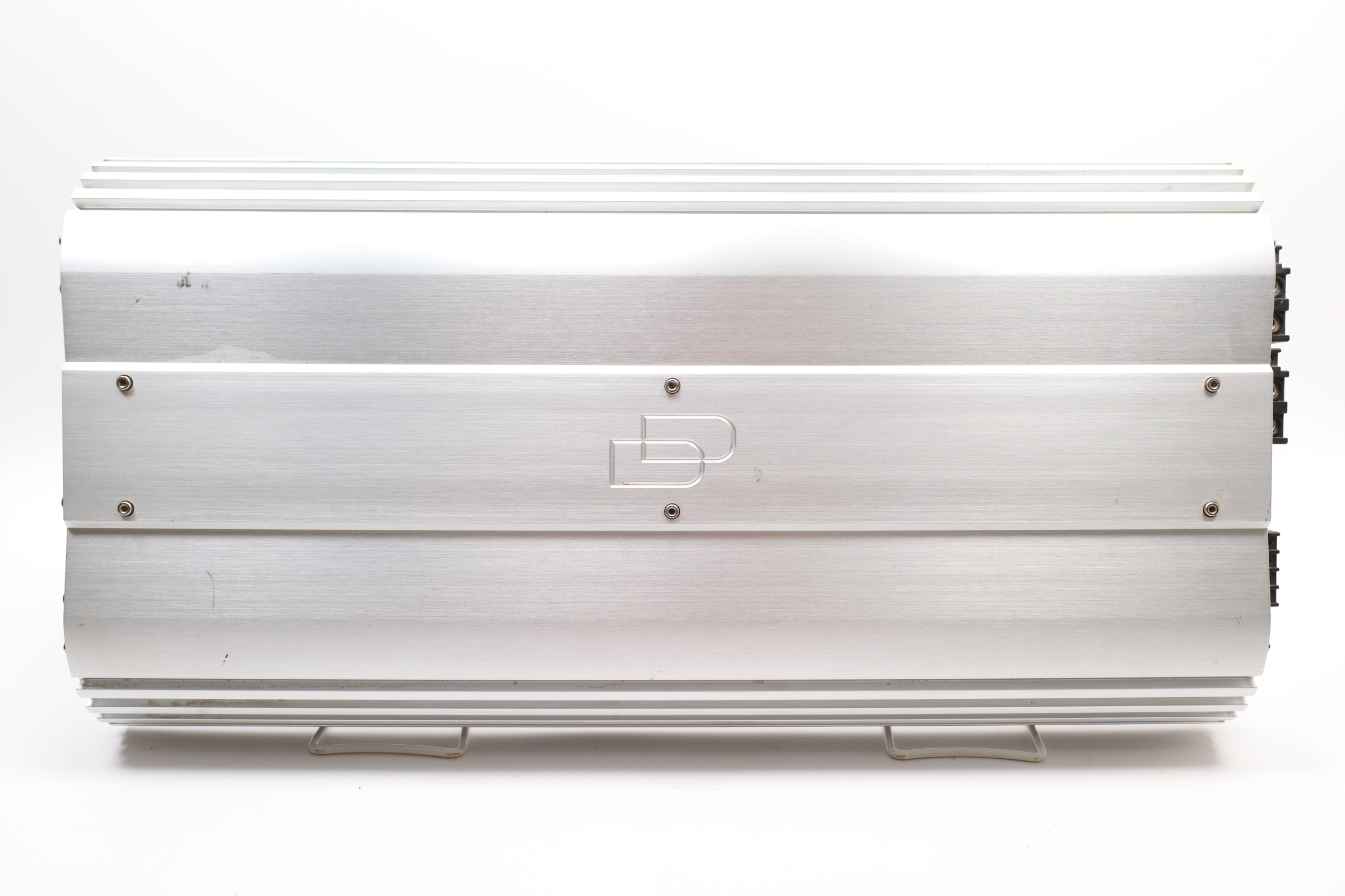 a high-performance monoblock amplifier designed for powerful audio output. It delivers 1225 watts at 4 Ohms, 2178 watts at 2 Ohms, 2890 watts at 1.33 Ohms, and up to 3481 watts at 1 Ohm with varying supply voltages. The amplifier operates with efficiencies ranging from 75.8% to 79.3%, depending on the impedance and voltage. It can reach up to 5000 watts at 1 Ohm with a 16V supply.