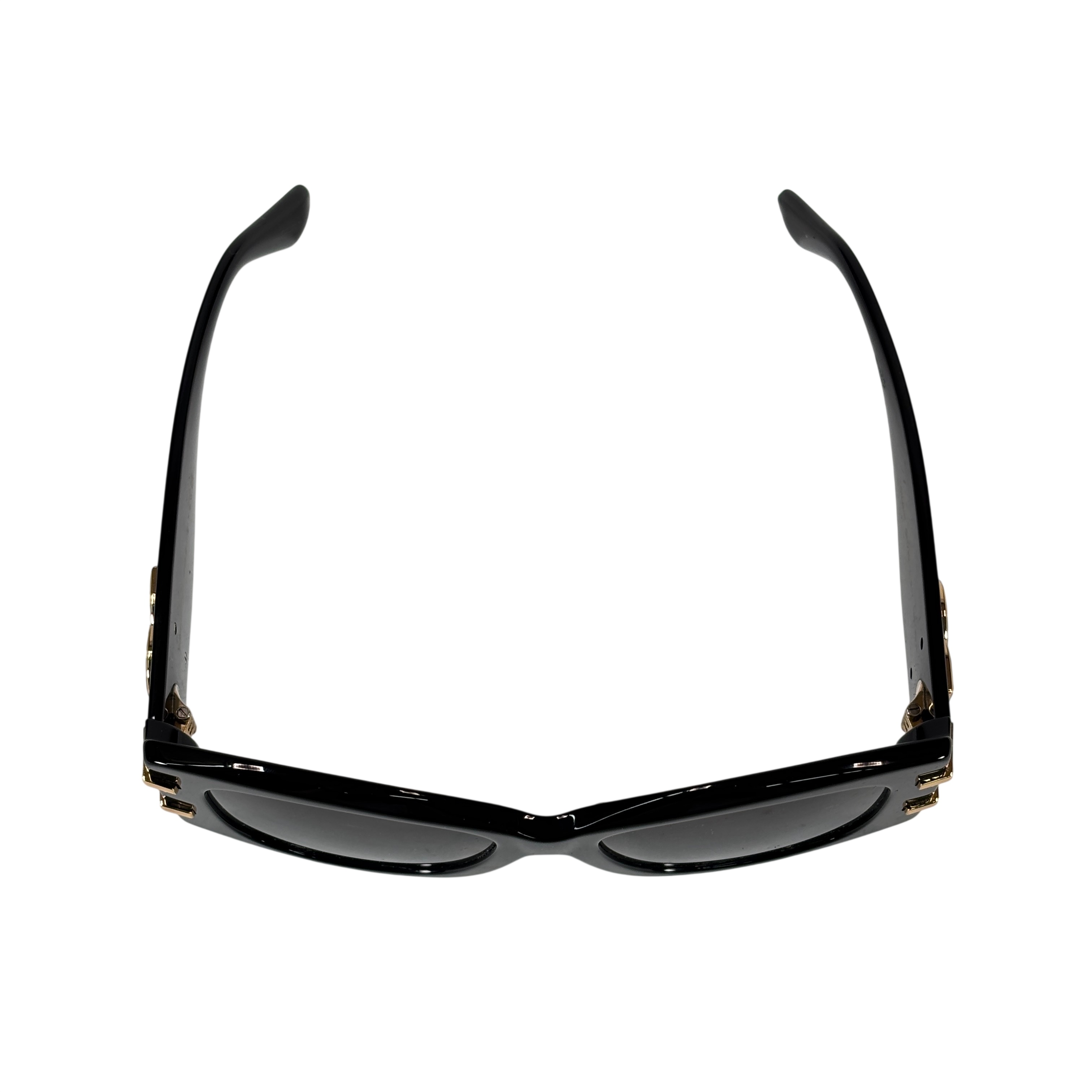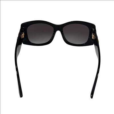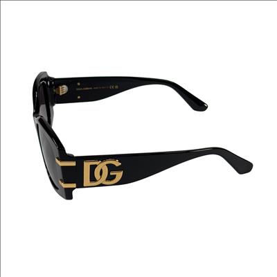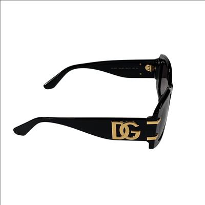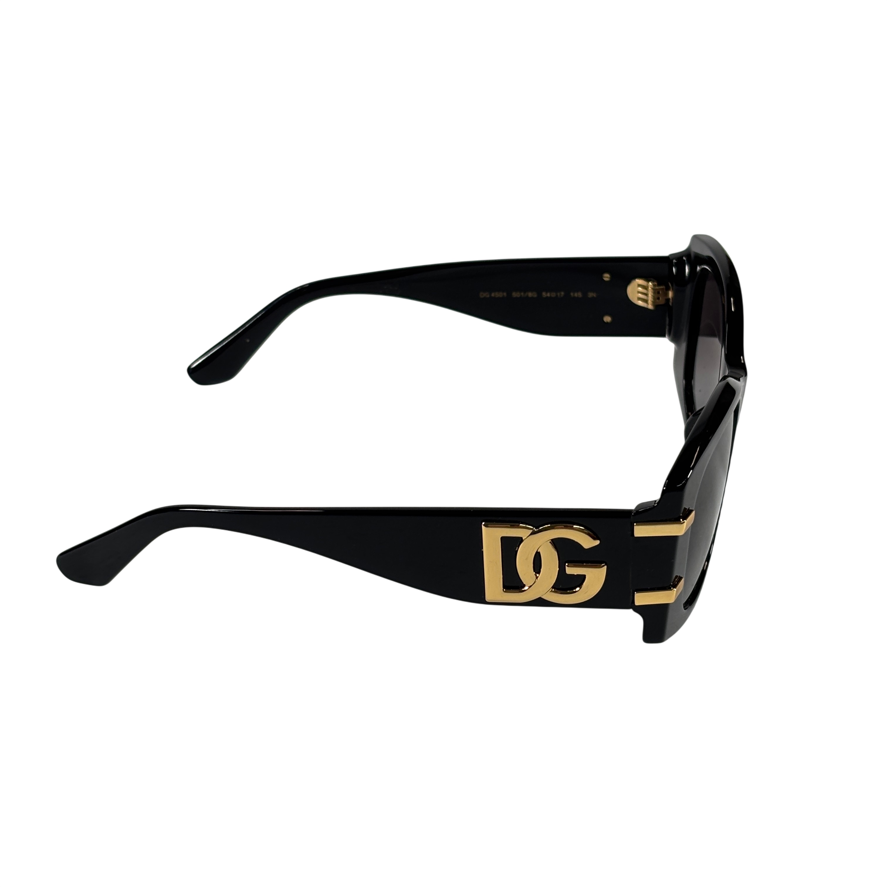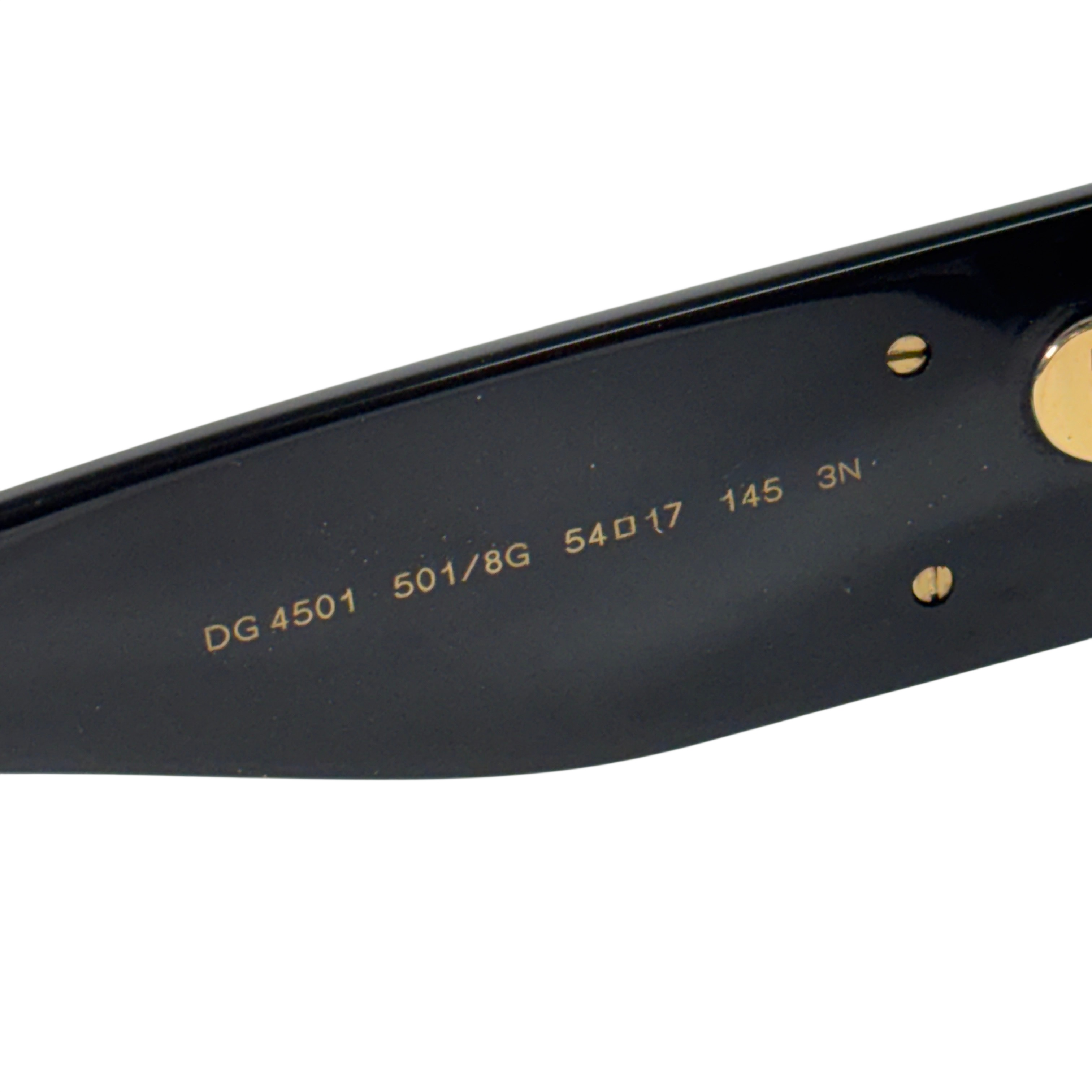 Dolce & Gabbana DG4501 501/8G Sunglasses feature a stylish black acetate frame accented with gold-tone DG logos on the temples. These Italian-made sunglasses offer 54 mm wide lenses with a 17 mm bridge and 145 mm temple length, providing a comfortable fit. The category 3 tinted lenses provide excellent UV protection, making them ideal for everyday wear. Perfect for those seeking a luxury accessory that combines fashion and function.