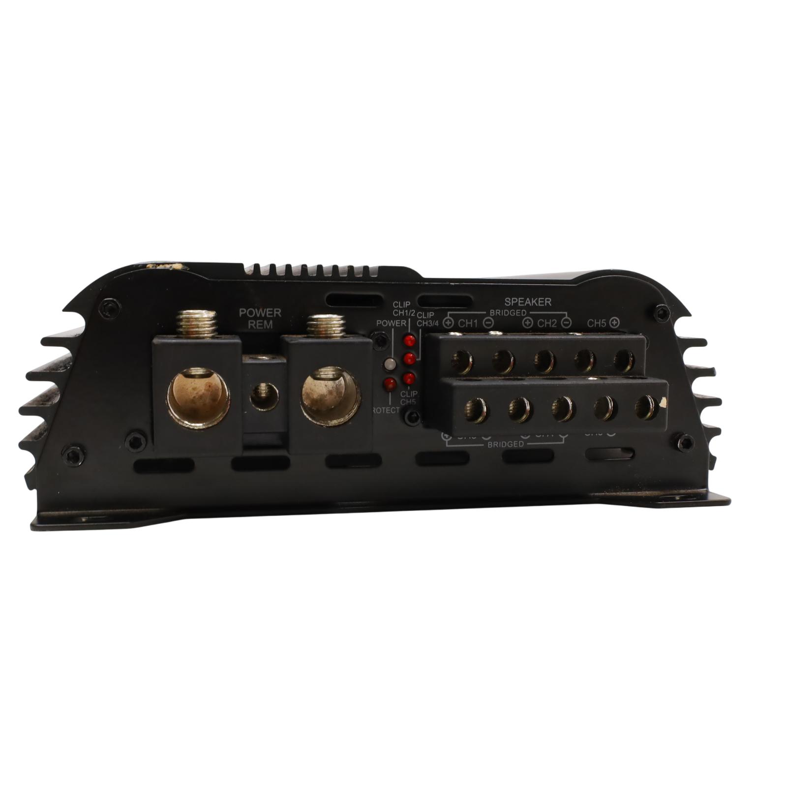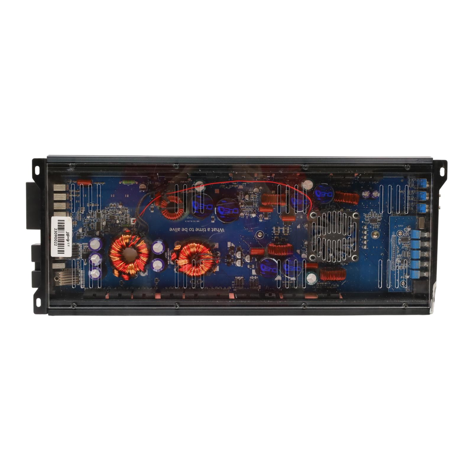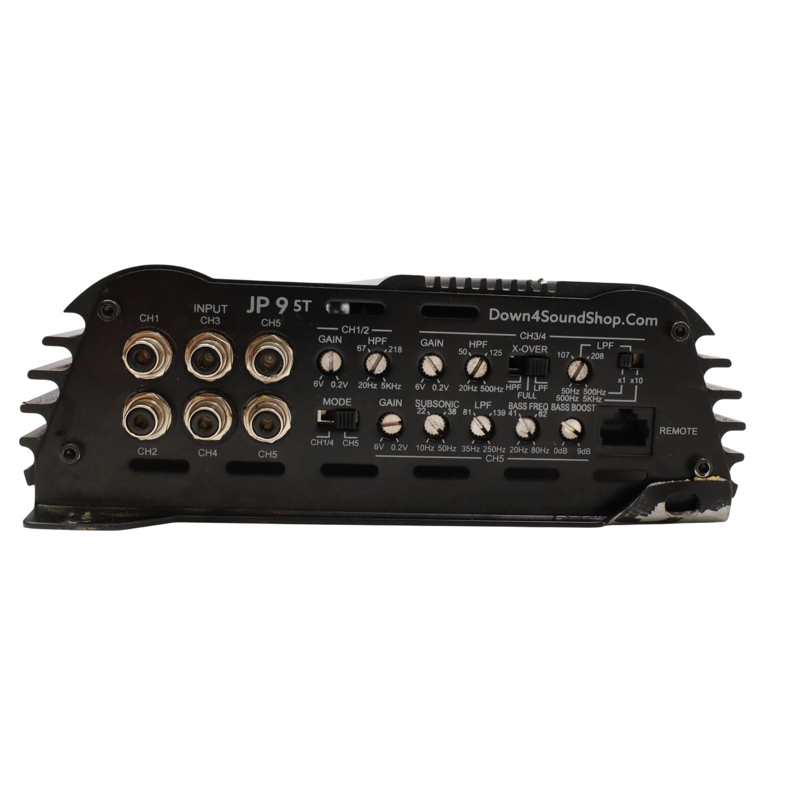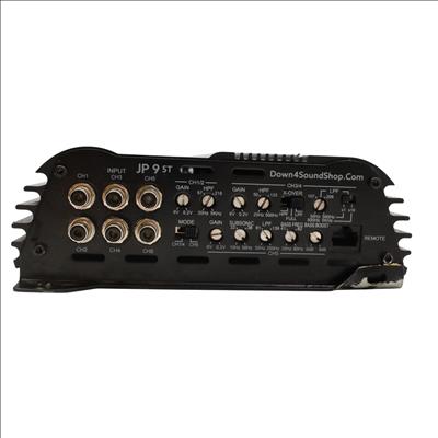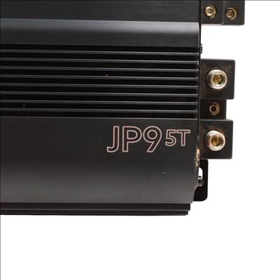 A 5-channel car audio amplifier designed to deliver up to 1500W RMS, providing powerful performance across both full-range and subwoofer channels. It outputs 900W x 1 RMS at 1 ohm on CH5, 200W x 4 plus 700W x 1 RMS at 2 ohm, 120W x 4 plus 400W x 1 RMS at 4 ohm, or 400W x 2 RMS when bridged at 4 ohm. Frequency response is 10Hz–30KHz for CH1–CH4 and 10Hz–240Hz for CH5, with tuning options that include high-pass and low-pass filters for precise control. A dedicated cooling fan maintains stable operation, while the amplifier runs on 9–15.5V. With a signal-to-noise ratio of over 95dB, THD under 0.1% at 4 ohm, and a 160A fuse rating, the JP95T combines clean sound quality with reliable power handling in a compact, black-finished design.