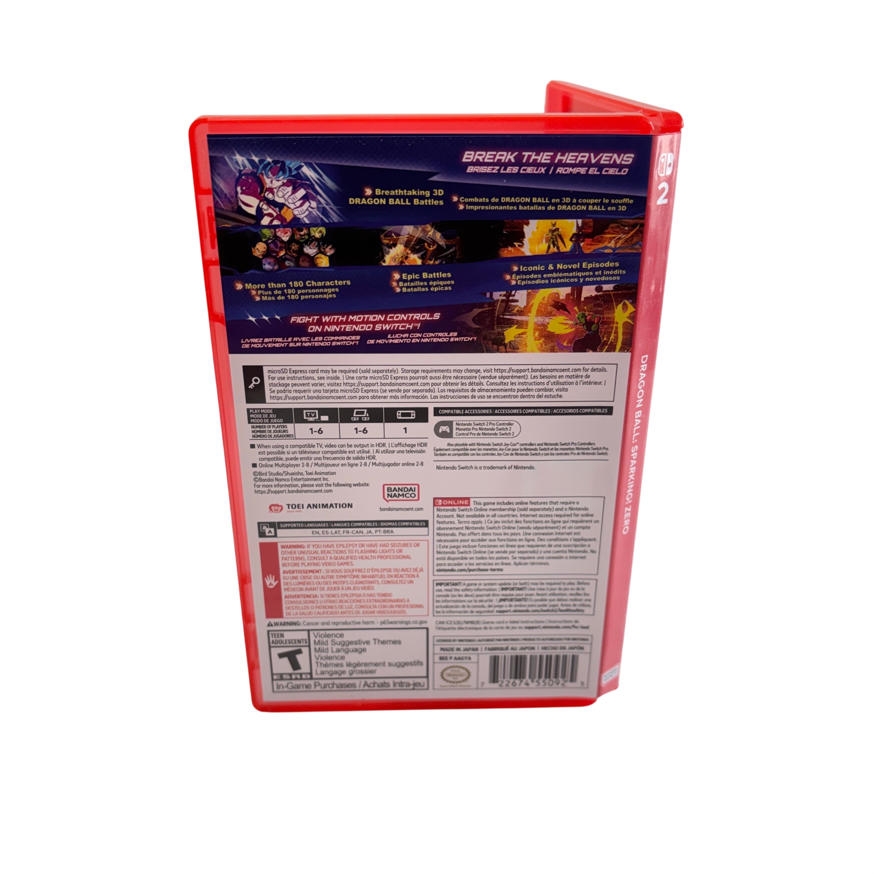 Nintendo Dragon Ball Sparking Zero Switch Game is a fighting video game cartridge designed for the Nintendo Switch platform. This game features breathtaking 3D Dragon Ball battles with more than 180 characters and includes iconic and novel episodes from the Dragon Ball universe. The set includes the game cartridge and a red game case, compatible with Nintendo Switch systems. Ideal for fans of Dragon Ball and fighting games, it supports motion controls for an immersive gameplay experience.