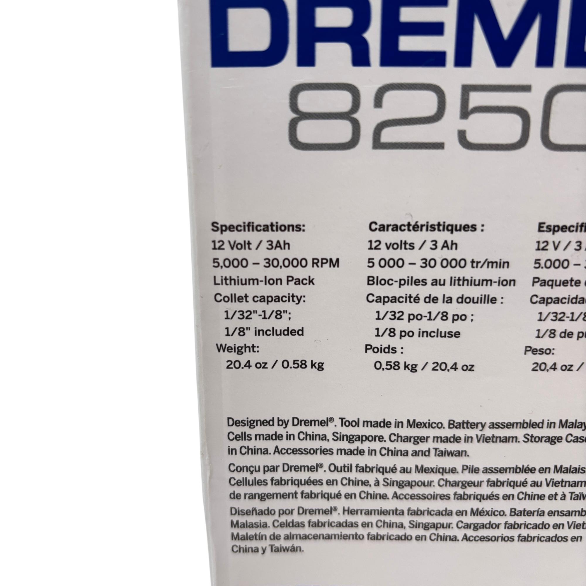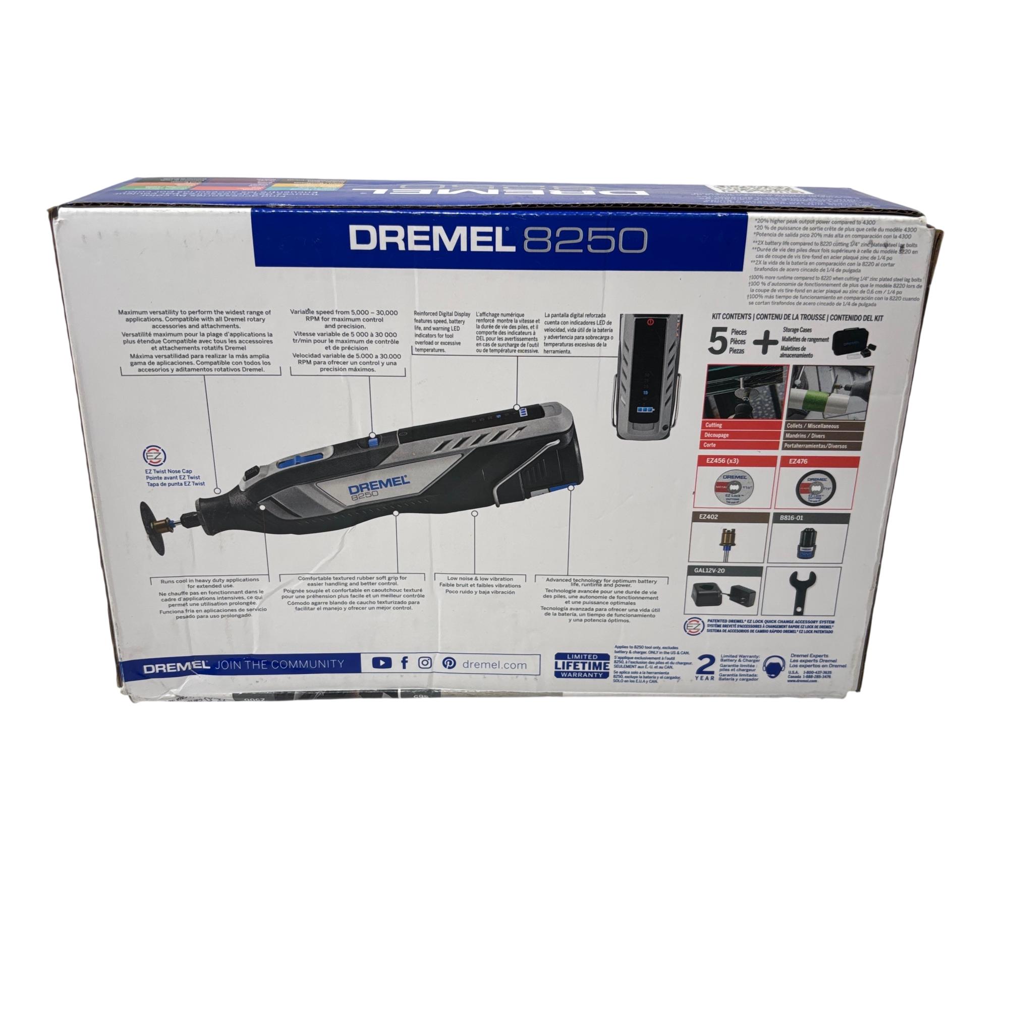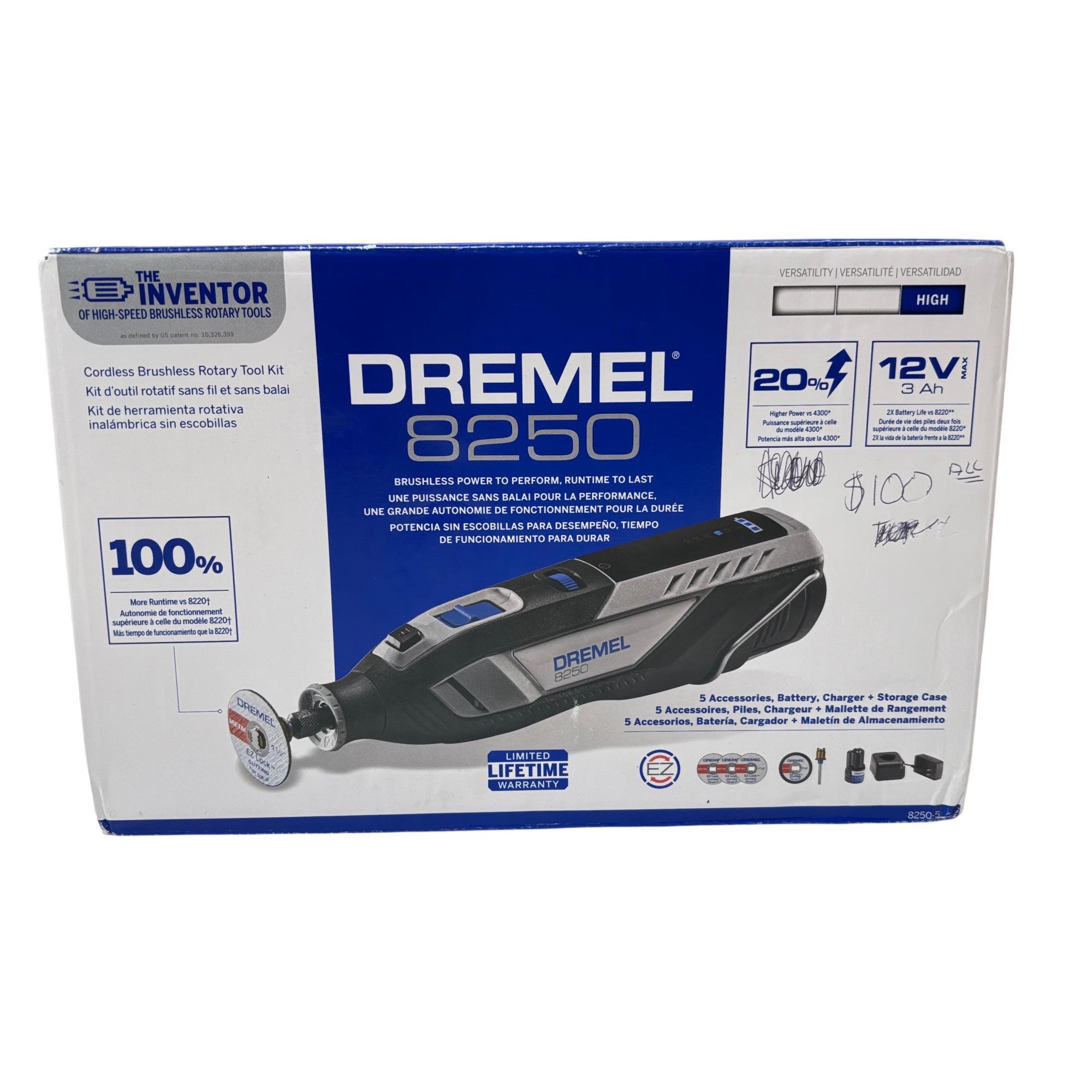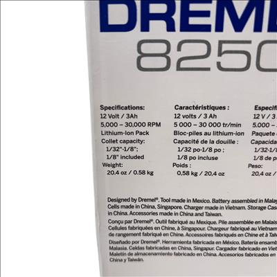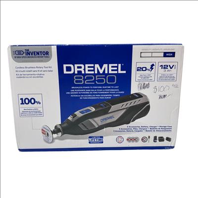 Brushless power to perform, runtime to last. From cutting to sanding, and grinding to drilling the Dremel 8250 delivers corded performance without the inconvenience of a cord. Featuring an advanced brushless motor, the 8250 provides optimized motor efficiency, more runtime & power, and long tool life. With 20% higher power vs Dremel’s most powerful corded tool the 4300, the 8250 provides maximum versatility to perform the widest range of applications and is compatible with all rotary tool accessories & attachments. The powerful 12 Volt / 3 AMP Lithium-Ion battery provides superior performance & runtime at all speeds; delivering 100% more runtime vs the 8220 ensuring that the 8250 will still be going strong when you need it. The innovative tool design is engineered to exceed endurance tests for consistent & powerful performance every time, while the ergonomic body provides a comfortable grip zone making it ideal for extended use. The 8250 gives you the confidence & performance to tackle the toughest of jobs.