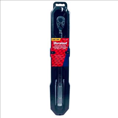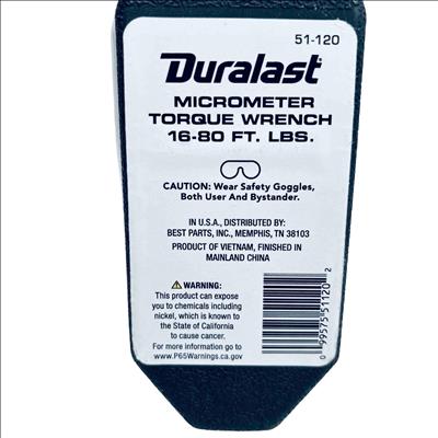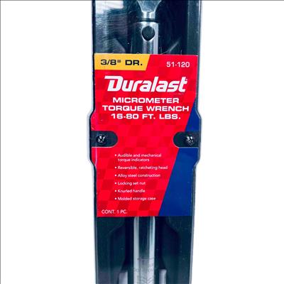 This Duralast 51-120 Micrometer Torque Wrench offers precise torque application with a range of 16-80 ft. lbs. Designed for professionals and enthusiasts alike, it features a reversible ratcheting head, sturdy alloy steel construction, and a knurled handle for optimal grip. The tool comes in a molded storage case for convenient organization and portability.