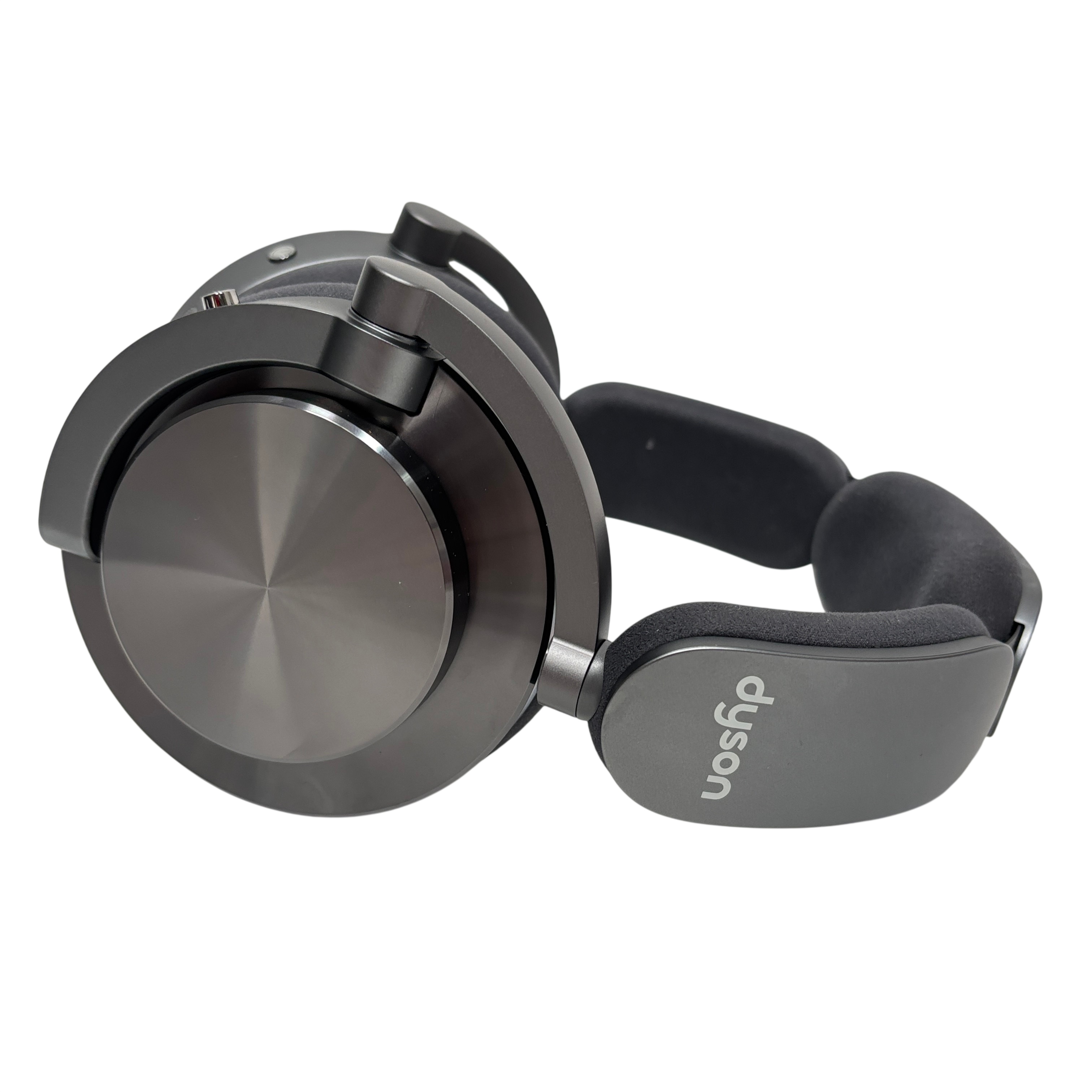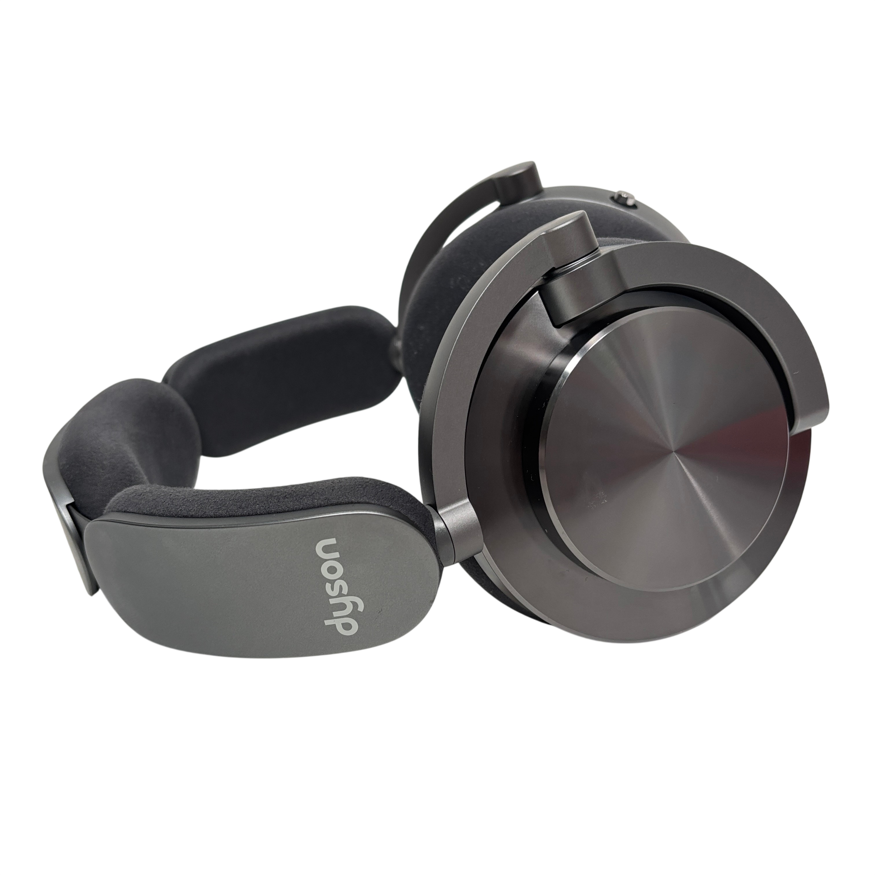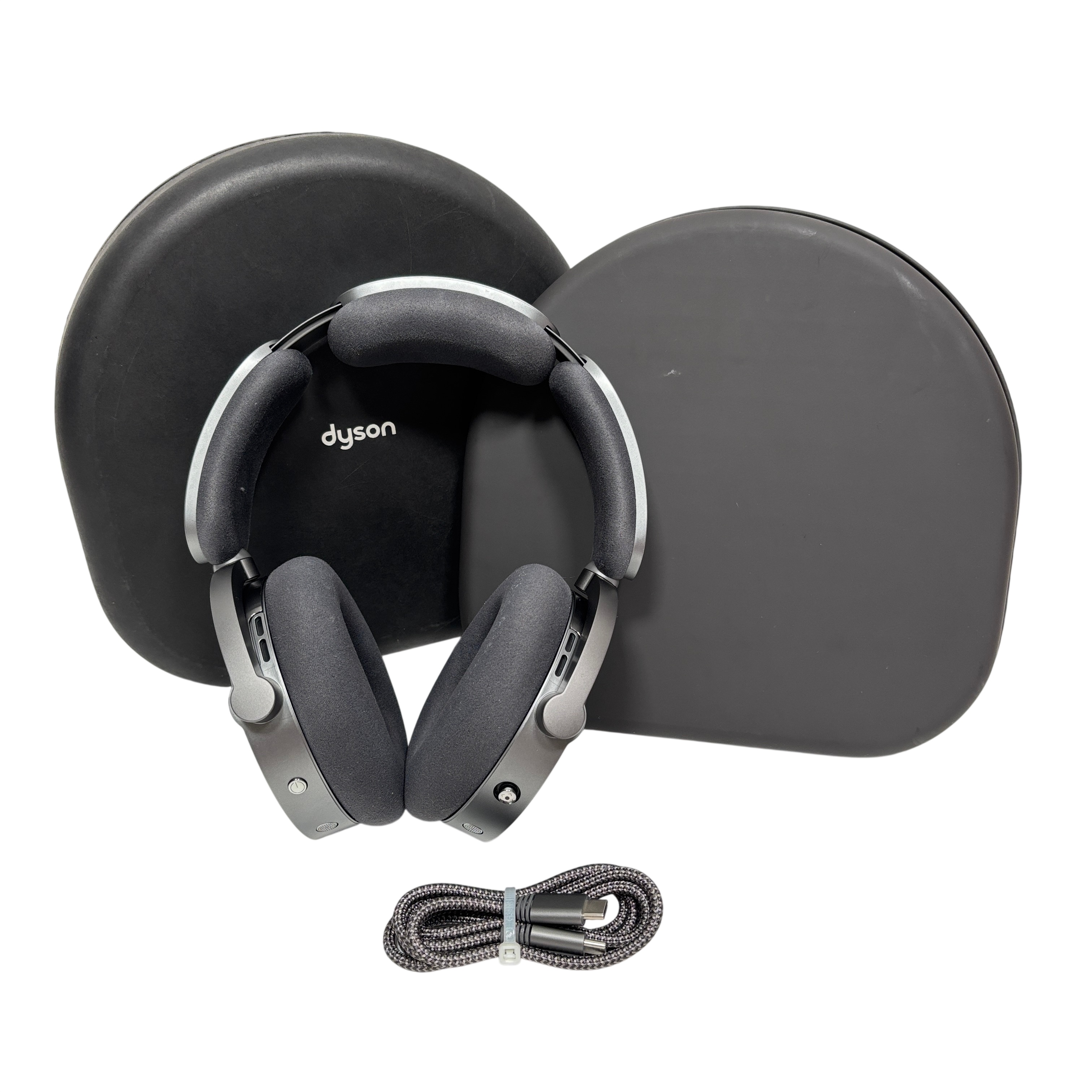 Dyson Ontrac Headphones offer a premium over-ear listening experience with a sleek gunmetal gray design and plush padded ear cushions for extended comfort. These wireless headphones come with a charging cord and protective case, ensuring convenience and portability. Designed for high-quality sound and durability, the Dyson Ontrac headphones are ideal for immersive audio enjoyment at home or on the go.