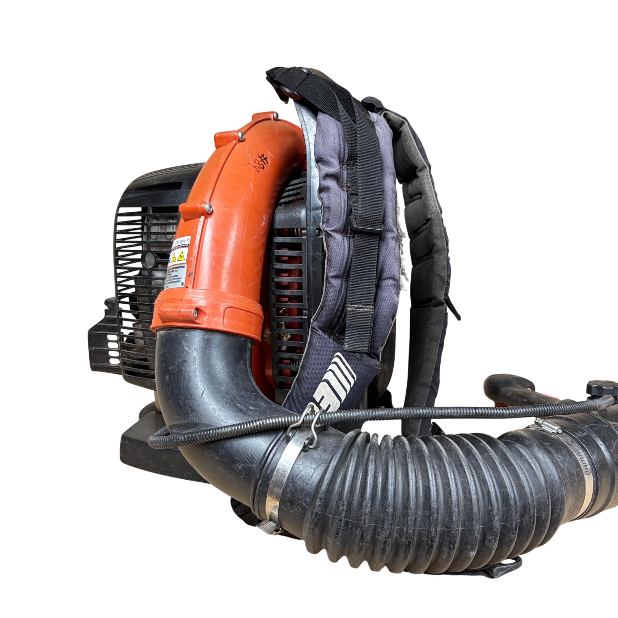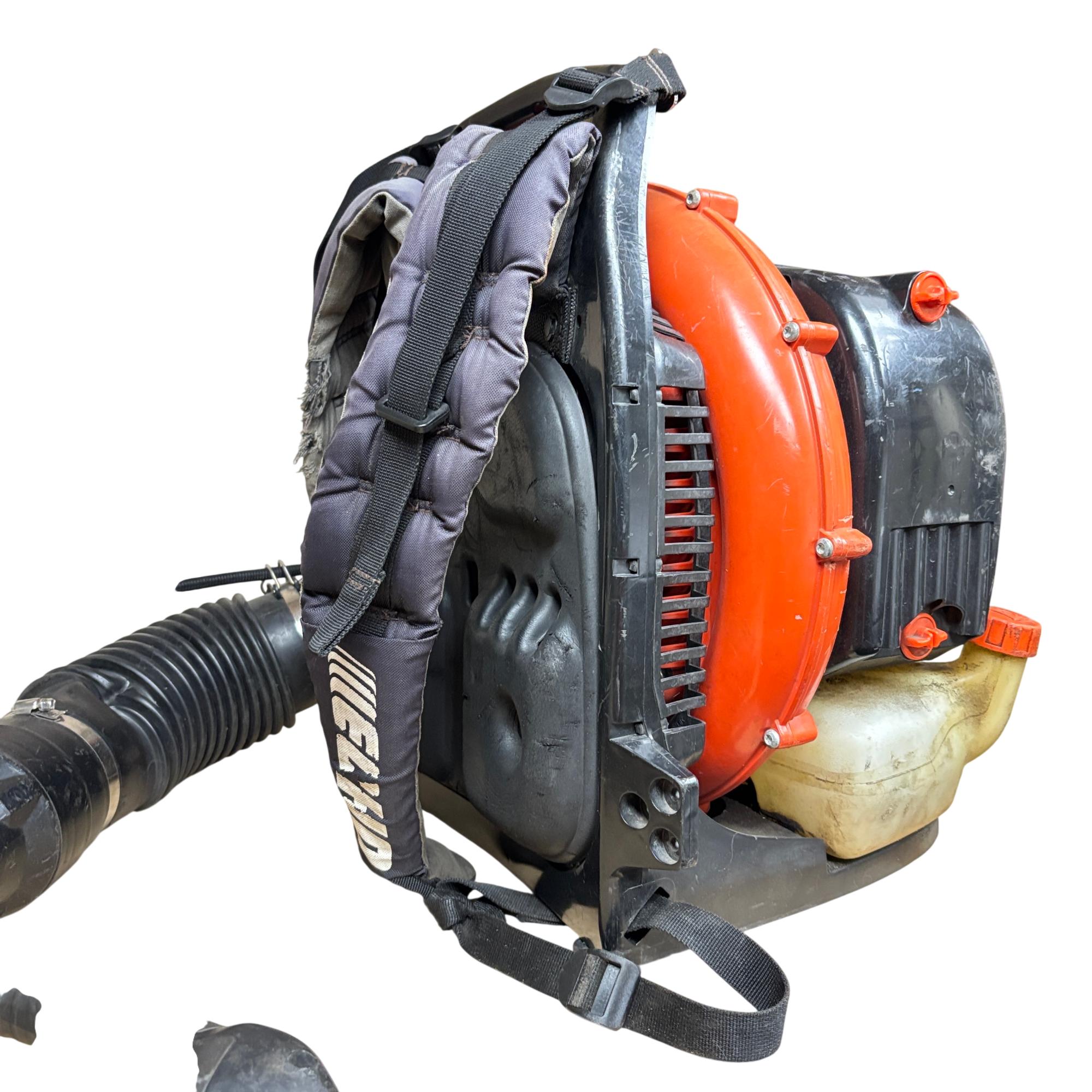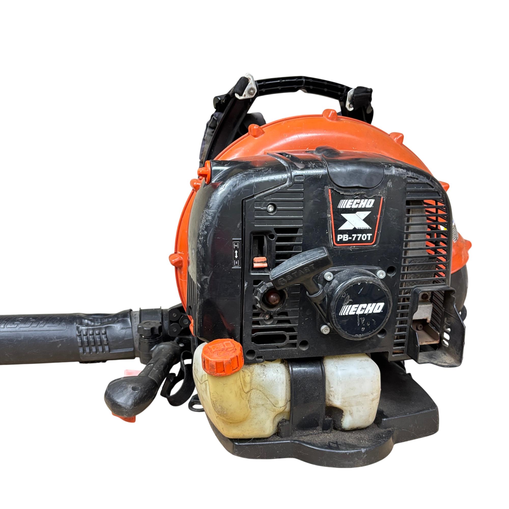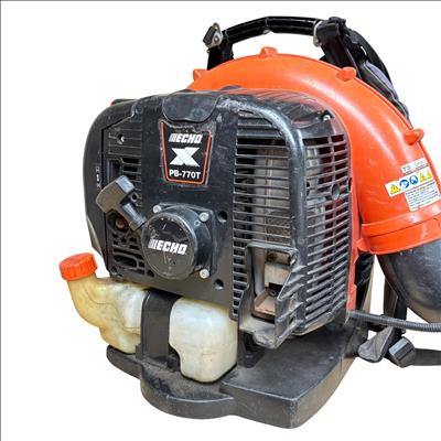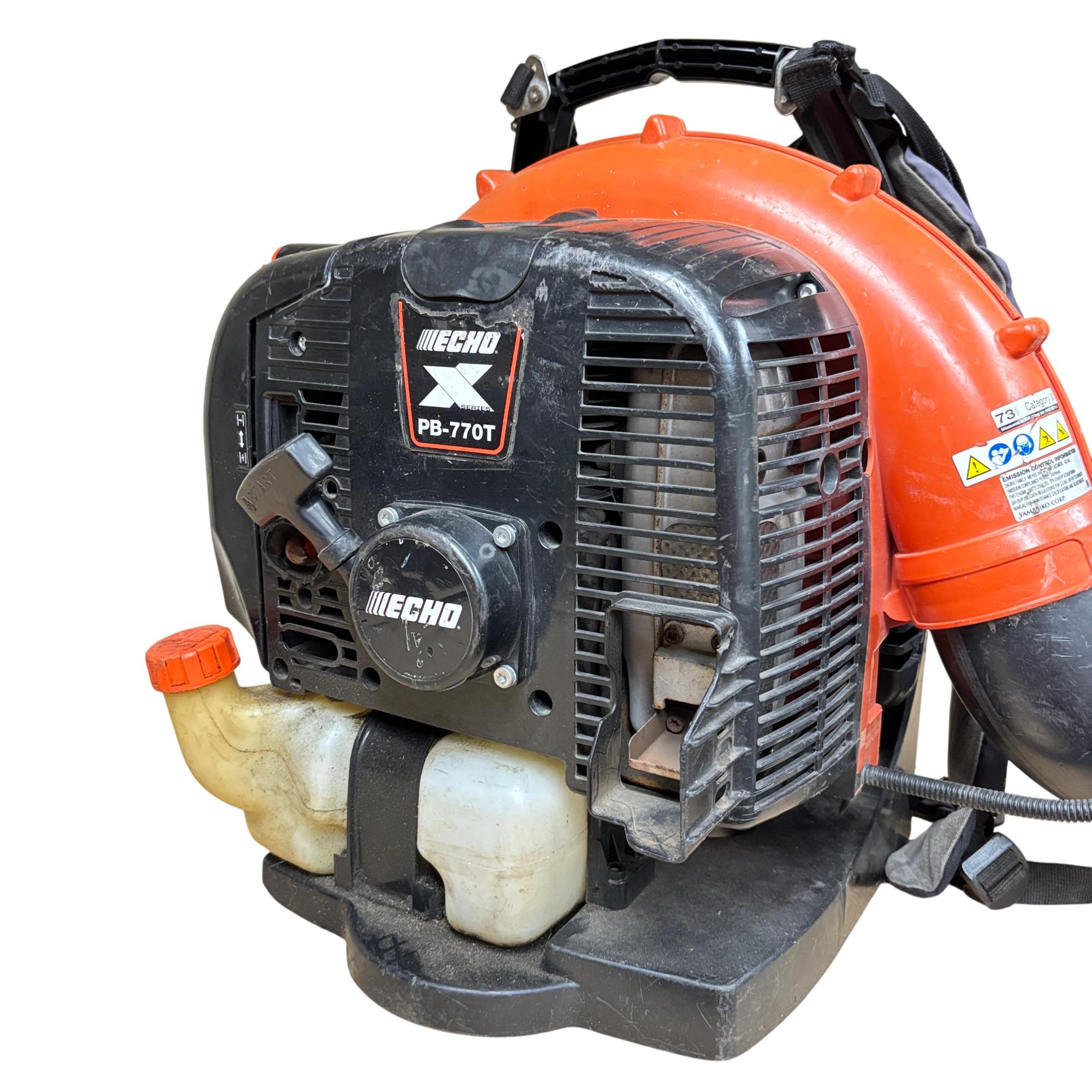 This ECHO PB-770T X Series Backpack Blower featuring a powerful 63.3cc 2-stroke gas engine. This commercial-grade tool is designed for efficient leaf blowing with its tube-mounted throttle for convenient operation. The machine is built for demanding tasks, ensuring reliable performance.