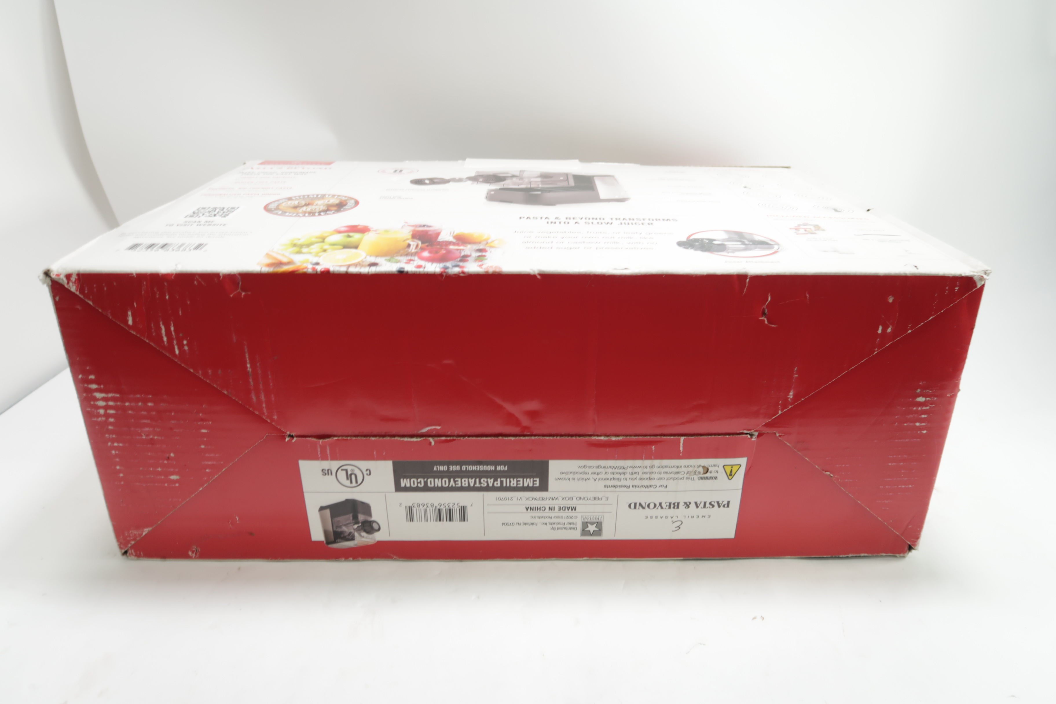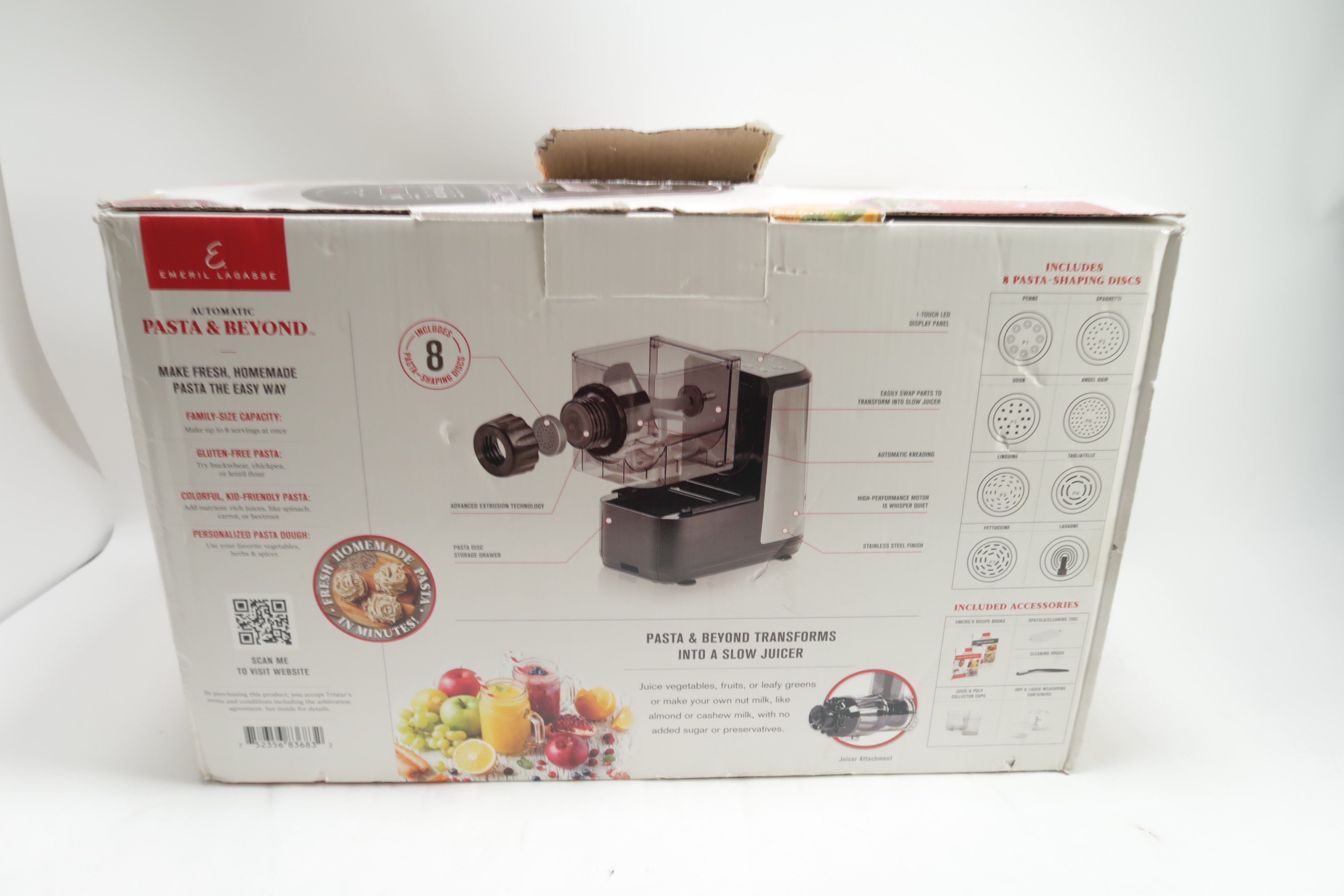 Includes pasta making tools and attachments: pasta disc set, pasta / noodle cutter, 1 dry measuring cup, 1 liquid measuring cup, spatula / cleaning tool, cleaning brush, slow juicer / healthy frozen dessert maker attachment, cookbook with Emeril’s easy homemade pasta, cookbook with Emeril’s easy juicing and frozen dessert recipes