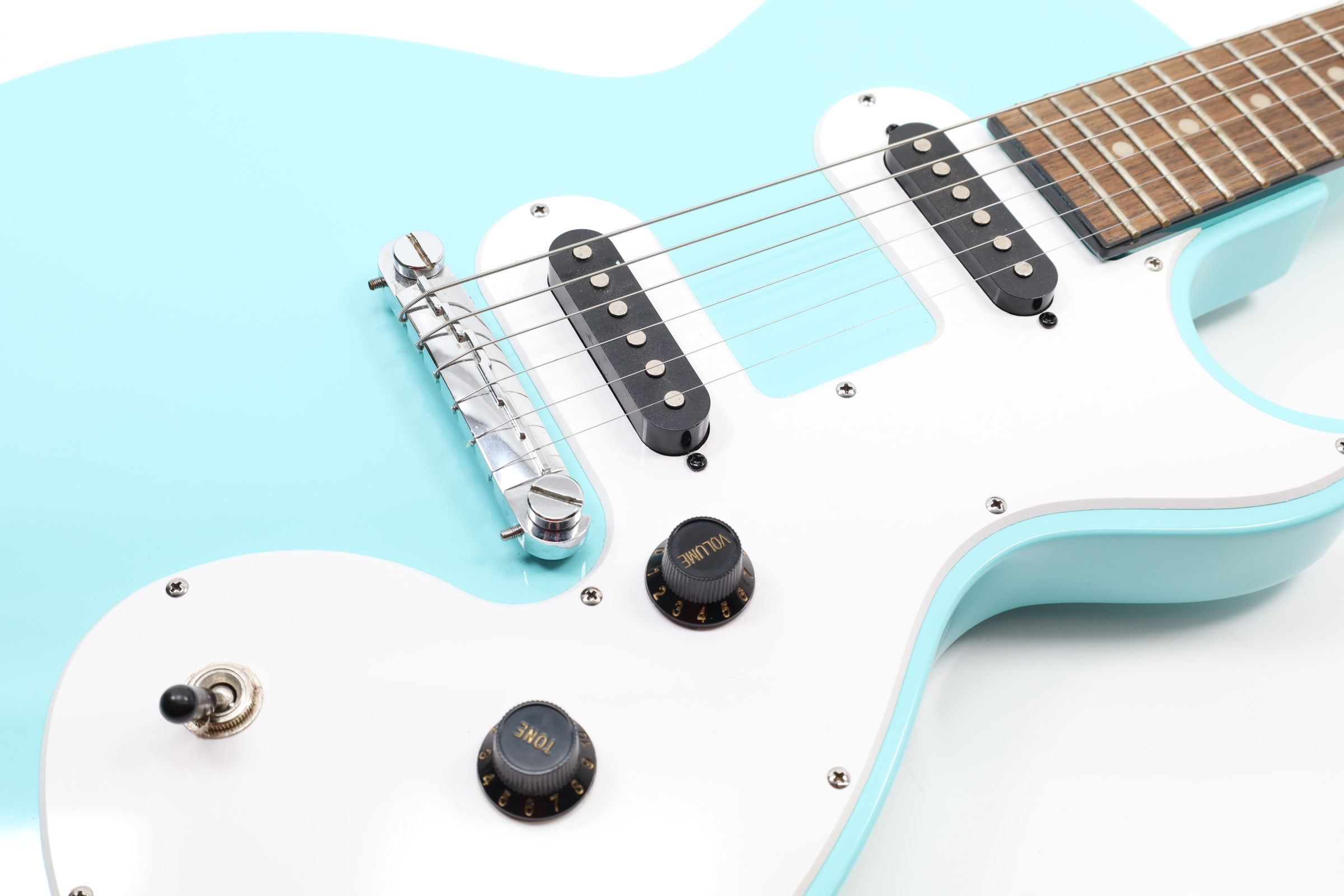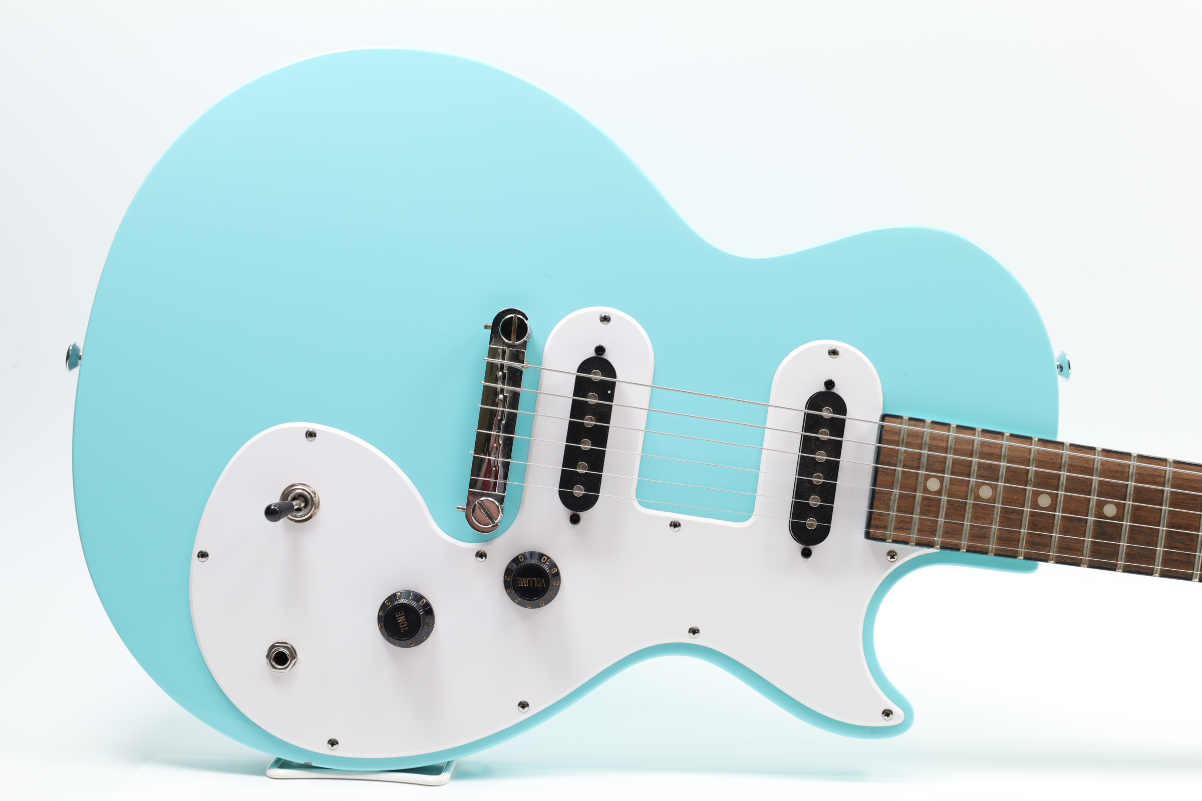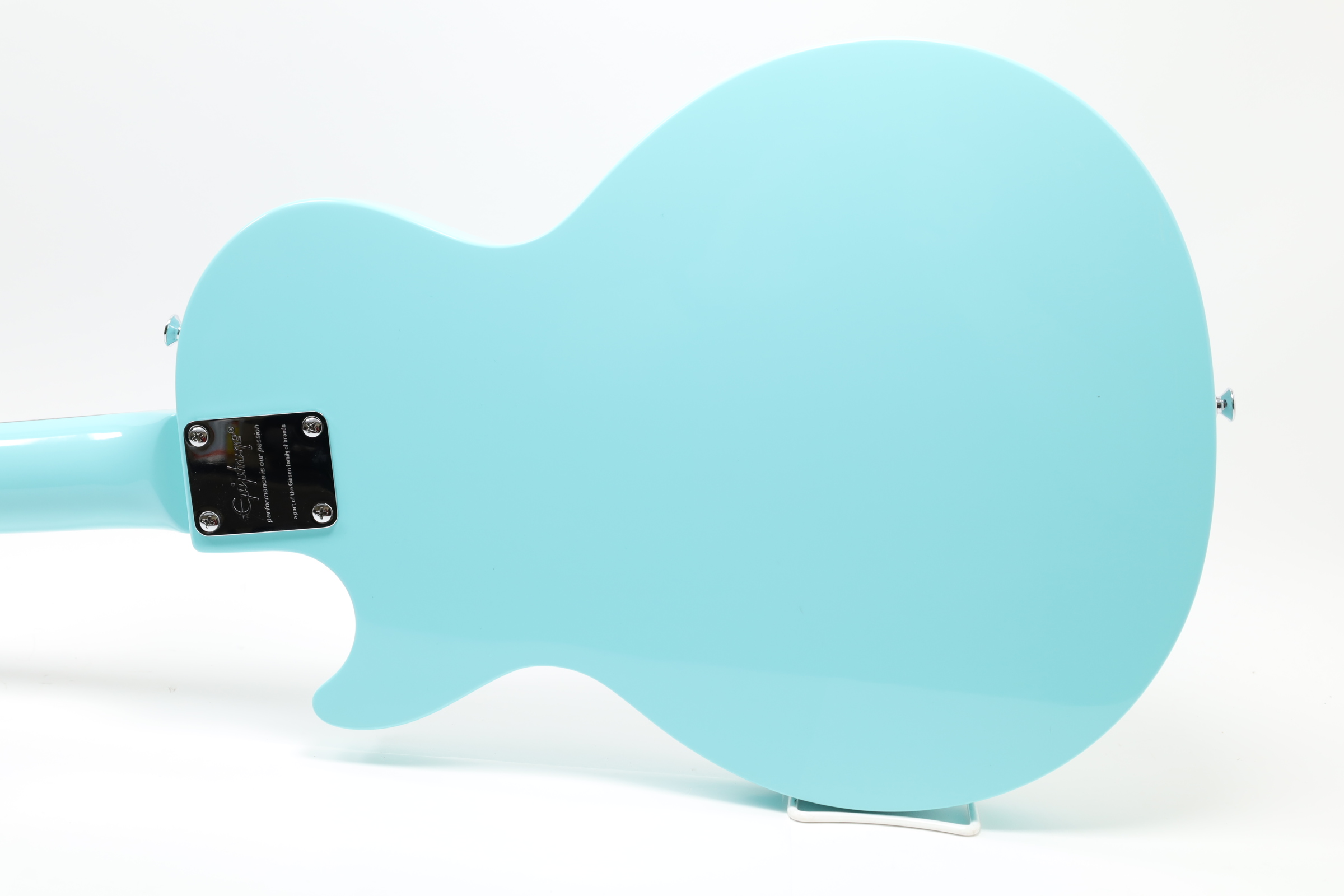 A 6-string right-handed electric guitar that offers an affordable entry into the Les Paul lineup with a slim, lightweight poplar body for easy playability. It features powerful Epiphone Ceramic pickups, with a 650SCR Ceramic Single-Coil in the neck position and a 700SCT Ceramic Single-Coil at the bridge, controlled by a master volume and master tone knob, along with a 3-way toggle switch for versatile sound shaping. The guitar sports a 1960s SlimTaper D-shaped neck profile with a laurel fingerboard, 22 medium jumbo frets, and dot inlays for a comfortable playing experience. The nickel-finished hardware includes an Epiphone Lighting Bar Compensated Wrap Around bridge and black ABS “Top Hat” control knobs, complemented by a white SL style pickguard. It is available in exclusive colors such as Ebony, Heritage Cherry Sunburst, Pacific Blue, Sunset Yellow, Turquoise, and Vintage Sunburst, making it a visually appealing instrument for players of all levels.