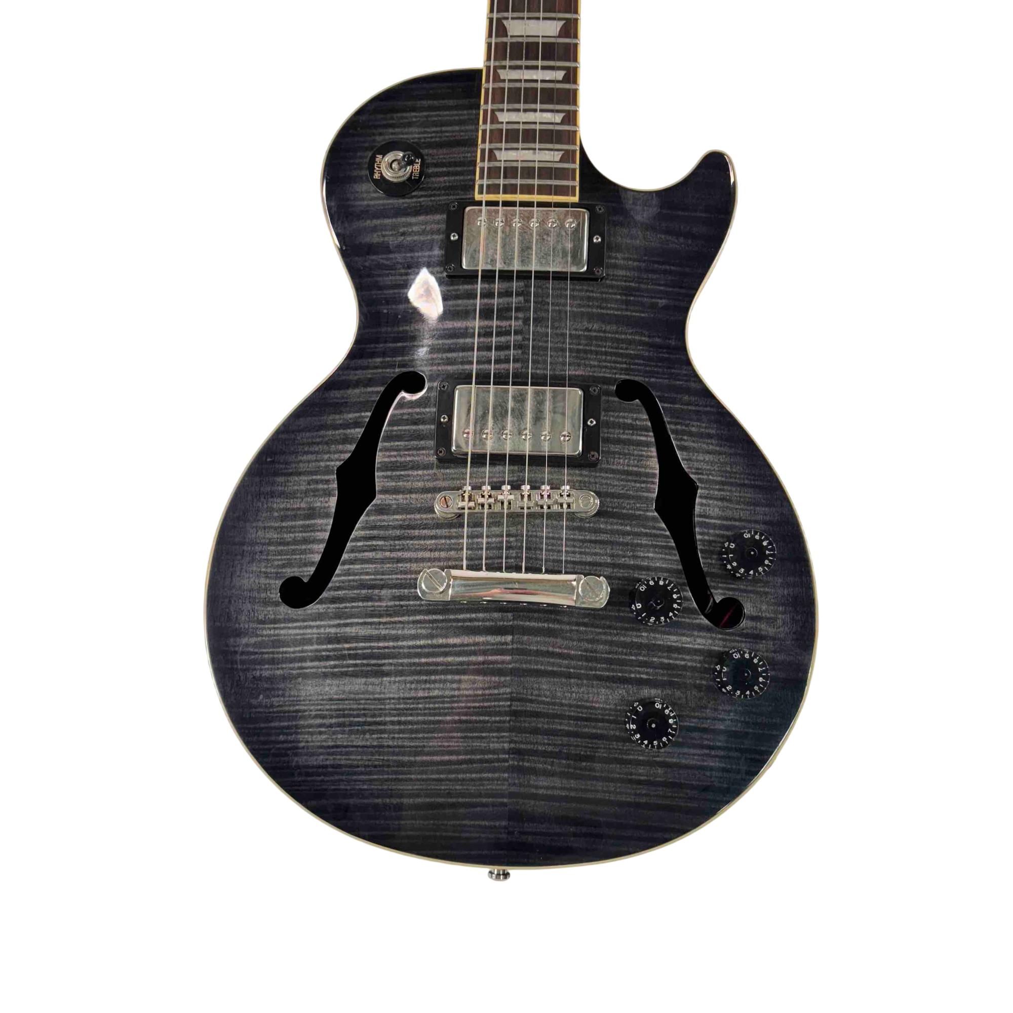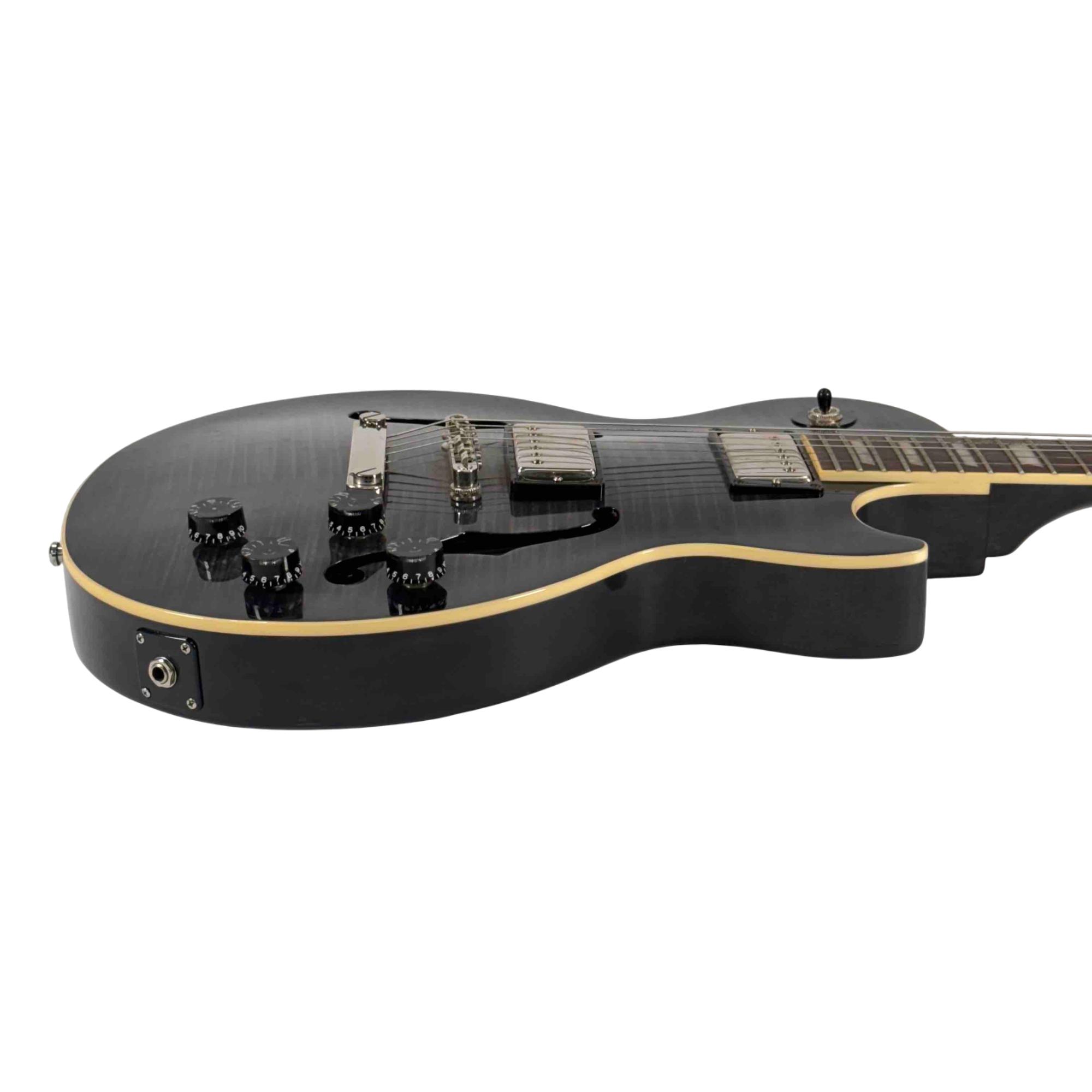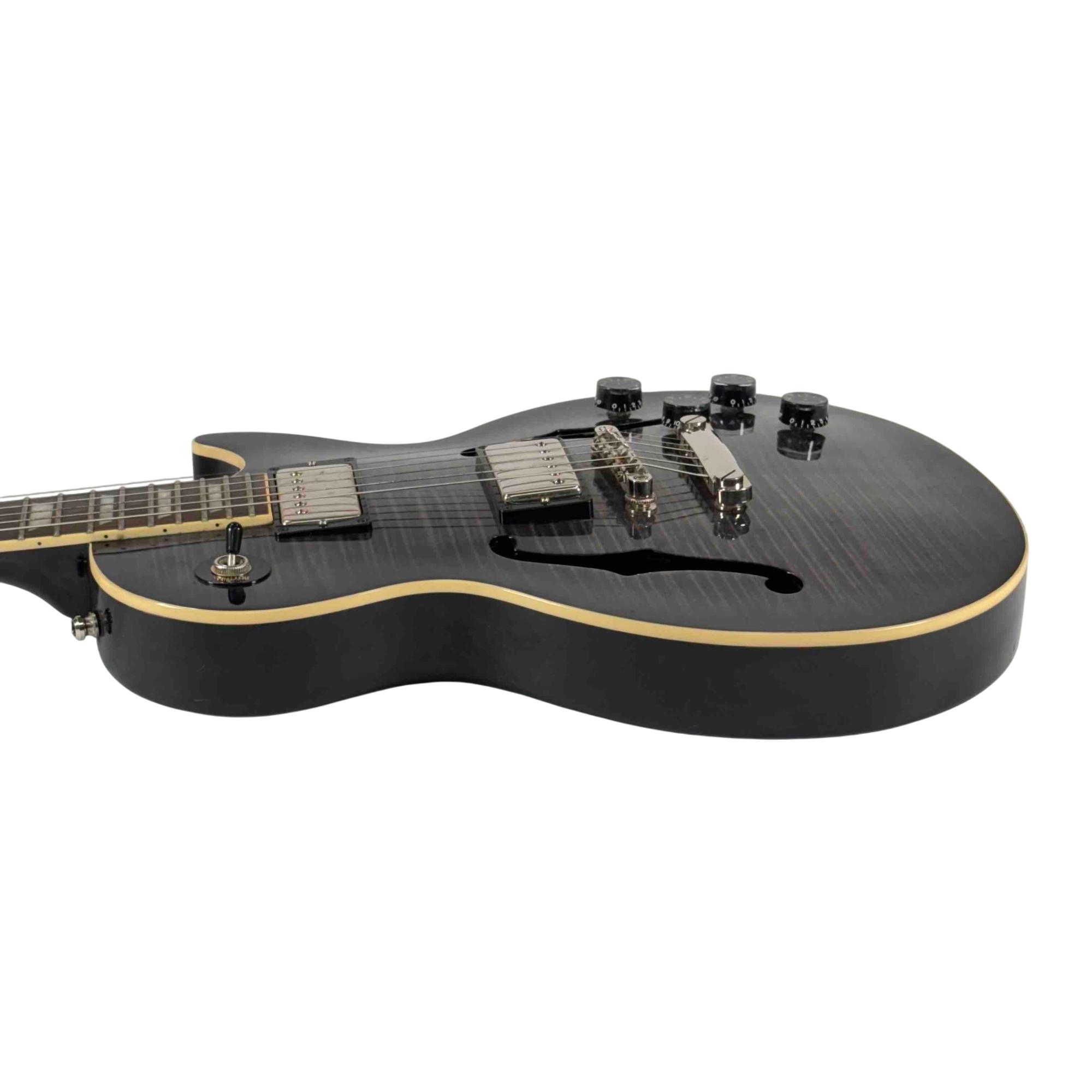 The Epiphone Les Paul Standard Florentine PRO is a right-handed 6-string semi-hollowbody electric guitar with 22 frets, blending the classic Les Paul style with the lighter weight and resonant tone of a semi-hollow design for versatile performance.