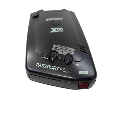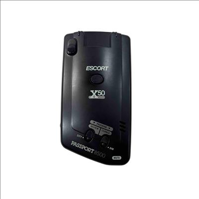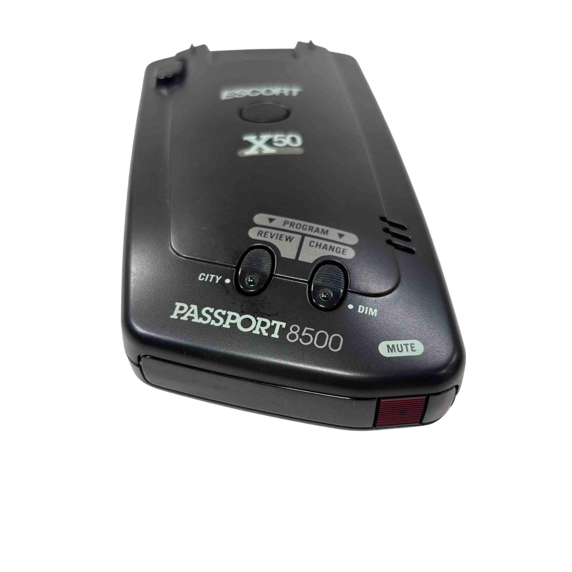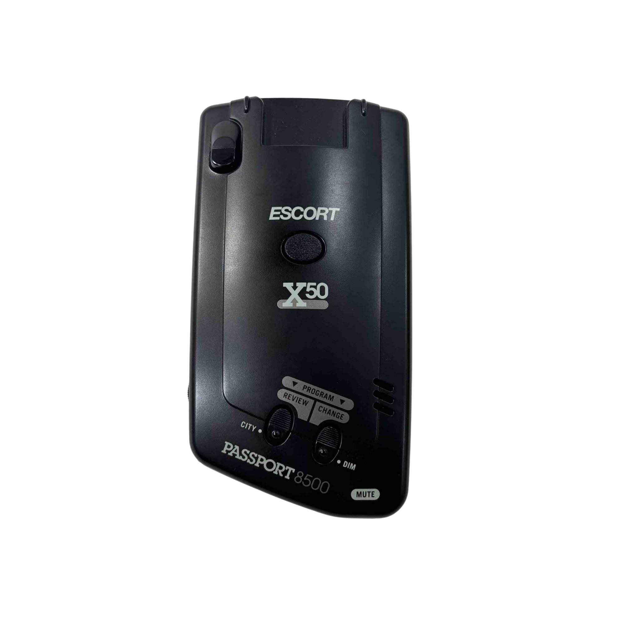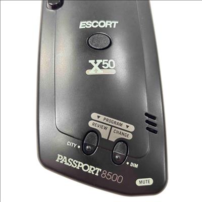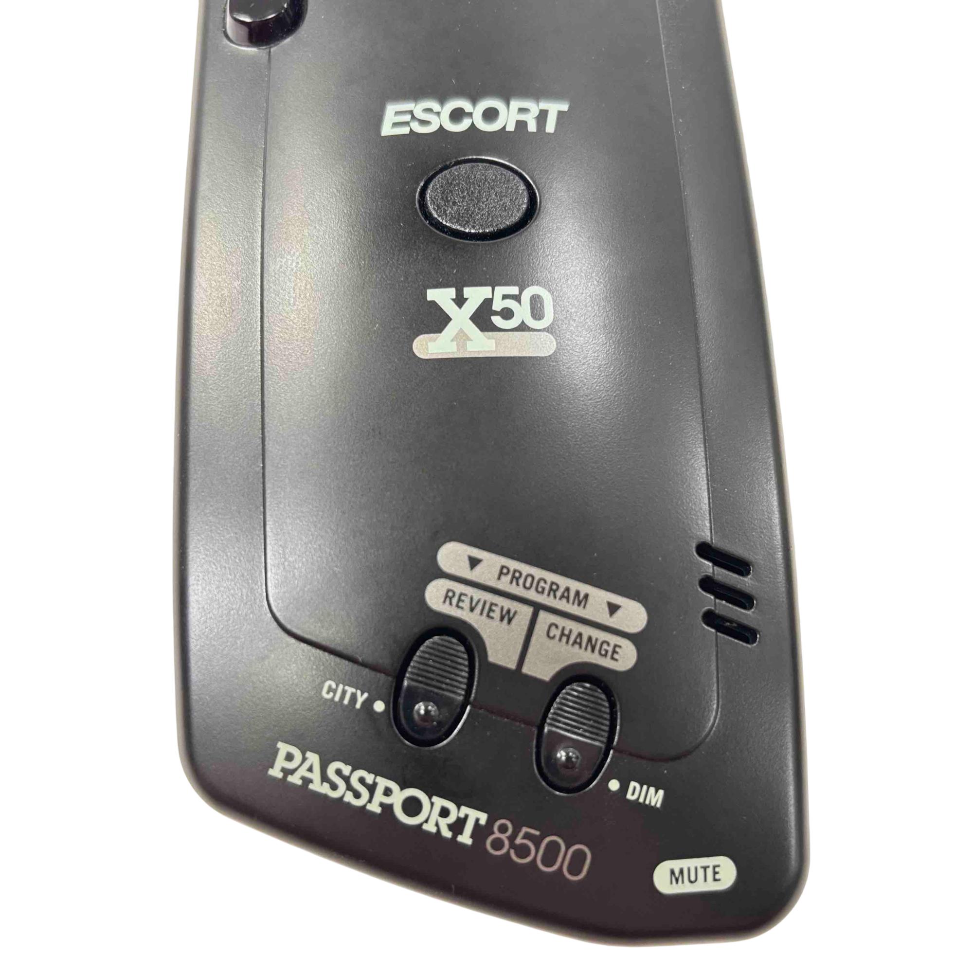 Escort Passport 8500 X50 Radar Detector with SmartCord and Carrying Case is a compact black electronic device designed for advanced radar detection. Made in Canada, it features multiple buttons for program, review, change, and mute functions, and operates on 12VDC negative ground power. This radar detector complies with FCC regulations and comes neatly housed in a protective carrying case for portability and ease of use.