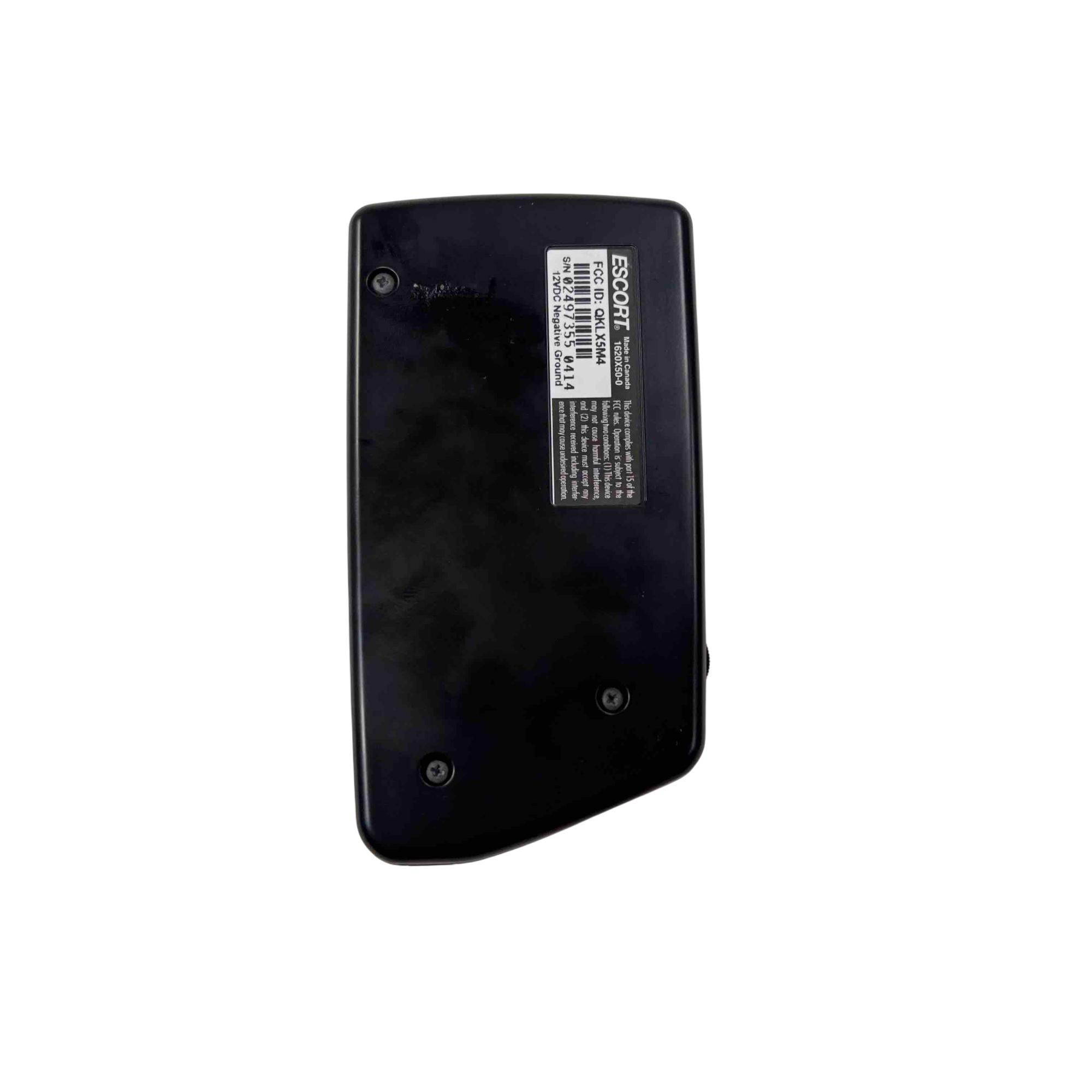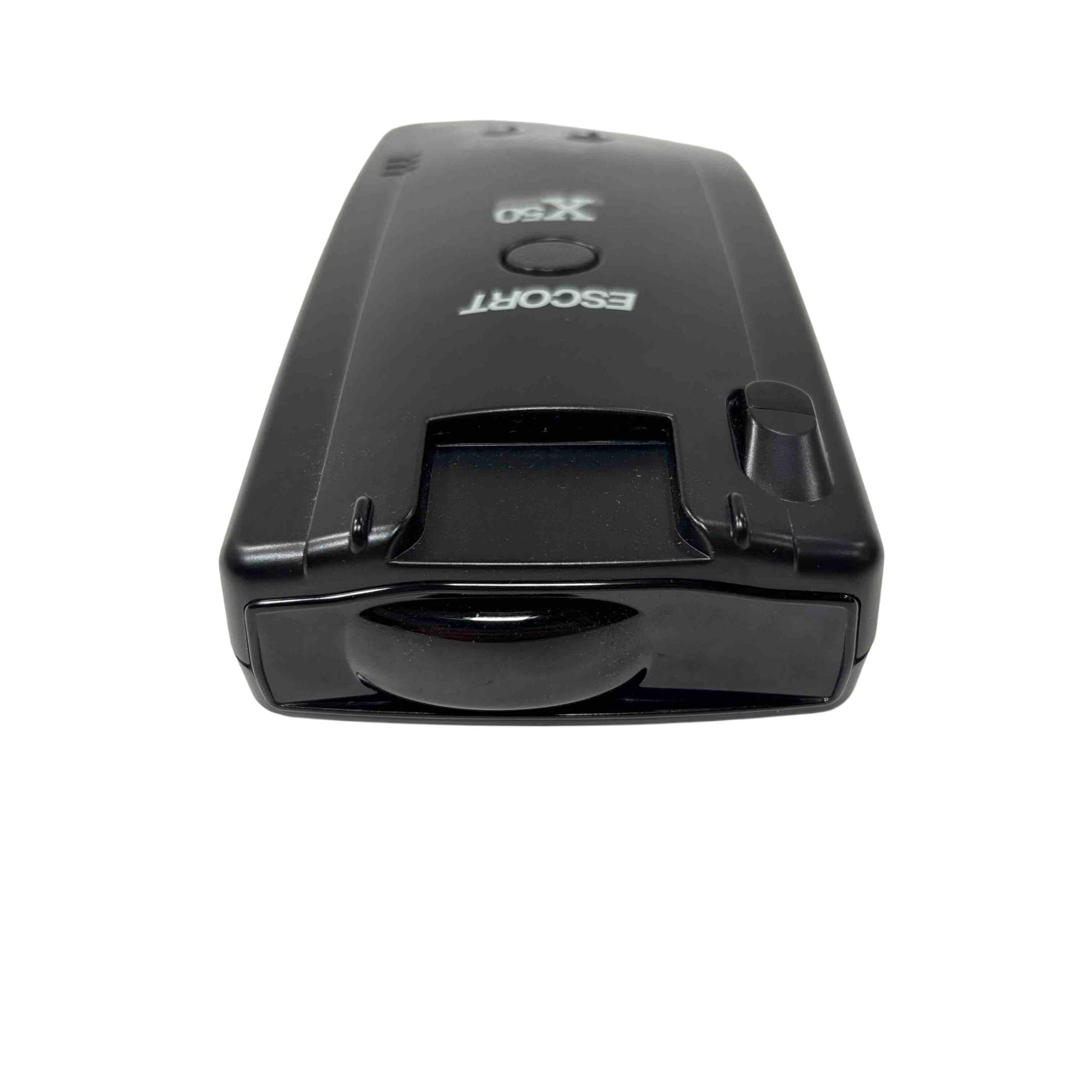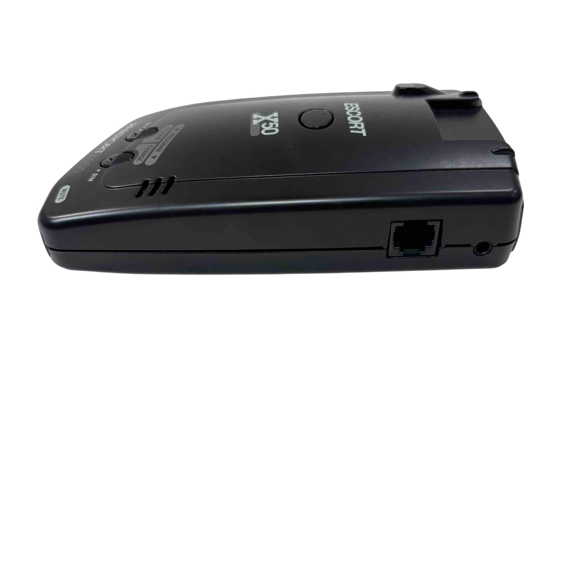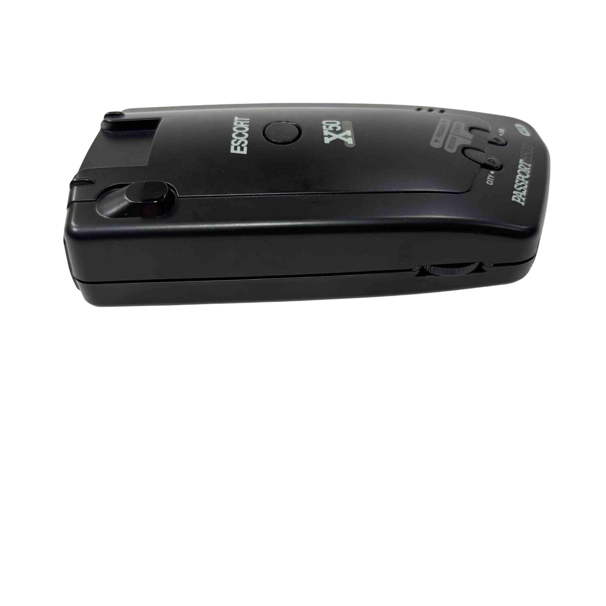Escort Passport 8500 X50 Radar Detector with SmartCord and Carrying Case is a compact black electronic device designed for advanced radar detection. Made in Canada, it features multiple buttons for program, review, change, and mute functions, and operates on 12VDC negative ground power. This radar detector complies with FCC regulations and comes neatly housed in a protective carrying case for portability and ease of use.