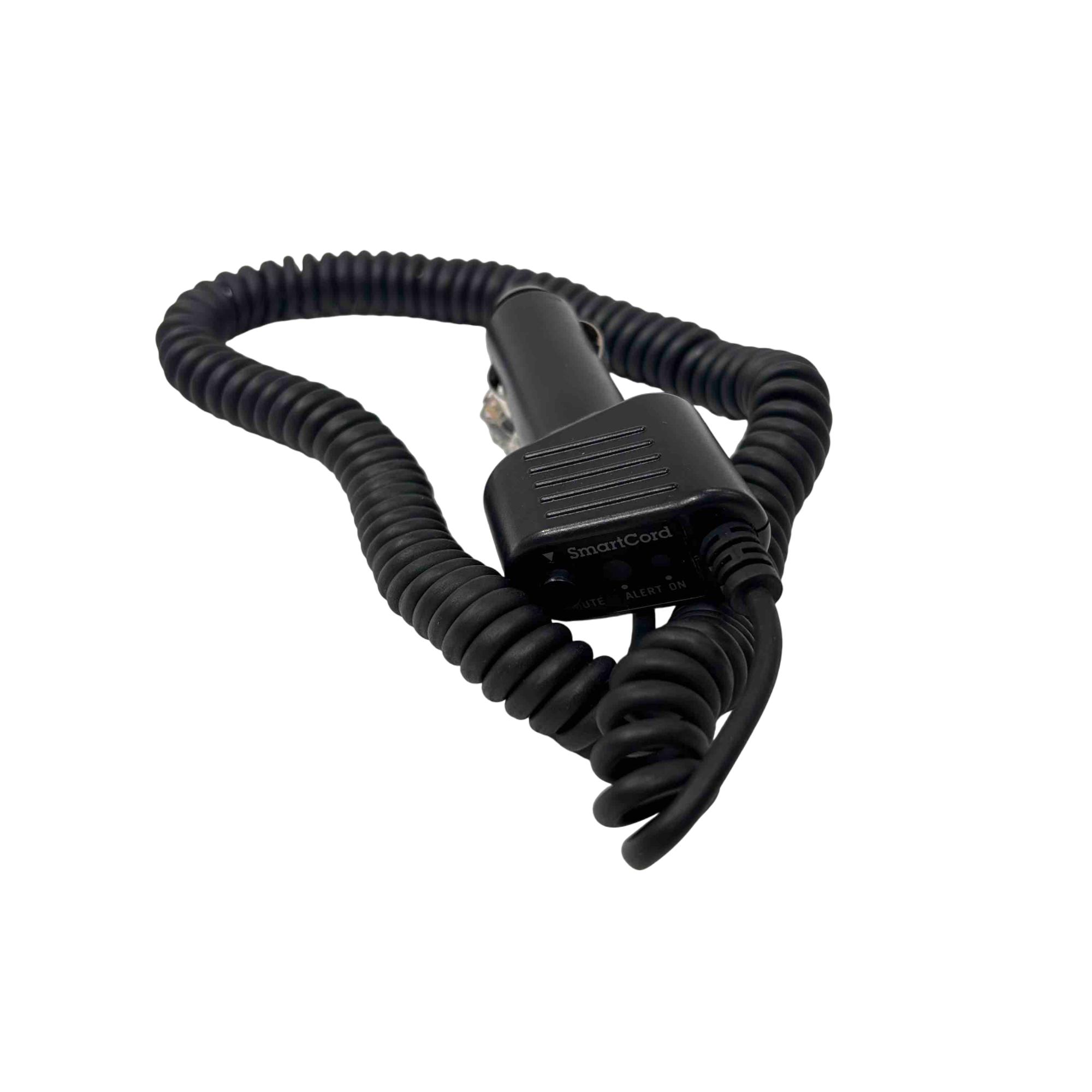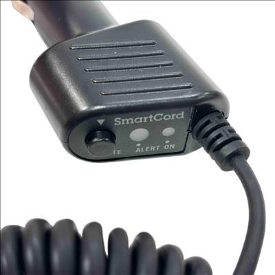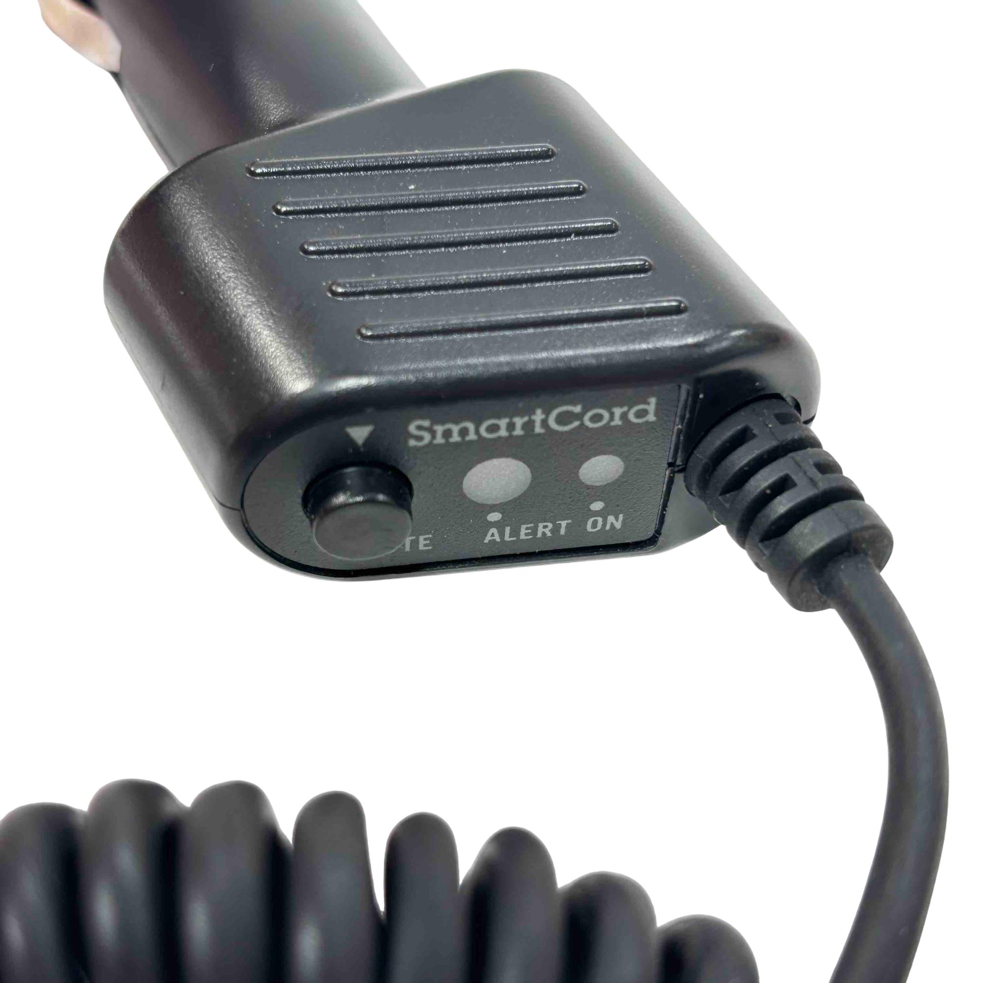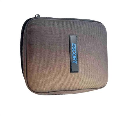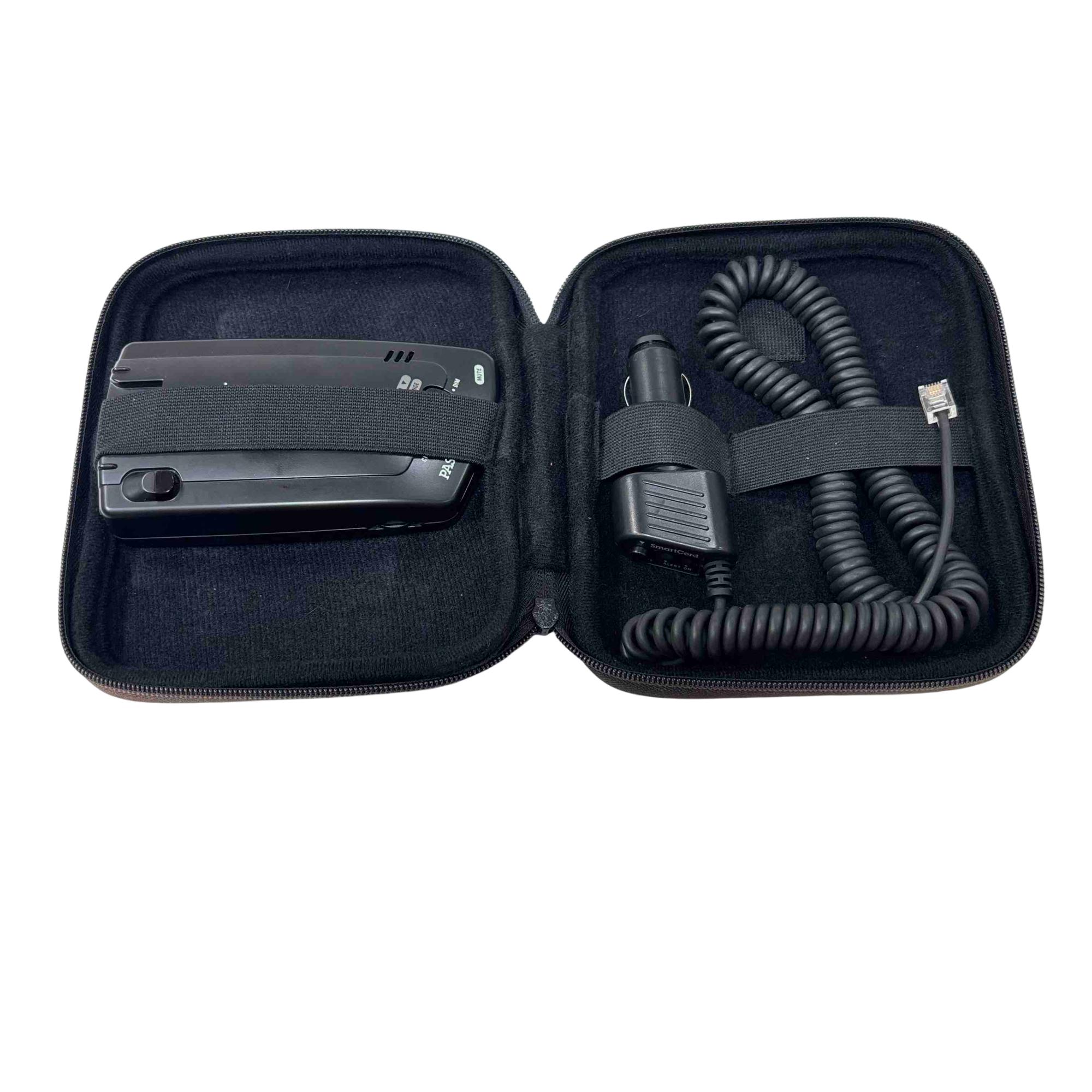 Escort Passport 8500 X50 Radar Detector with SmartCord and Carrying Case is a compact black electronic device designed for advanced radar detection. Made in Canada, it features multiple buttons for program, review, change, and mute functions, and operates on 12VDC negative ground power. This radar detector complies with FCC regulations and comes neatly housed in a protective carrying case for portability and ease of use.