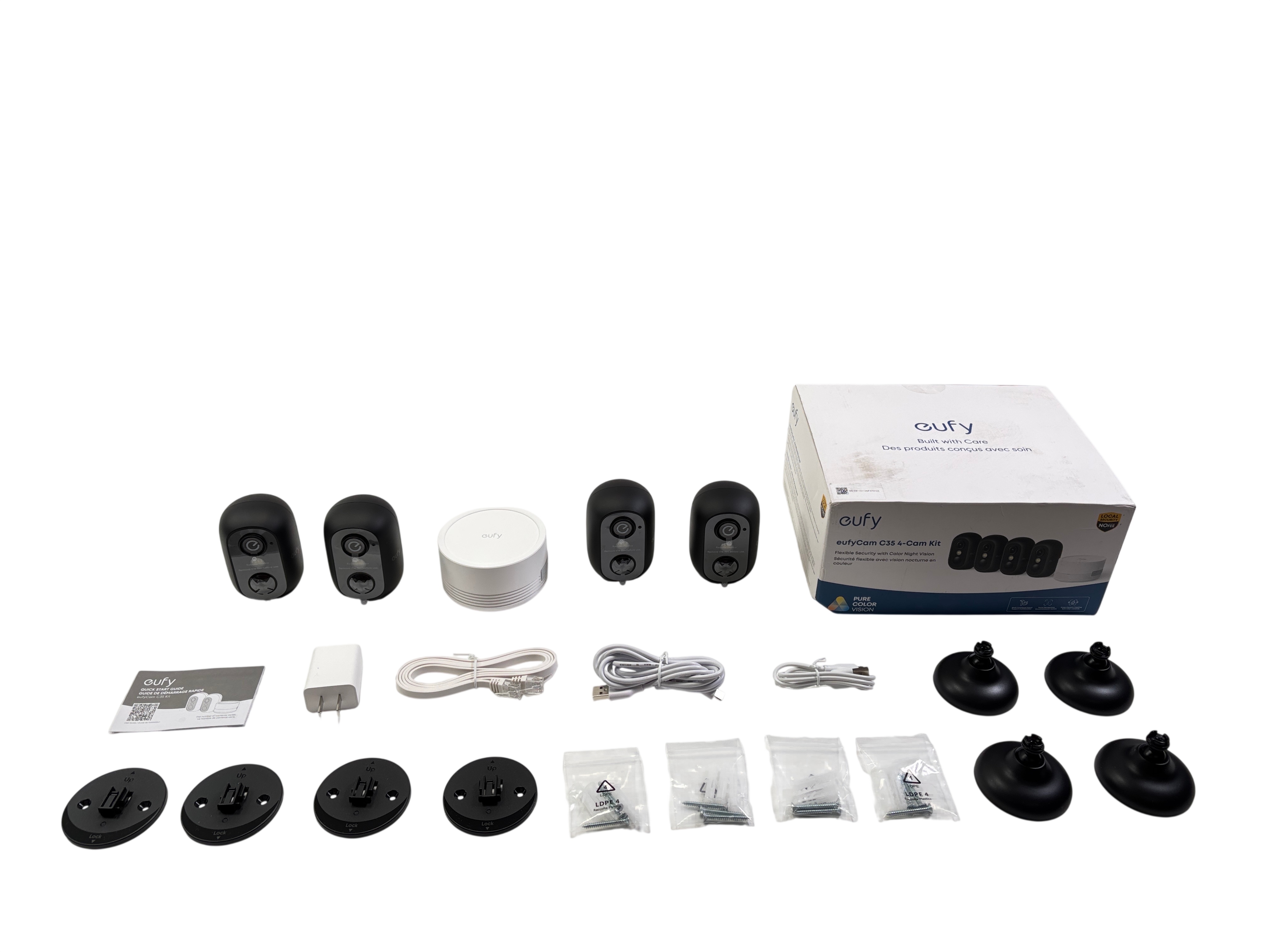 The Eufy C35 4-Cam Security Camera Kit offers a complete wireless security camera system featuring four black cameras and a white HomeBase Mini hub. Designed for flexible home security, this kit supports color night vision for clear video even in low-light conditions. Included are mounting bases, screws, cables, and a power adapter for easy setup. Ideal for homeowners seeking reliable, local storage and seamless wireless monitoring.
