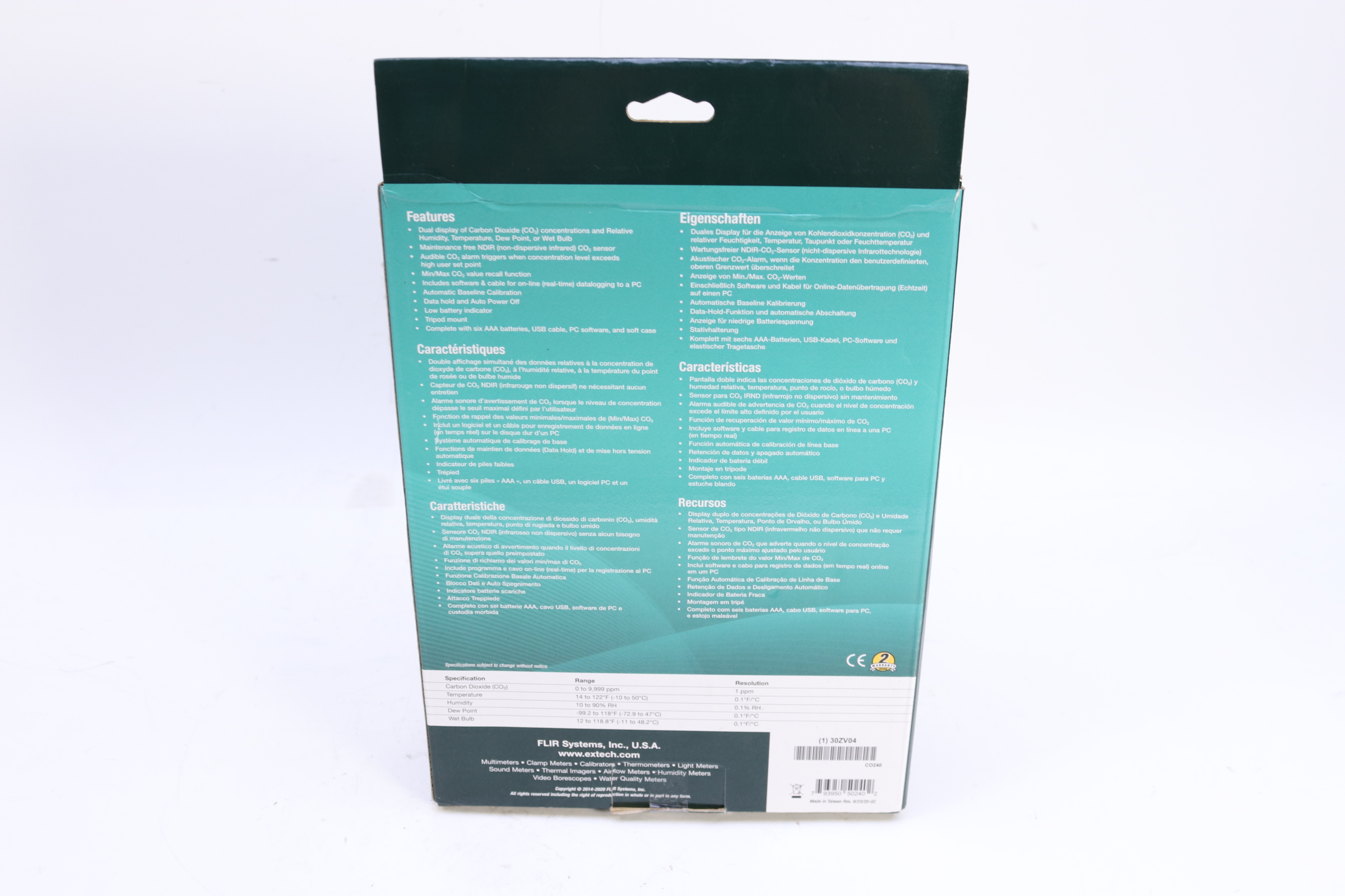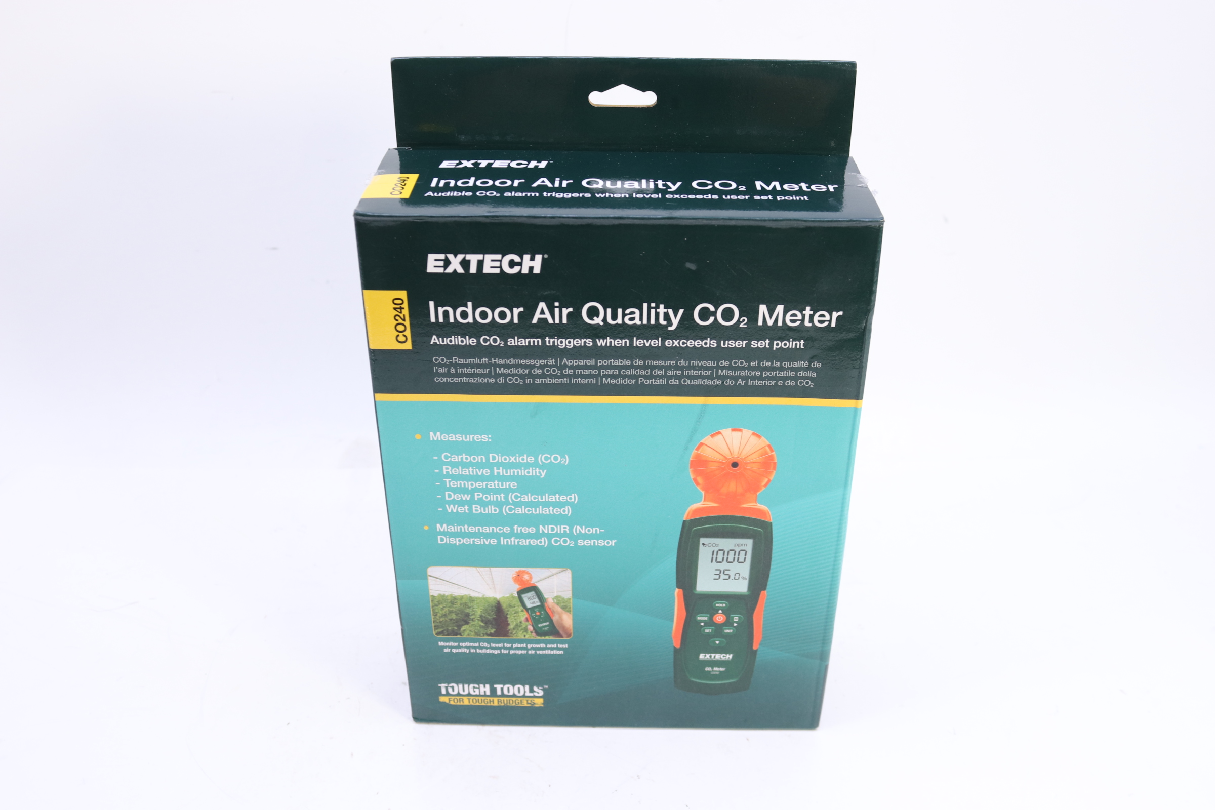 Easy-to-use Extech CO240 Air Quality Meter measures Carbon Dioxide (CO2), Air Temperature, and Humidity. It also calculates Dew Point and Wet Bulb. User settable high alarm with audible beeper is perfect for conducting a quick check of CO2 level to help adjust the environmental conditions in an enclosed area, such as a greenhouse or nursery, to ensure optimal plant grown. It’s also convenient for testing the air quality in buildings such as factories, hospitals, conference rooms, schools, and anywhere that high levels of carbon dioxide are generated, to ensure proper air ventilation.