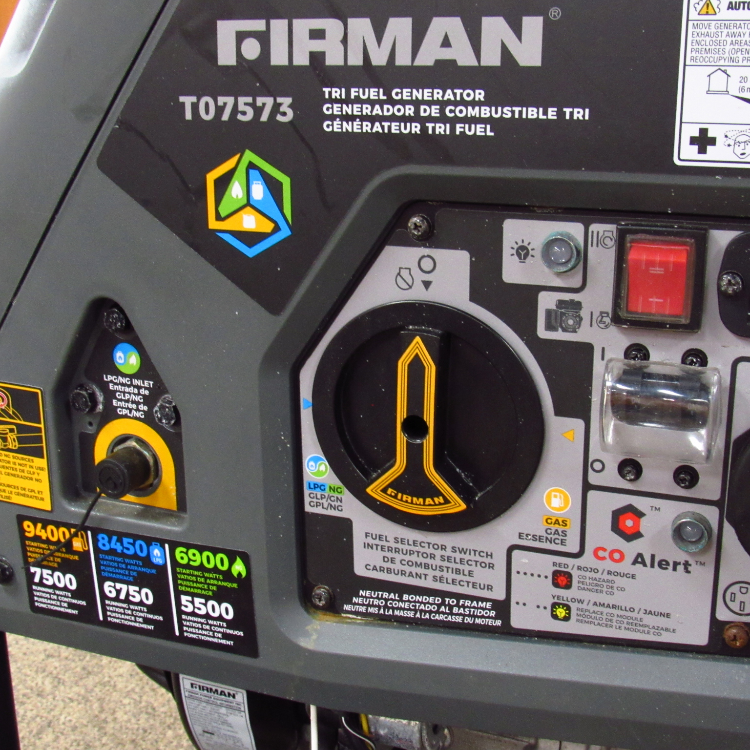 The FIRMAN T07573 Tri-Fuel generator is a 9400-watt trifecta — running on gasoline, natural gas, and propane.