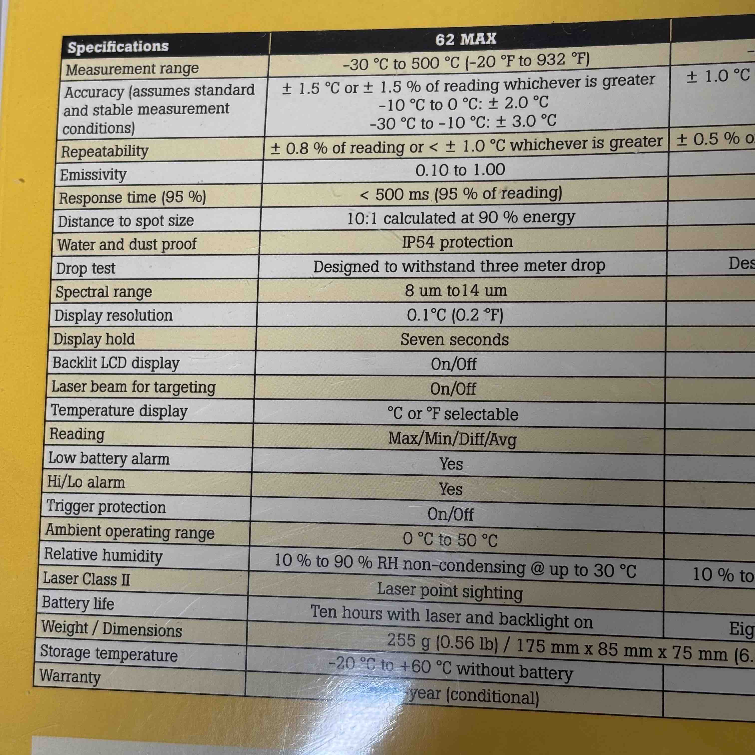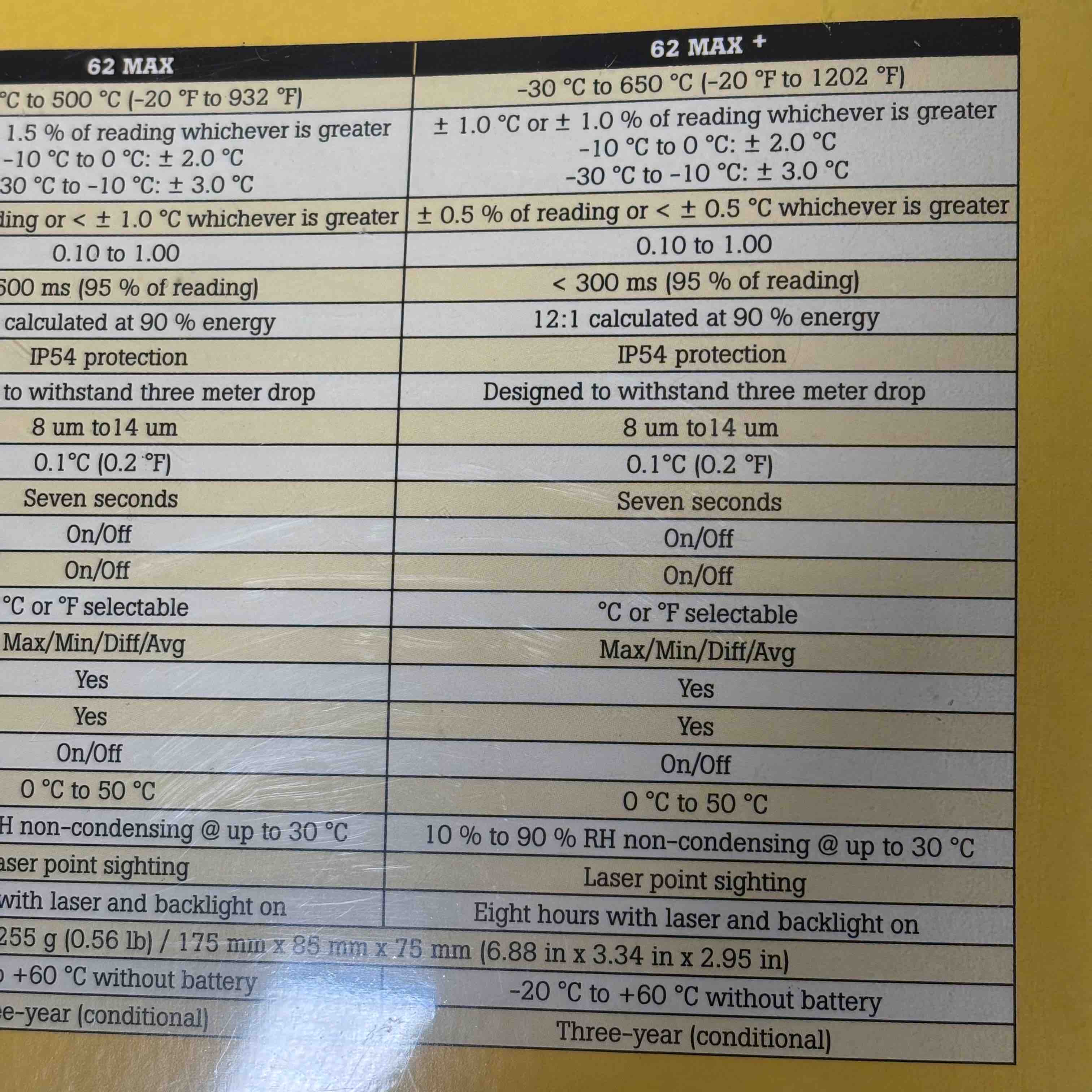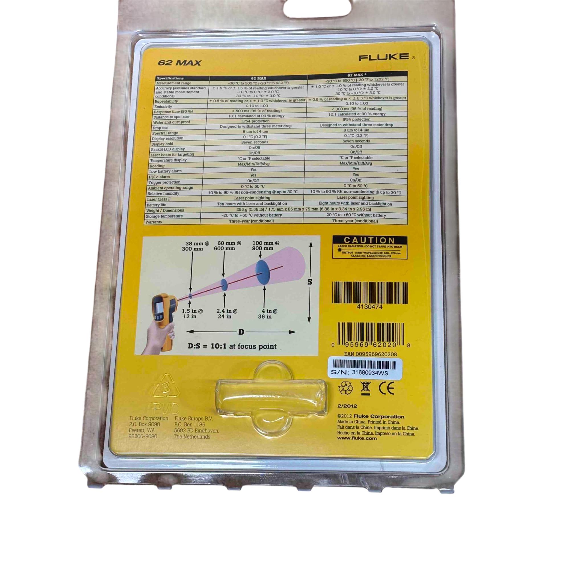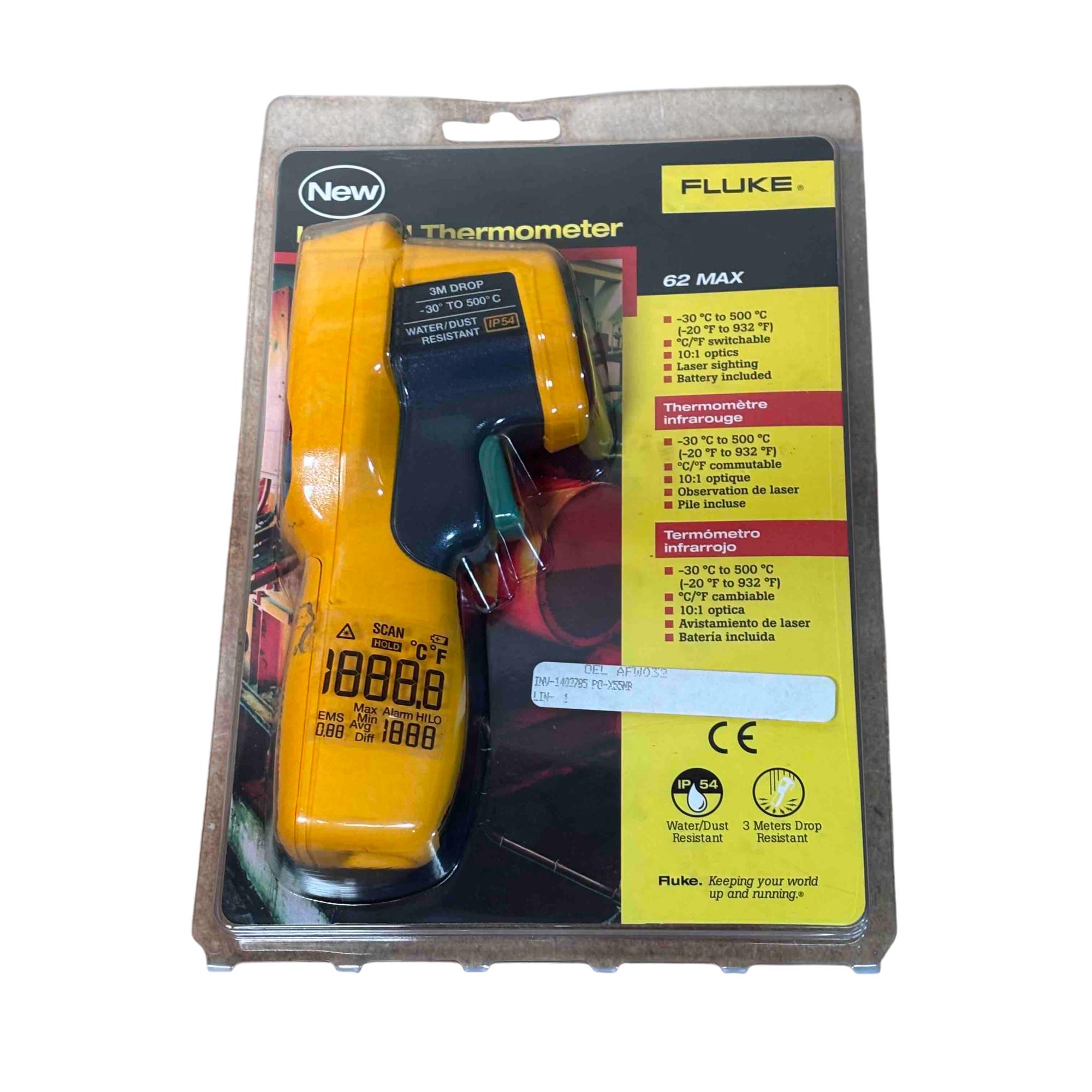 The Fluke 62 MAX Infrared Thermometer is the go-to tool for quick, non-contact temperature readings, perfect for HVAC, automotive, and industrial applications. Featuring a rugged, IP54-rated build for water and dust resistance, this thermometer can withstand drops from up to 3 meters. With a wide temperature range of -30°C to 500°C (-20°F to 932°F), laser sighting, and °C/°F switchability, its reliable and user-friendly, making it ideal for professionals and DIYers alike.
