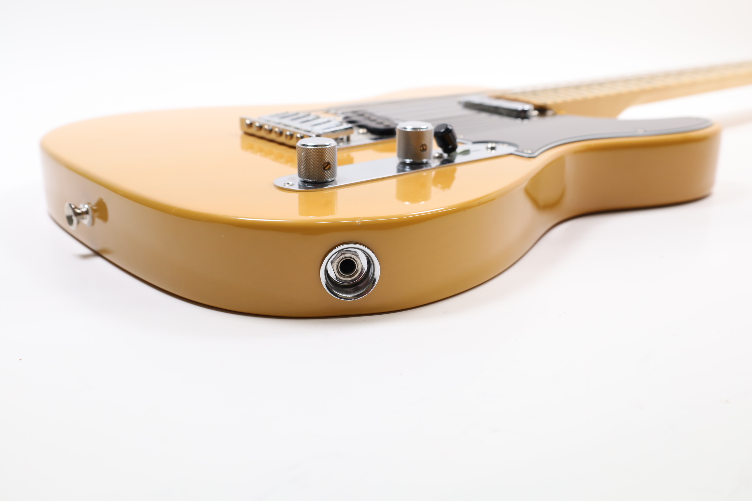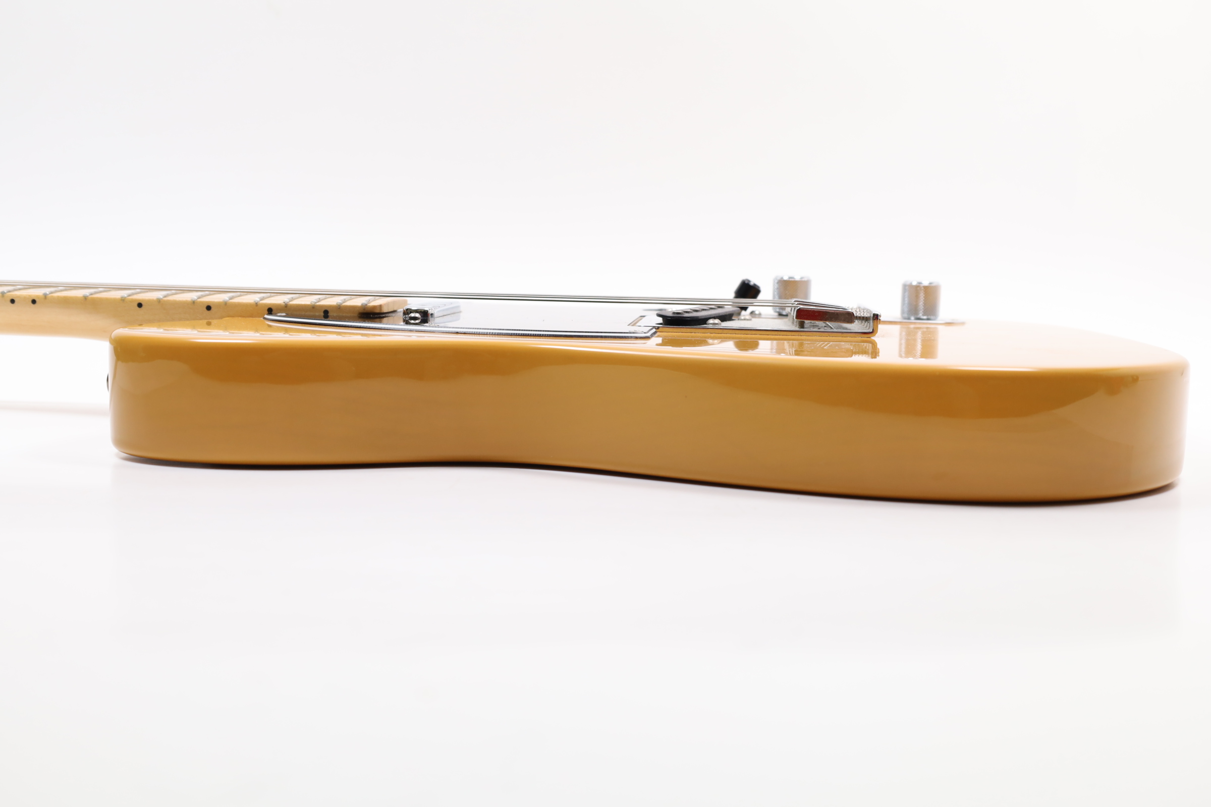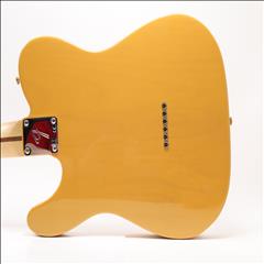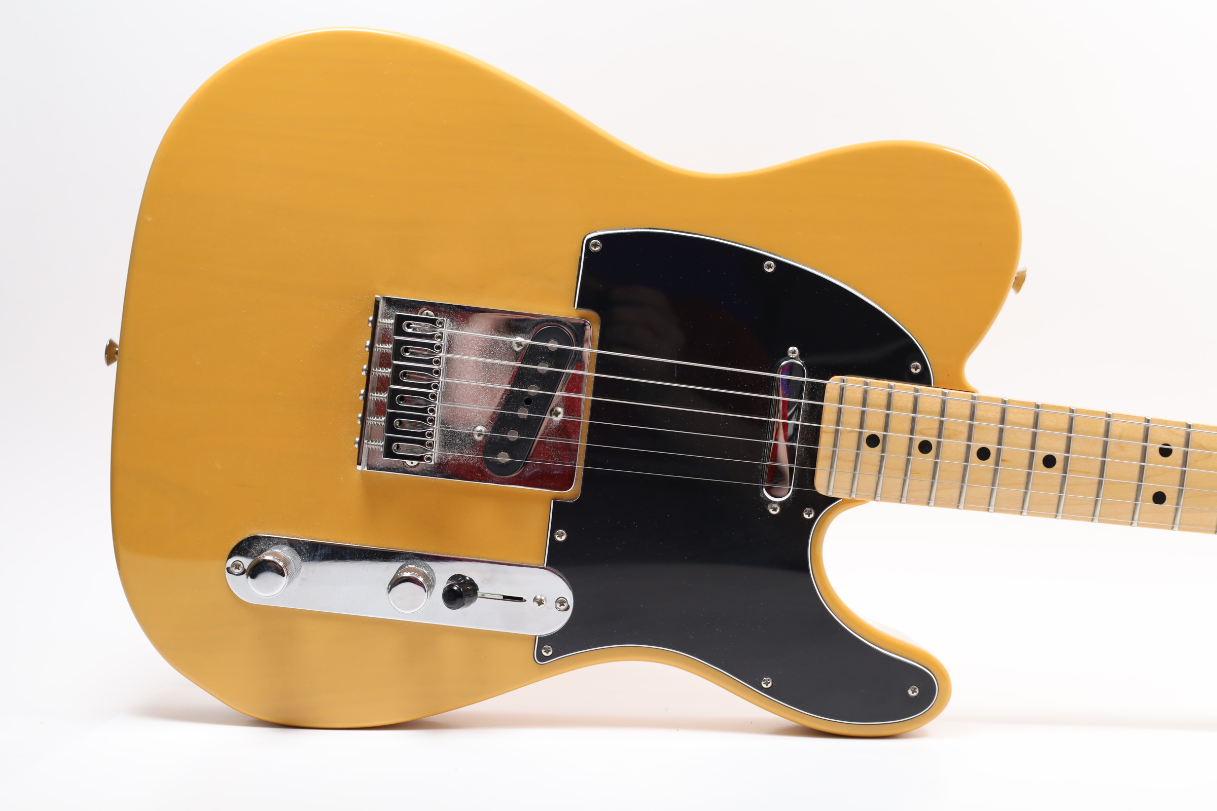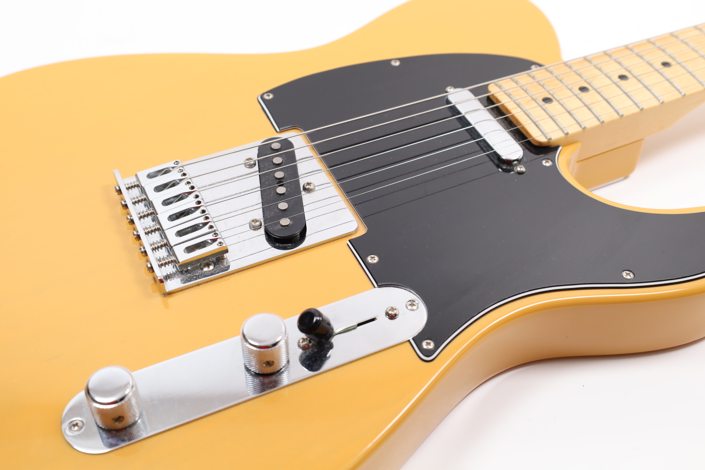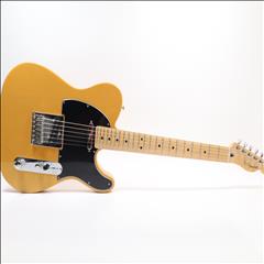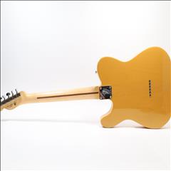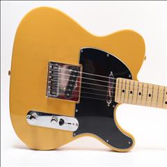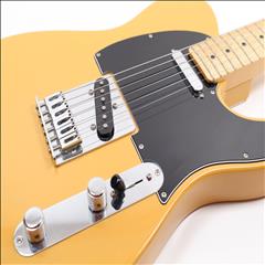A bold and innovative guitar that embodies the essence of the Fender brand. With a body made of Alder and finished in Gloss Polyester, it sports the classic Telecaster shape. The bridge is a 6-Saddle String-Through-Body Tele with Block Steel Saddles, and it features Player Series Alnico 5 Tele Single-Coil pickups. The guitar's color is Butterscotch Blonde, and it has a Maple fingerboard with a 9.5" radius and Medium Jumbo frets. The hardware is finished in Nickel/Chrome, and the neck is constructed with a 4-Bolt Standard connection, featuring a Satin Urethane finish on the back and Gloss Urethane on the front. The neck shape is a modern "C," and it has 22 frets with a synthetic bone nut. The guitar is right-handed and comes with a 3-Ply Parchment pickguard. The pickup configuration is SS, with a 3-Position Blade switch for pickup selection. The scale length is 25.5", and it's part of the Player series. This rugged and versatile instrument is designed to handle a wide range of musical styles and is durable enough for any gig, making it a reliable choice for musicians.