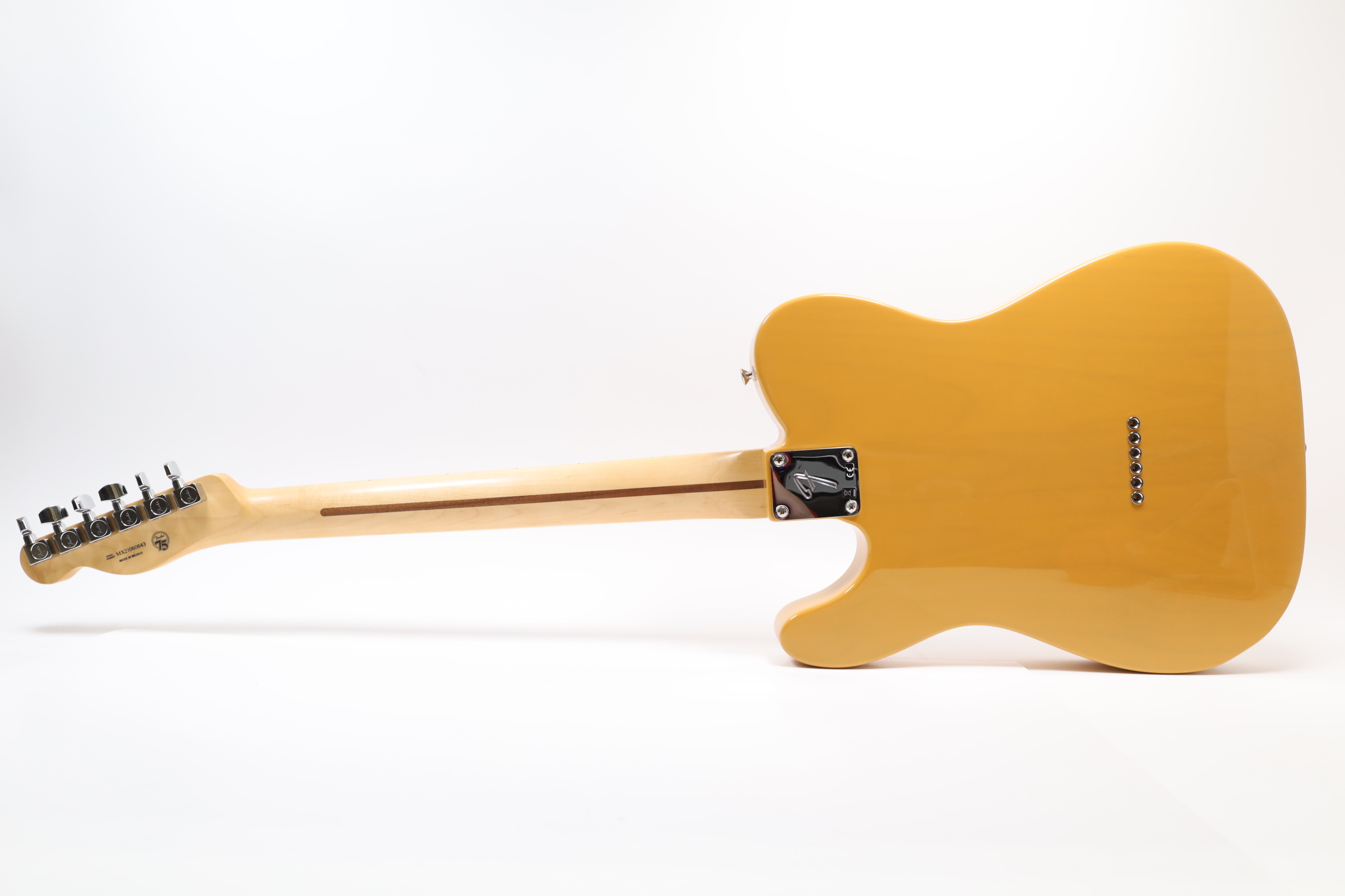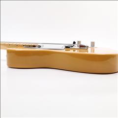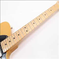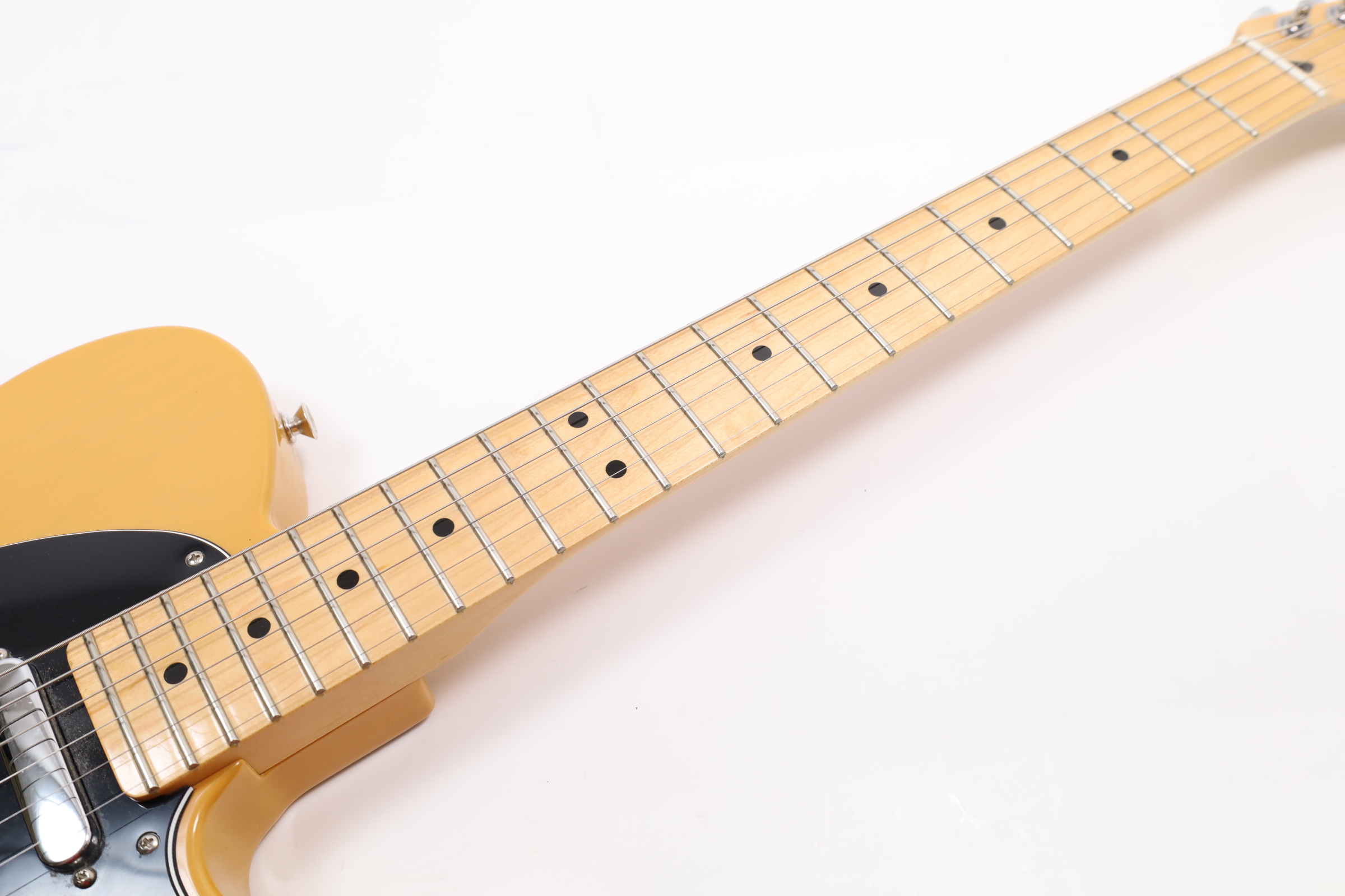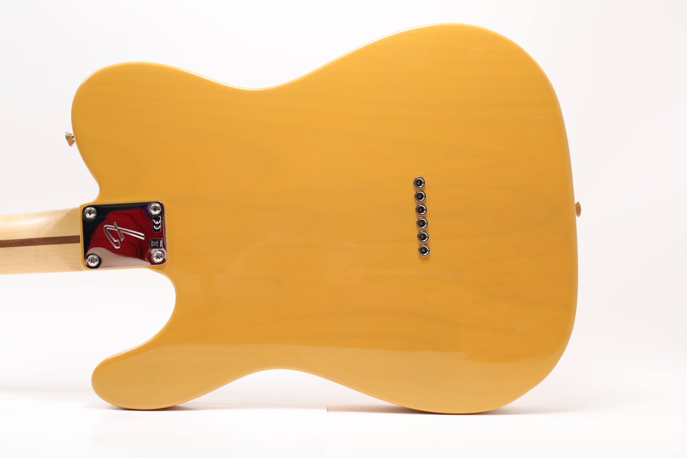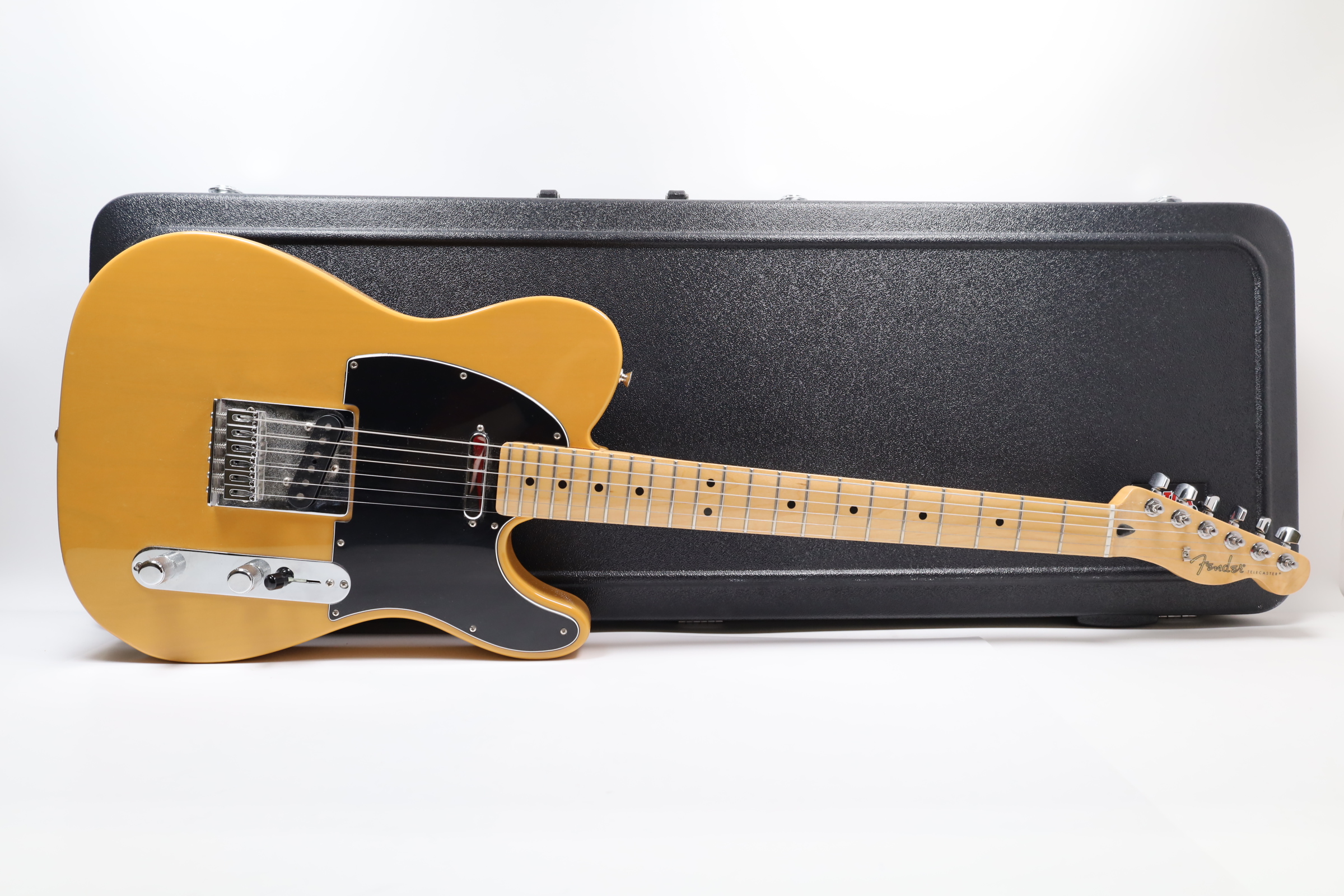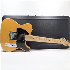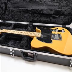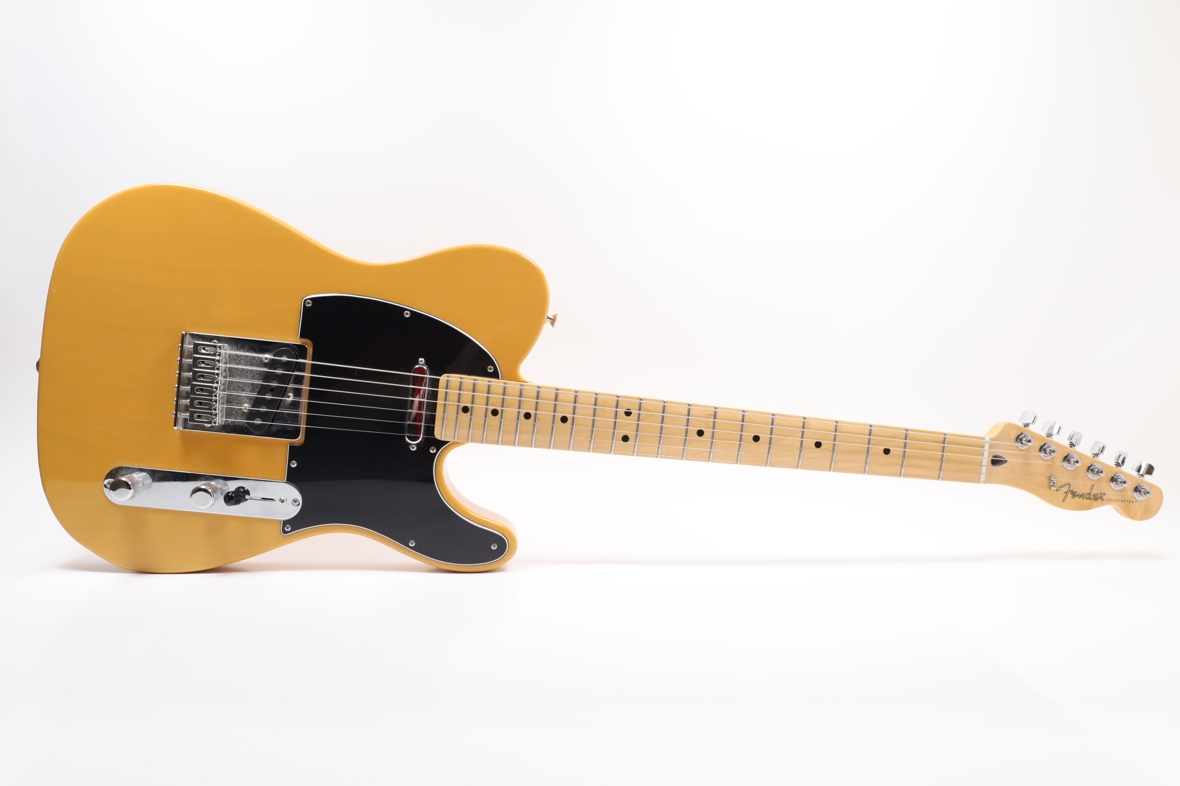 A bold and innovative guitar that embodies the essence of the Fender brand. With a body made of Alder and finished in Gloss Polyester, it sports the classic Telecaster shape. The bridge is a 6-Saddle String-Through-Body Tele with Block Steel Saddles, and it features Player Series Alnico 5 Tele Single-Coil pickups. The guitar's color is Butterscotch Blonde, and it has a Maple fingerboard with a 9.5" radius and Medium Jumbo frets. The hardware is finished in Nickel/Chrome, and the neck is constructed with a 4-Bolt Standard connection, featuring a Satin Urethane finish on the back and Gloss Urethane on the front. The neck shape is a modern "C," and it has 22 frets with a synthetic bone nut. The guitar is right-handed and comes with a 3-Ply Parchment pickguard. The pickup configuration is SS, with a 3-Position Blade switch for pickup selection. The scale length is 25.5", and it's part of the Player series. This rugged and versatile instrument is designed to handle a wide range of musical styles and is durable enough for any gig, making it a reliable choice for musicians.