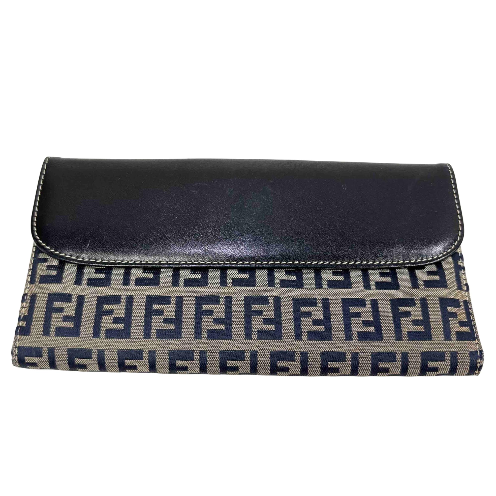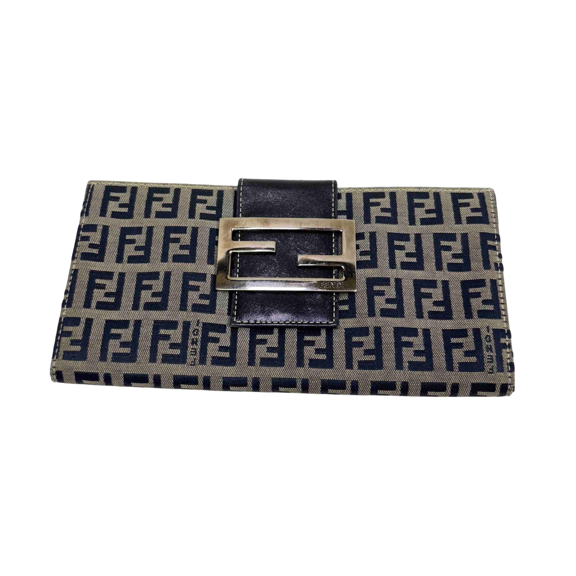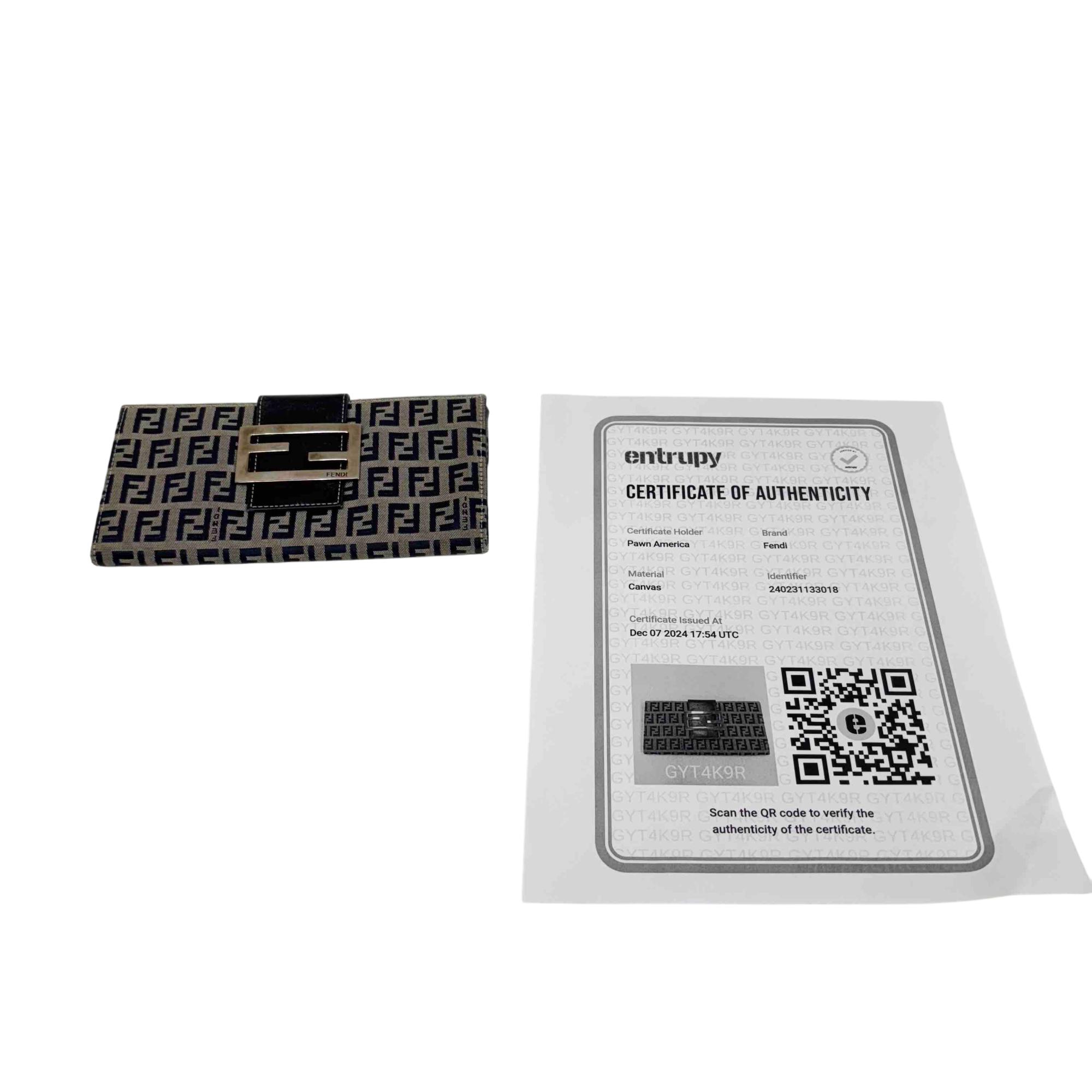 Elevate your style with this luxurious Fendi Canvas Long Wallet, featuring a sophisticated black leather design adorned with the iconic Fendi logo pattern. Its sleek silhouette offers practicality with ample storage for your essentials, making it a perfect blend of elegance and functionality. Complete with a Certificate of Authenticity, this wallet is a must-have for any fashion connoisseur.