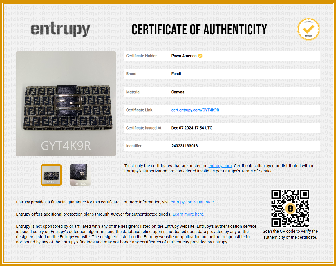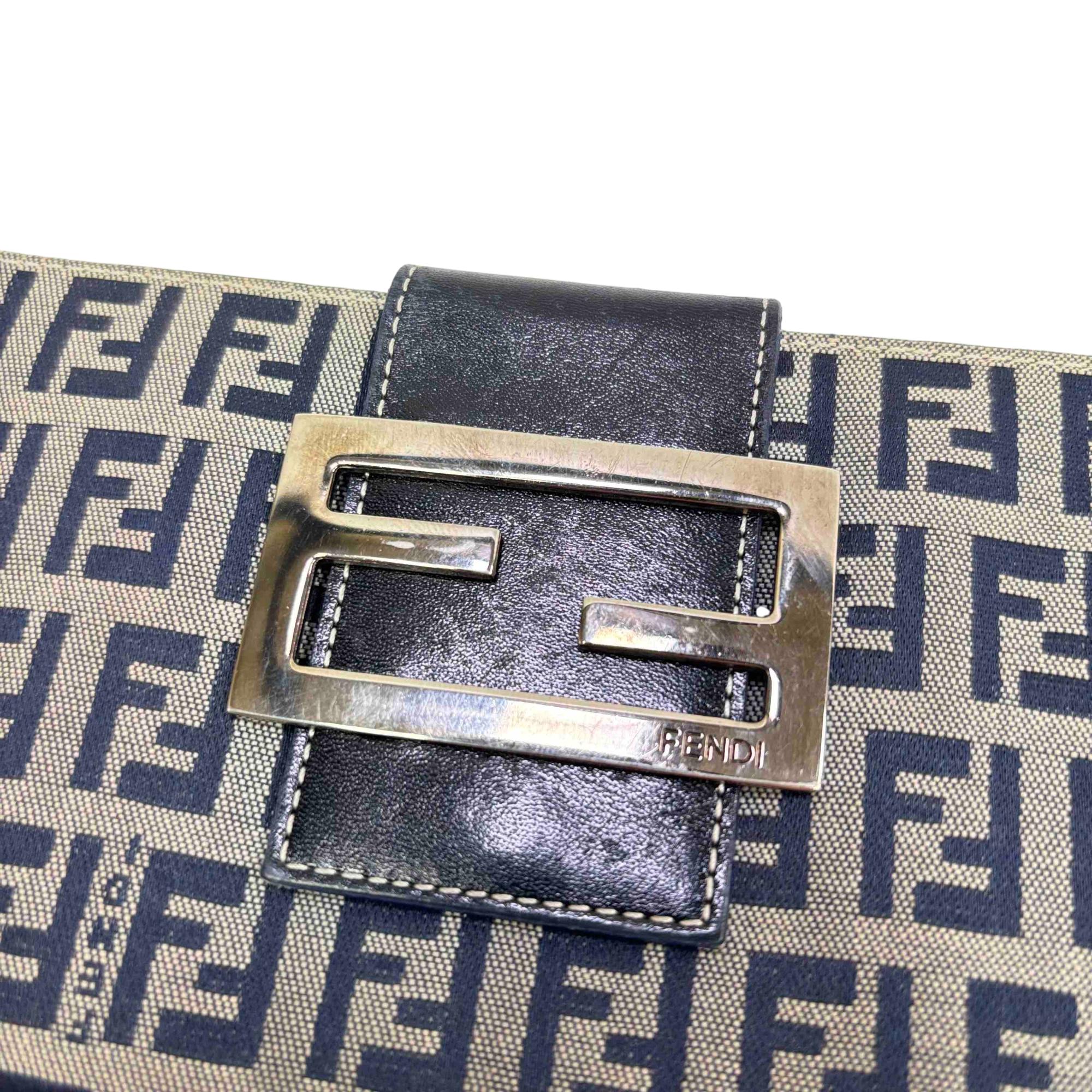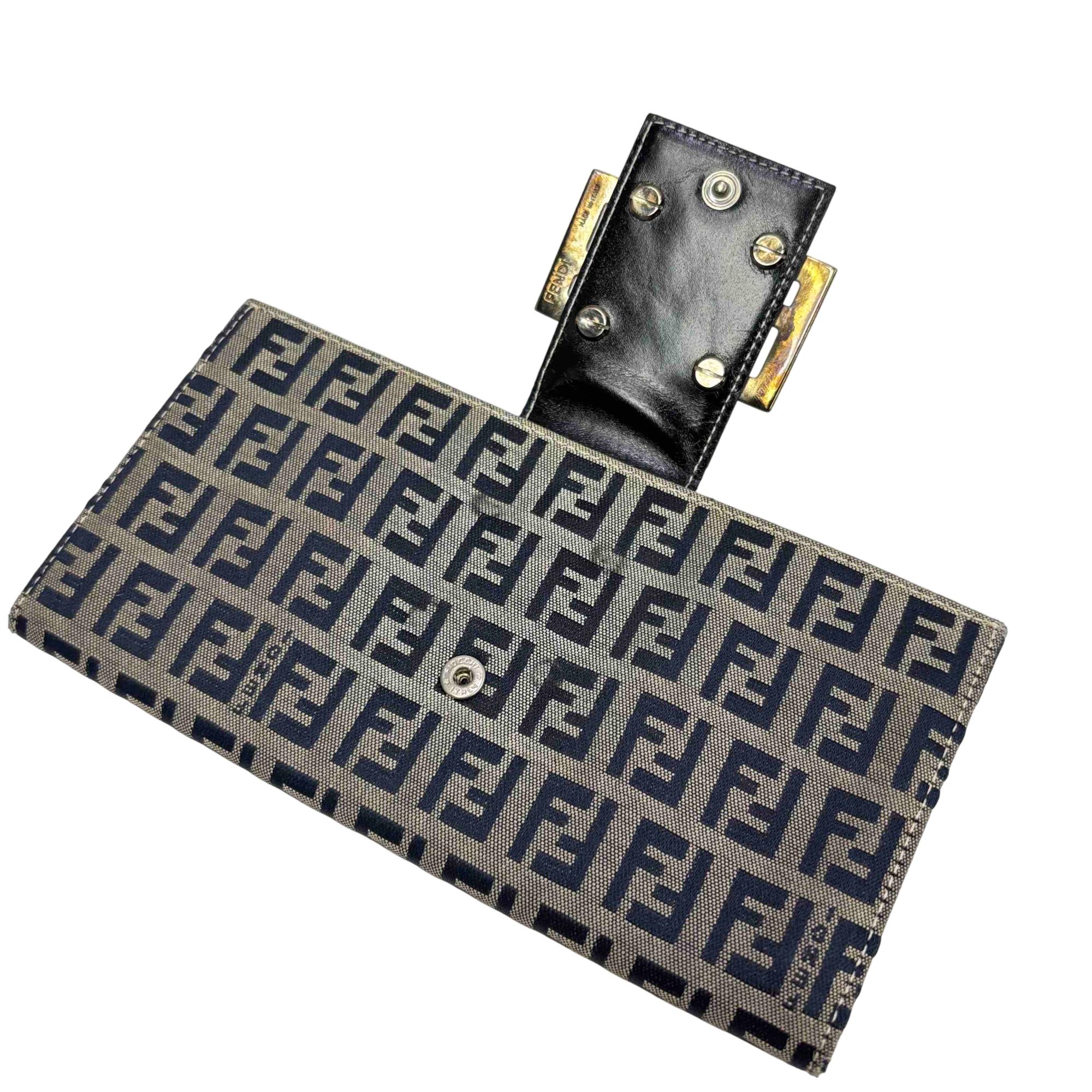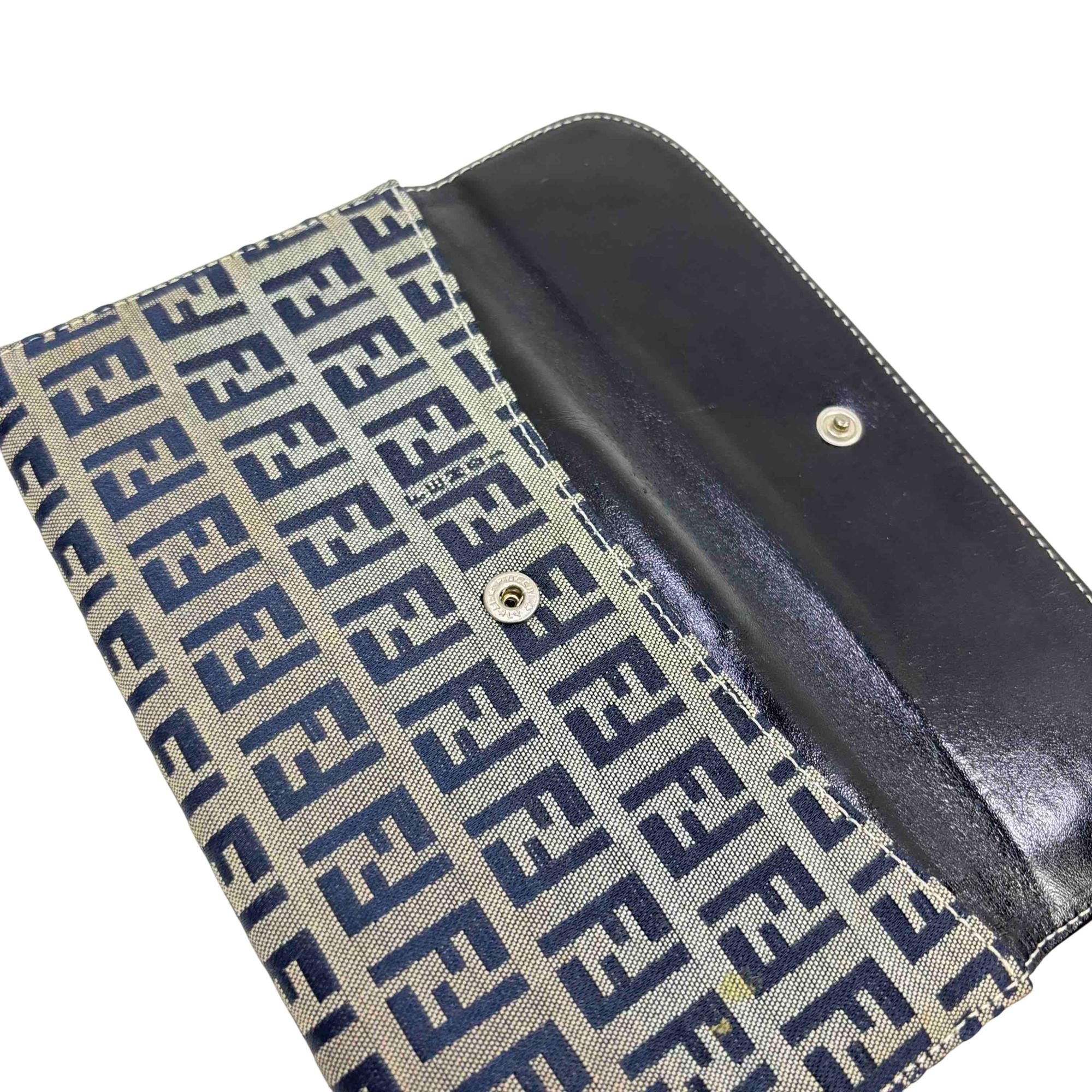Elevate your style with this luxurious Fendi Canvas Long Wallet, featuring a sophisticated black leather design adorned with the iconic Fendi logo pattern. Its sleek silhouette offers practicality with ample storage for your essentials, making it a perfect blend of elegance and functionality. Complete with a Certificate of Authenticity, this wallet is a must-have for any fashion connoisseur.