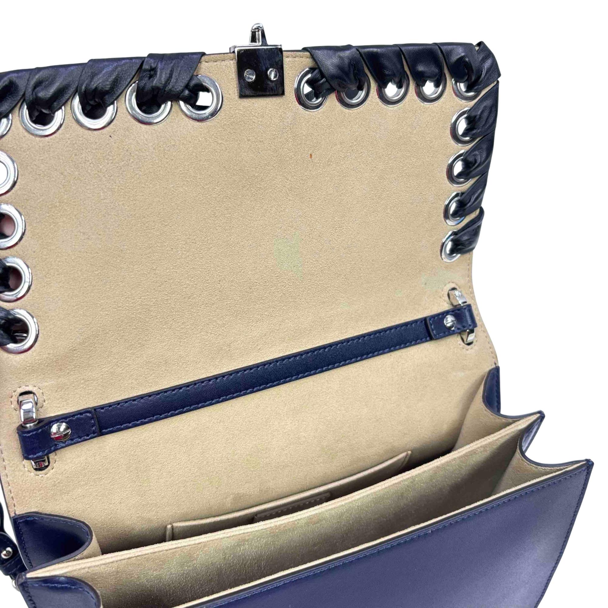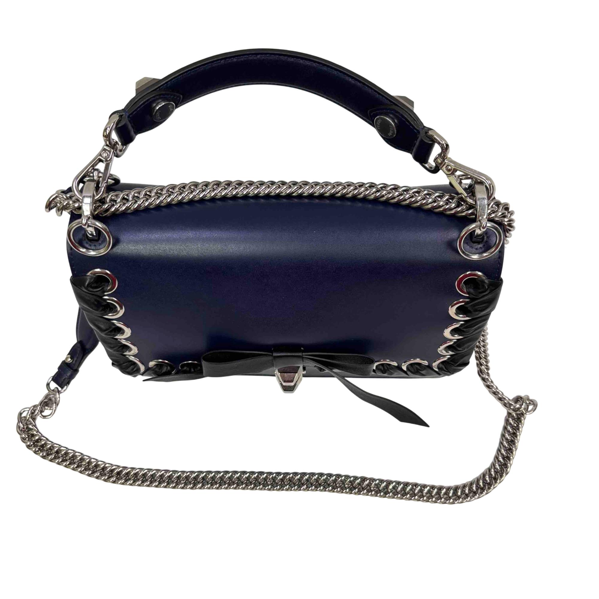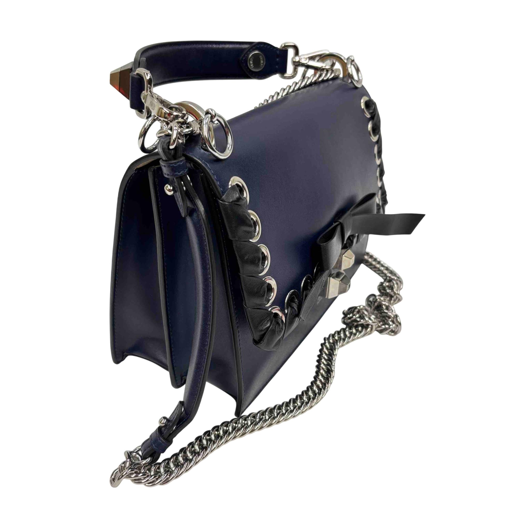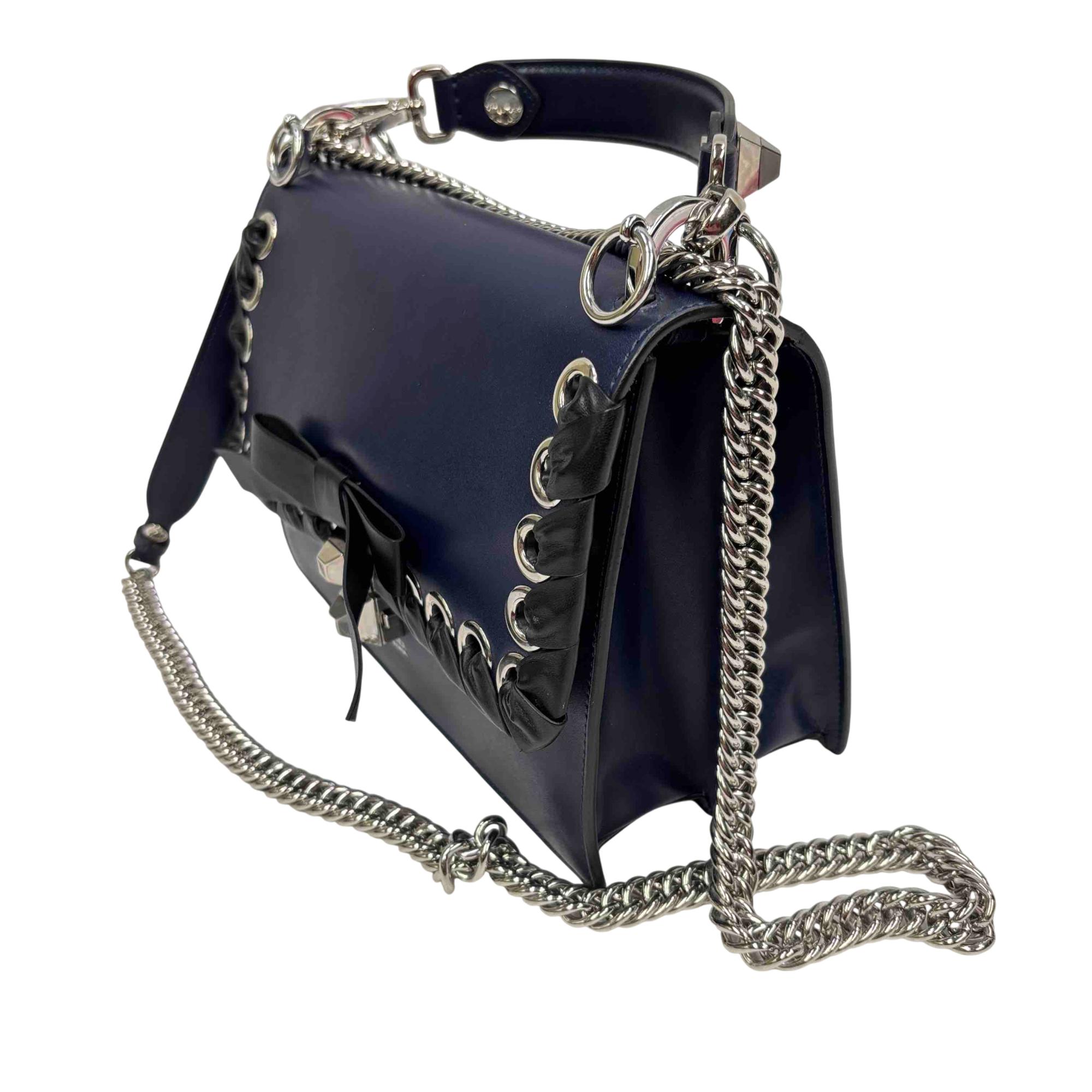 Elevate your style with the Fendi Kan I shoulder bag, crafted from luxurious navy blue leather and adorned with bold silver eyelets, black leather lacing, and a distinctive black bow. Featuring a structured rectangular silhouette, polished metal clasp, and double compartments, this designer piece combines sophistication with a modern edge. The chunky silver chain strap and metallic hardware make it the ultimate statement accessory for any fashion-forward wardrobe.