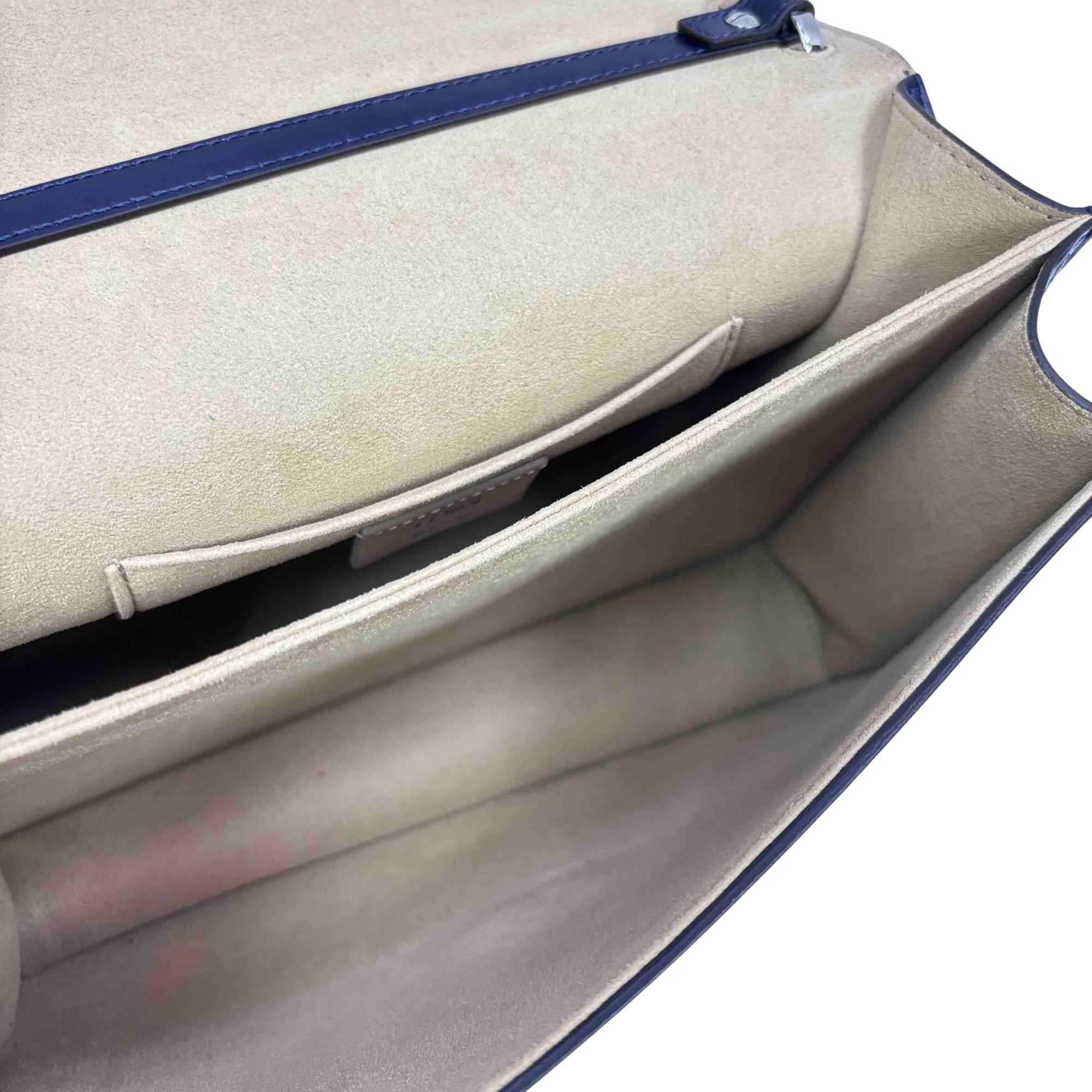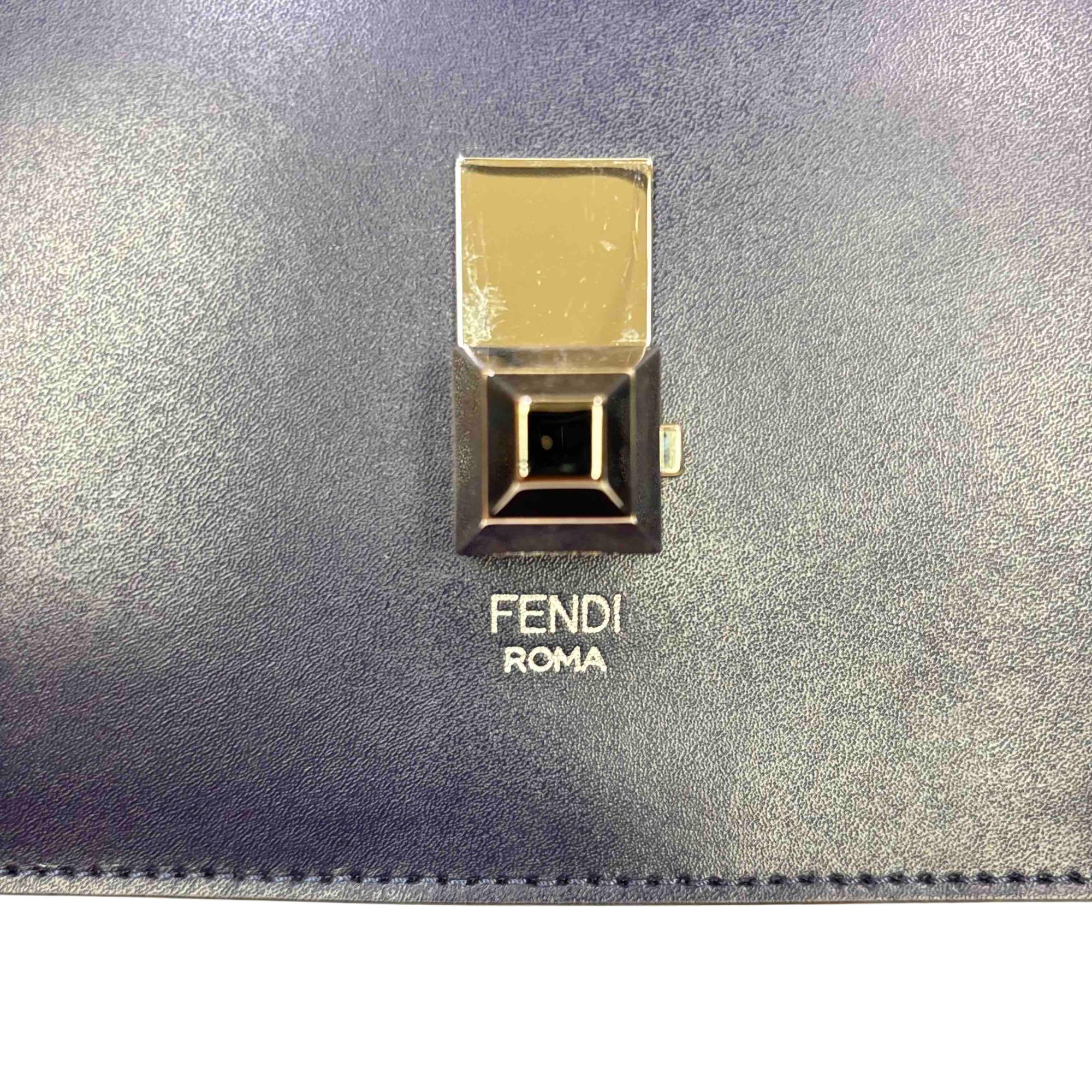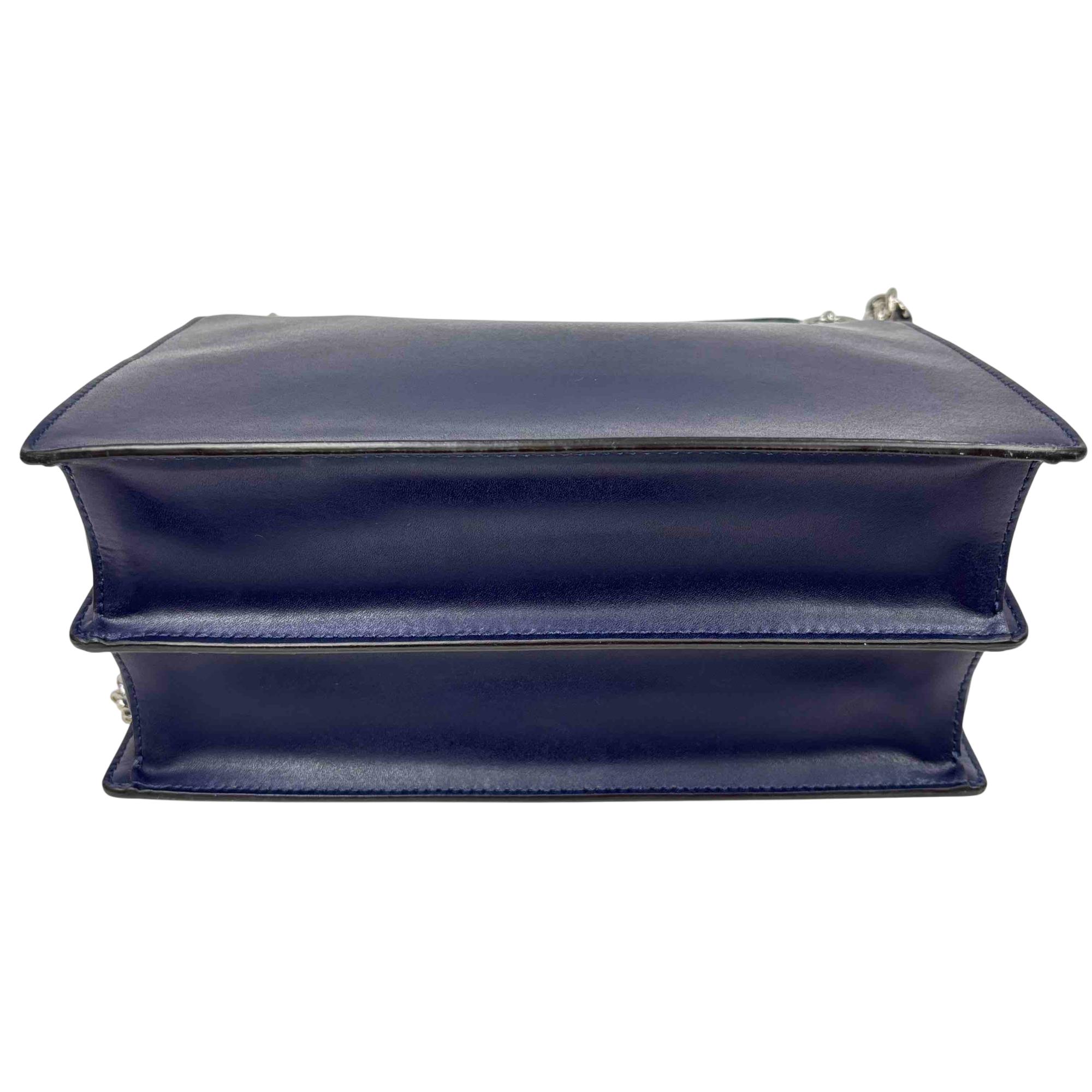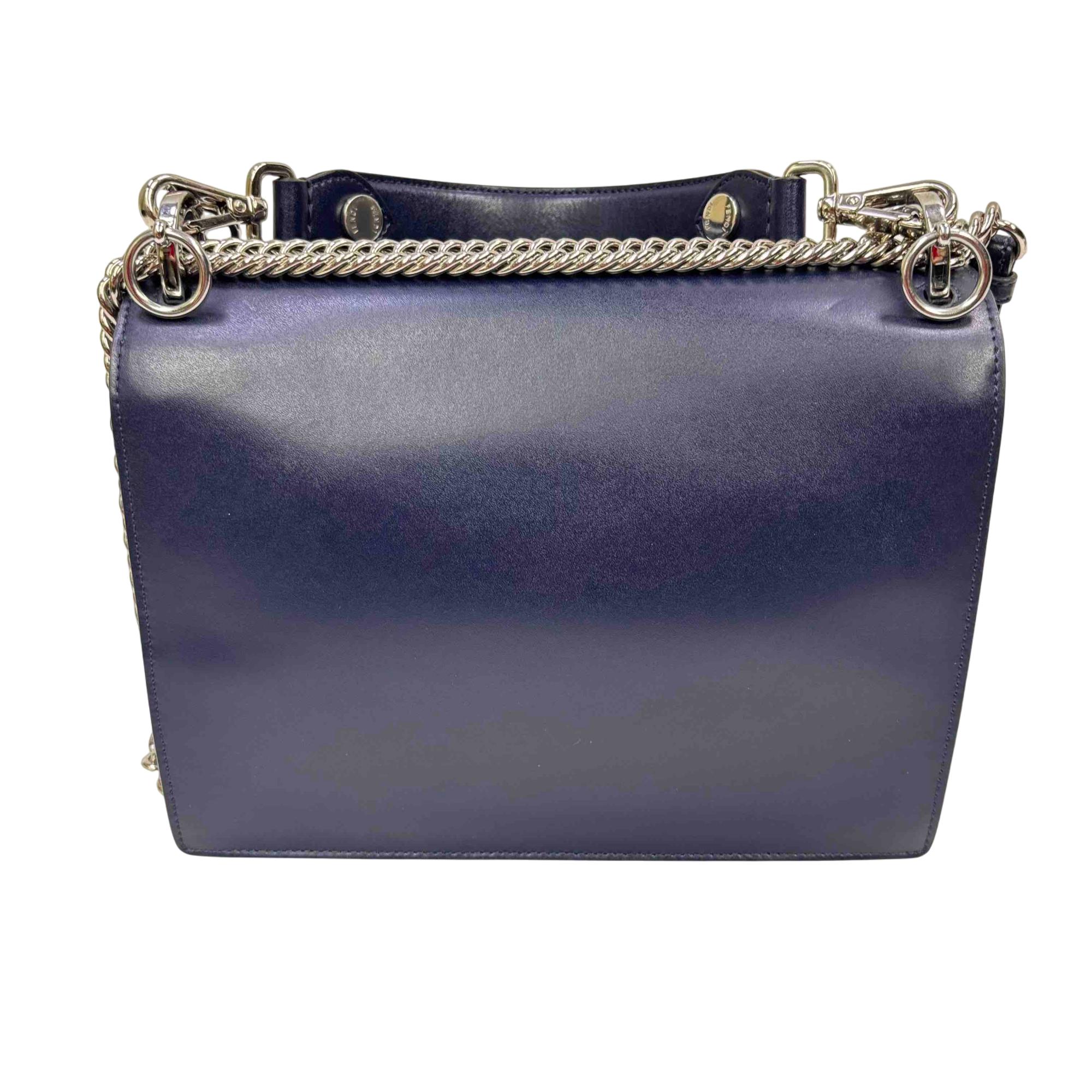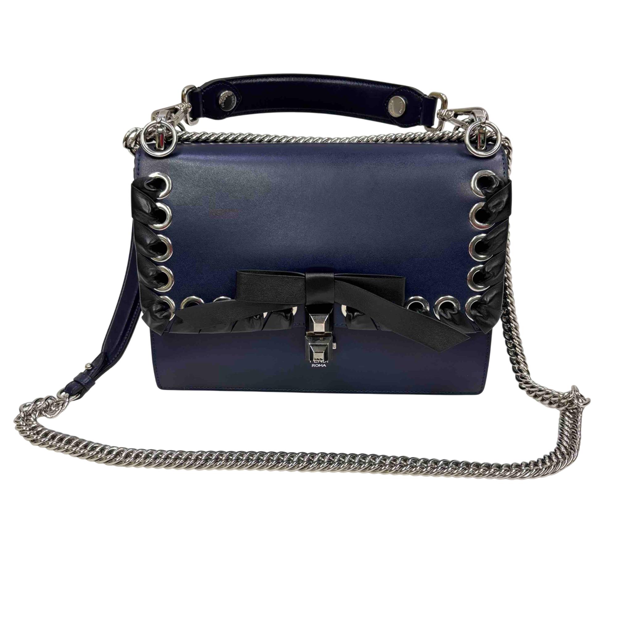 Elevate your style with the Fendi Kan I shoulder bag, crafted from luxurious navy blue leather and adorned with bold silver eyelets, black leather lacing, and a distinctive black bow. Featuring a structured rectangular silhouette, polished metal clasp, and double compartments, this designer piece combines sophistication with a modern edge. The chunky silver chain strap and metallic hardware make it the ultimate statement accessory for any fashion-forward wardrobe.