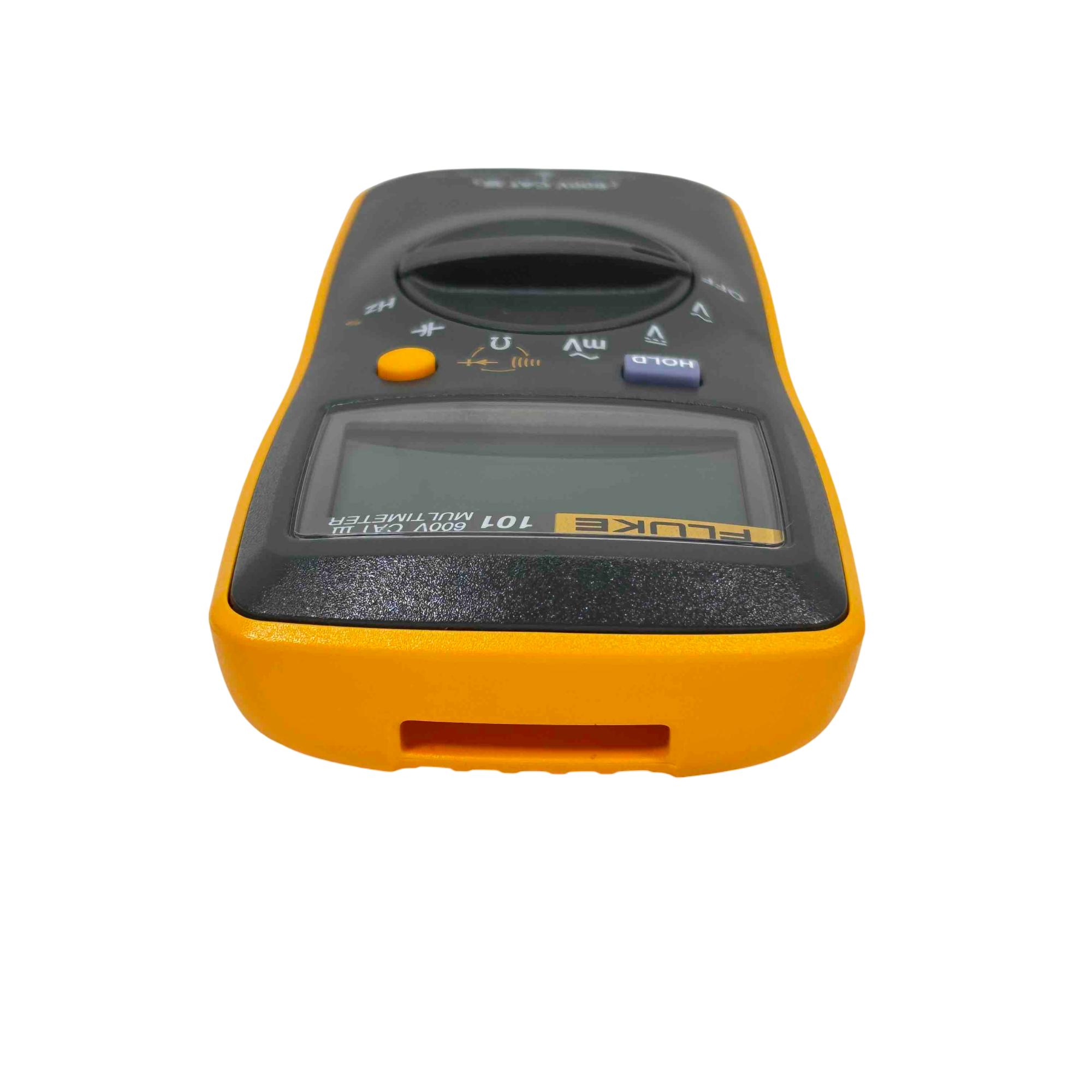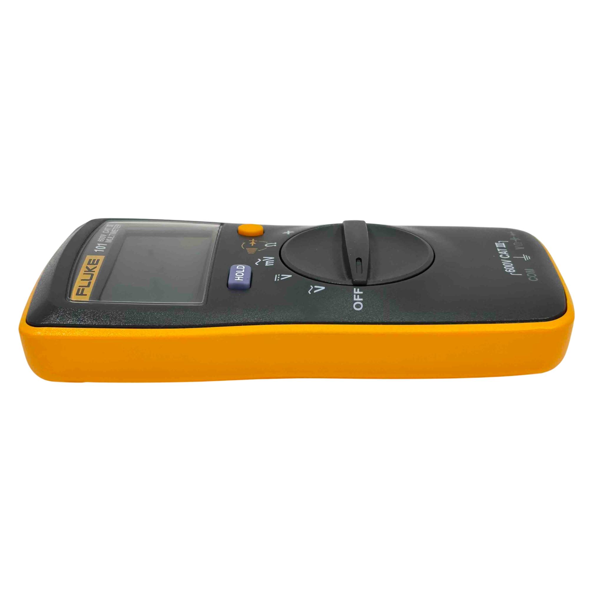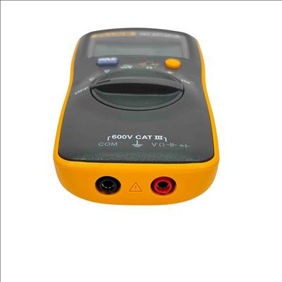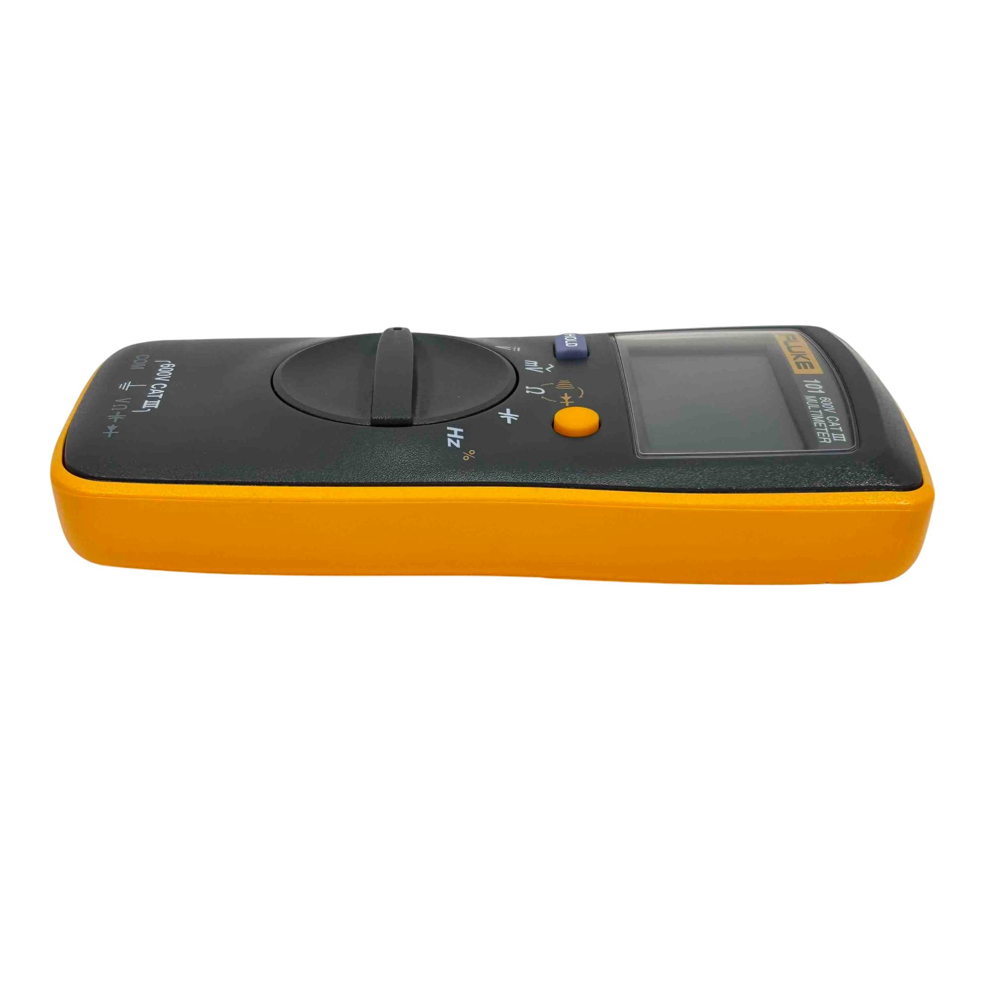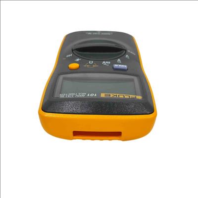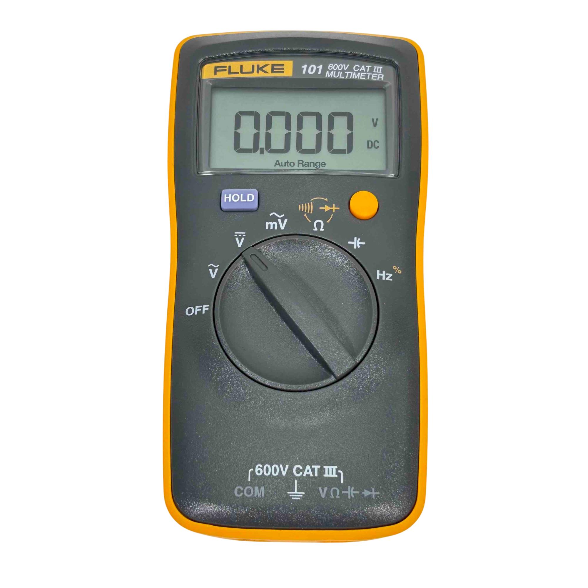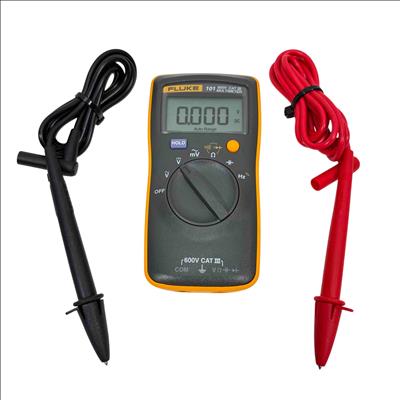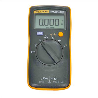 The Fluke 101 Digital Multimeter, 600V CAT III, is a compact, handheld device designed for precise electrical measurements. It features a clear digital display with auto-ranging capability to accurately measure voltage, current, and resistance in various electronic and electrical applications. Its durable yellow and black casing ensures reliable performance in demanding environments, making it ideal for technicians and electricians.