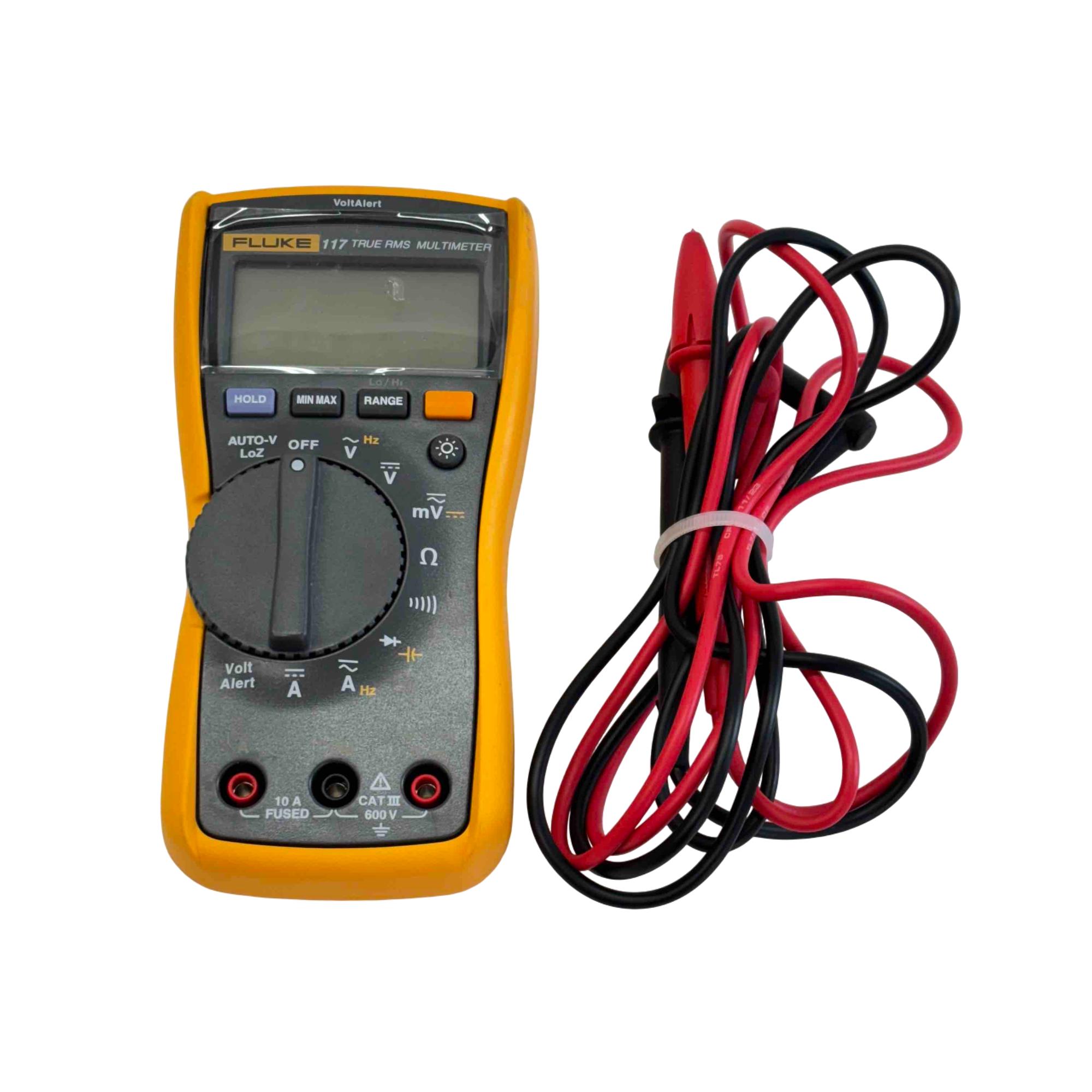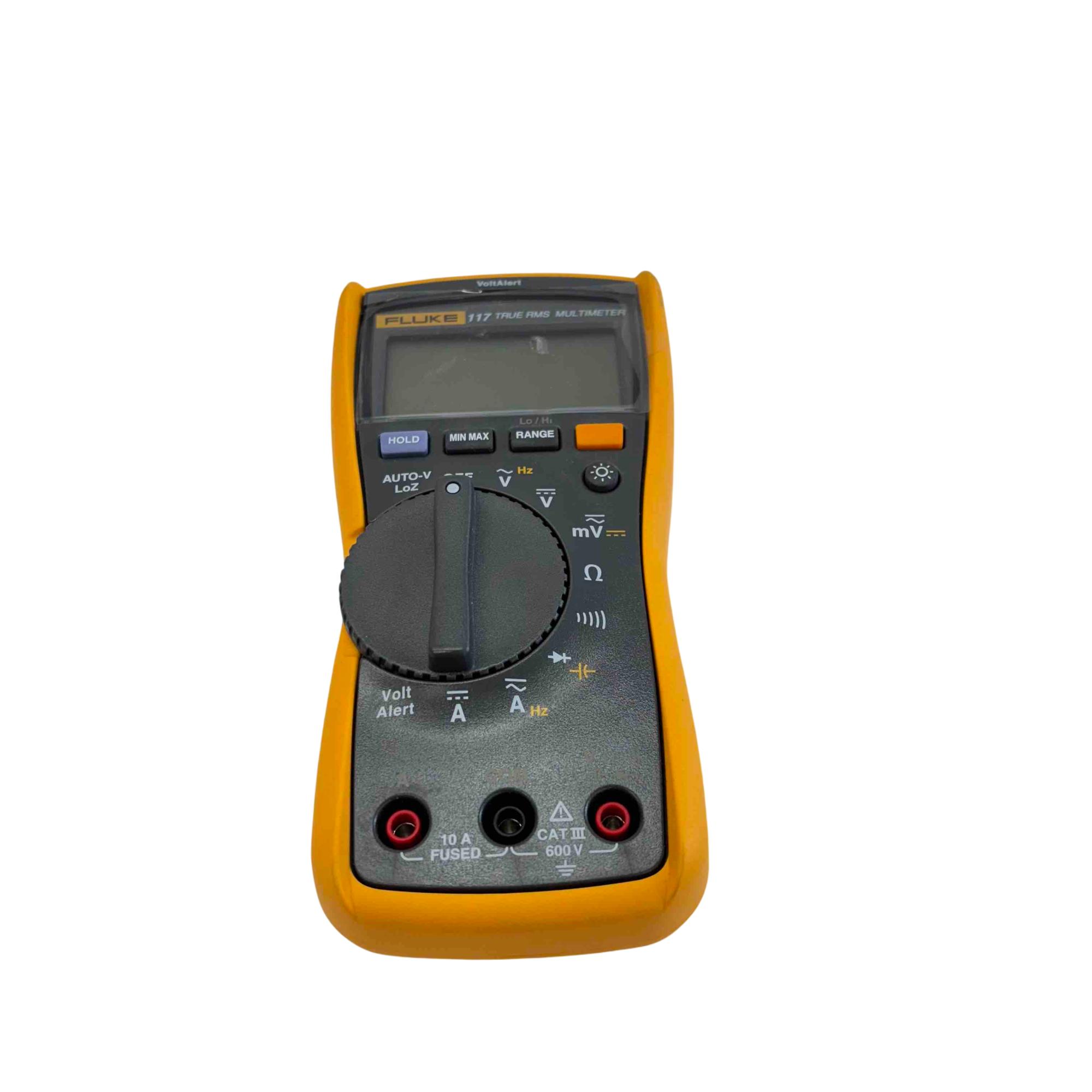Introducing the Fluke 117 True RMS Multimeter, a reliable and high-precision tool perfect for both professionals and DIY enthusiasts. This robust multimeter comes equipped with VoltAlert technology for non-contact voltage detection and a LoZ function to prevent false readings caused by ghost voltage. Its ergonomic design and vibrant yellow finish make it easy to handle and identify among your tools.