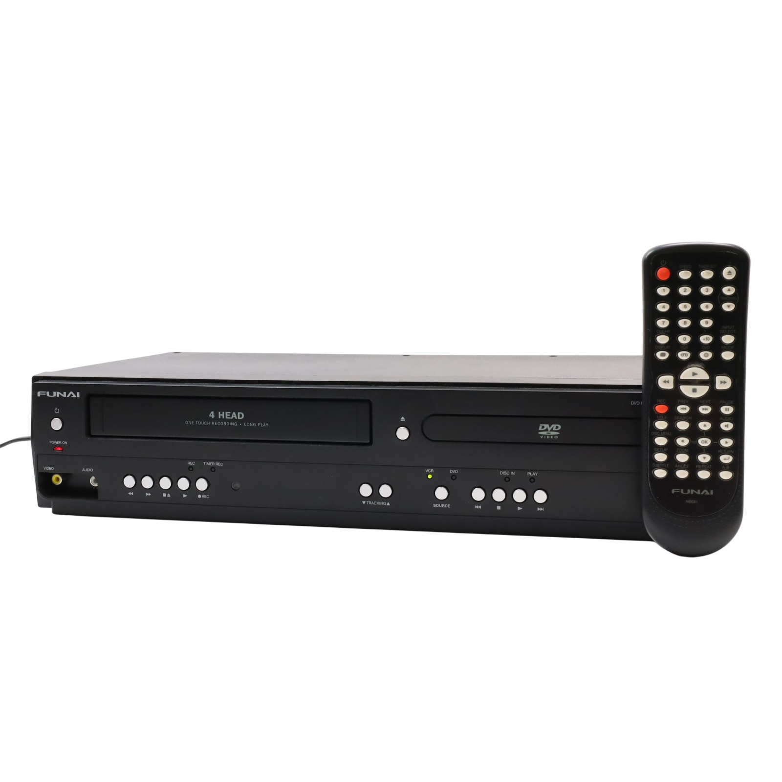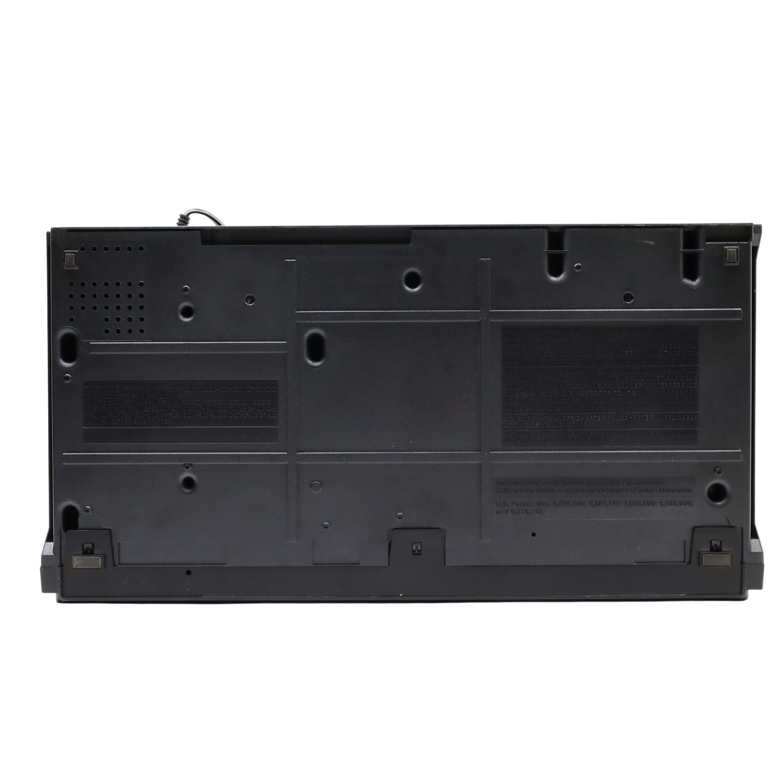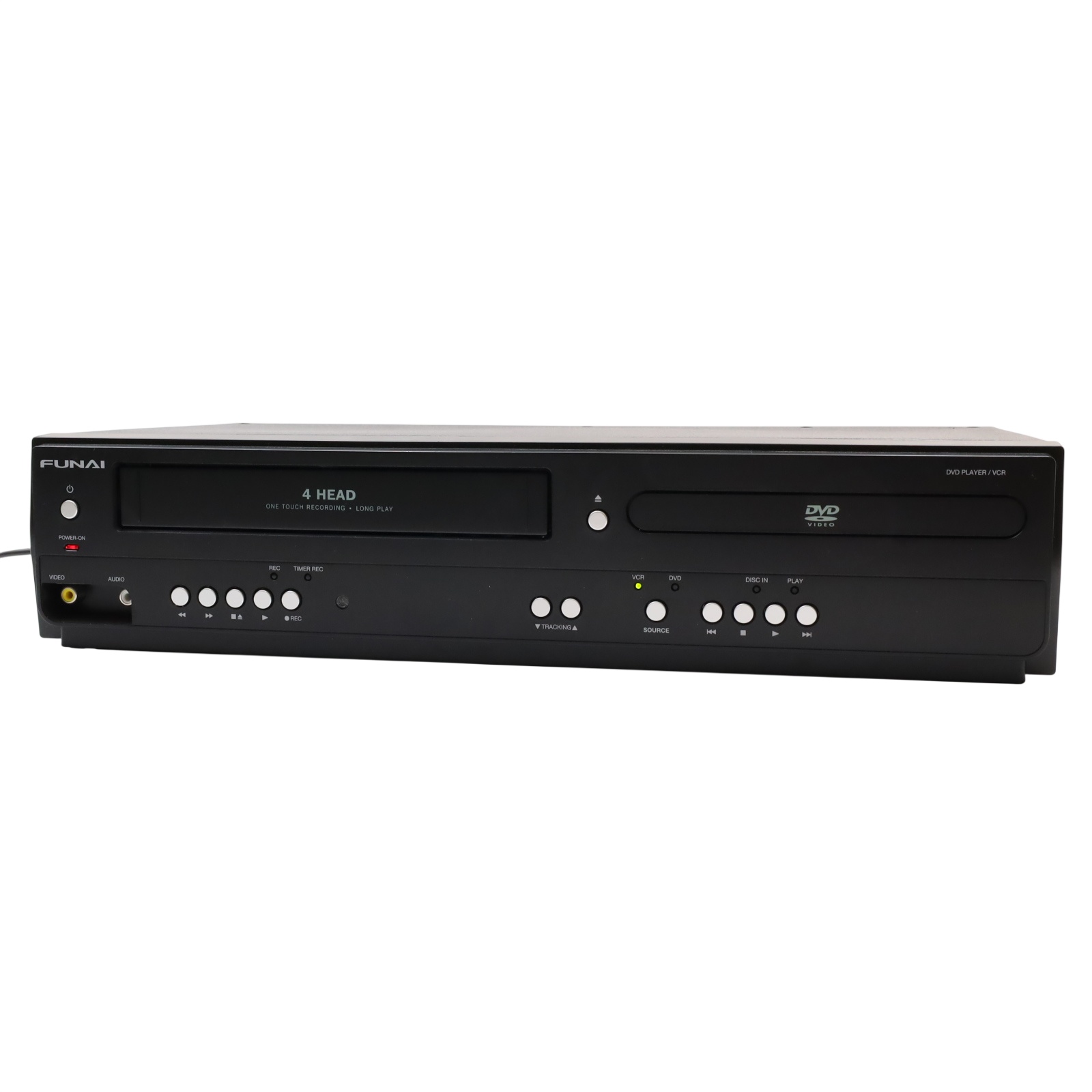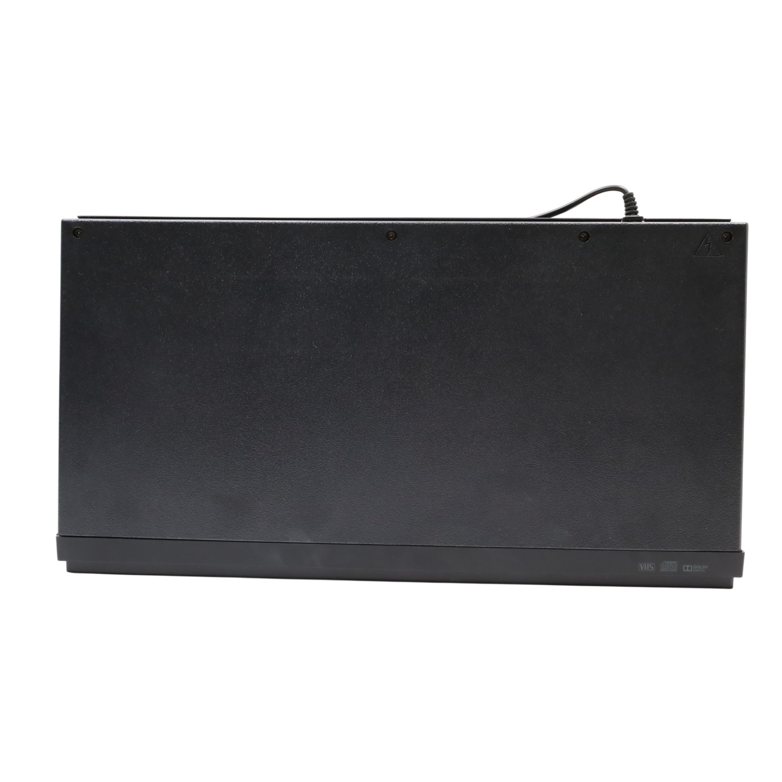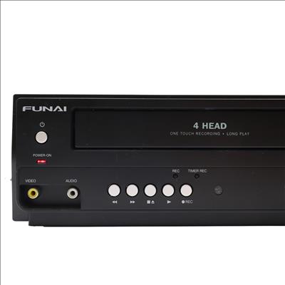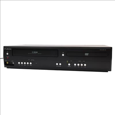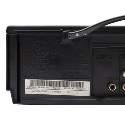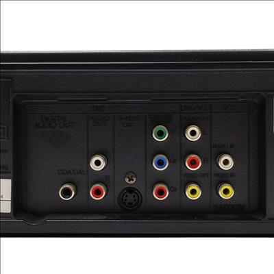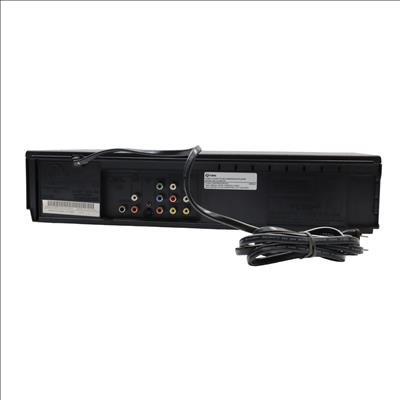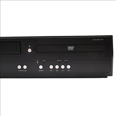 A combined VHS and DVD playback device featuring a rotary four-head VCR mechanism for tape playback alongside DVD and CD support. It handles MP3, Dolby Digital, and PCM audio formats and includes a trilingual on-screen display in English, Spanish, and French. Video output is provided through S-Video and progressive scan connections, while Dolby Digital audio can be streamed to compatible external systems. The unit supports line-in through line-out functionality when powered off and allows for line-in recording from external sources such as cable or satellite boxes. Playback controls include still frame and slow motion functions, and a parental lock feature is available for content restriction.