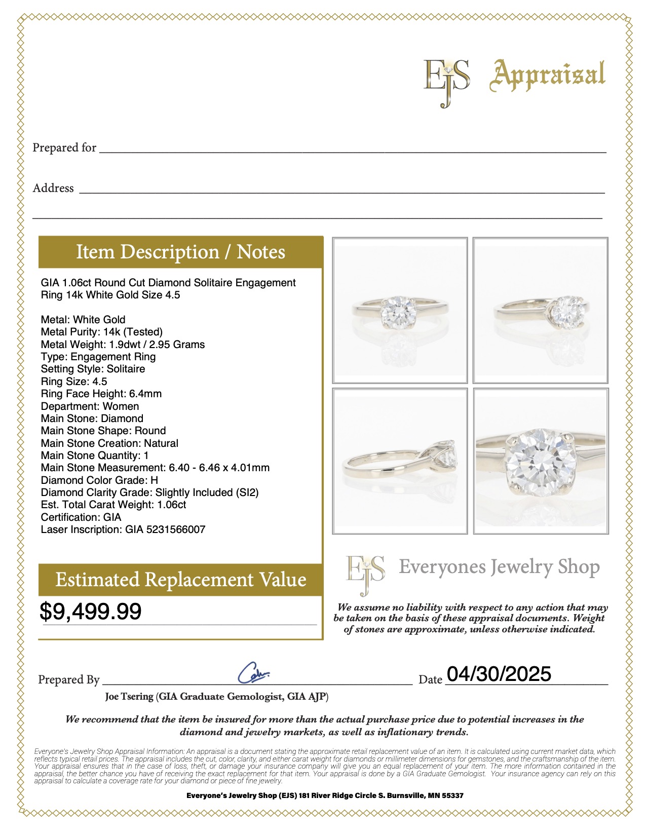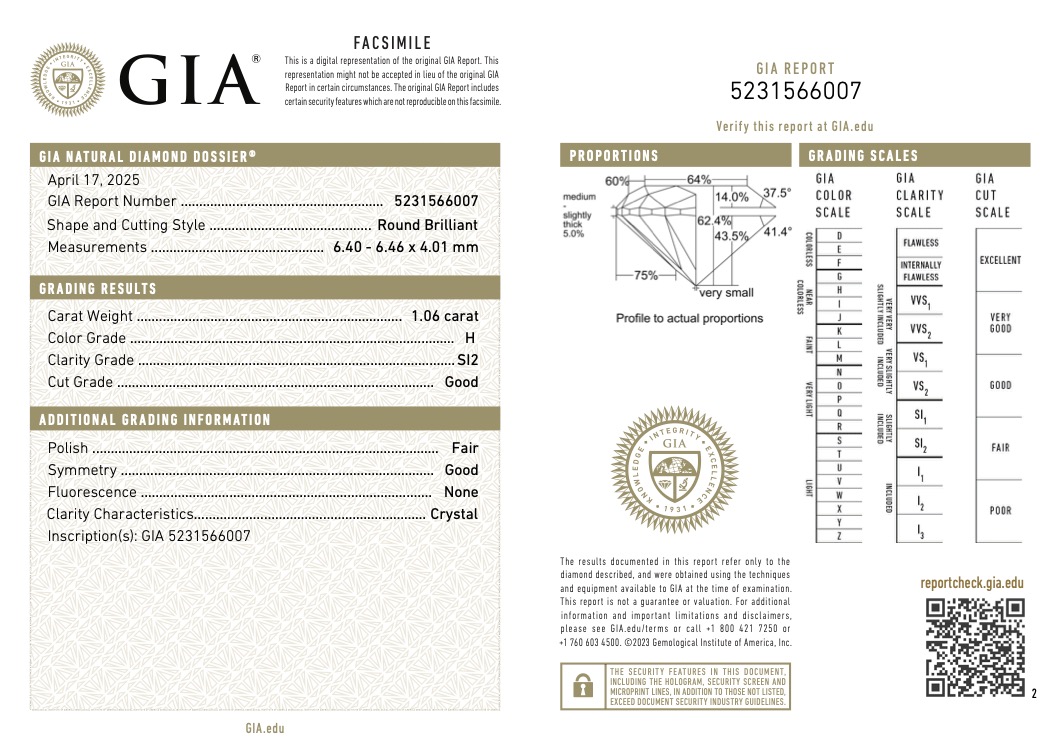 The primary diamond is laserscribed with GIA 5231566007 on the girdle.