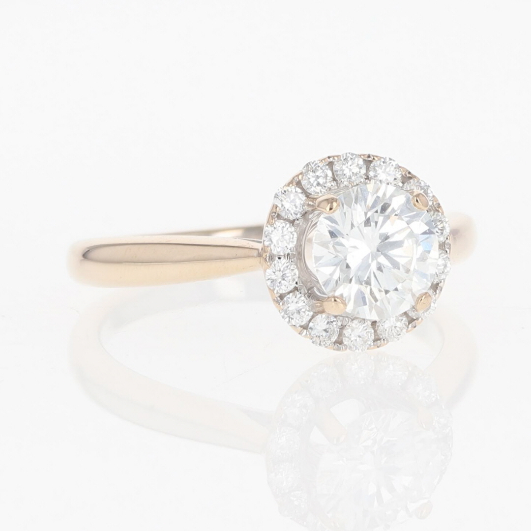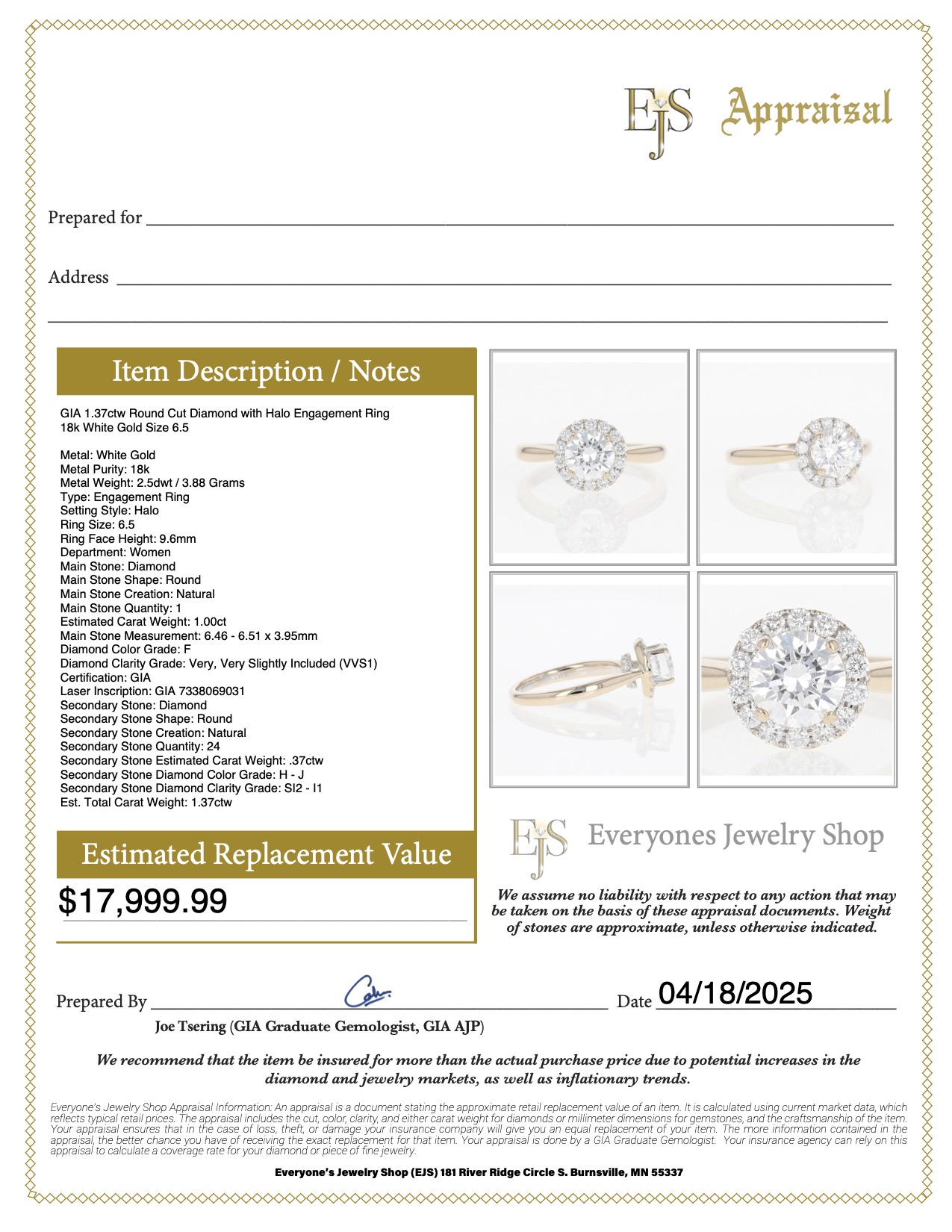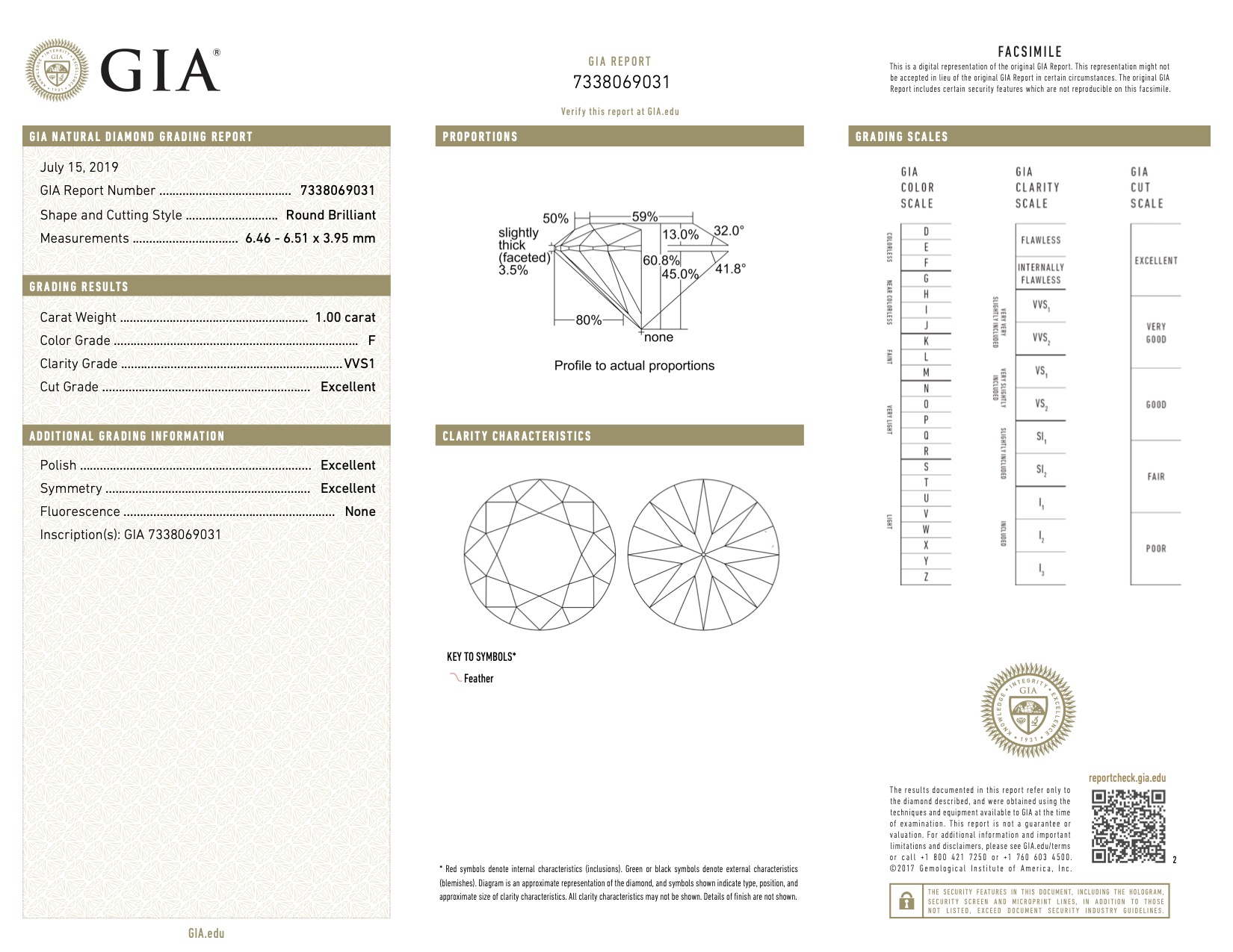 The primary diamond is laserscribed with GIA 7338069031 on the girdle.