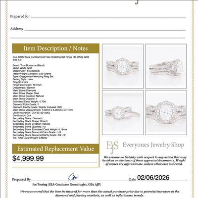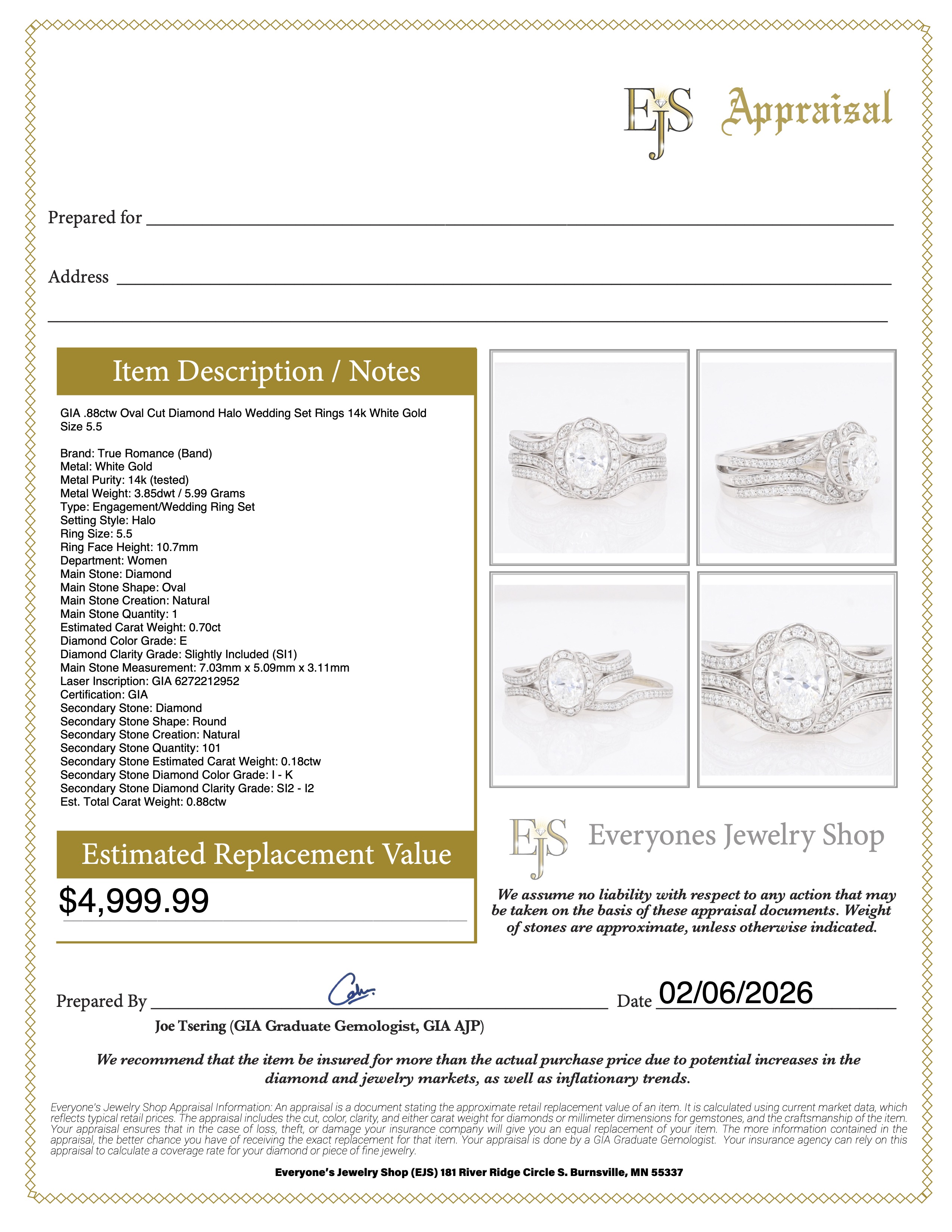 The primary diamond is laserscribed with GIA 6272212952 on the girdle.