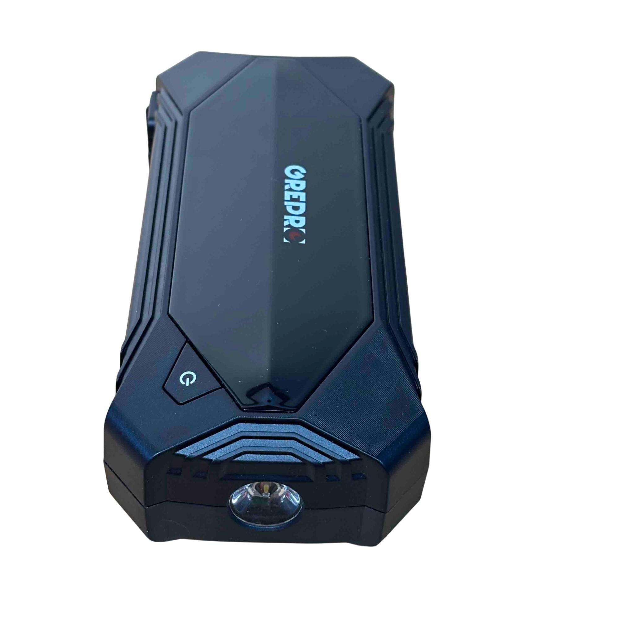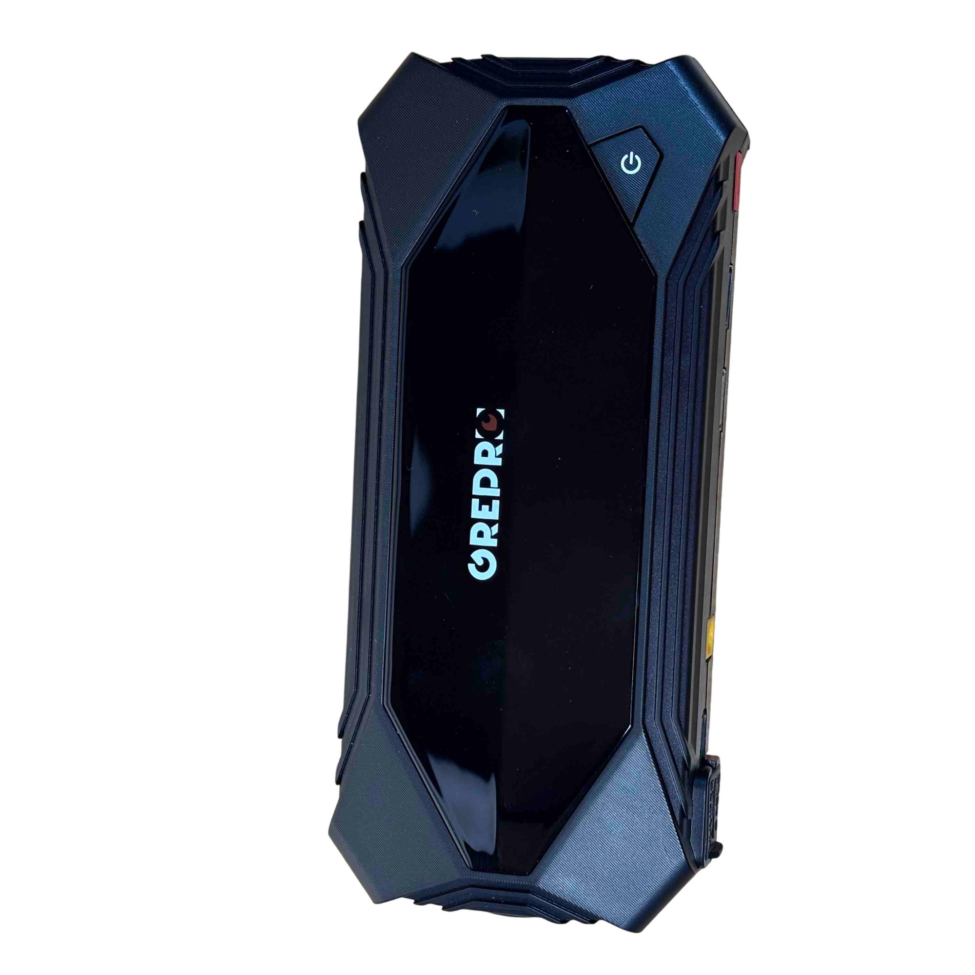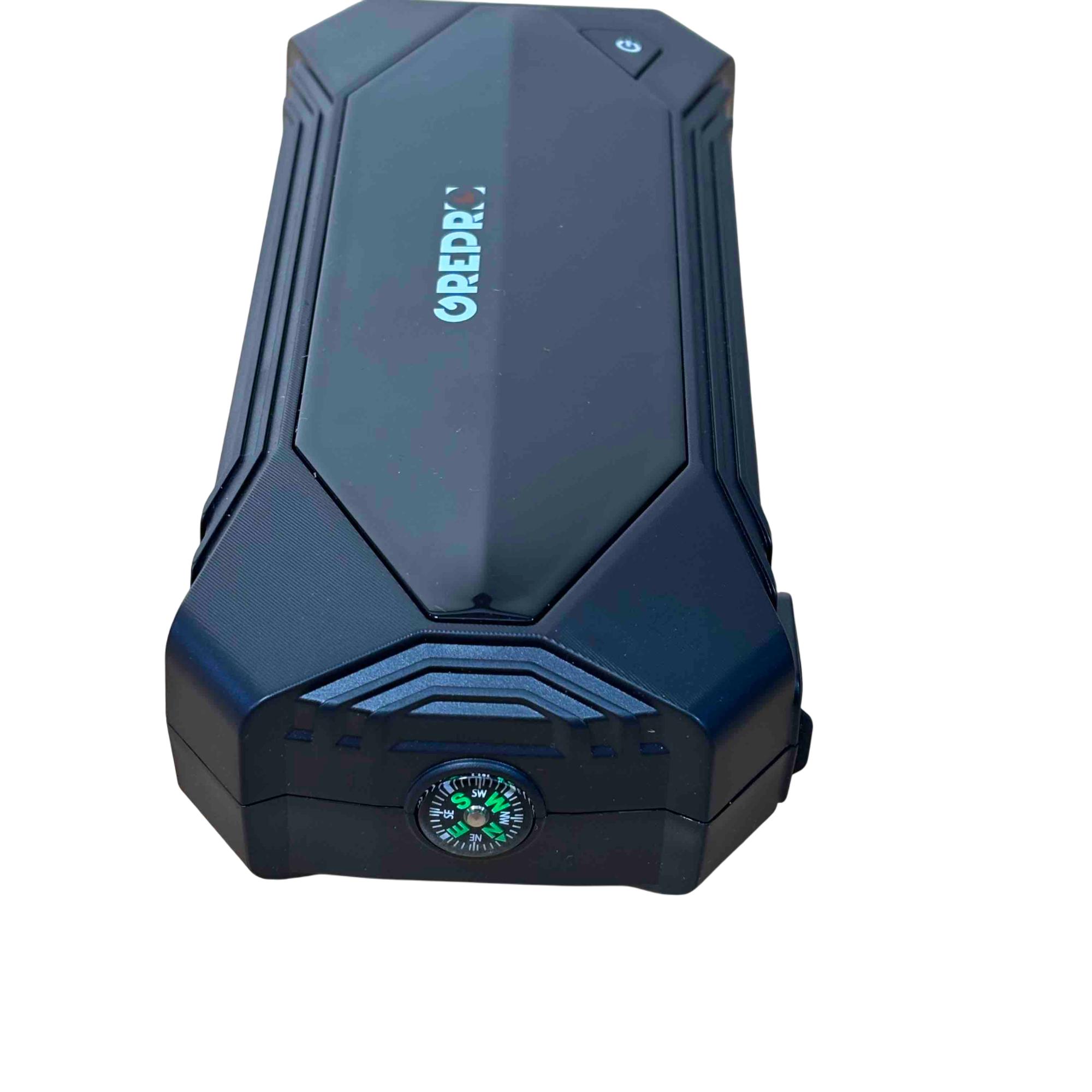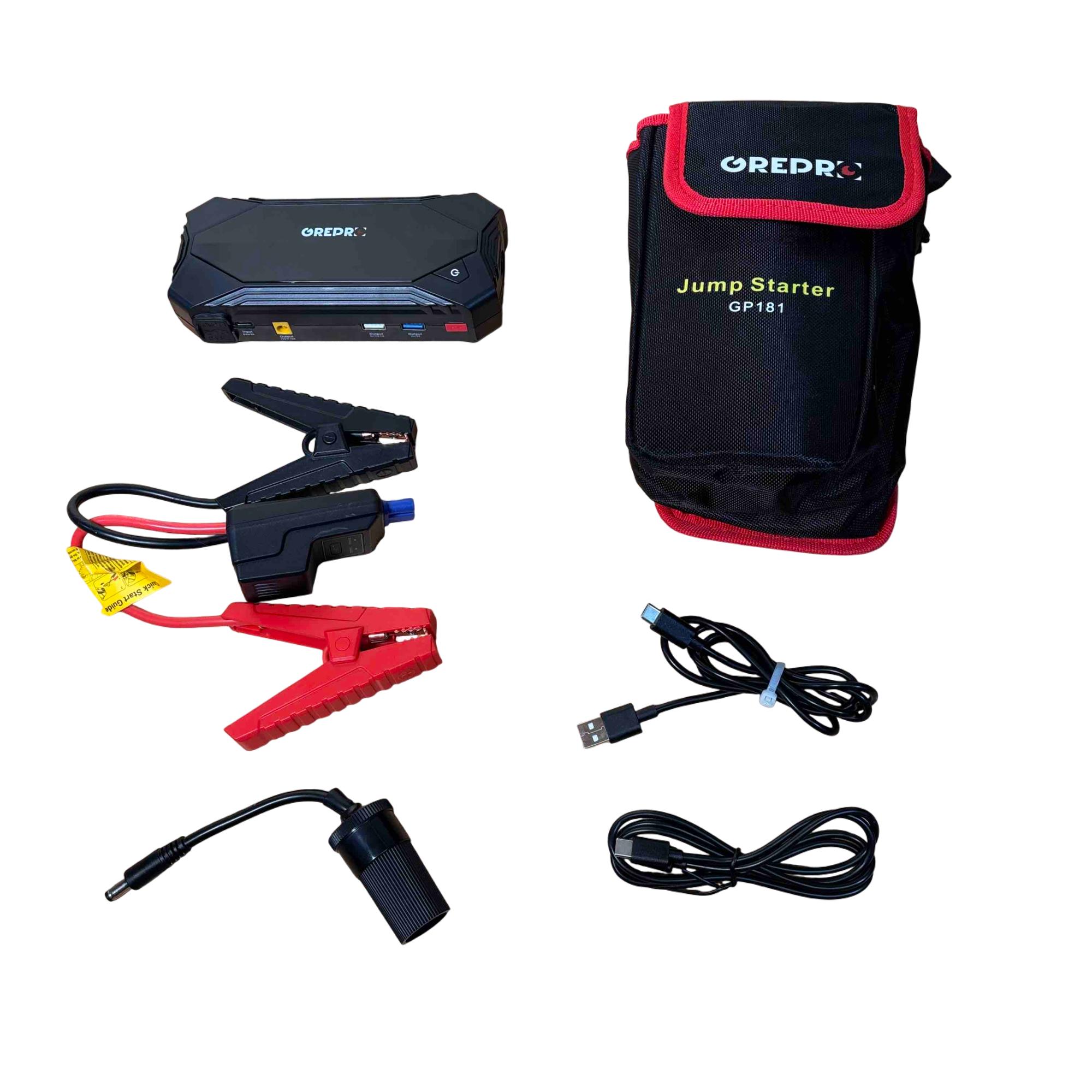 The OREPRO Jump Starter GP181 is a powerful and versatile device designed to jump-start your car with ease. With its robust battery, multiple USB ports for charging electronics, and built-in flashlight for convenience, this portable unit comes with jumper cables, a carrying case, and charging cords, making it perfect for emergency situations and everyday use. Its sleek, textured design and advanced safety features offer reliability and style on the go.
