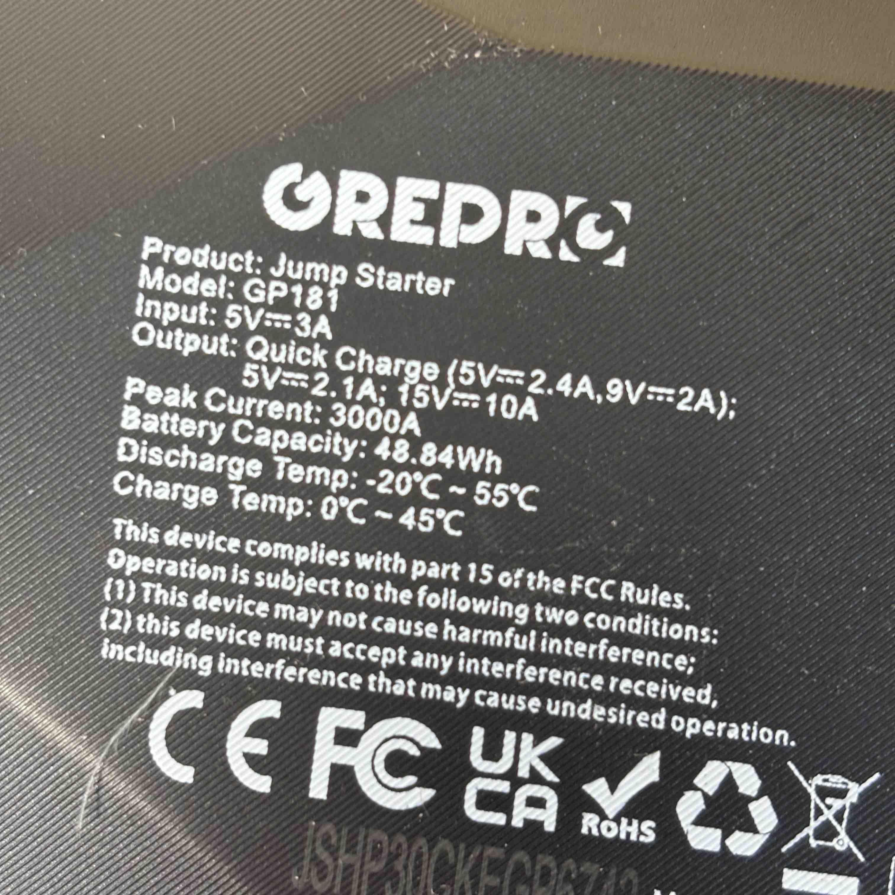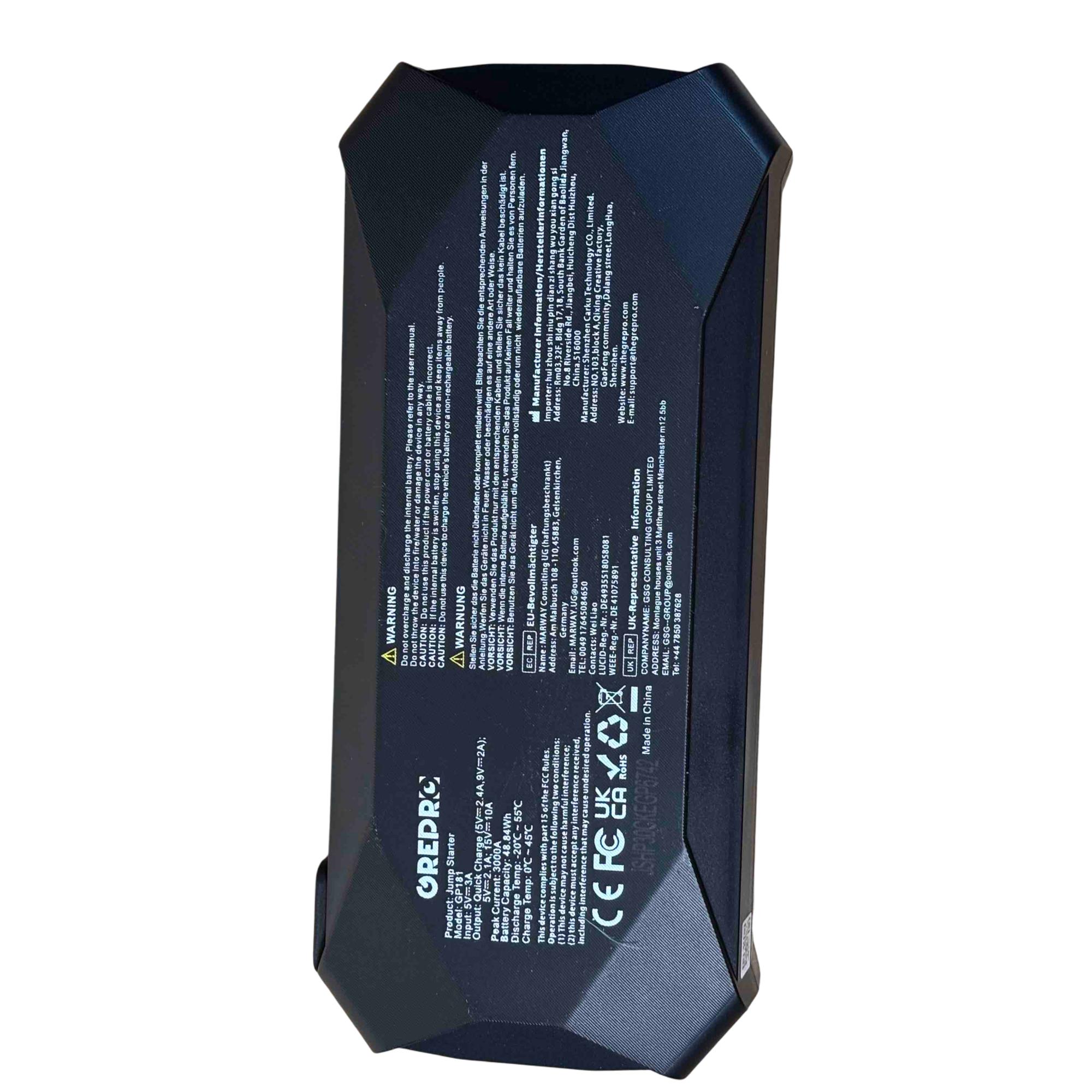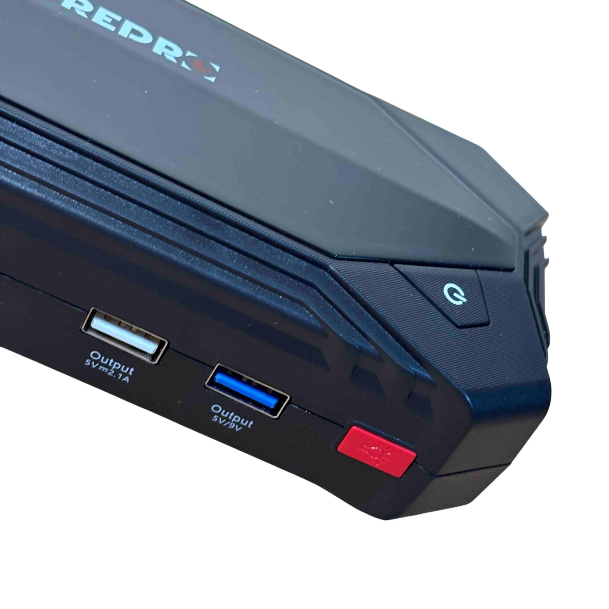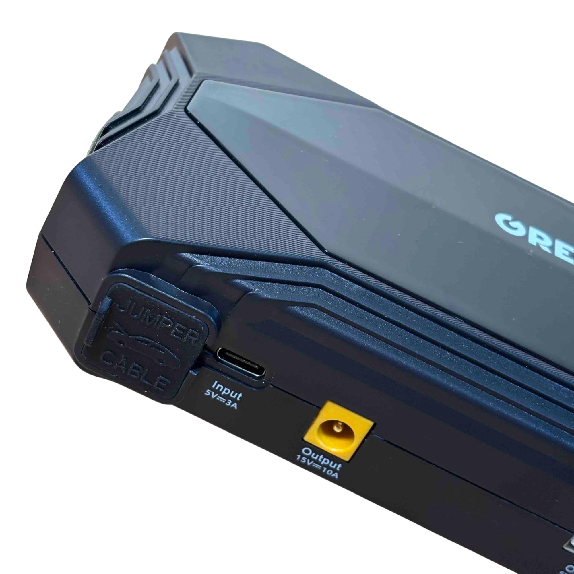 The OREPRO Jump Starter GP181 is a powerful and versatile device designed to jump-start your car with ease. With its robust battery, multiple USB ports for charging electronics, and built-in flashlight for convenience, this portable unit comes with jumper cables, a carrying case, and charging cords, making it perfect for emergency situations and everyday use. Its sleek, textured design and advanced safety features offer reliability and style on the go.