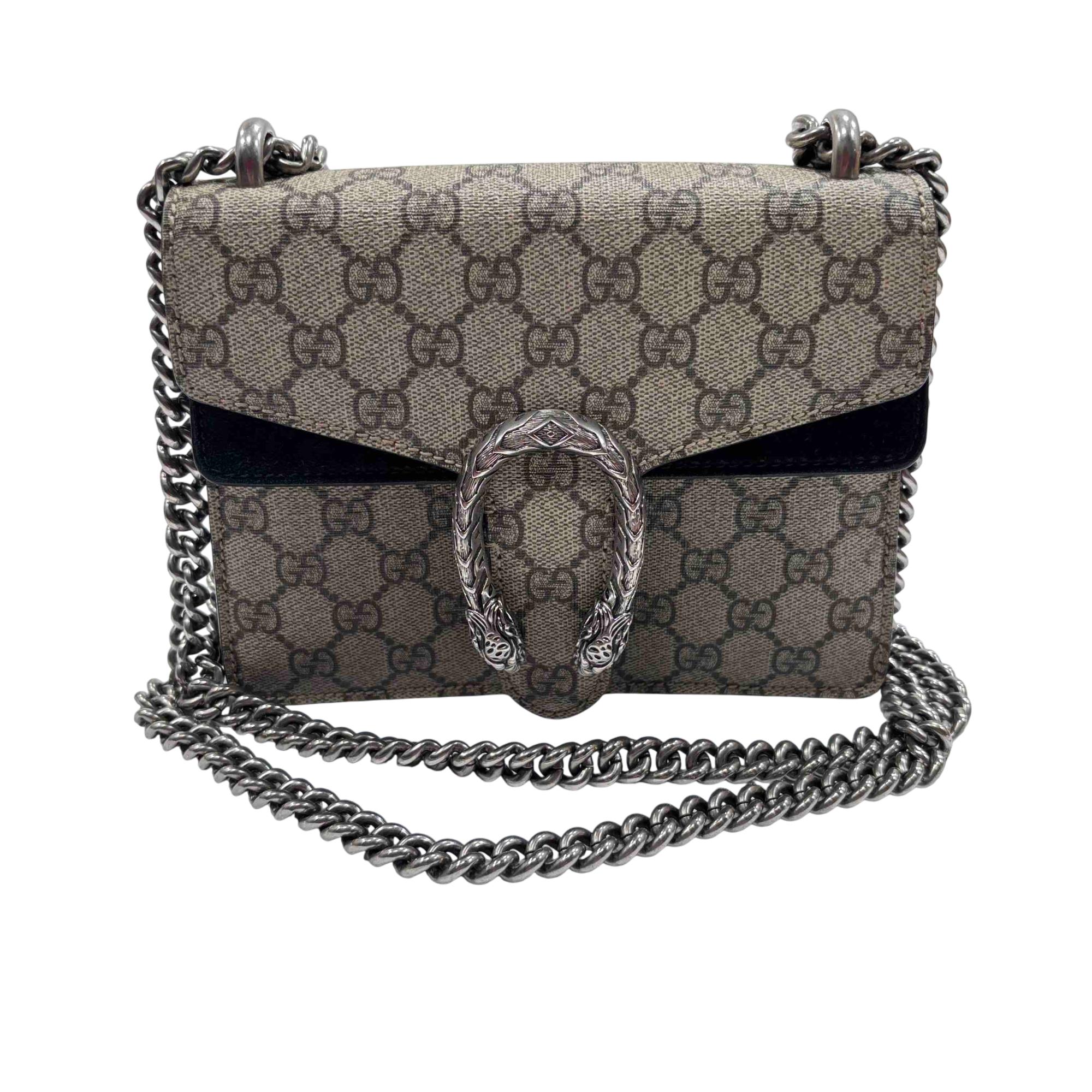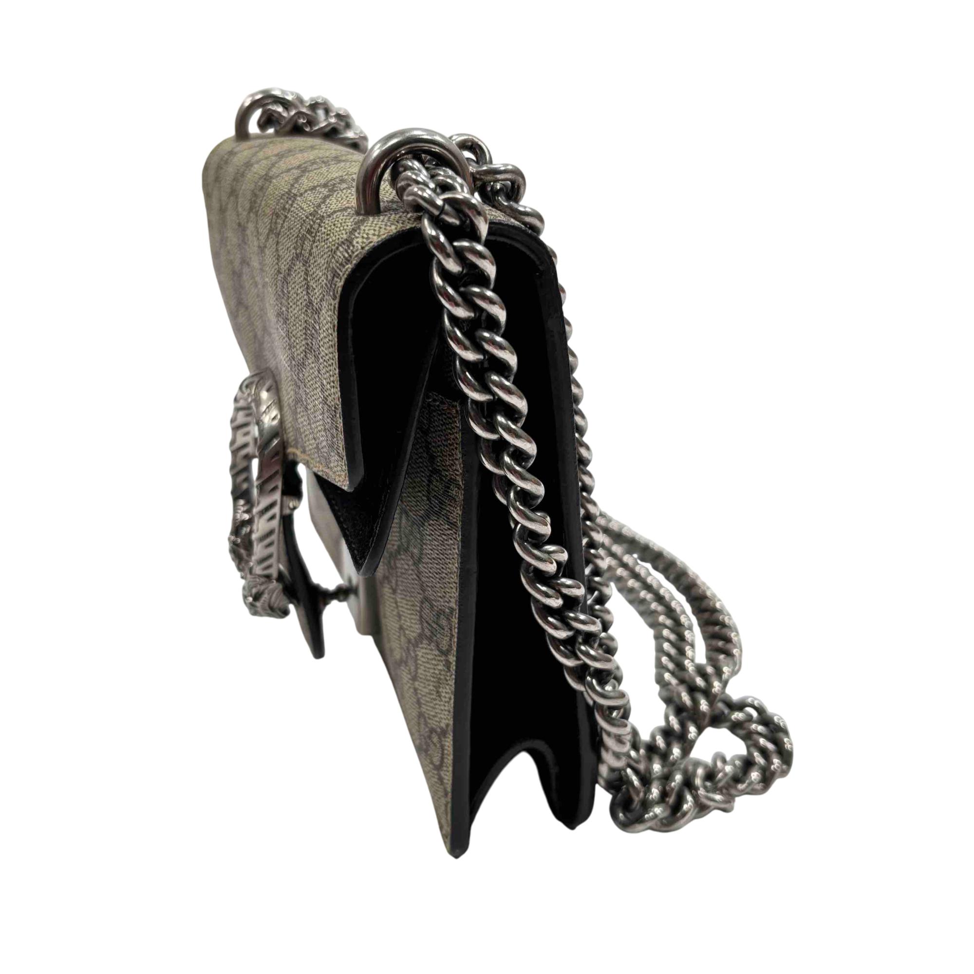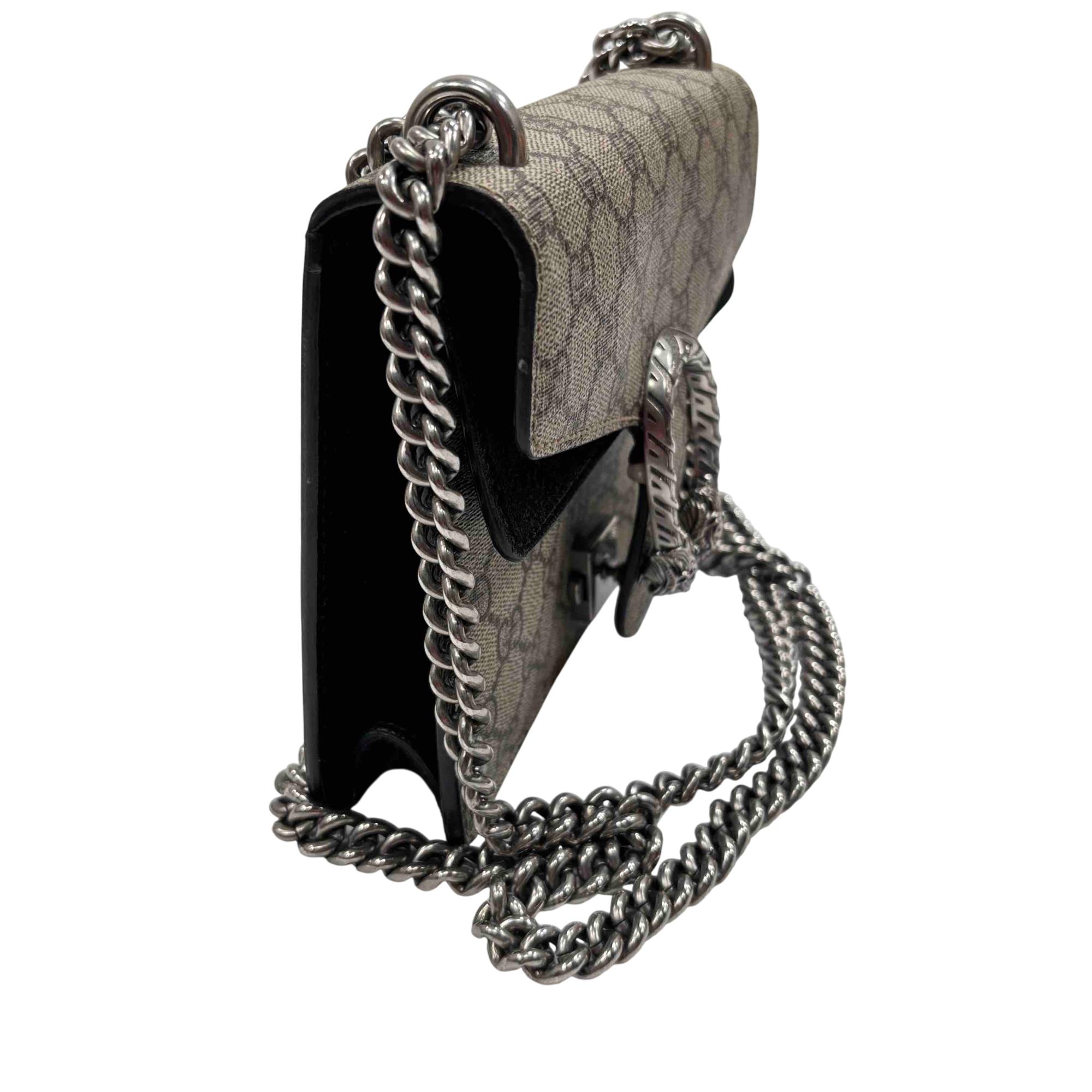 Elevate your style with the Gucci Dionysus GG Supreme Mini Shoulder Bag. Featuring a sleek black leather design, this iconic accessory is adorned with a silver chain strap and the distinctive Dionysus buckle, complete with a unique snake-skin pattern. Perfectly blending luxury and function, this bag makes a bold statement for any fashion-forward individual.